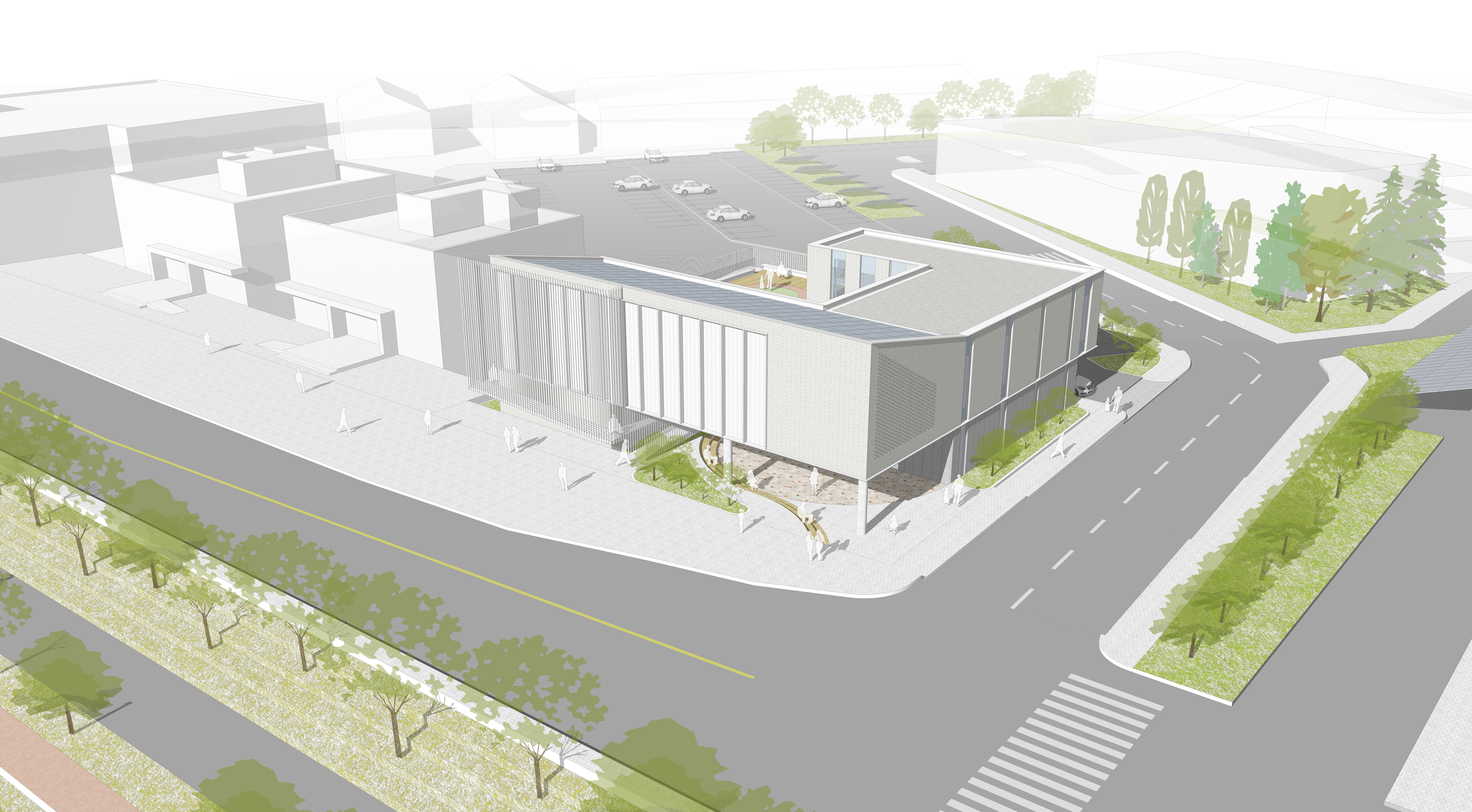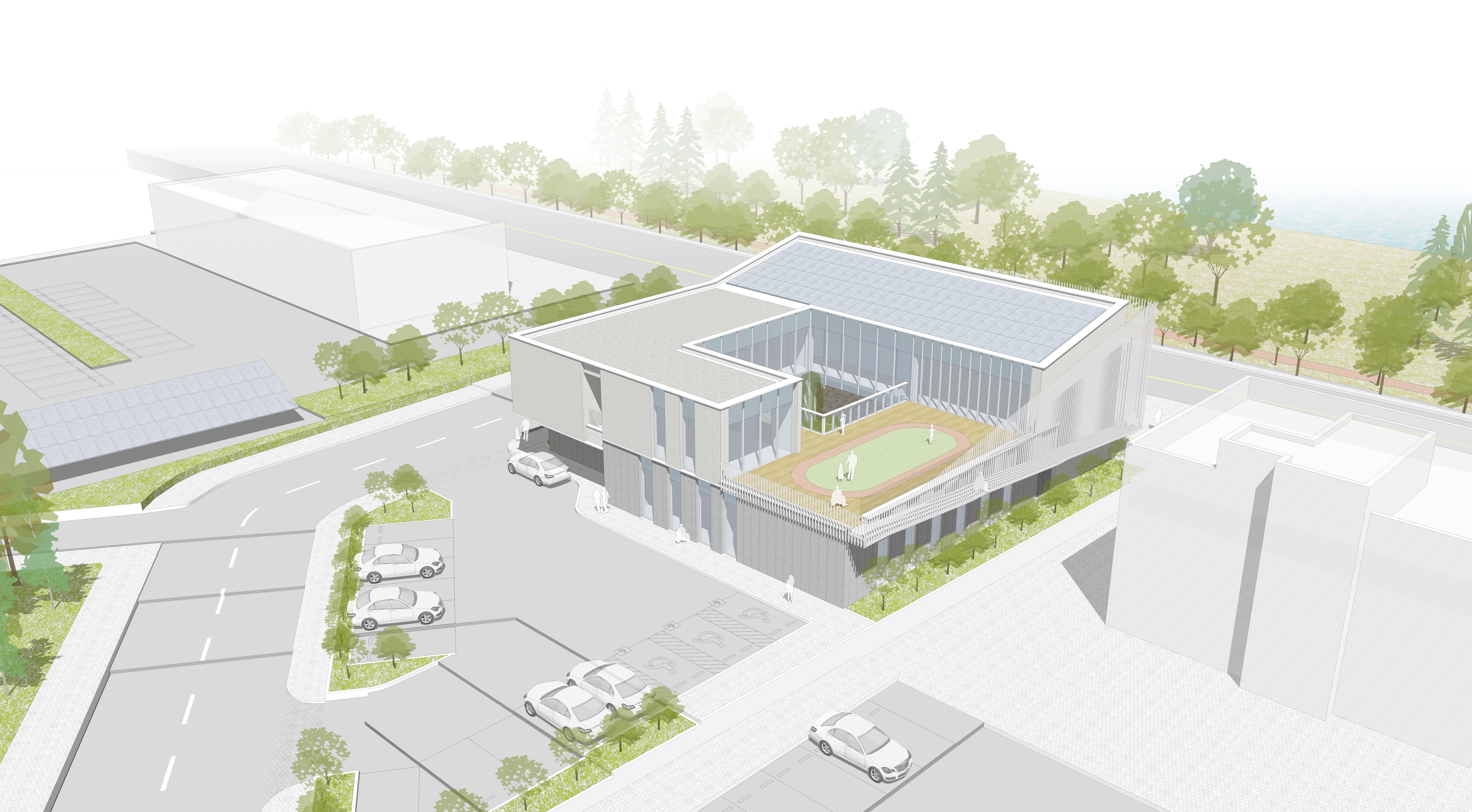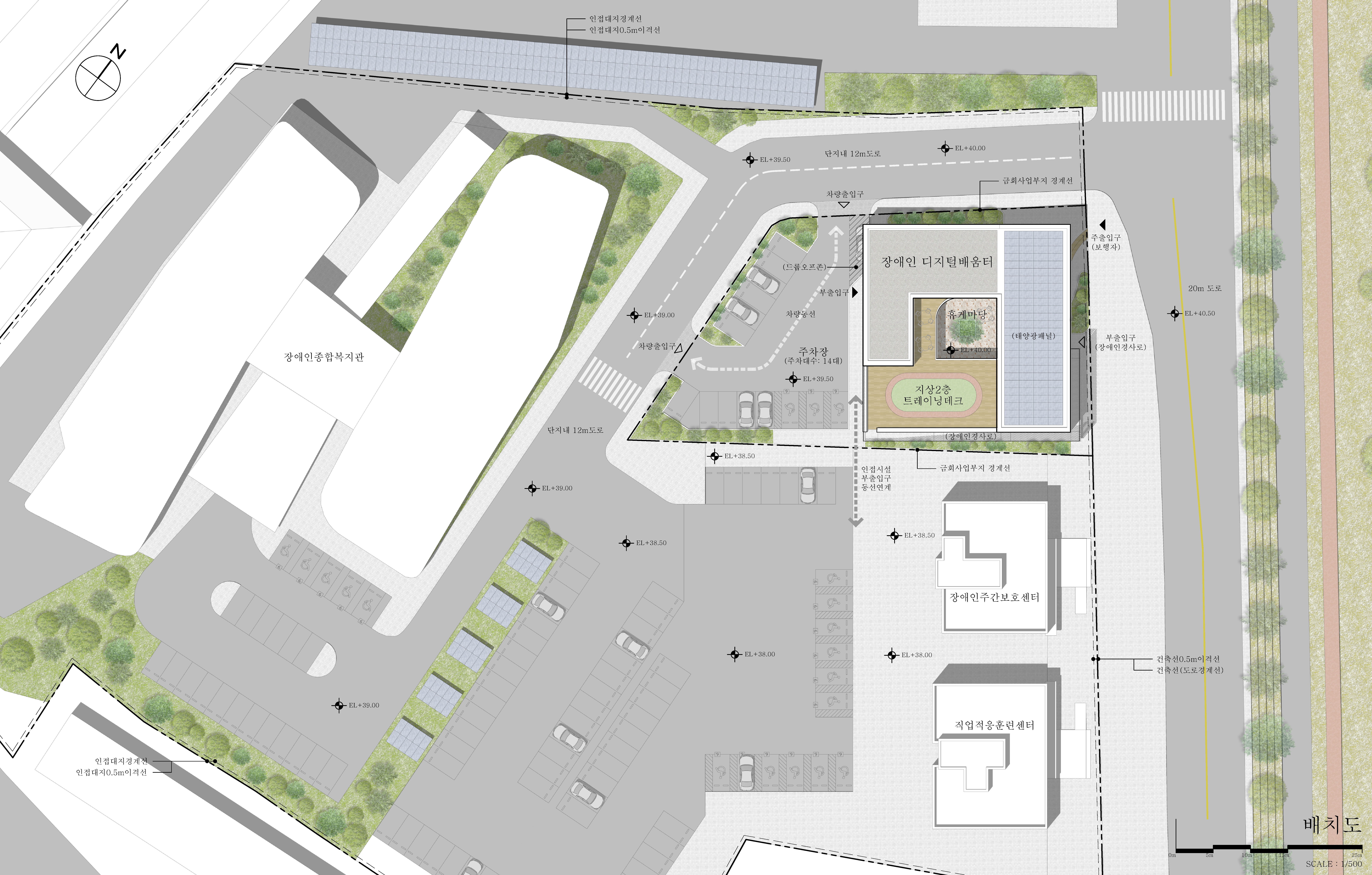 장애인 디지털 배움터는 복지시설 단지 내 출입구와 맞닿은 대지에 위치하여, 기존 건물들과 조화롭게 어울리는 동시에 개방적이며 편안한 쉼터를 제공해야 한다.