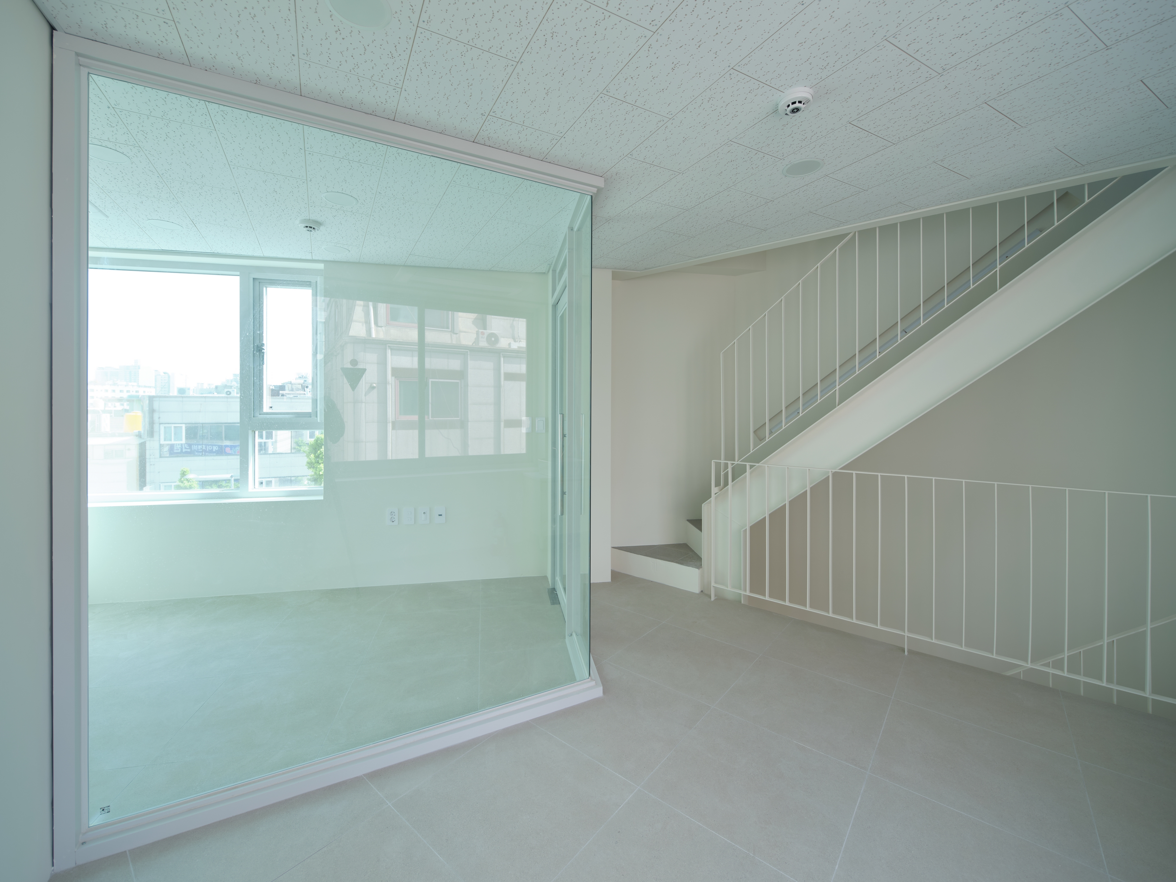 경사진 대지의 특성을 활용하여, 대지 내에 가장 높은 후면부에서 지상2층으로 진입하는 출입구를 별도로 만들어 1층의 실사용 면적을 최대로 확보했다.