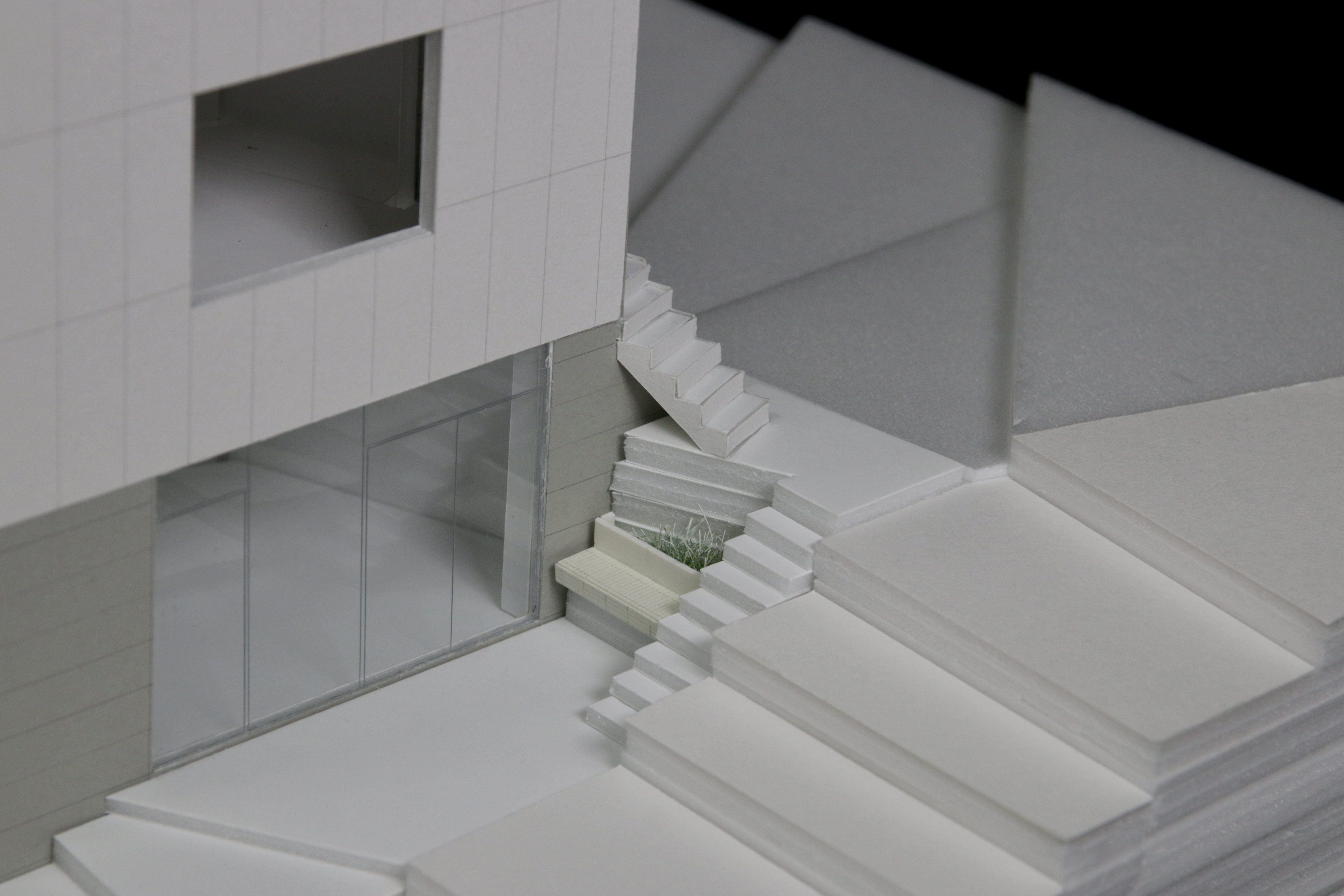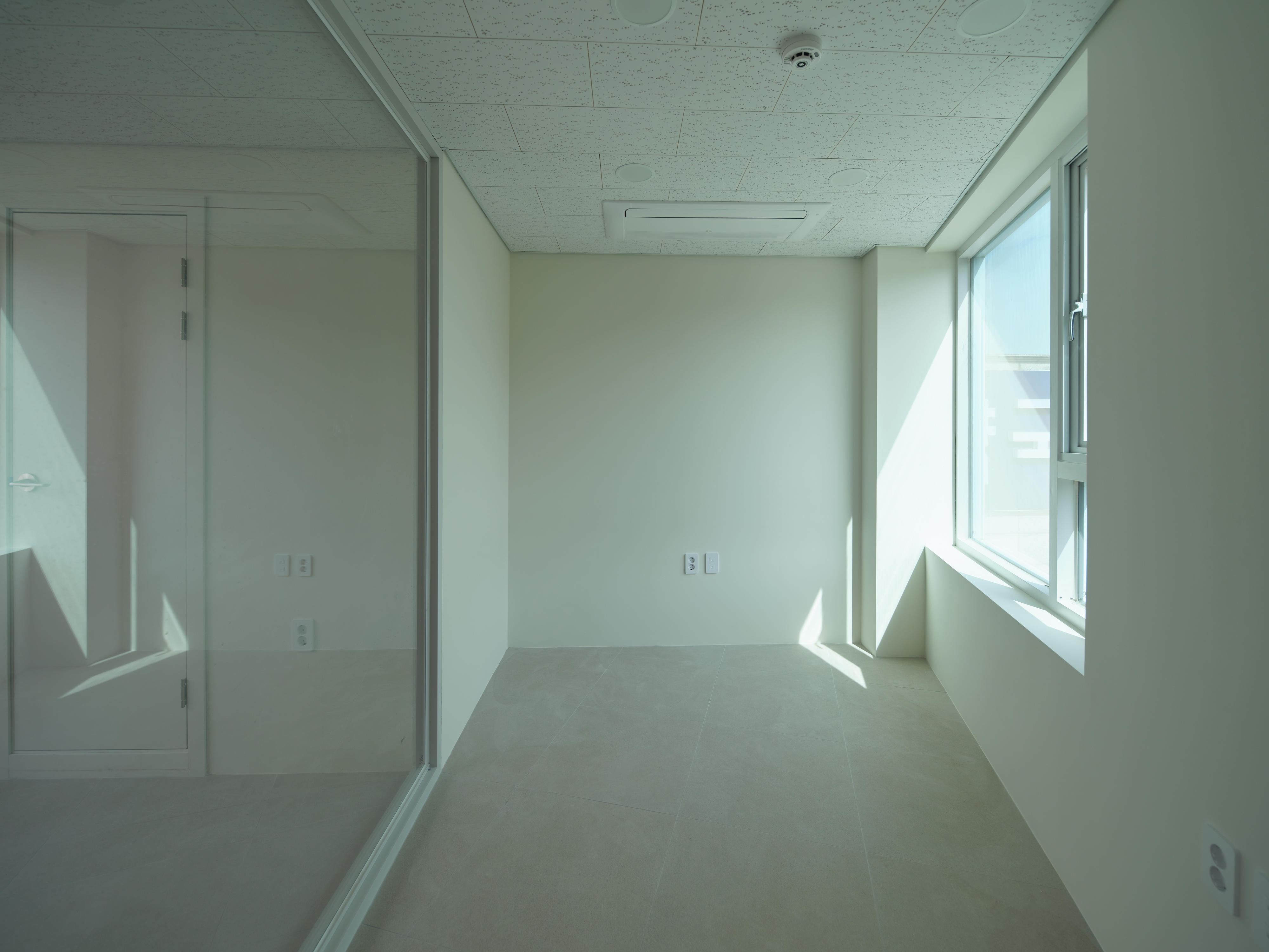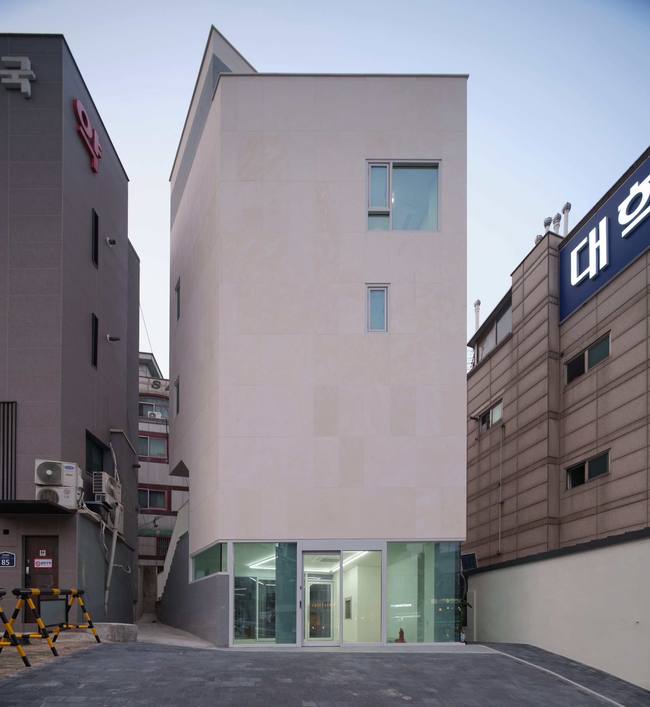 밝은 화이트 계열의 라임스톤과 고흥석으로 건물의 비례를 고려하여 입면의 마감재를 고려했다.