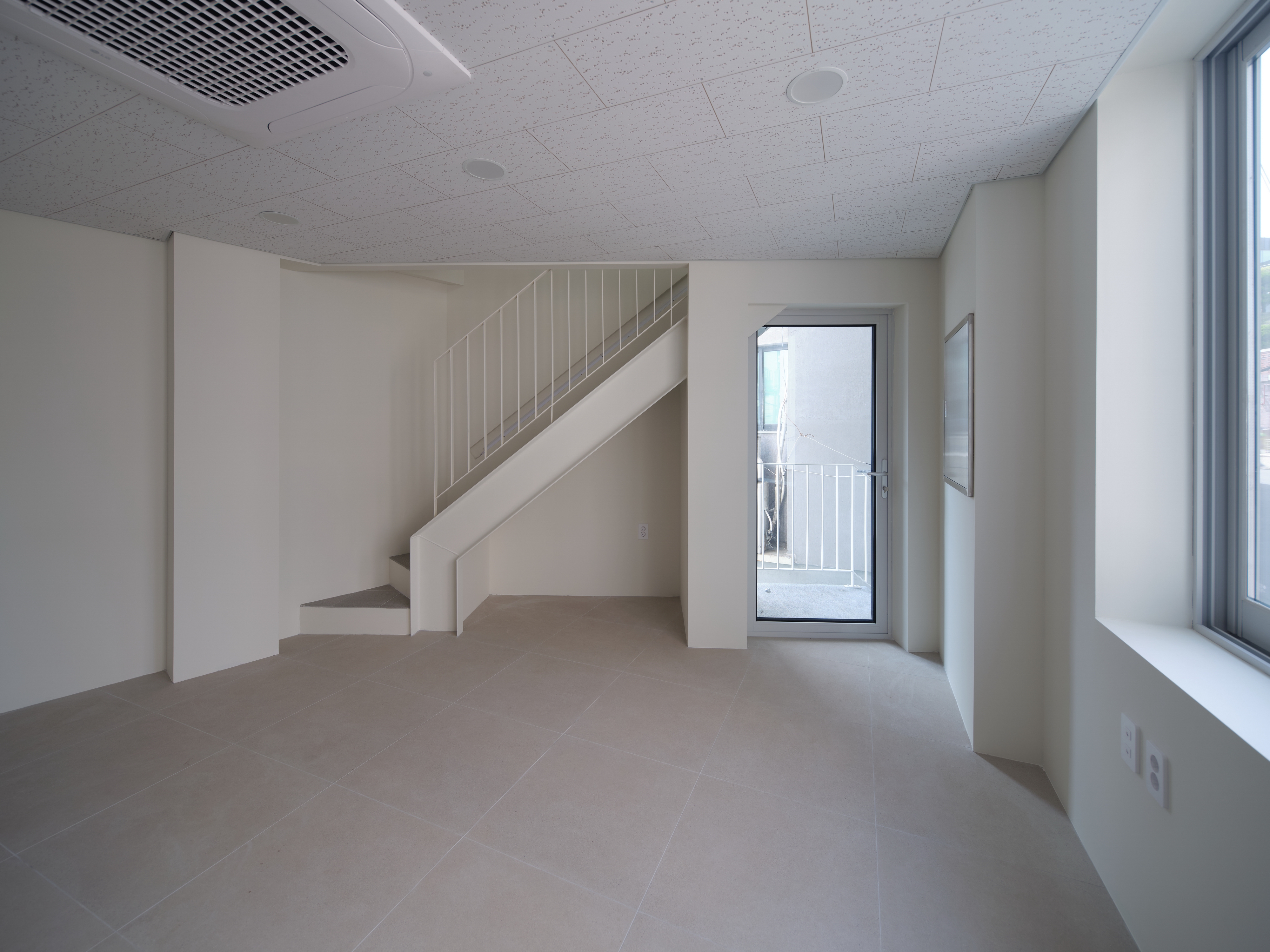 경사진 대지의 특성을 활용하여, 대지 내에 가장 높은 후면부에서 지상2층으로 진입하는 출입구를 별도로 만들어 1층의 실사용 면적을 최대로 확보했다.