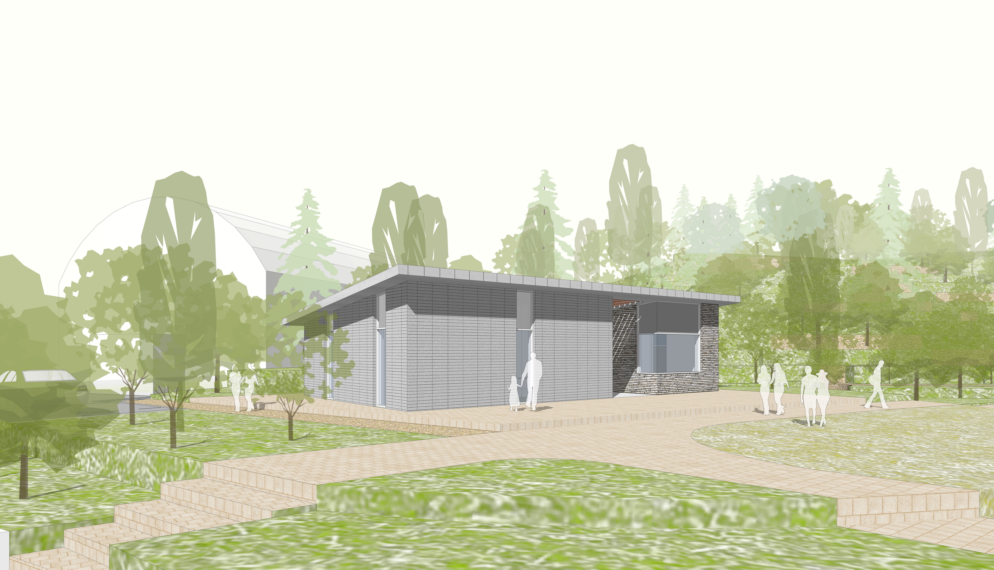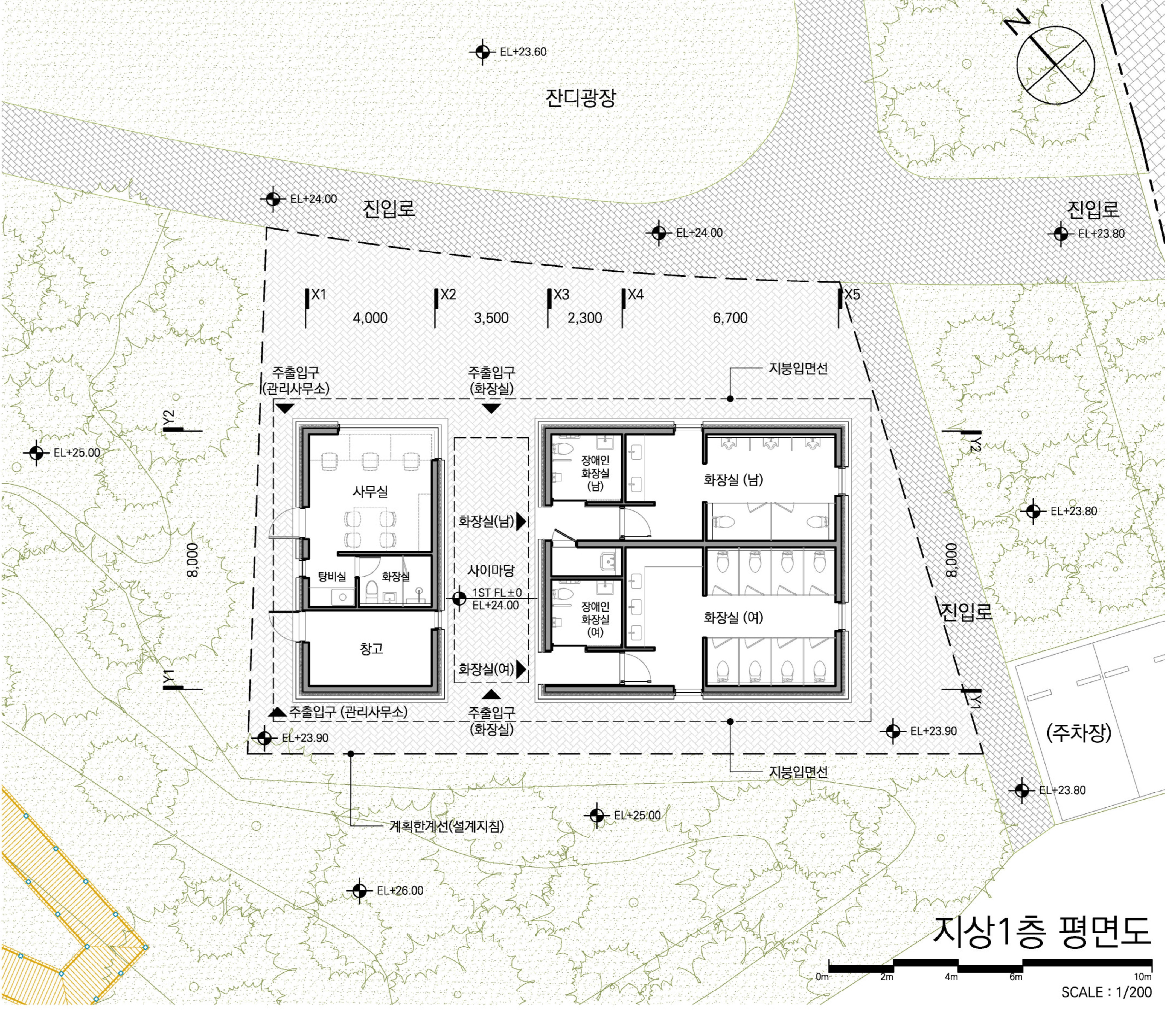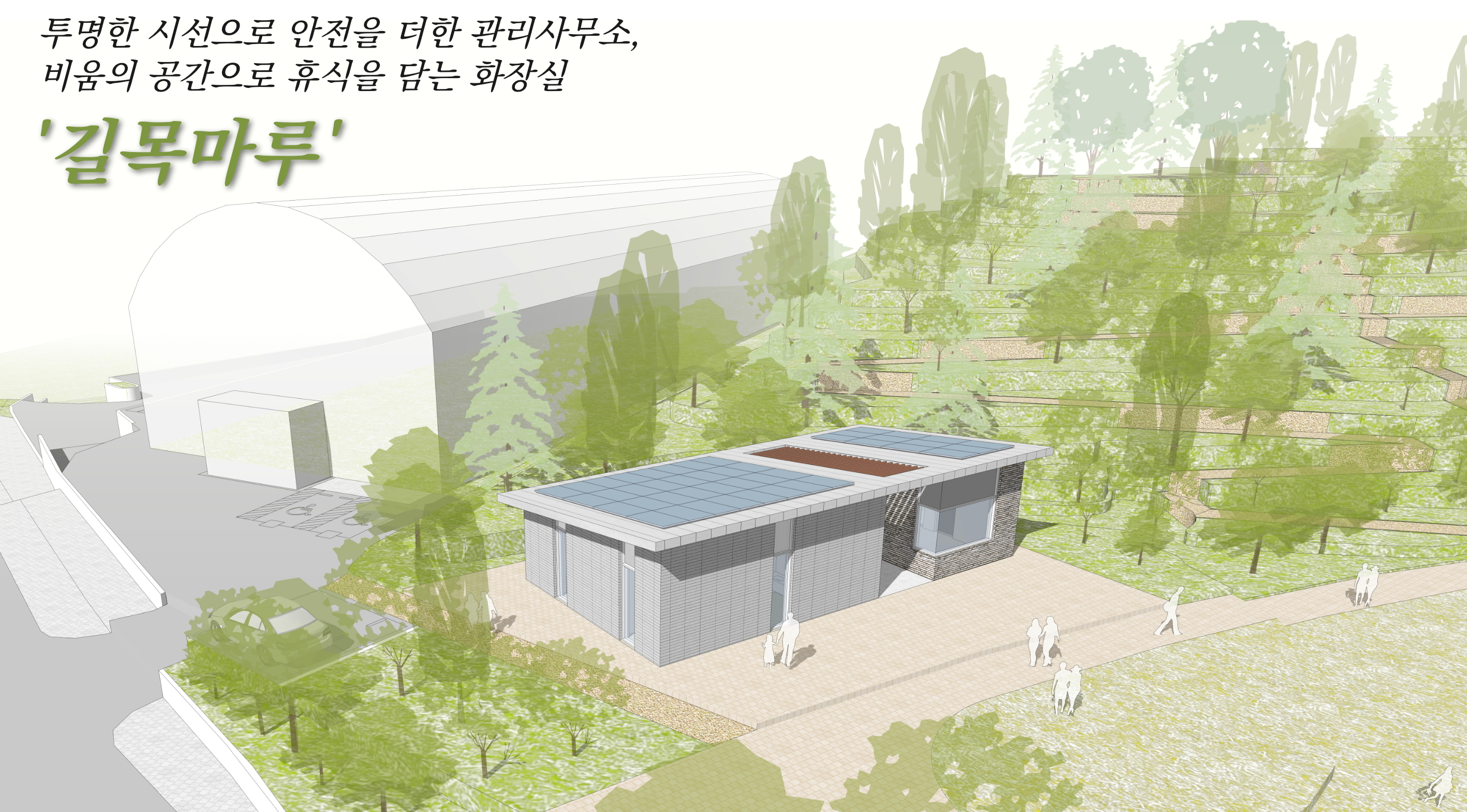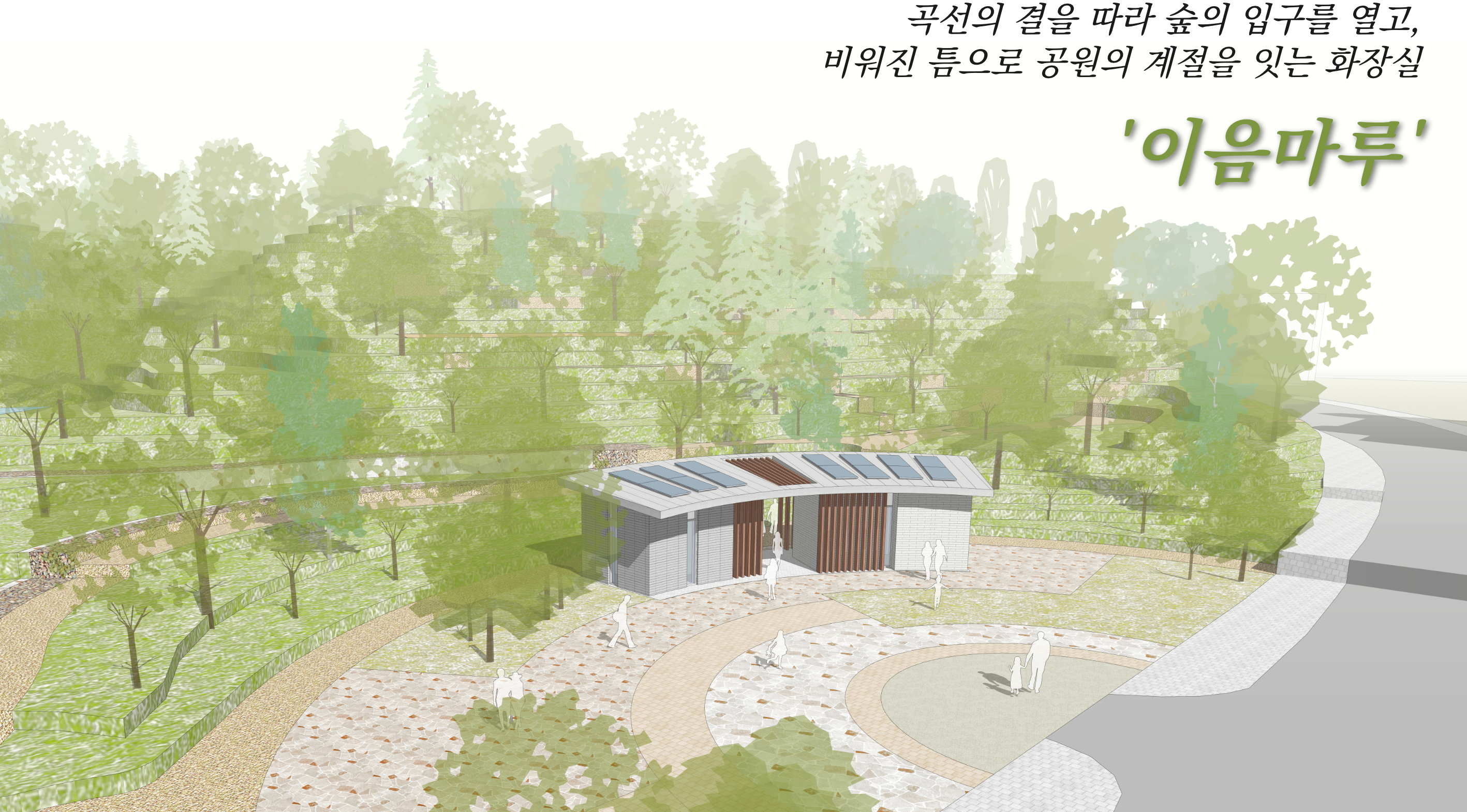 화장실 동은 진입광장 및 주변 조경계획의 흐름을 연계하여 라운드 형태로 배치했다.