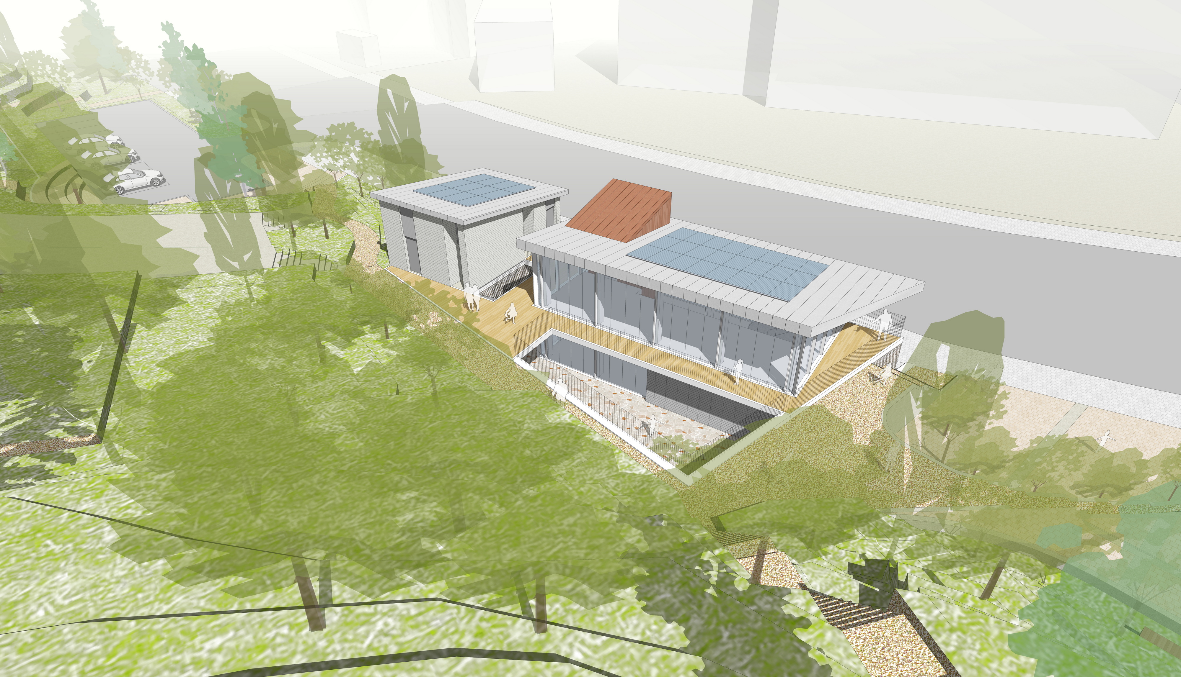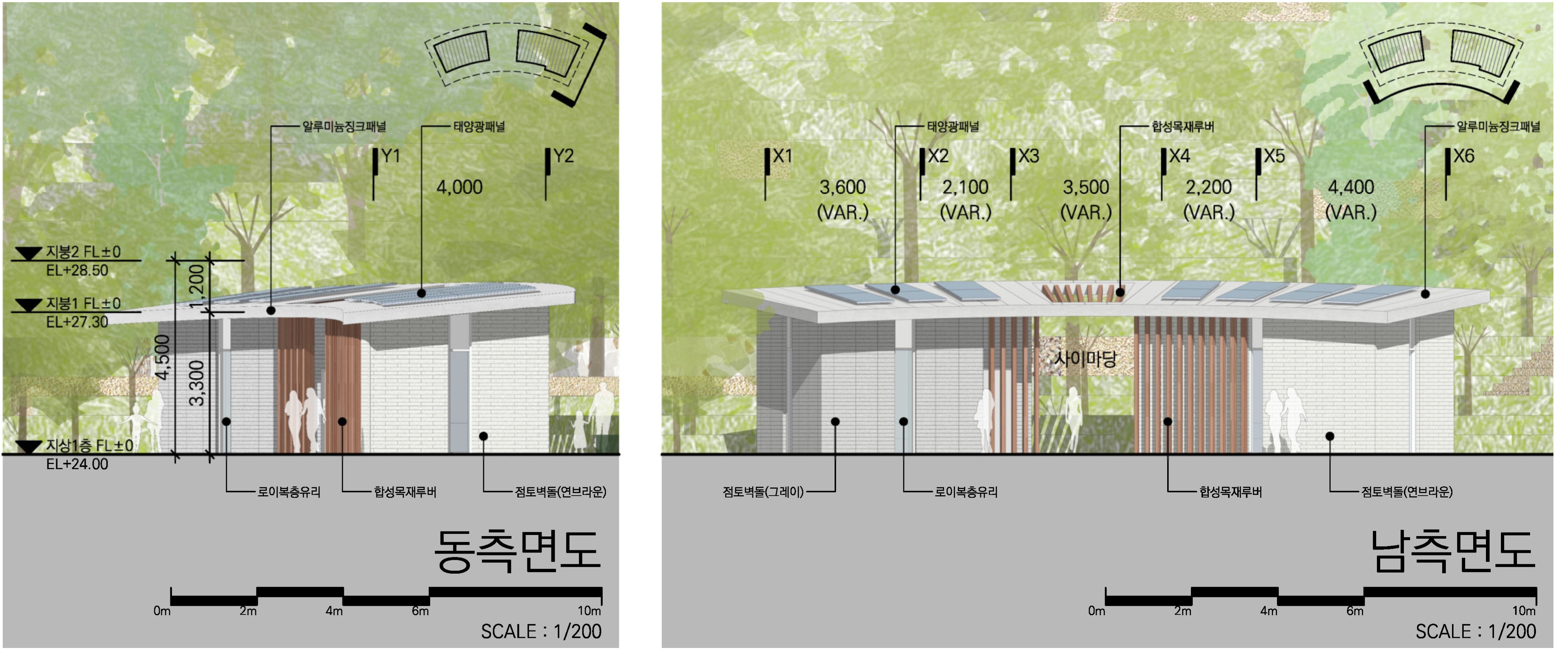외부마감: 점토벽돌, 고밀도목재패널, 알루미늄징크패널, 로이복층유리, 합성목재루버