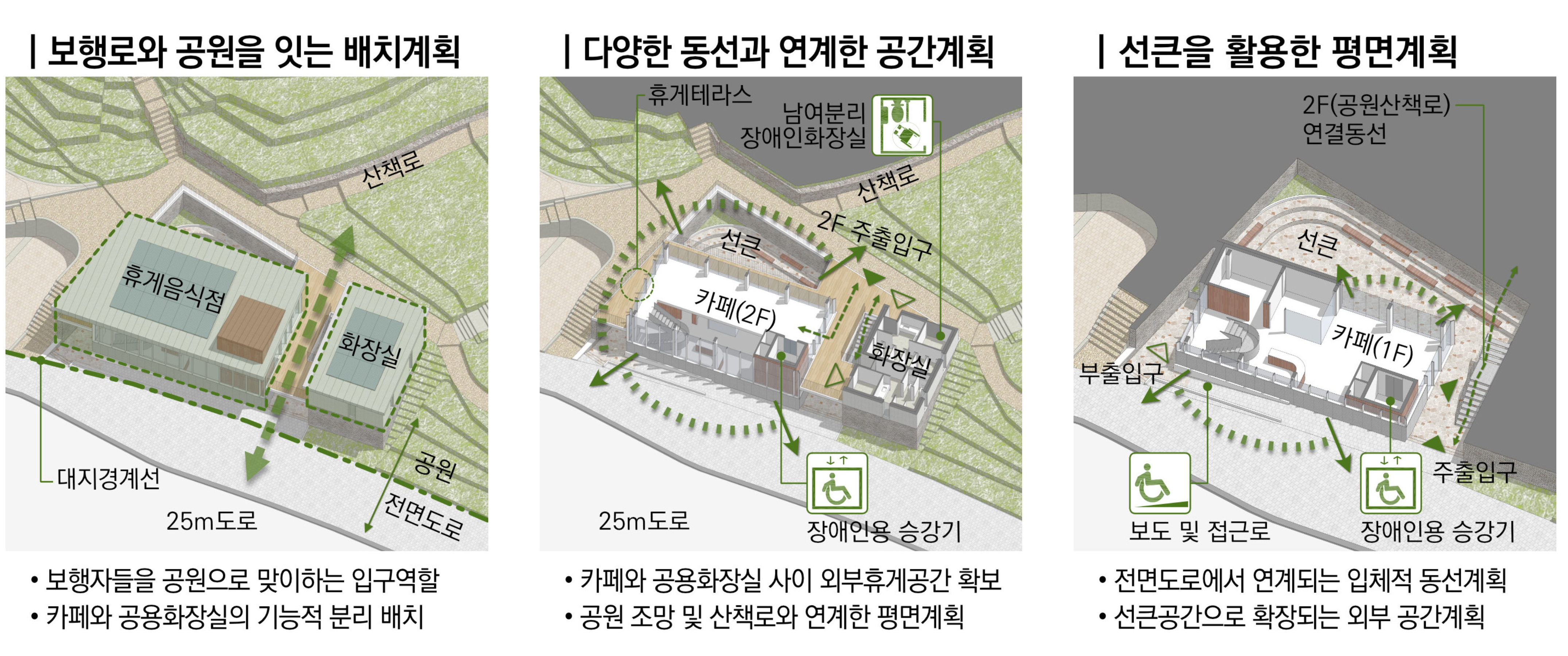 토당제1근린공원 조성사업의 일부로 휴게음식점, 관리사무소, 화장실 3개 동을 정해진 대지 내에서 계획해야 하는 프로젝트다.