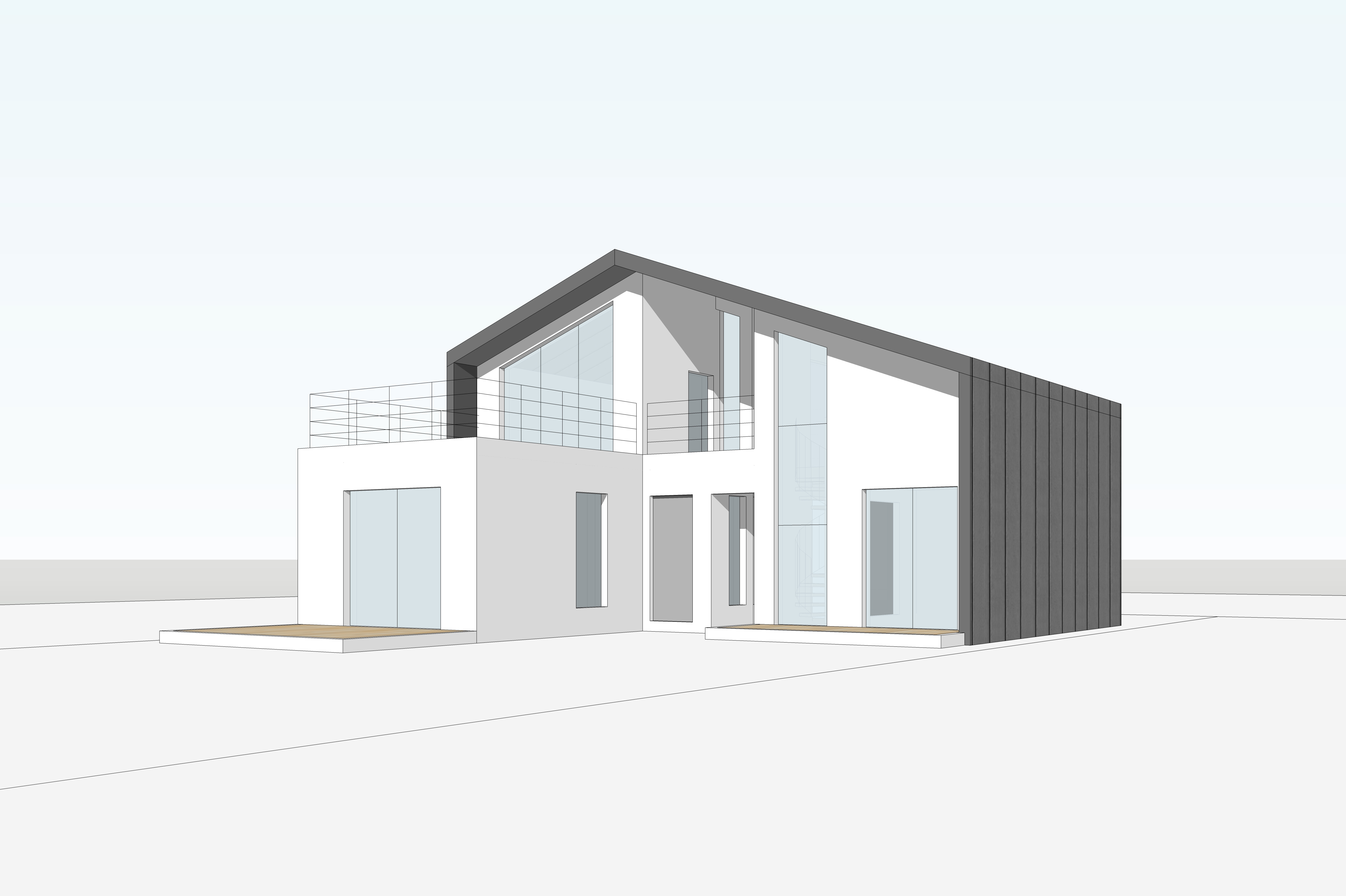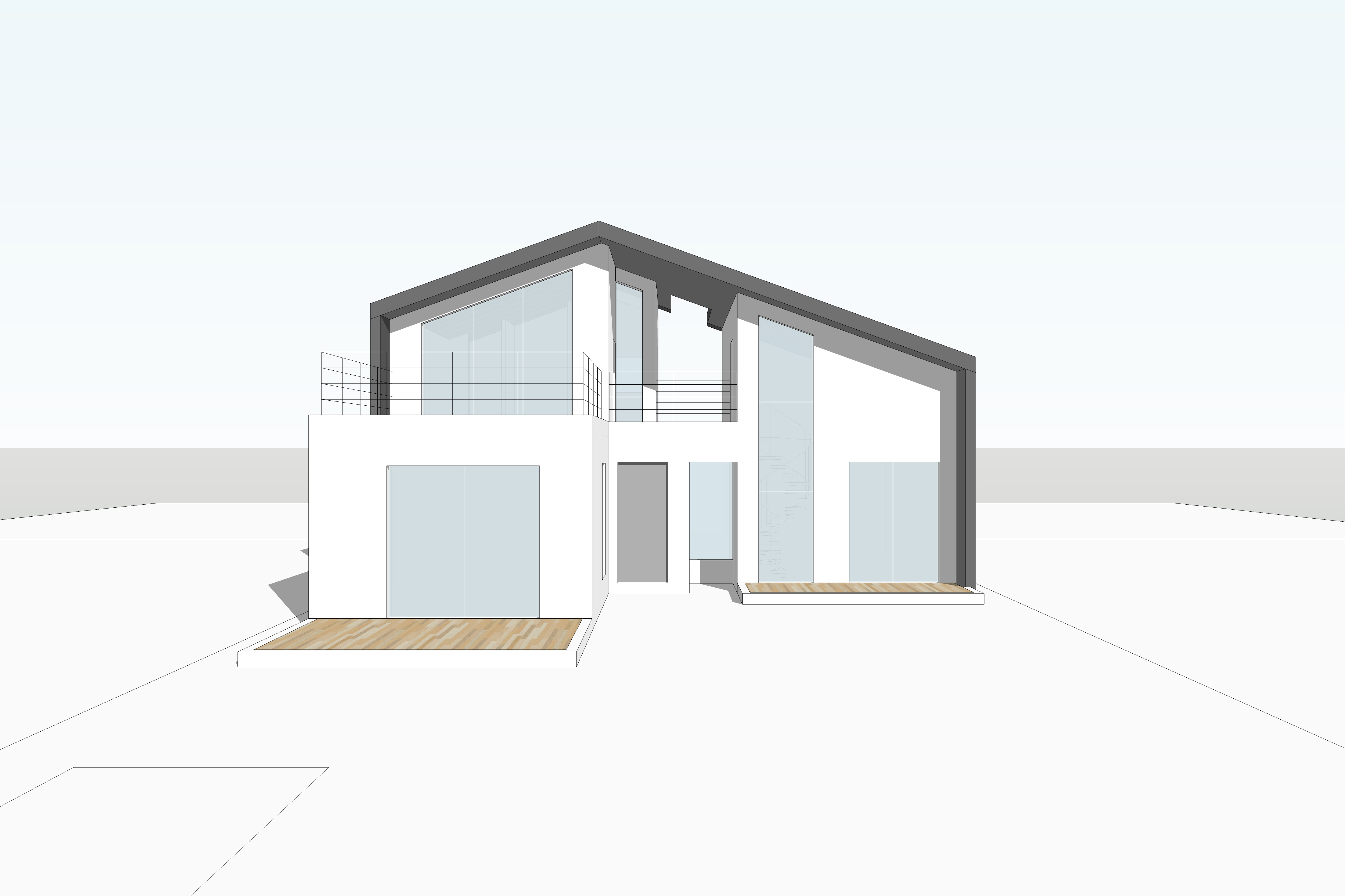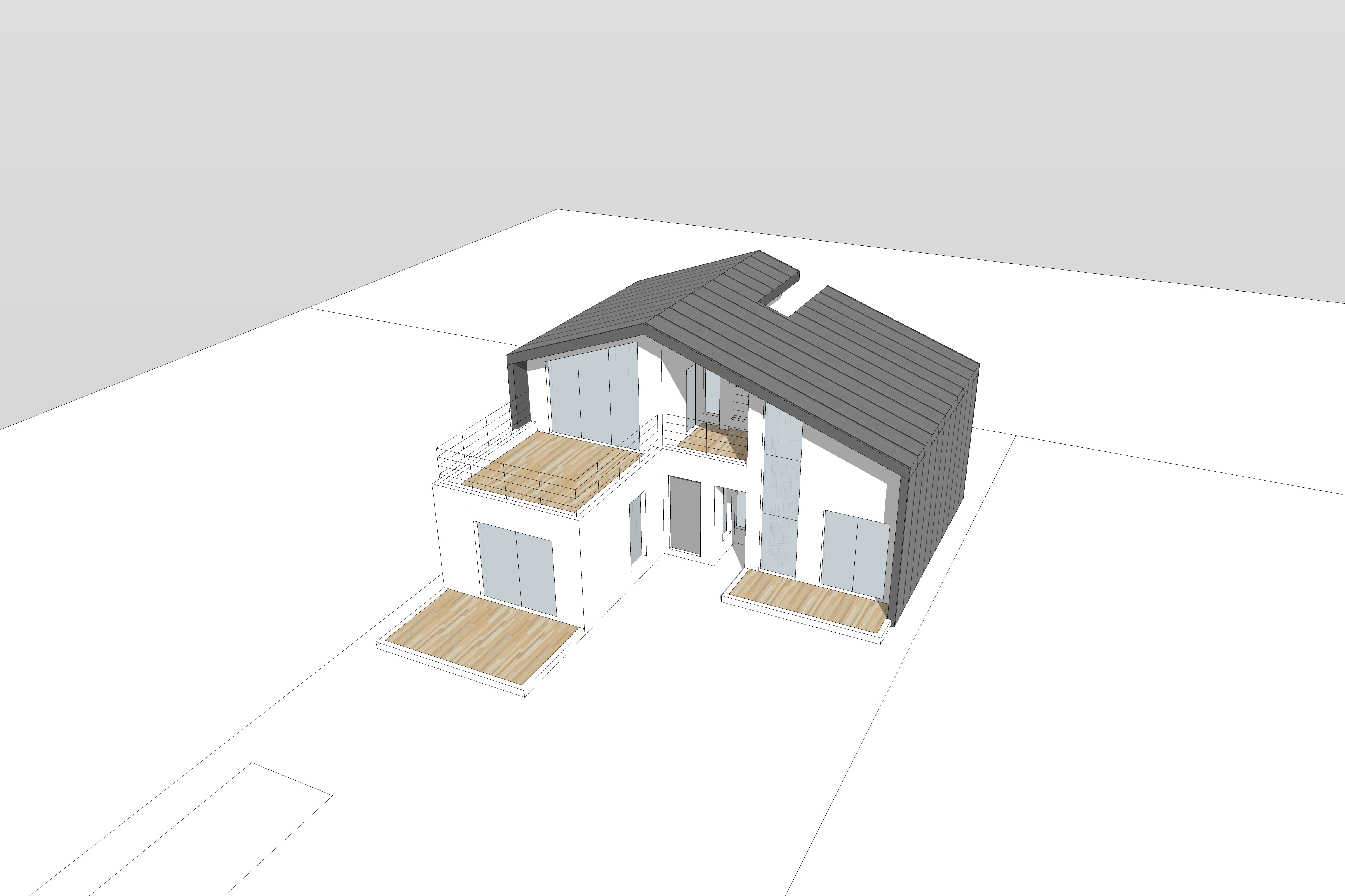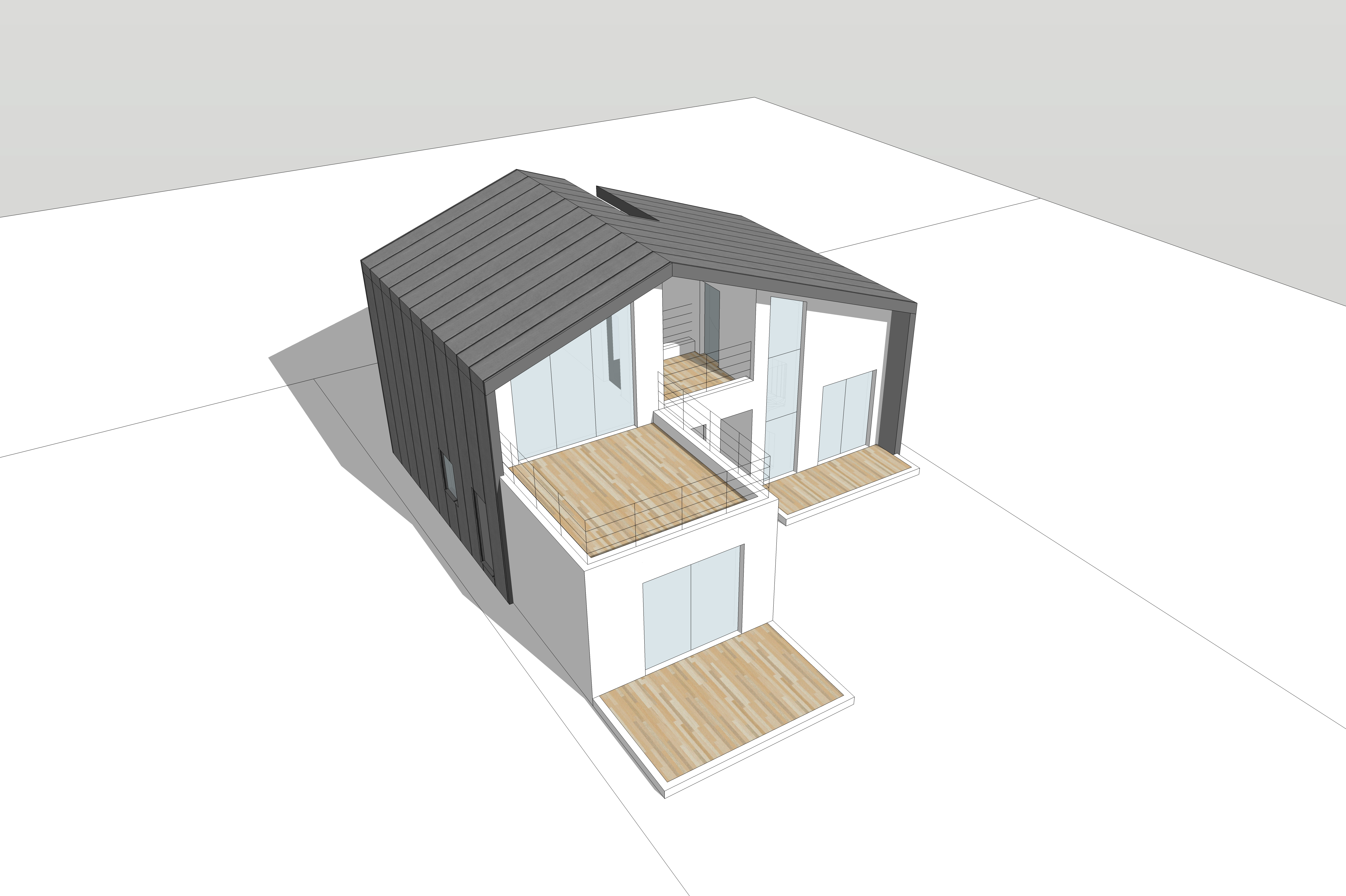 주거공간과 작업실 공간을 평면적으로 분리하고, 하나의 지붕으로 층고가 다른 두 공간을 감싸는 형태이다.