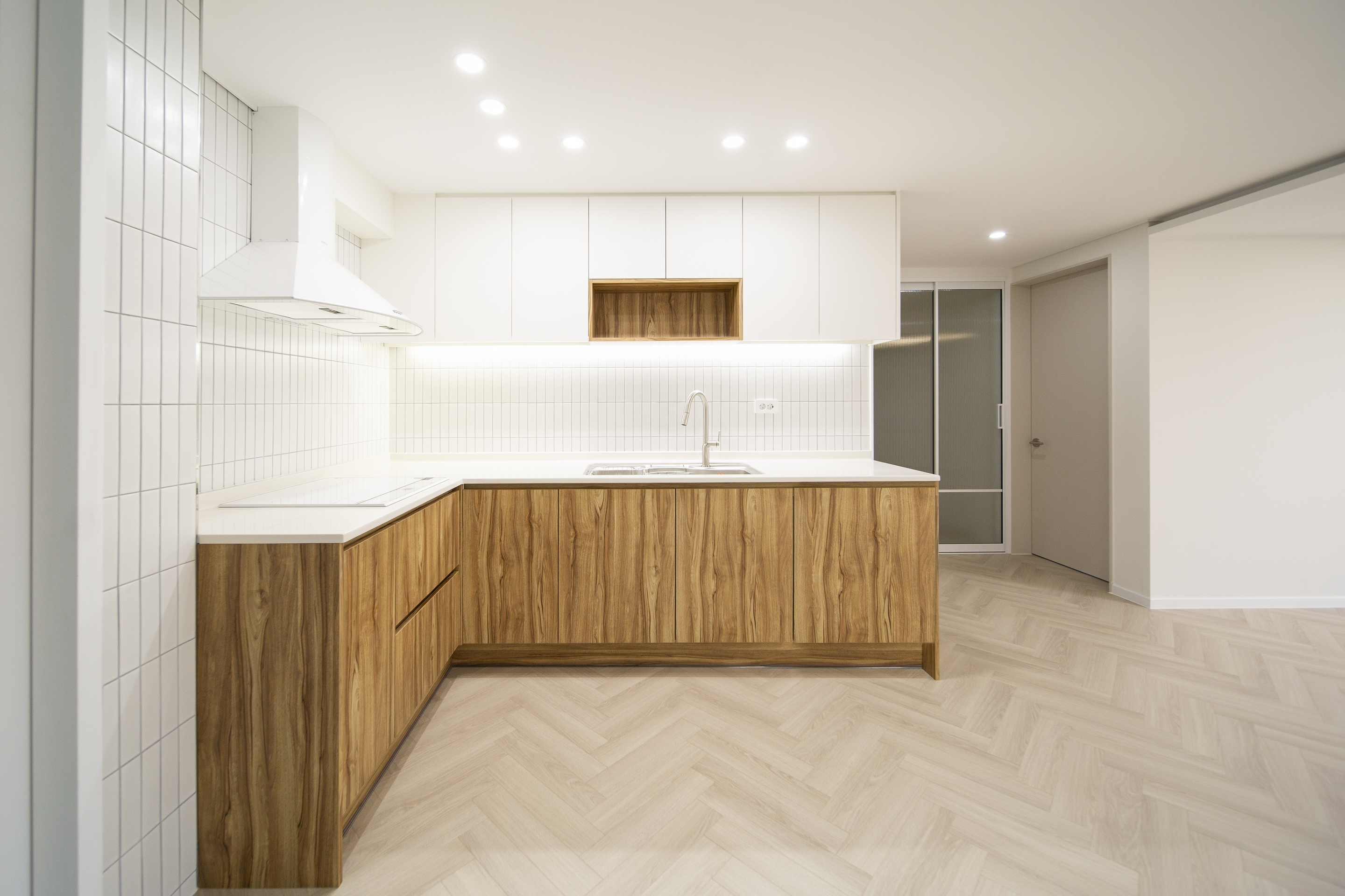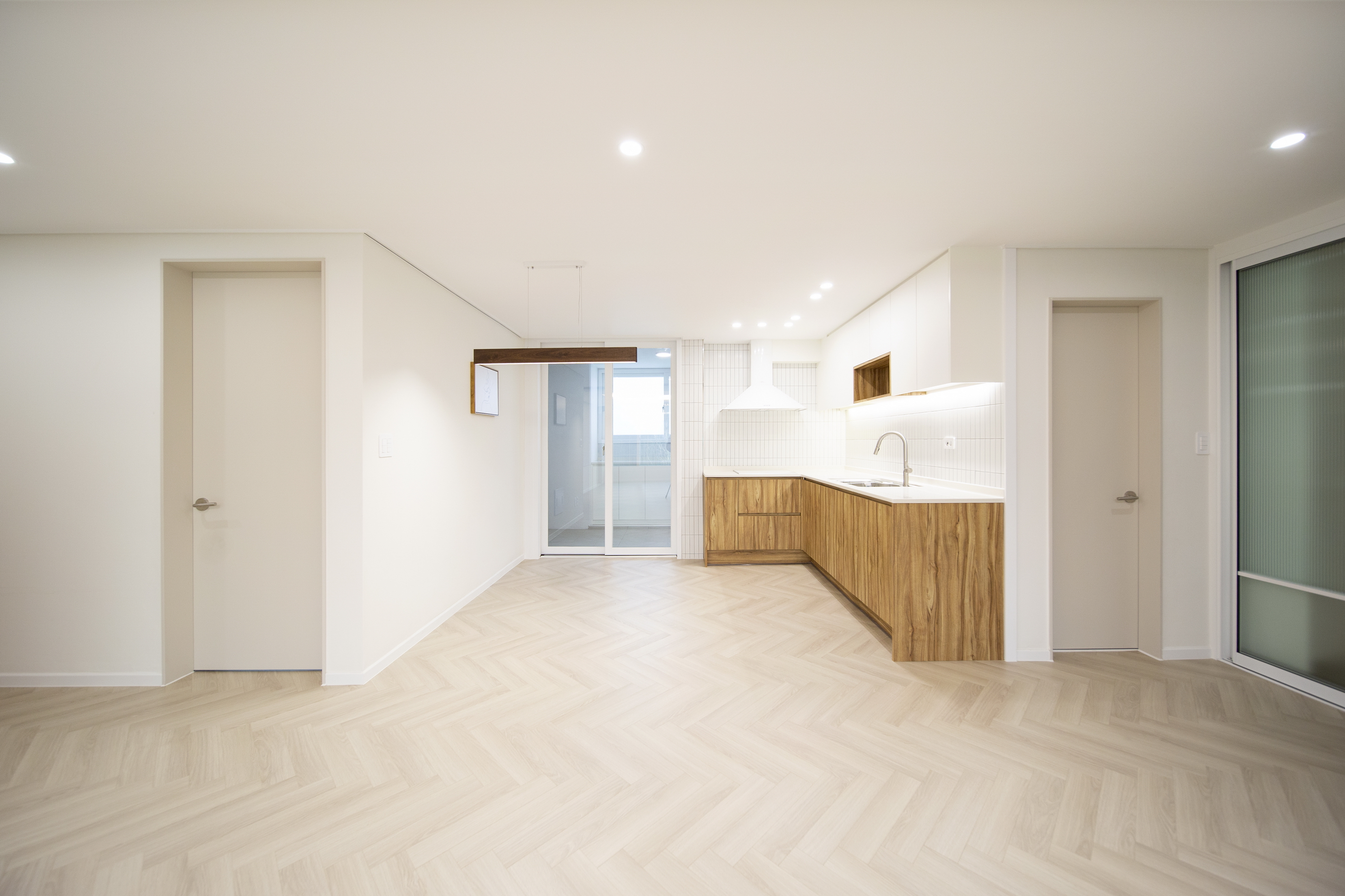 기존 거실과 주방사이를 가로막고 있던 ㄷ자형 주방을 ㄱ자로 변경하여, 거실과 주방사이에 개방감을 확보했다.