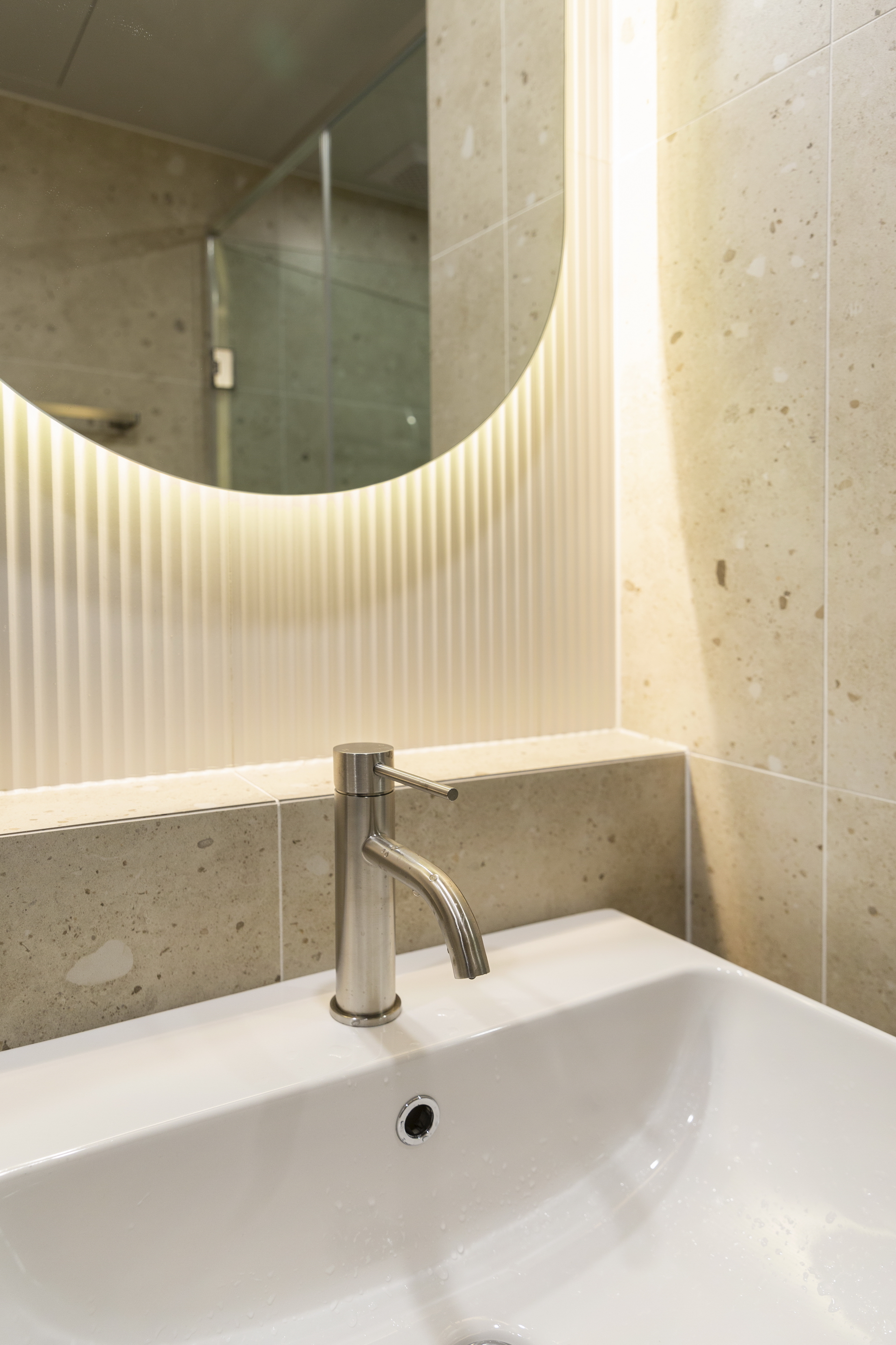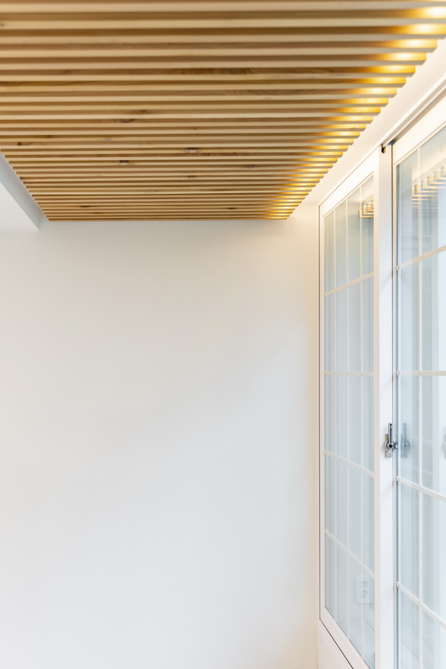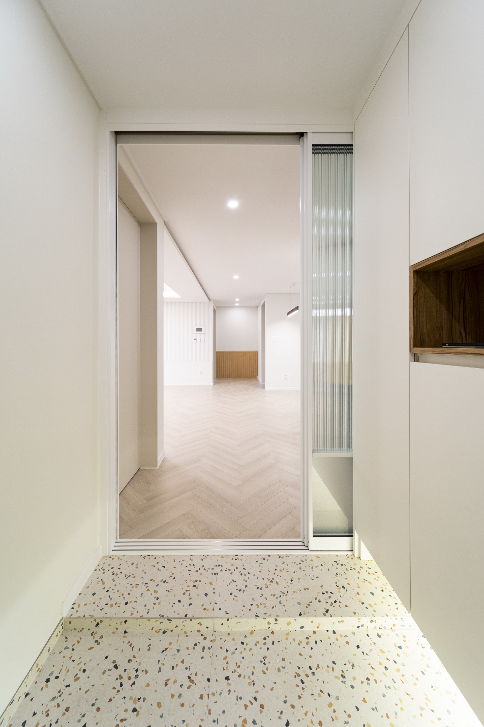 거실 전면, 화장실 전면, 발코니쪽 천장, 현관과 발코니 유리 부분 등에서 재료의 수직패턴을 활용하여 과하지 않은 포인트를 만들었다.