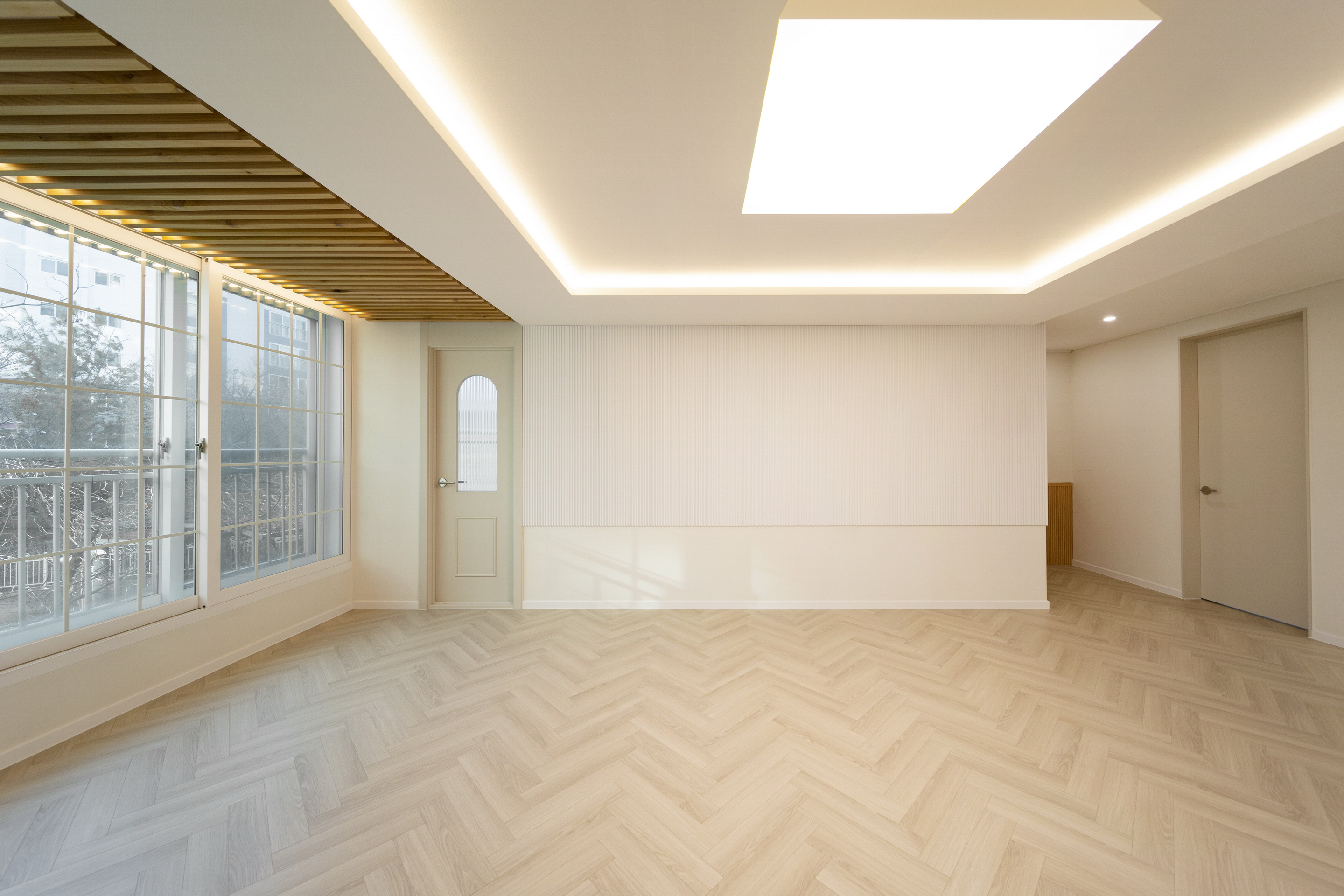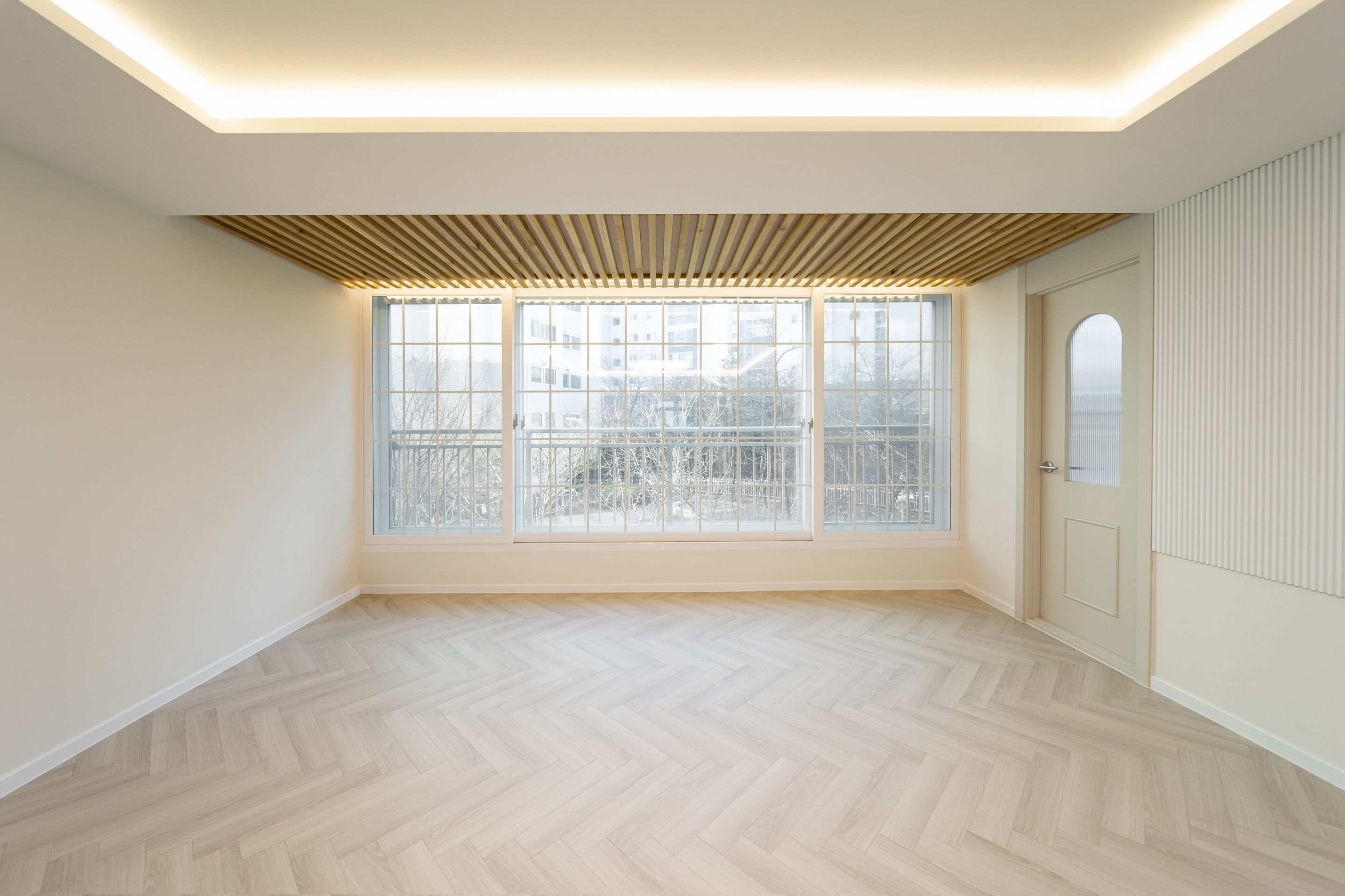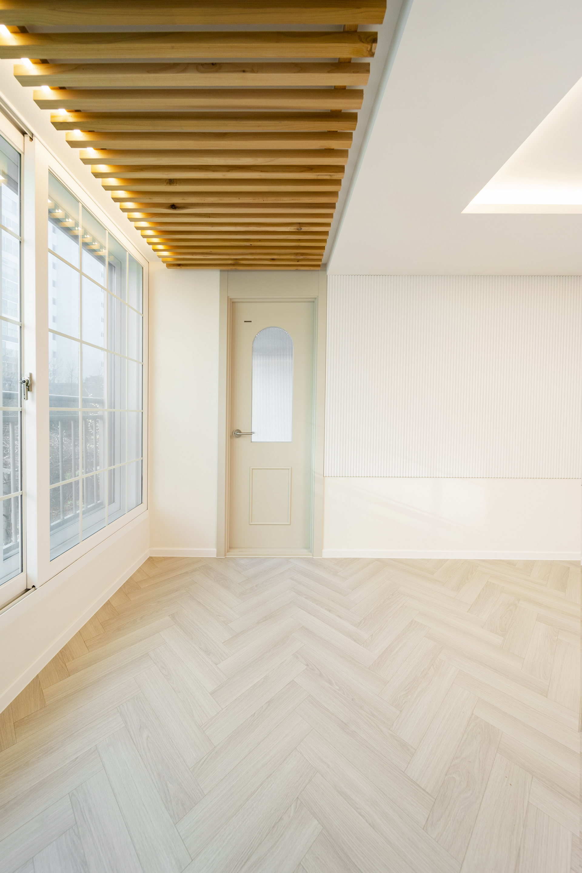 거실 전면, 화장실 전면, 발코니쪽 천장, 현관과 발코니 유리 부분 등에서 재료의 수직패턴을 활용하여 과하지 않은 포인트를 만들었다.