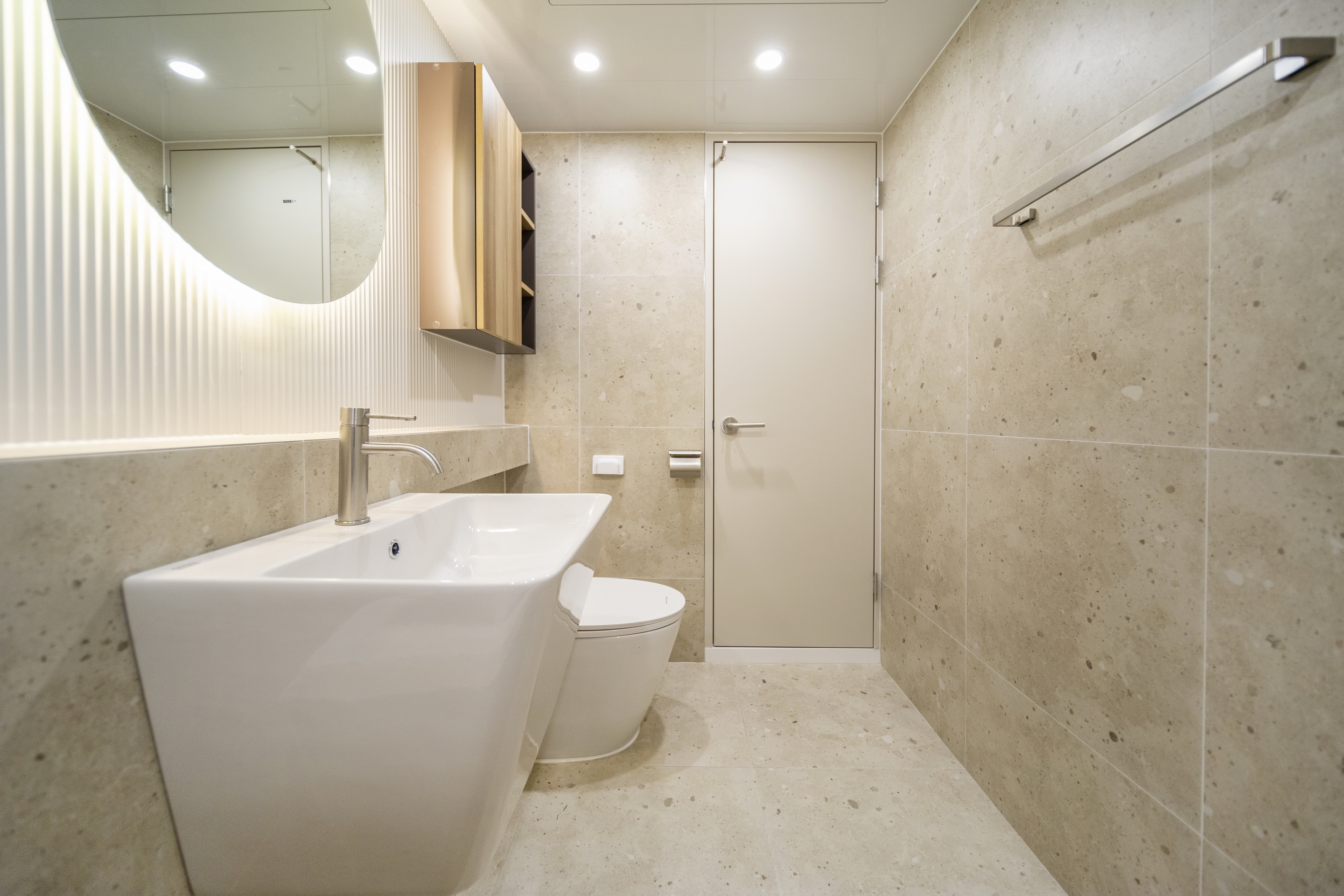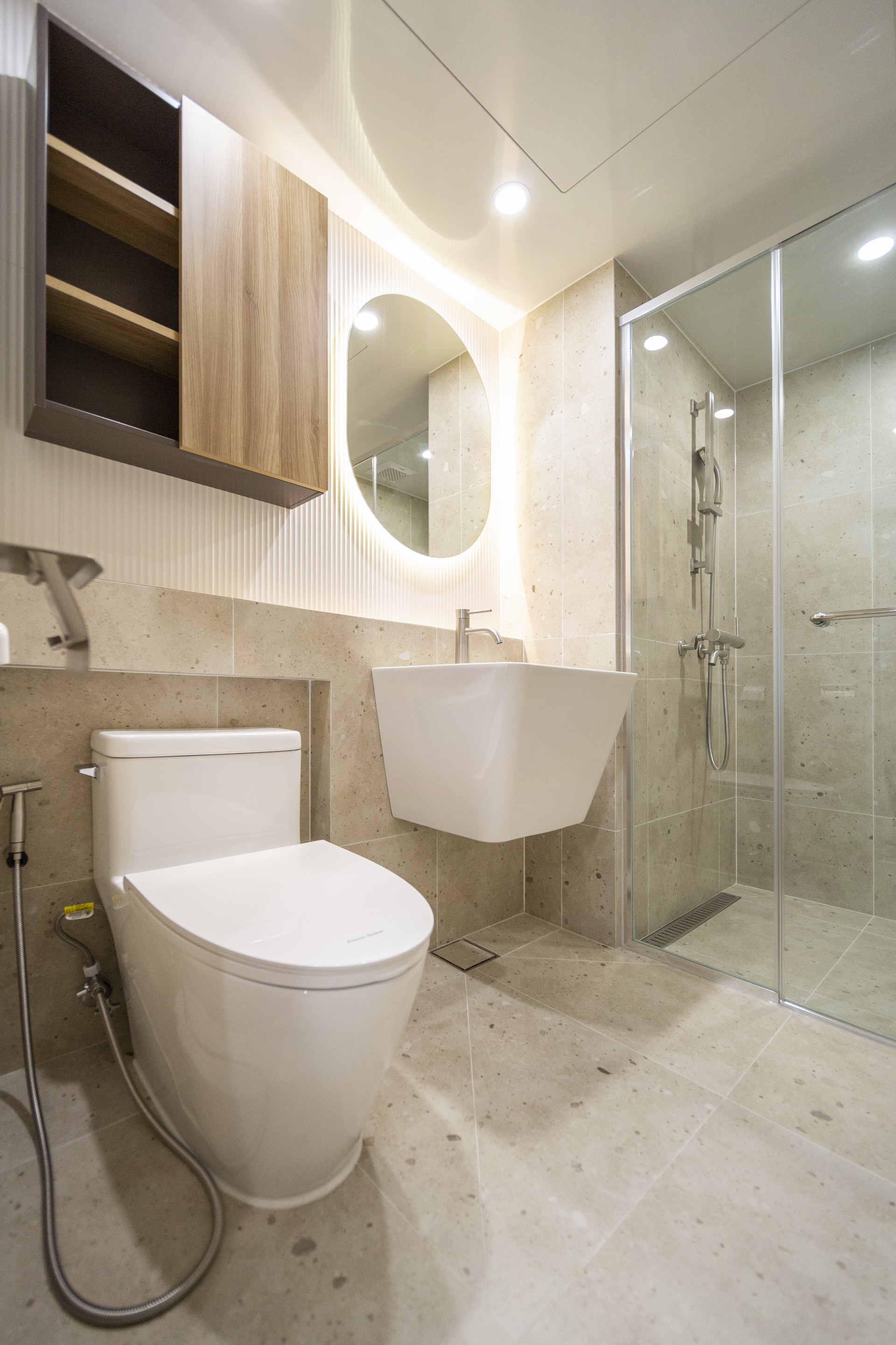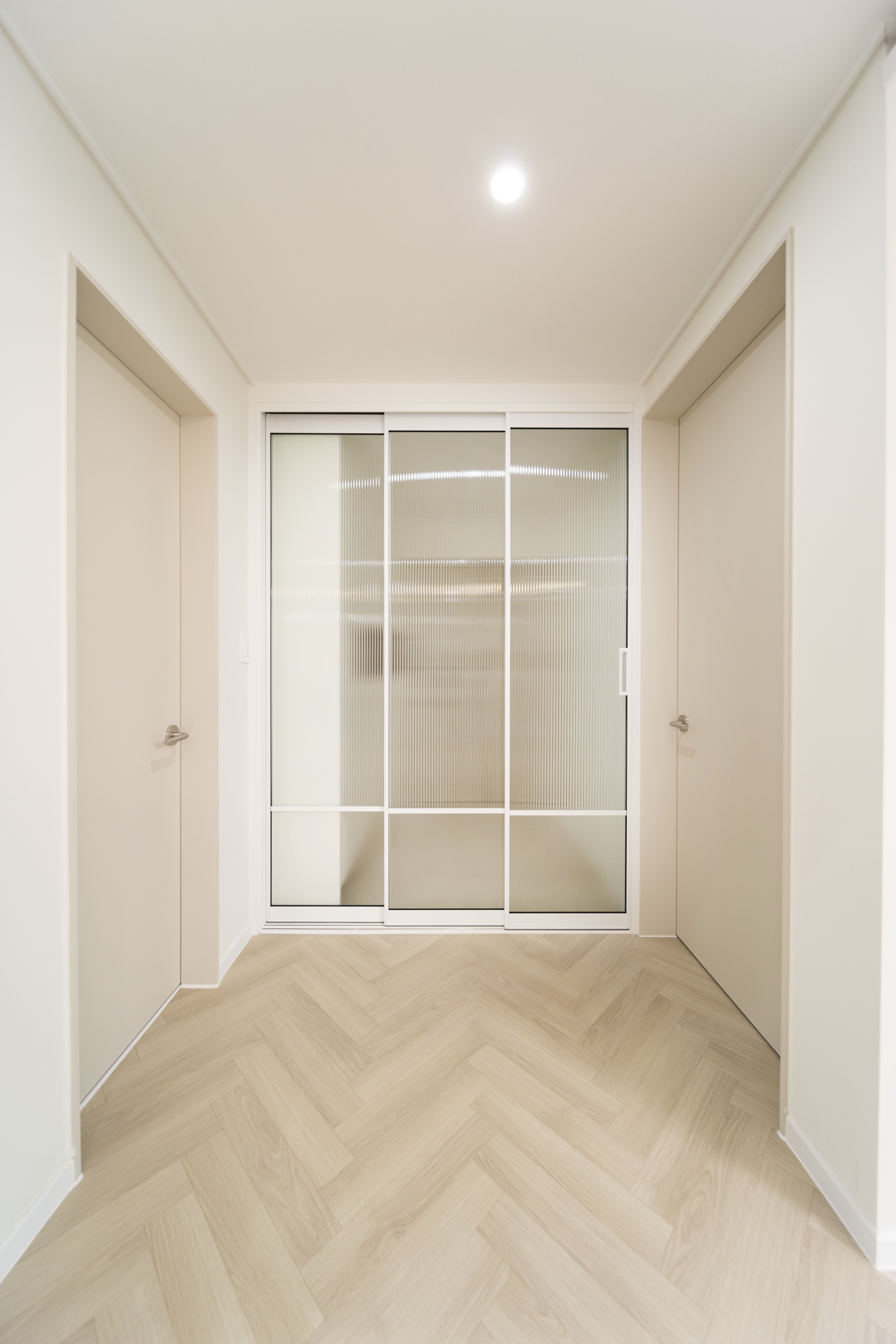 거실 전면, 화장실 전면, 발코니쪽 천장, 현관과 발코니 유리 부분 등에서 재료의 수직패턴을 활용하여 과하지 않은 포인트를 만들었다.