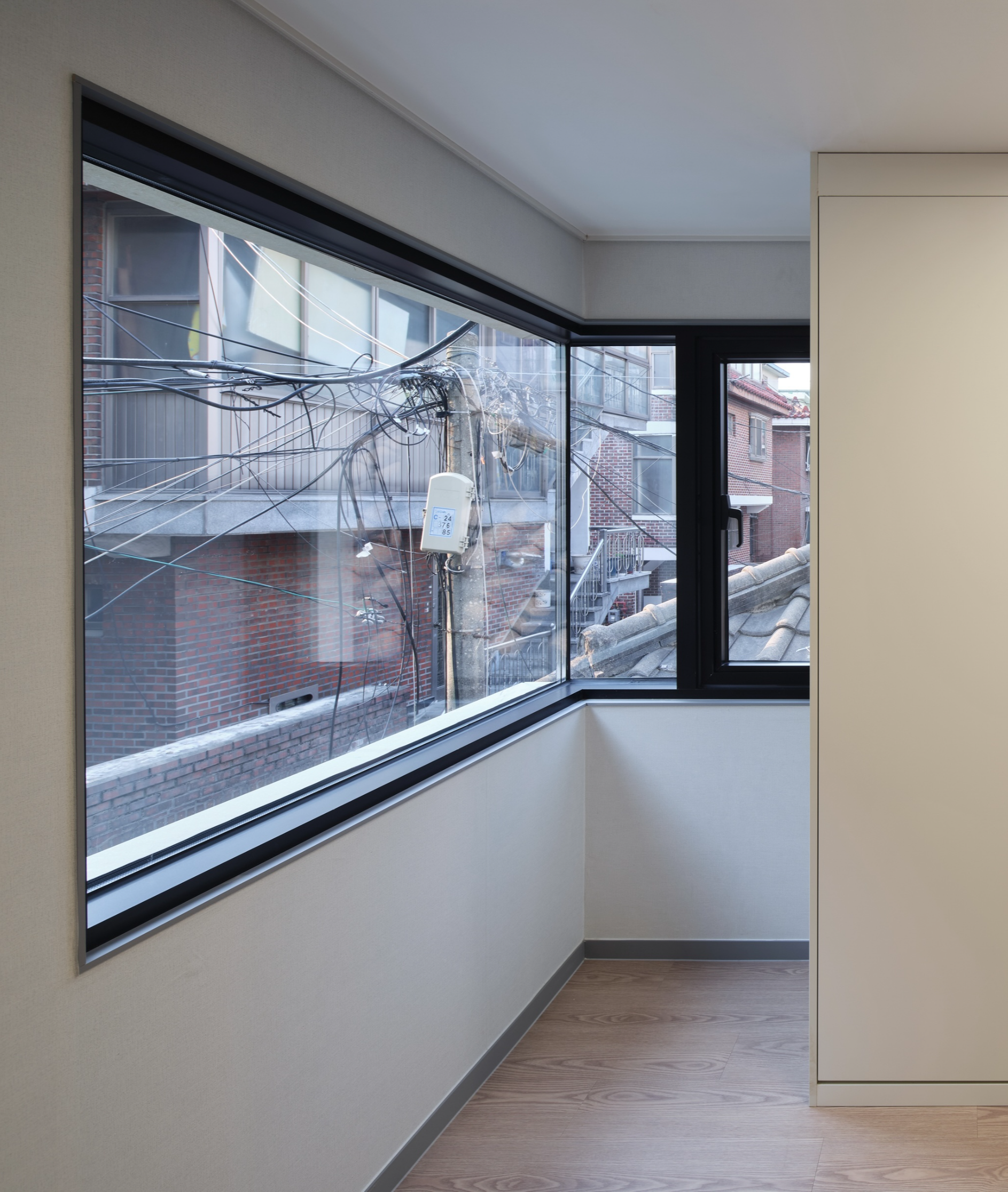 대지 남측 낮은 건물 쪽으로 방들을 배치하고 북쪽으로 코어를 구성하여, 향과 조망을 고려하였다.