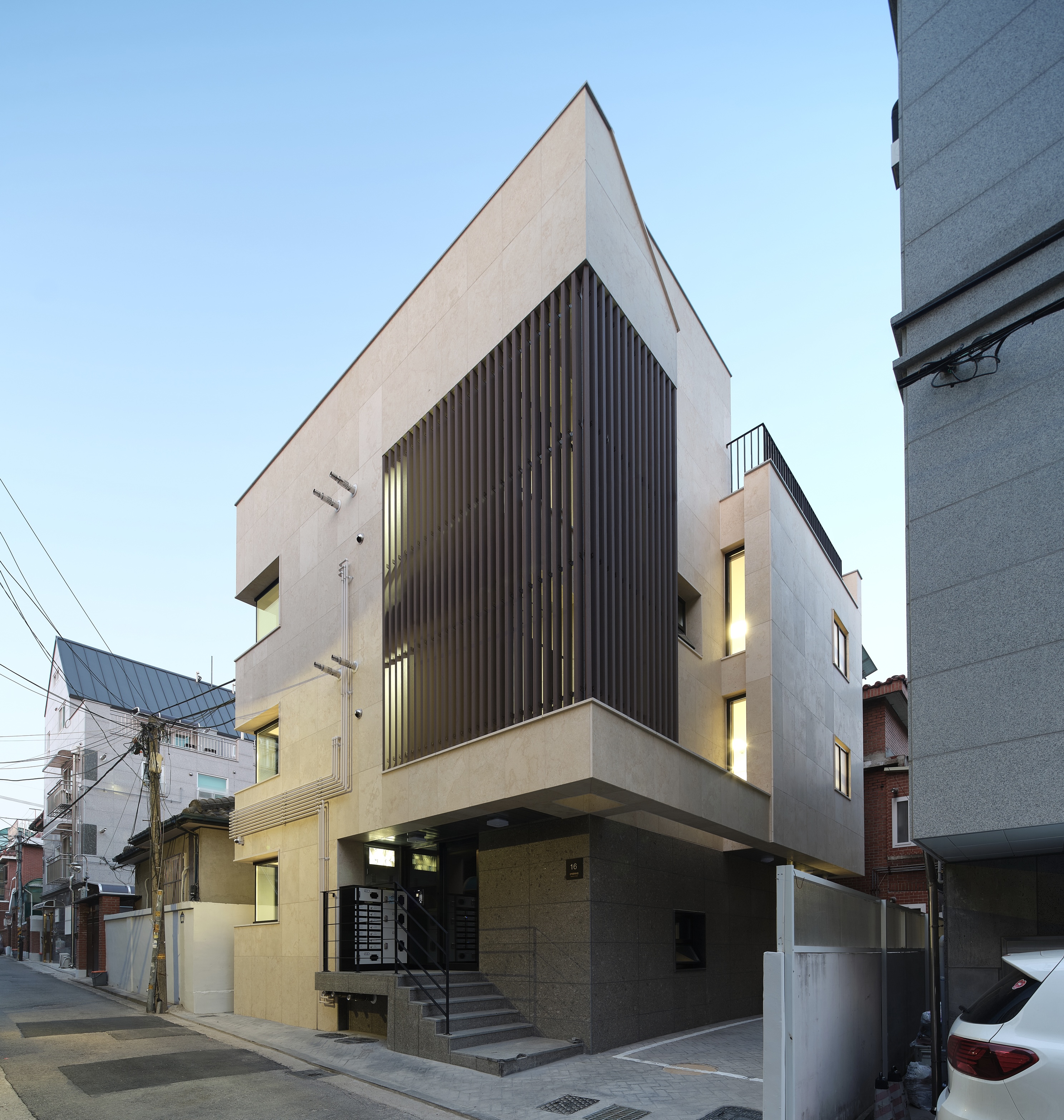 전면부에 목재루버를 입면요소로 활용한 발코니를 구성했다. 휴게 및 실외기 설치 등이 가능한 중성적인 외부공간으로 작은 원룸건물의 협소한 공용부를 확장시킨다.