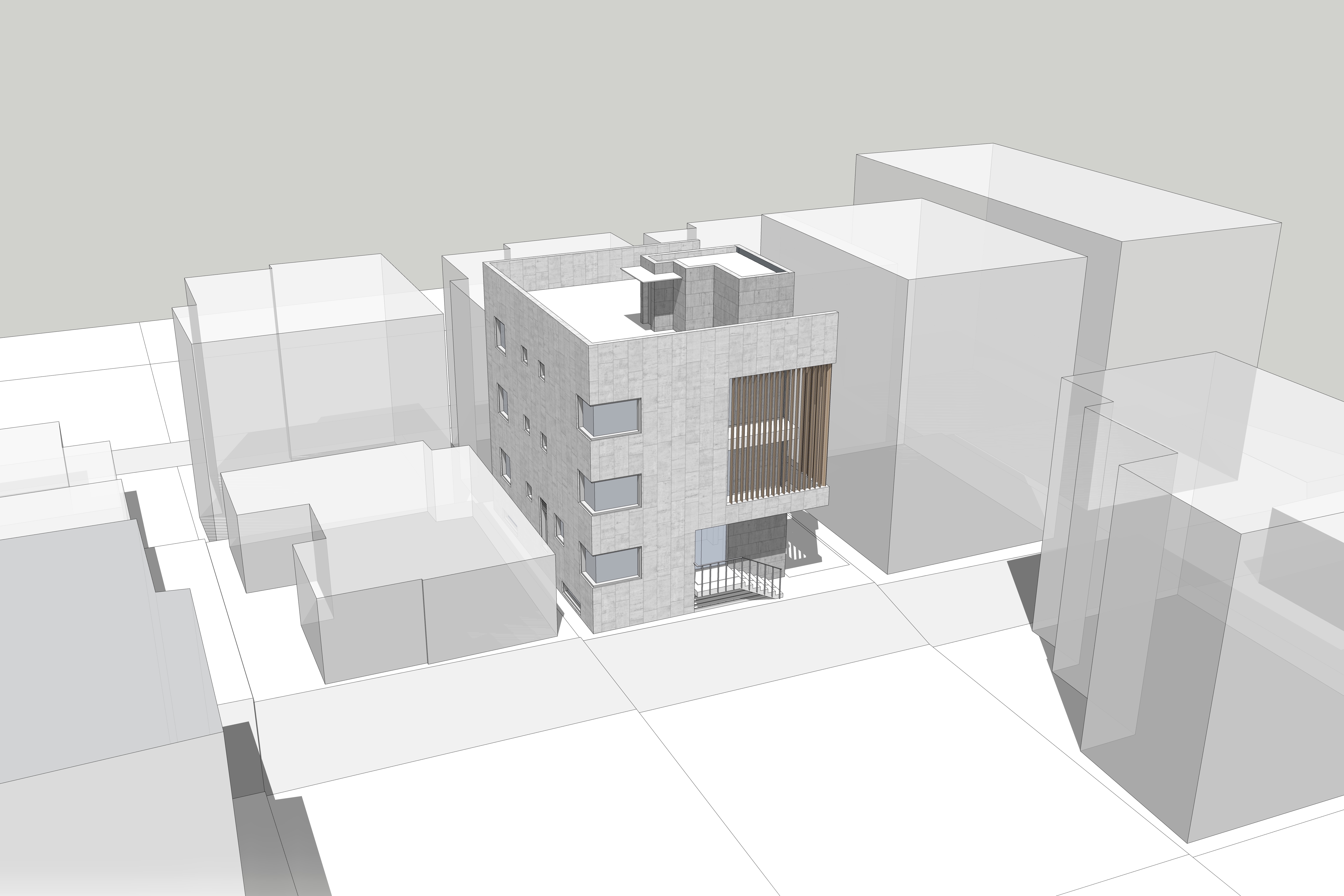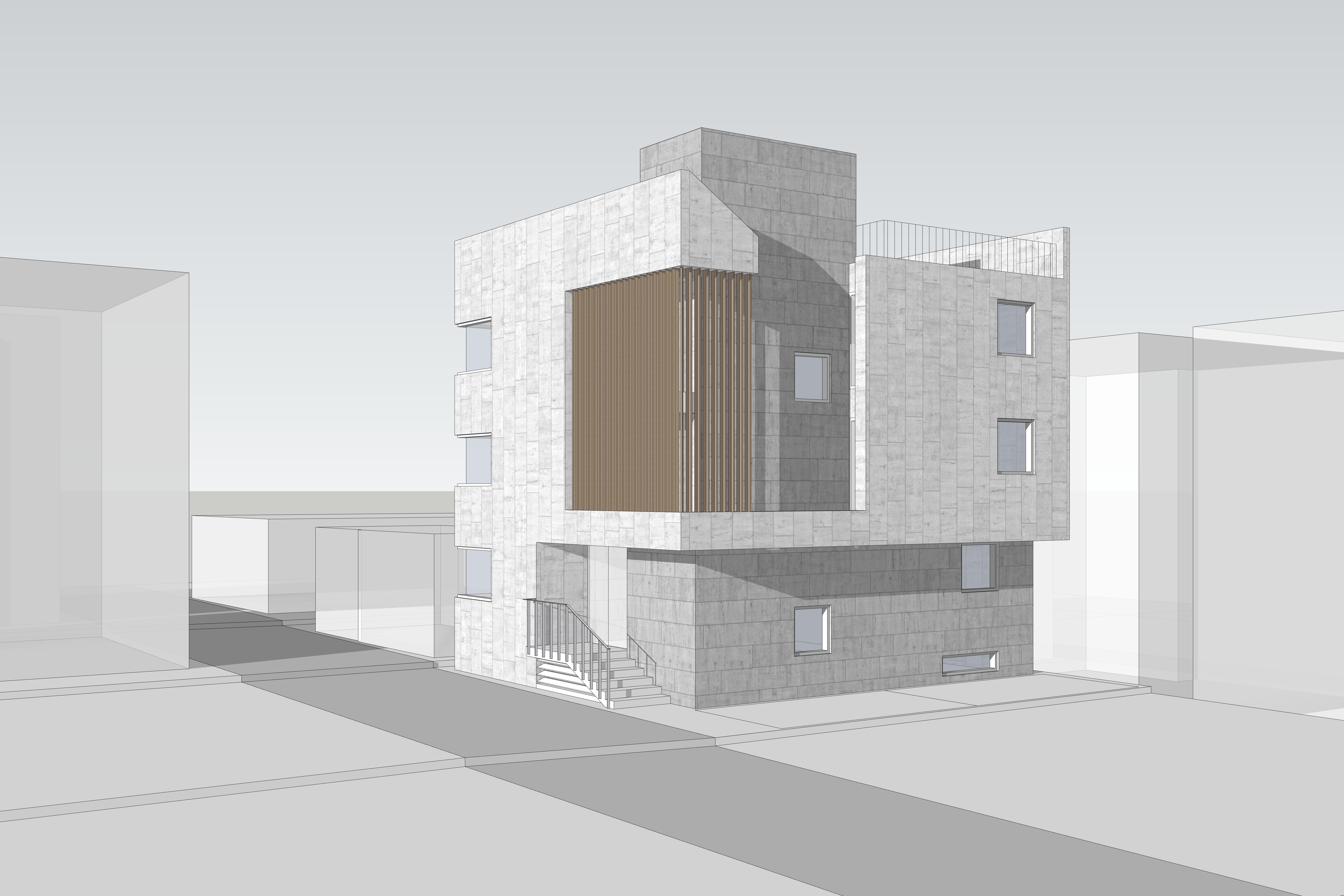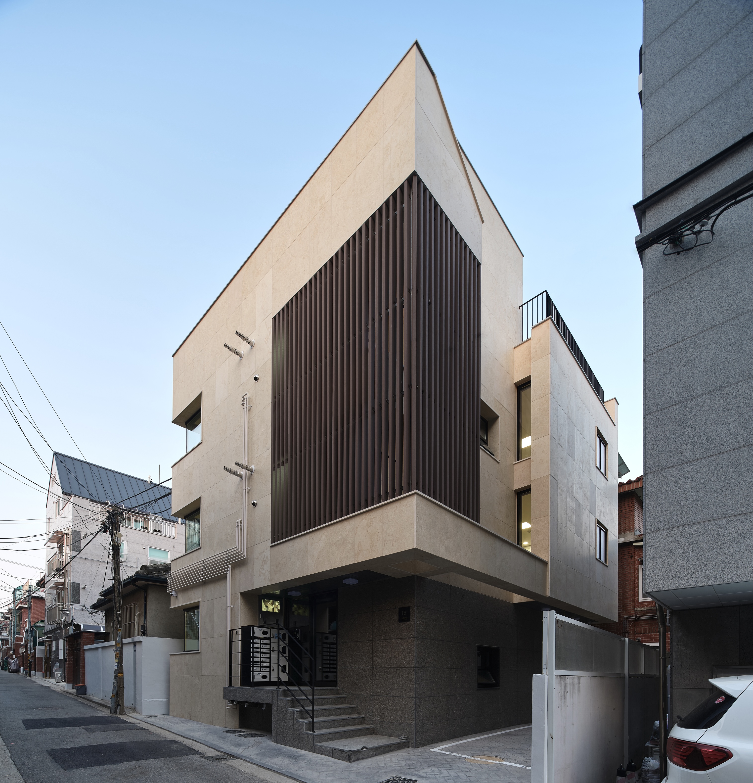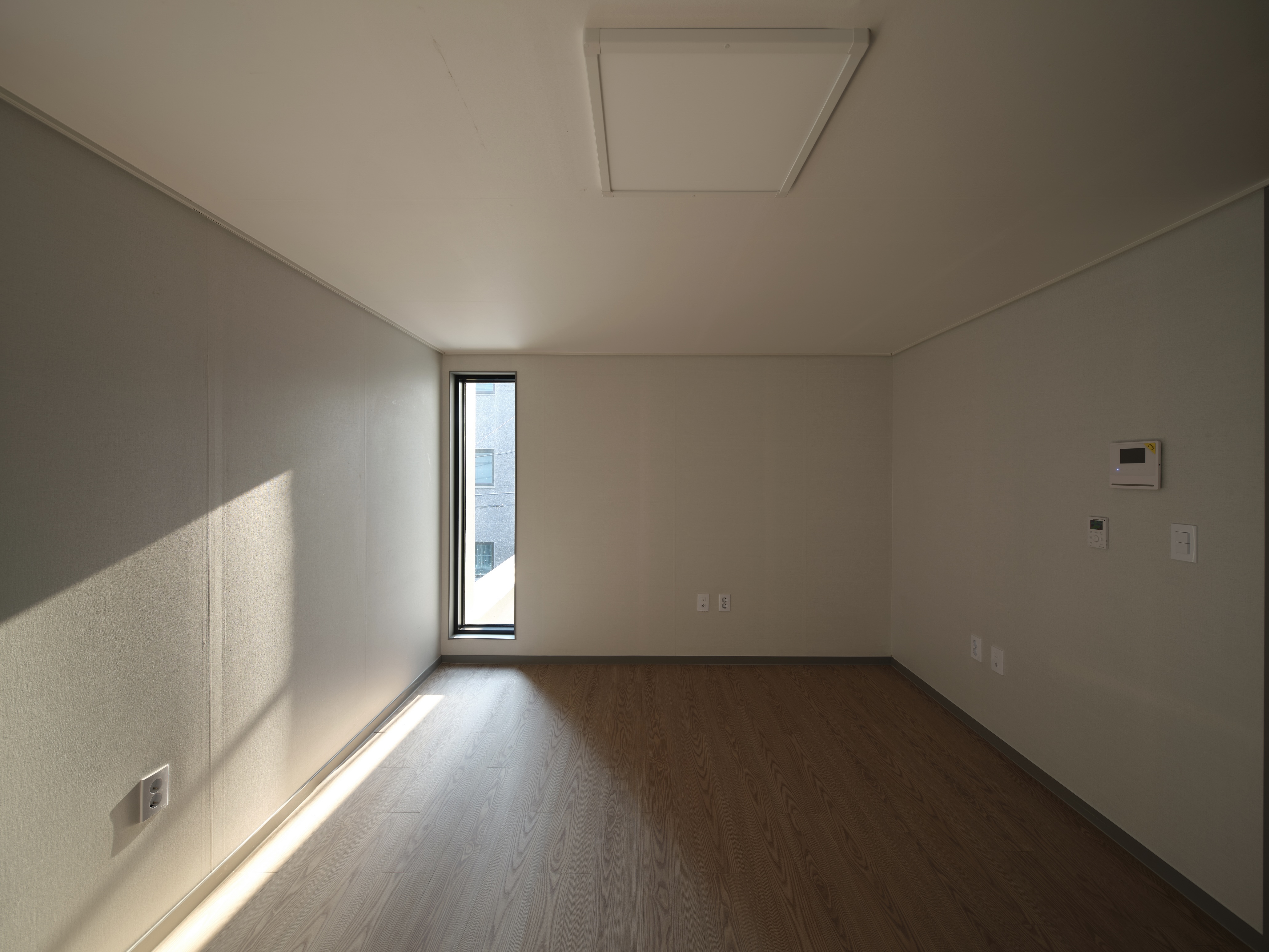 전면부에 목재루버를 입면요소로 활용한 발코니를 구성했다. 휴게 및 실외기 설치 등이 가능한 중성적인 외부공간으로 작은 원룸건물의 협소한 공용부를 확장시킨다.