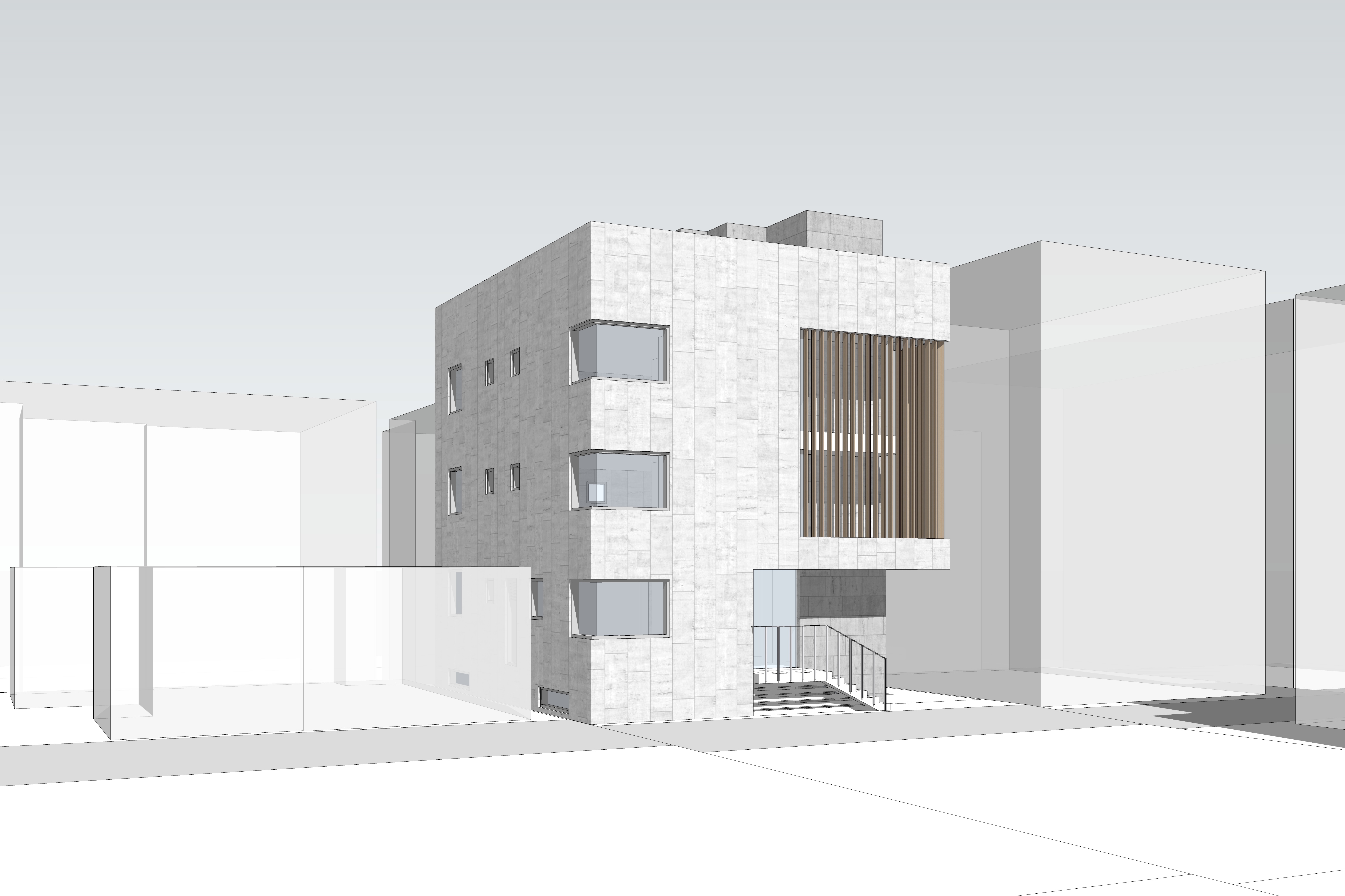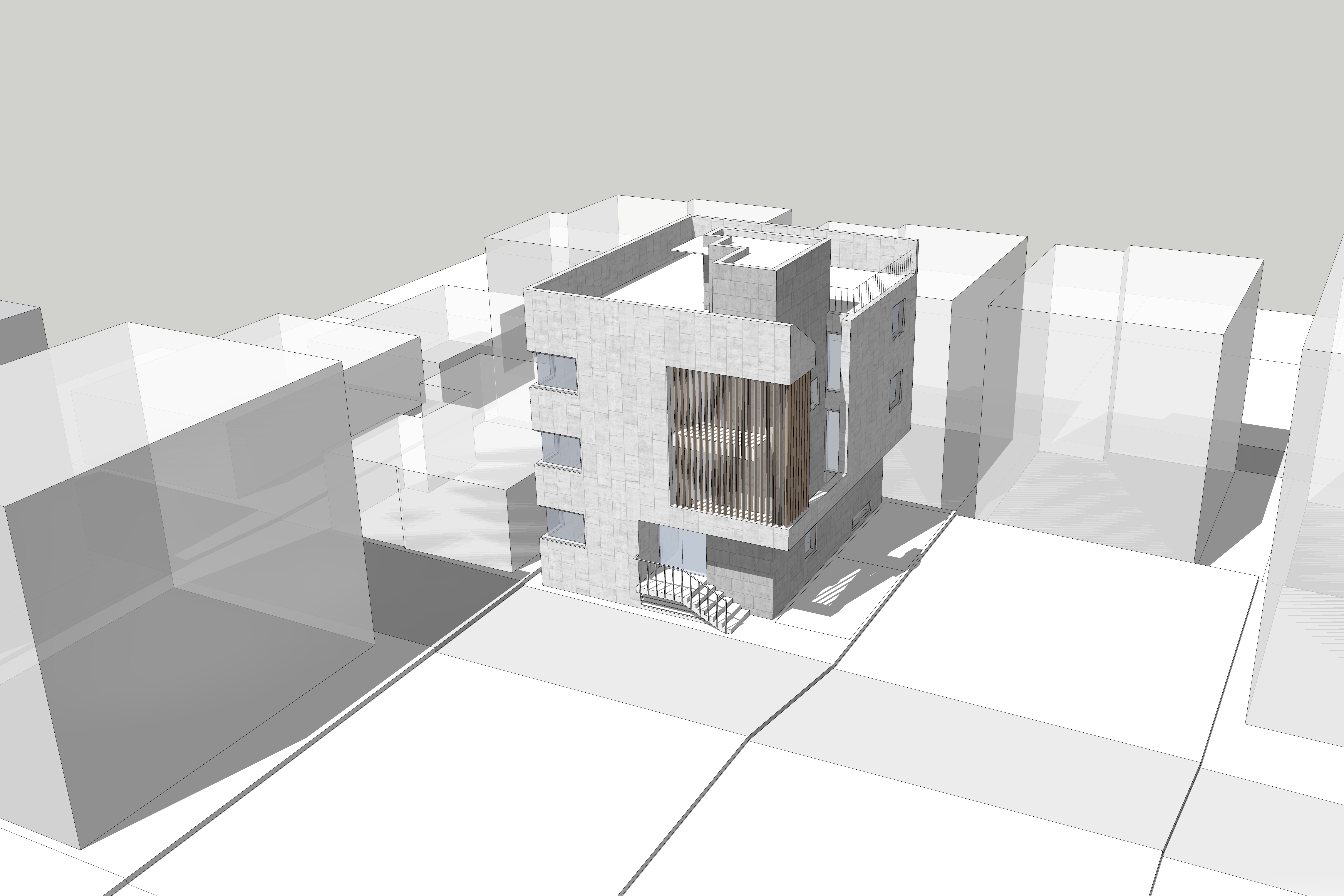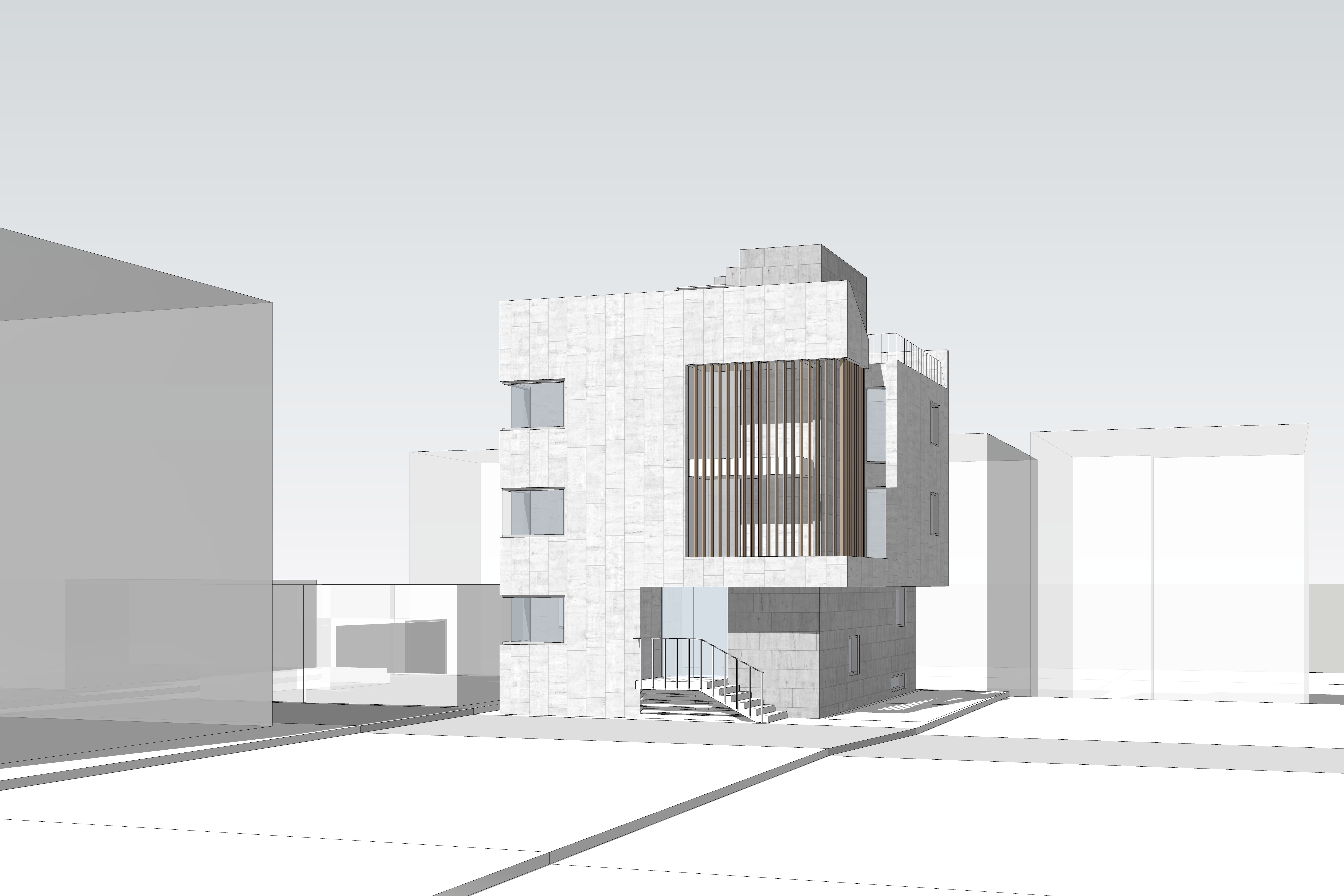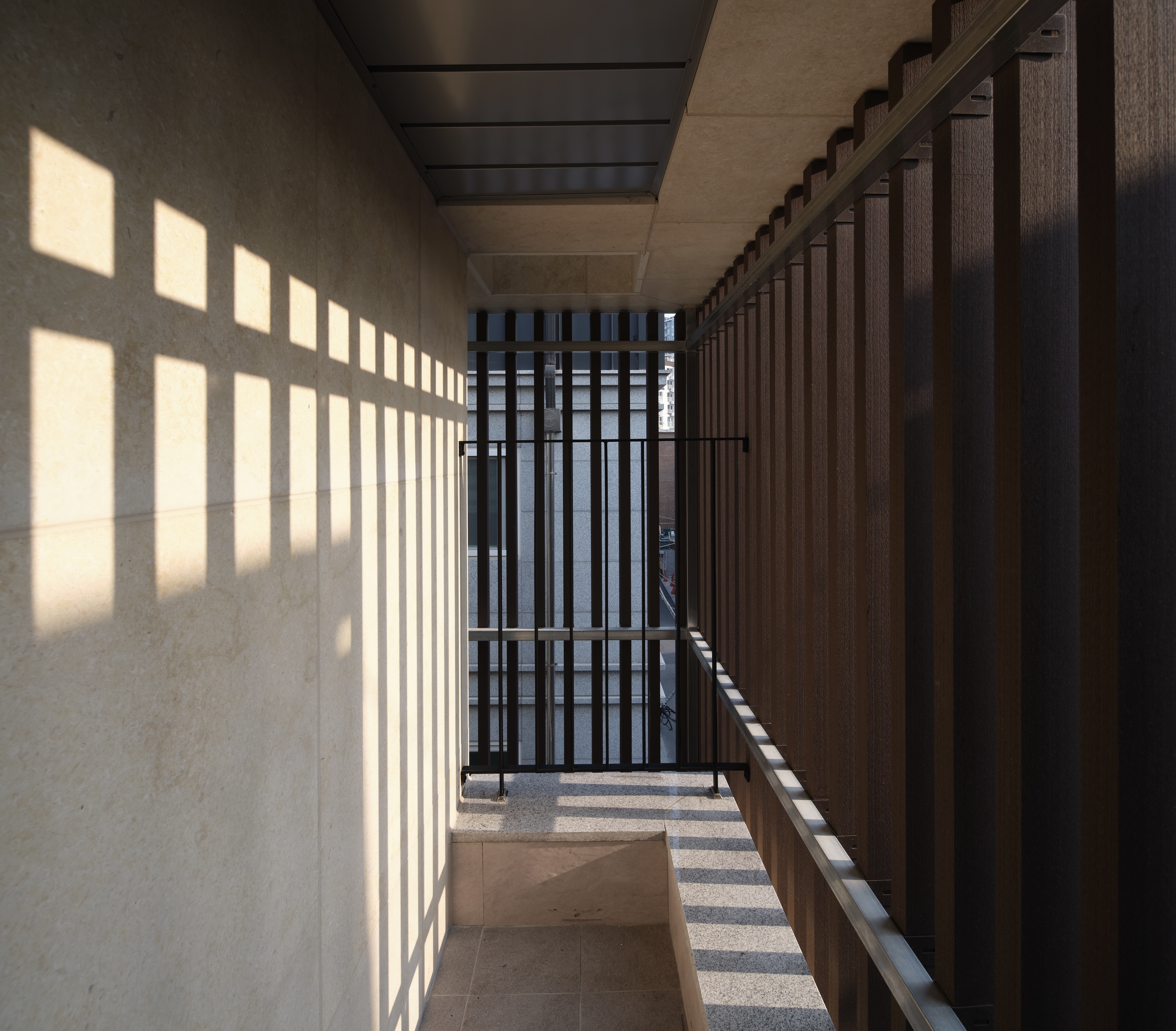 전면부에 목재루버를 입면요소로 활용한 발코니를 구성했다. 휴게 및 실외기 설치 등이 가능한 중성적인 외부공간으로 작은 원룸건물의 협소한 공용부를 확장시킨다.
