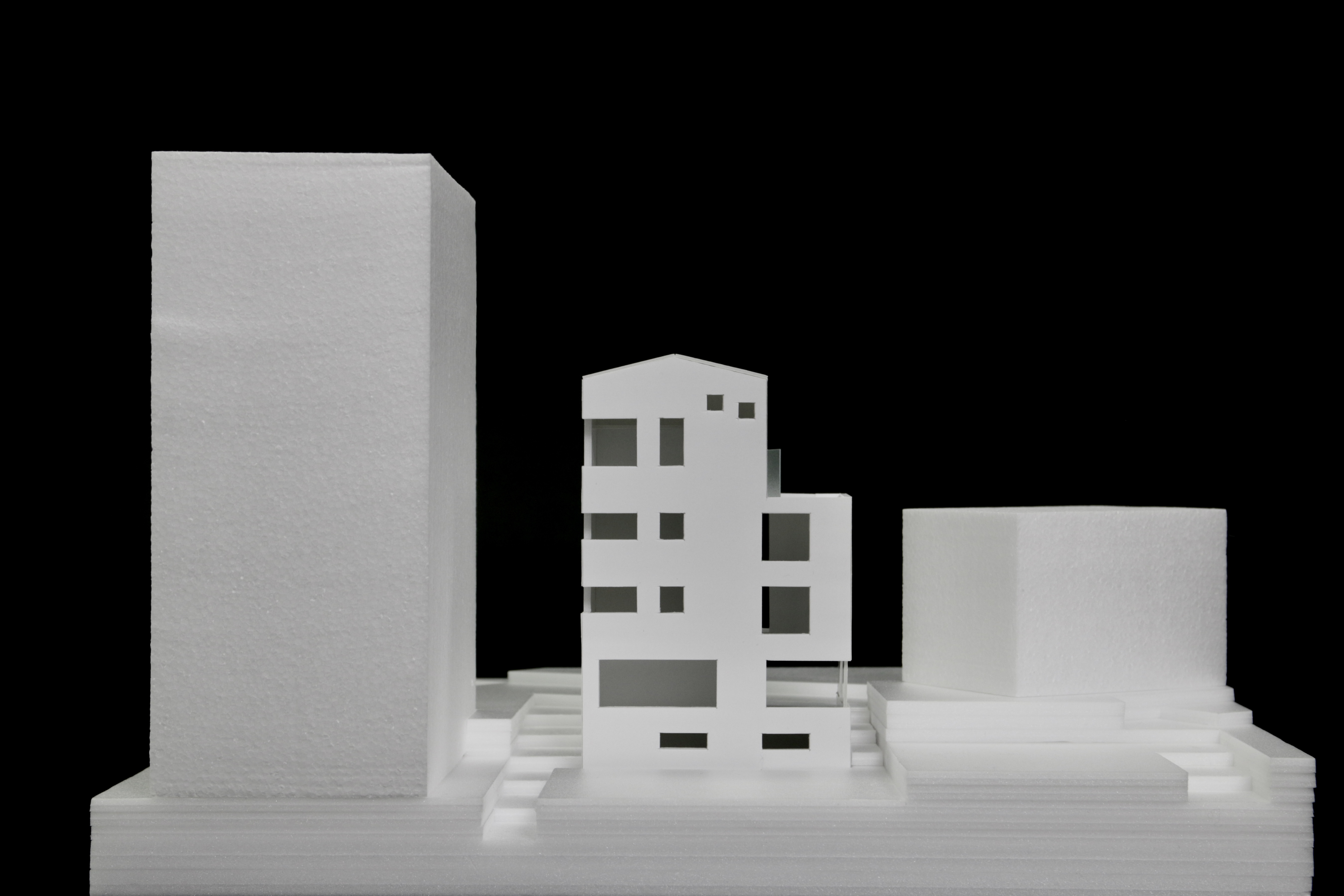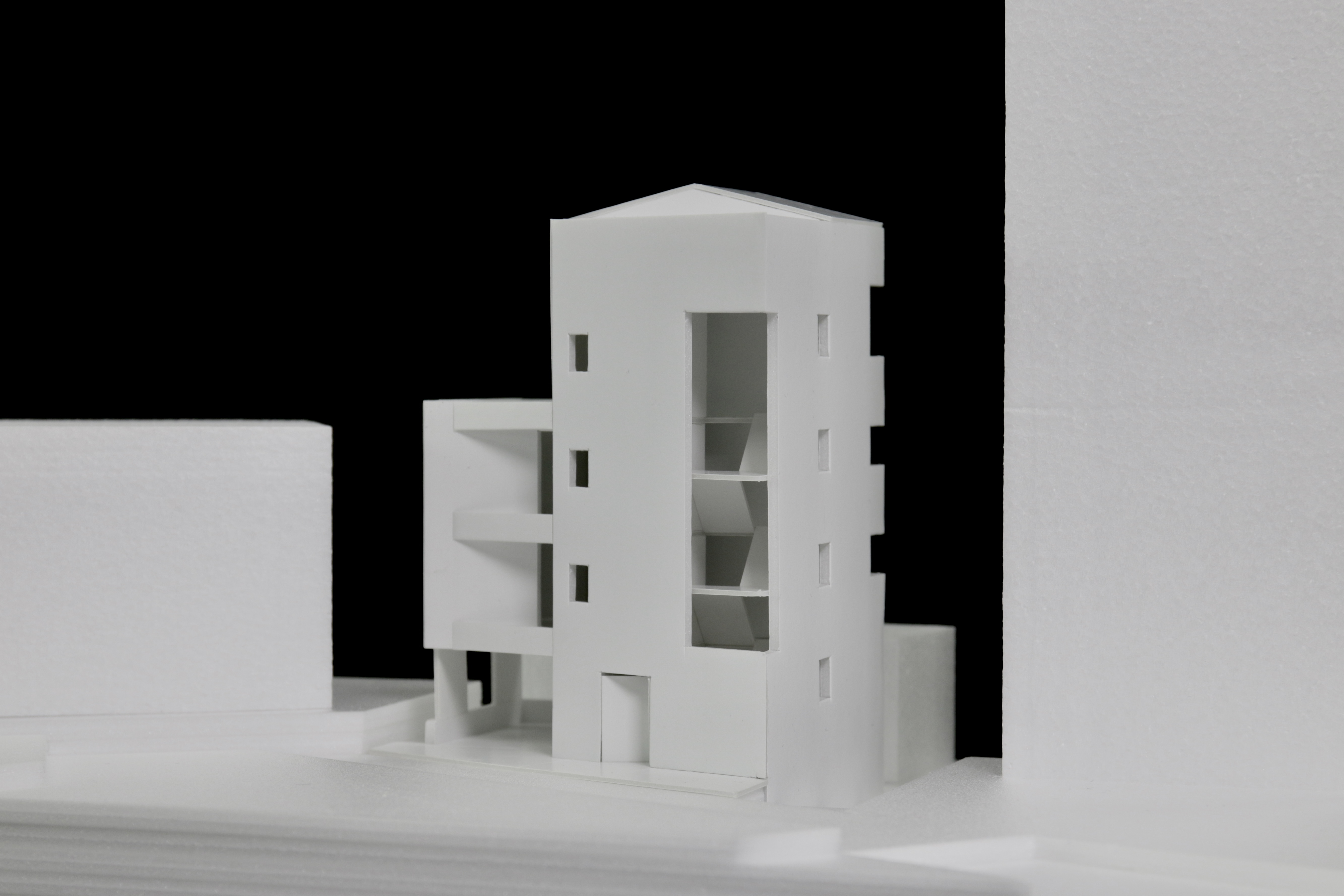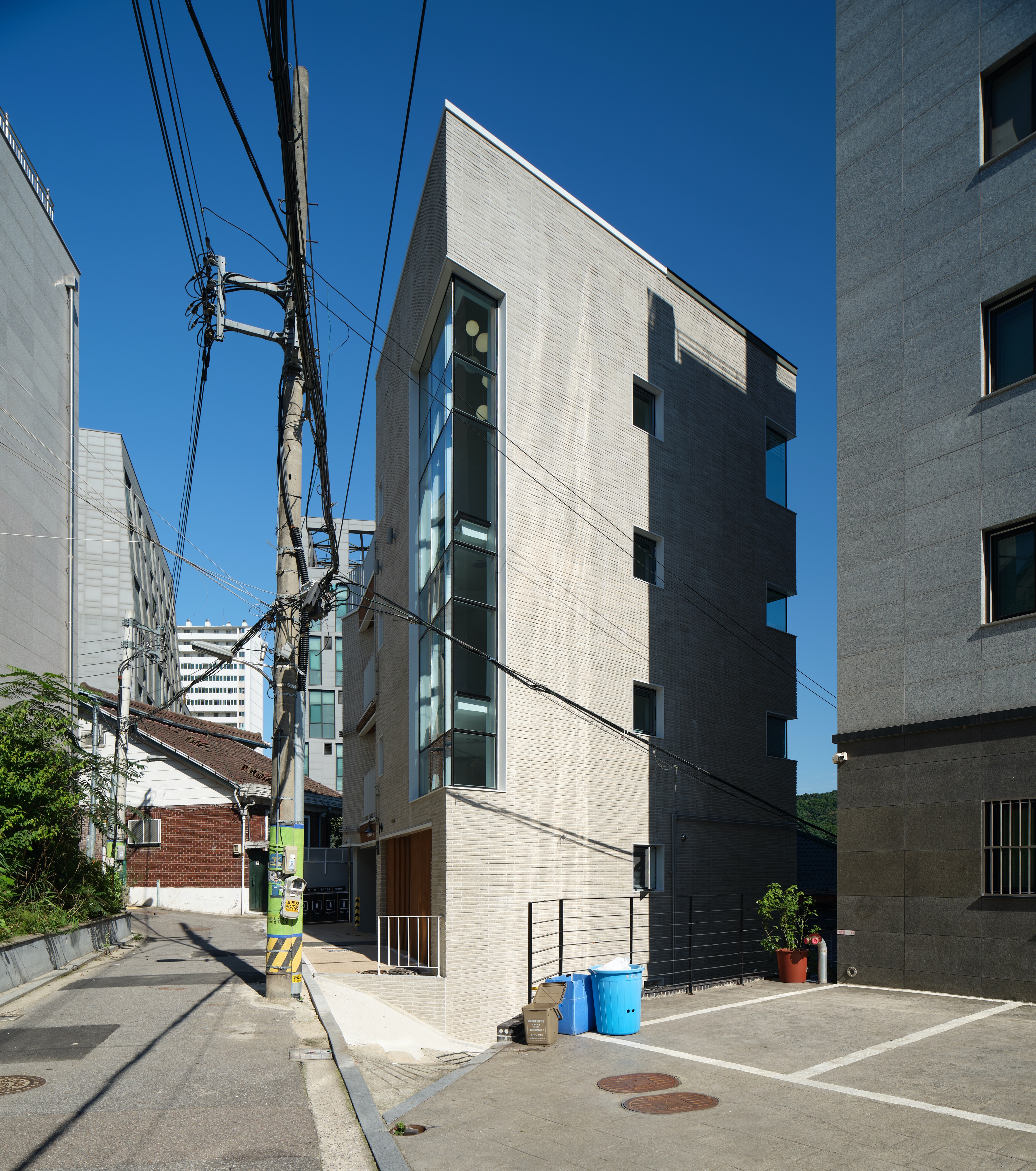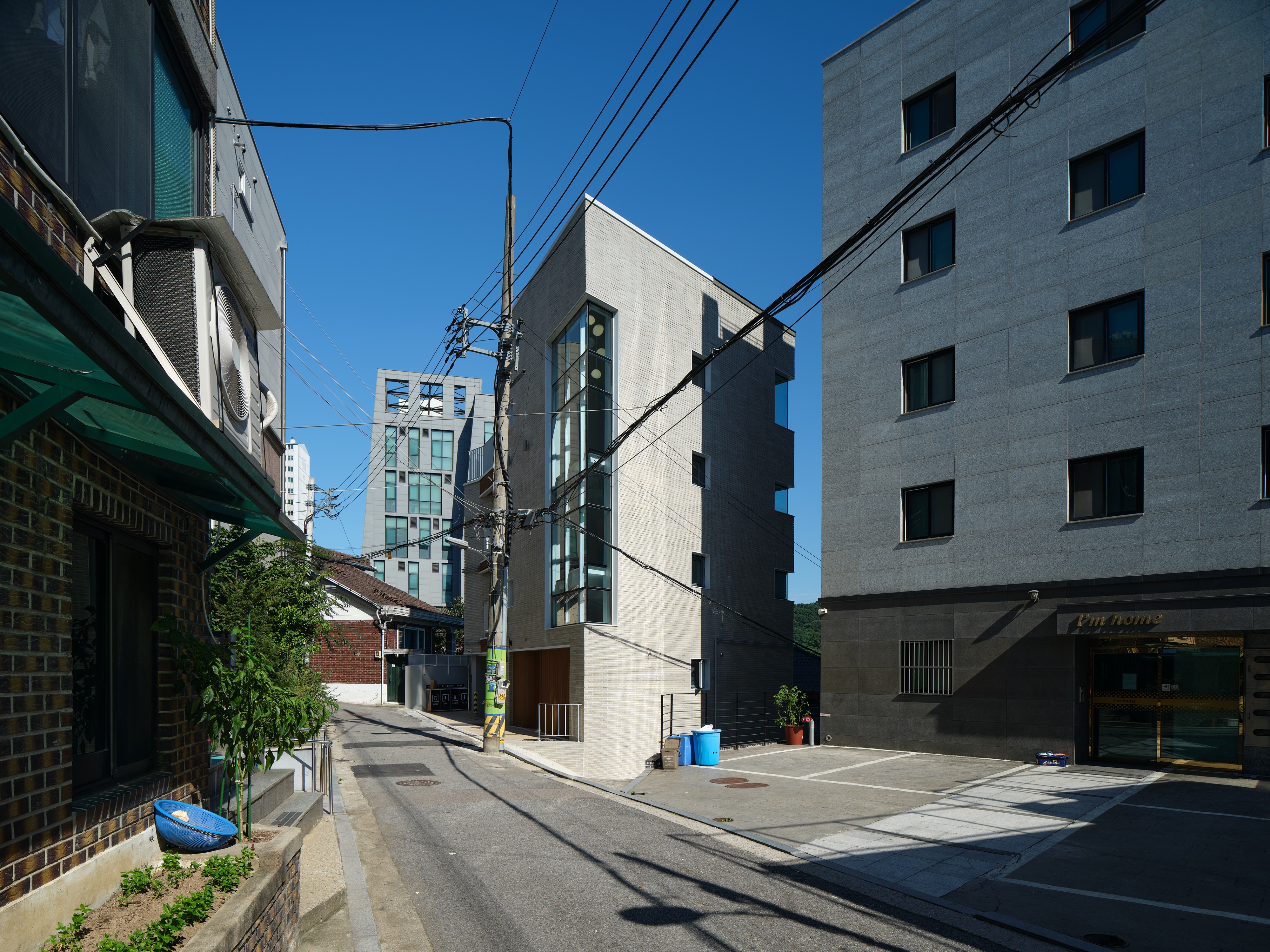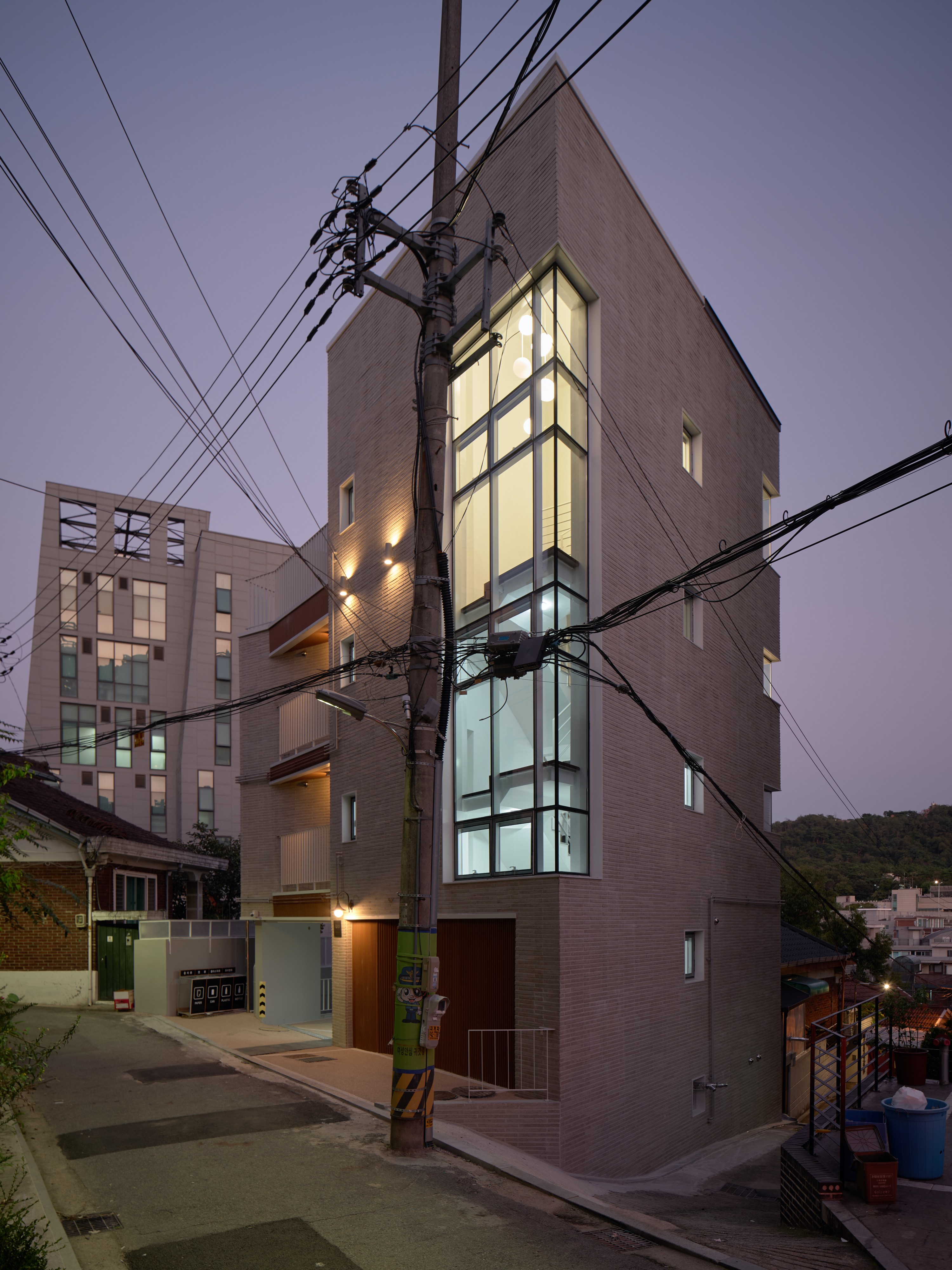 사다리꼴 모양의 작은 대지에서 낭비되는 공간 없이 짜임새 있는 평면을 만드는 것에 집중했다.