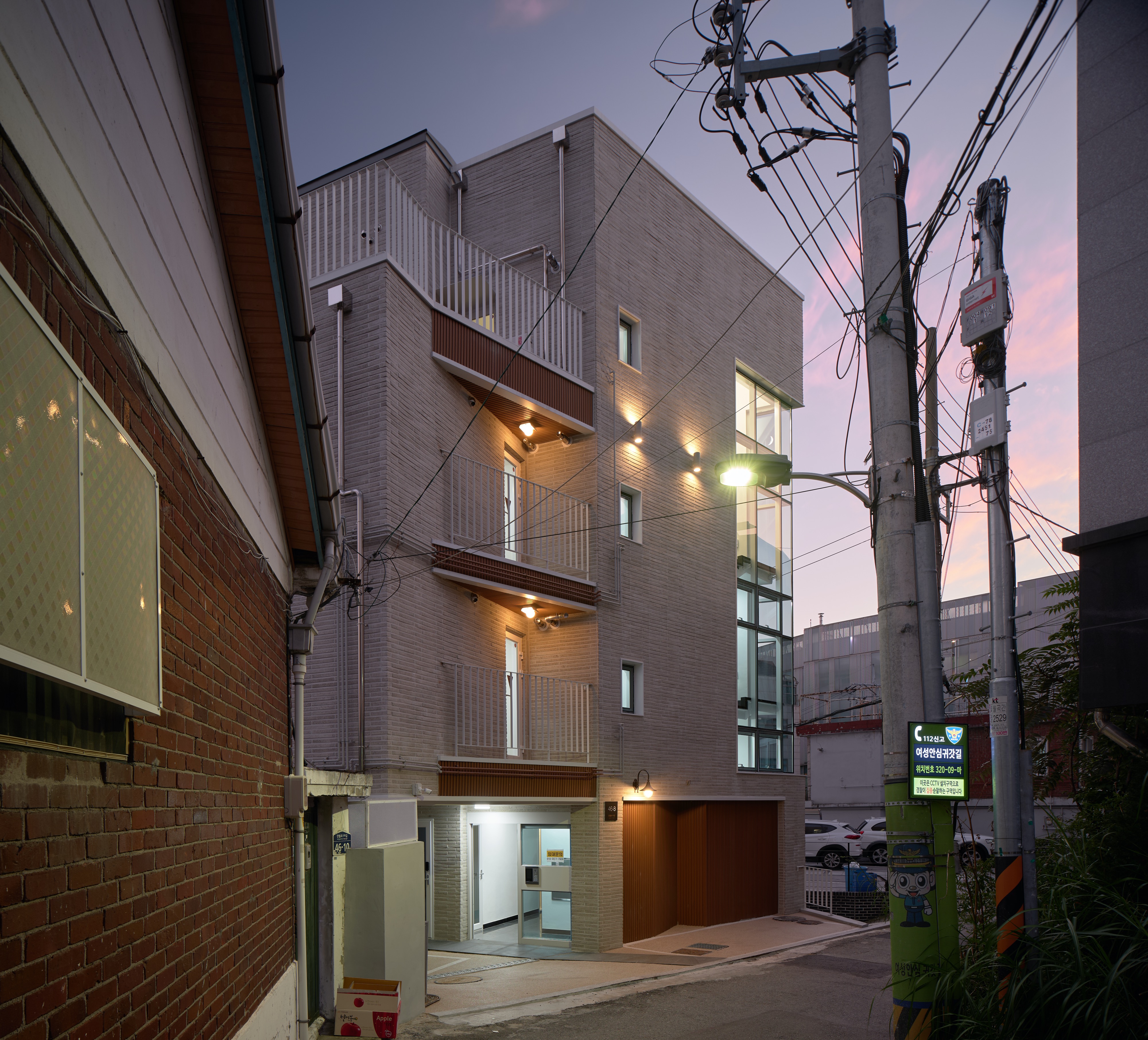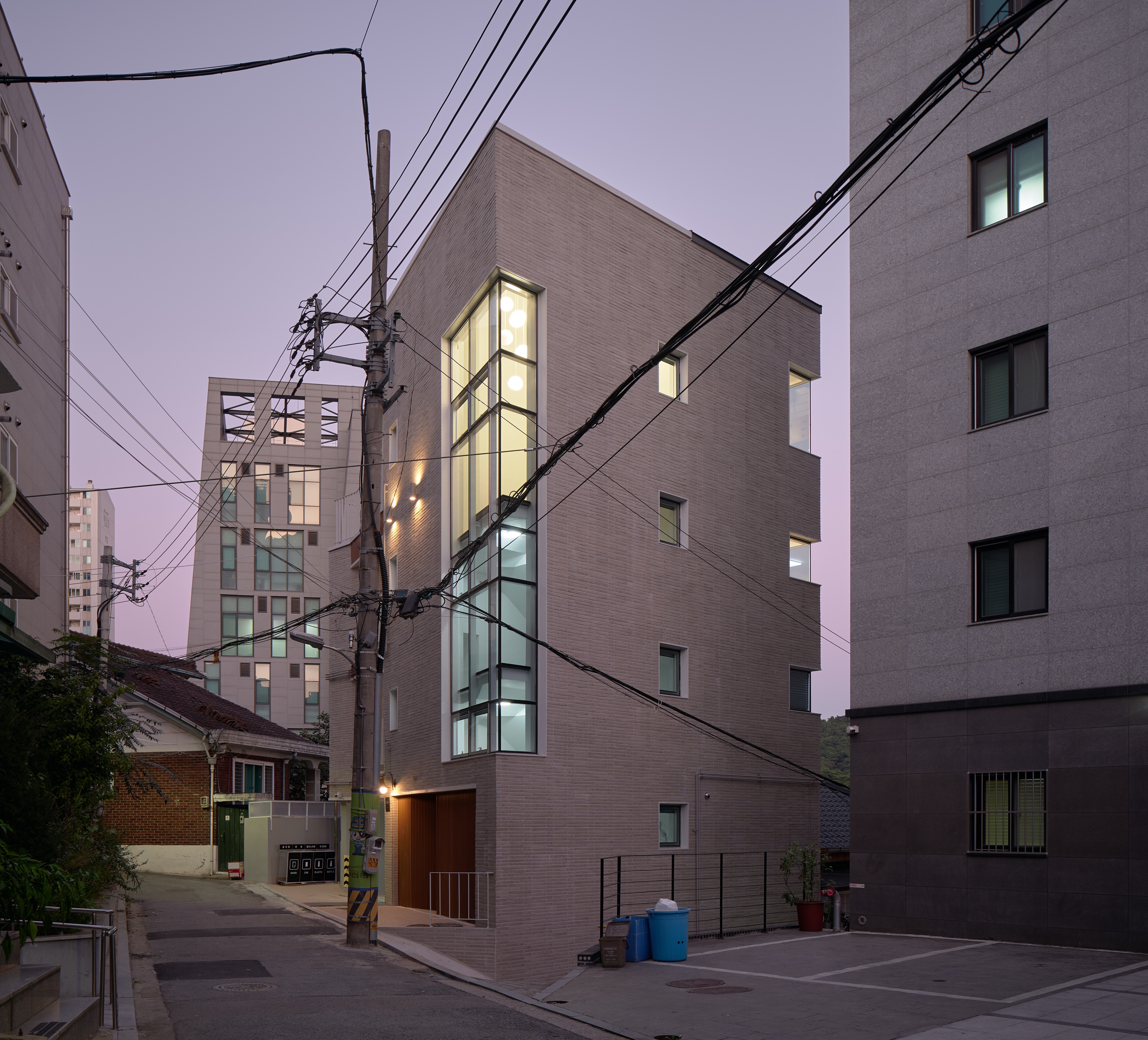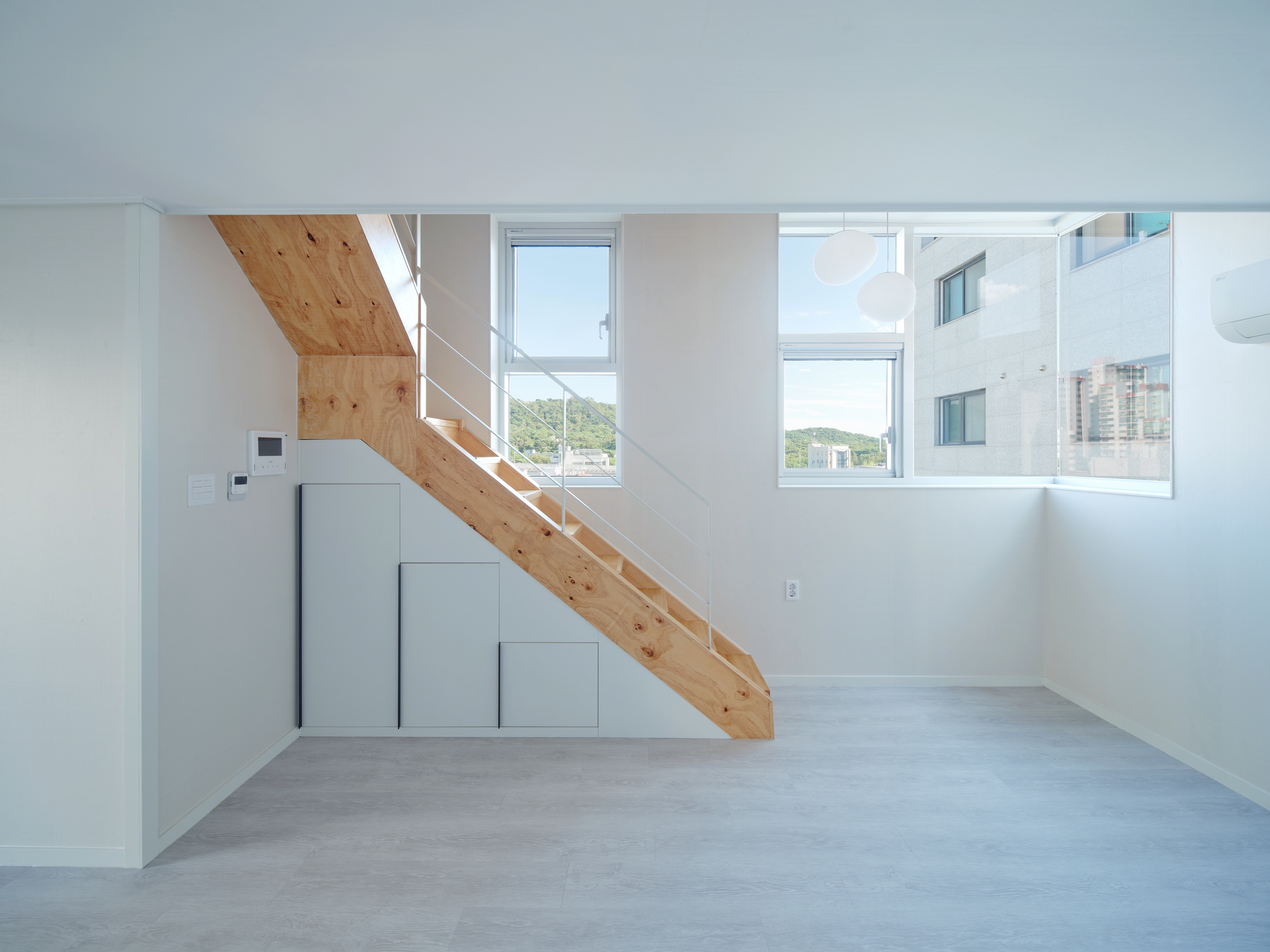 향과 조망을 고려하여 남쪽과 골목 쪽으로 집중하여 창을 내고, 북서측 모퉁이를 활용하여 계단실을 배치했다.