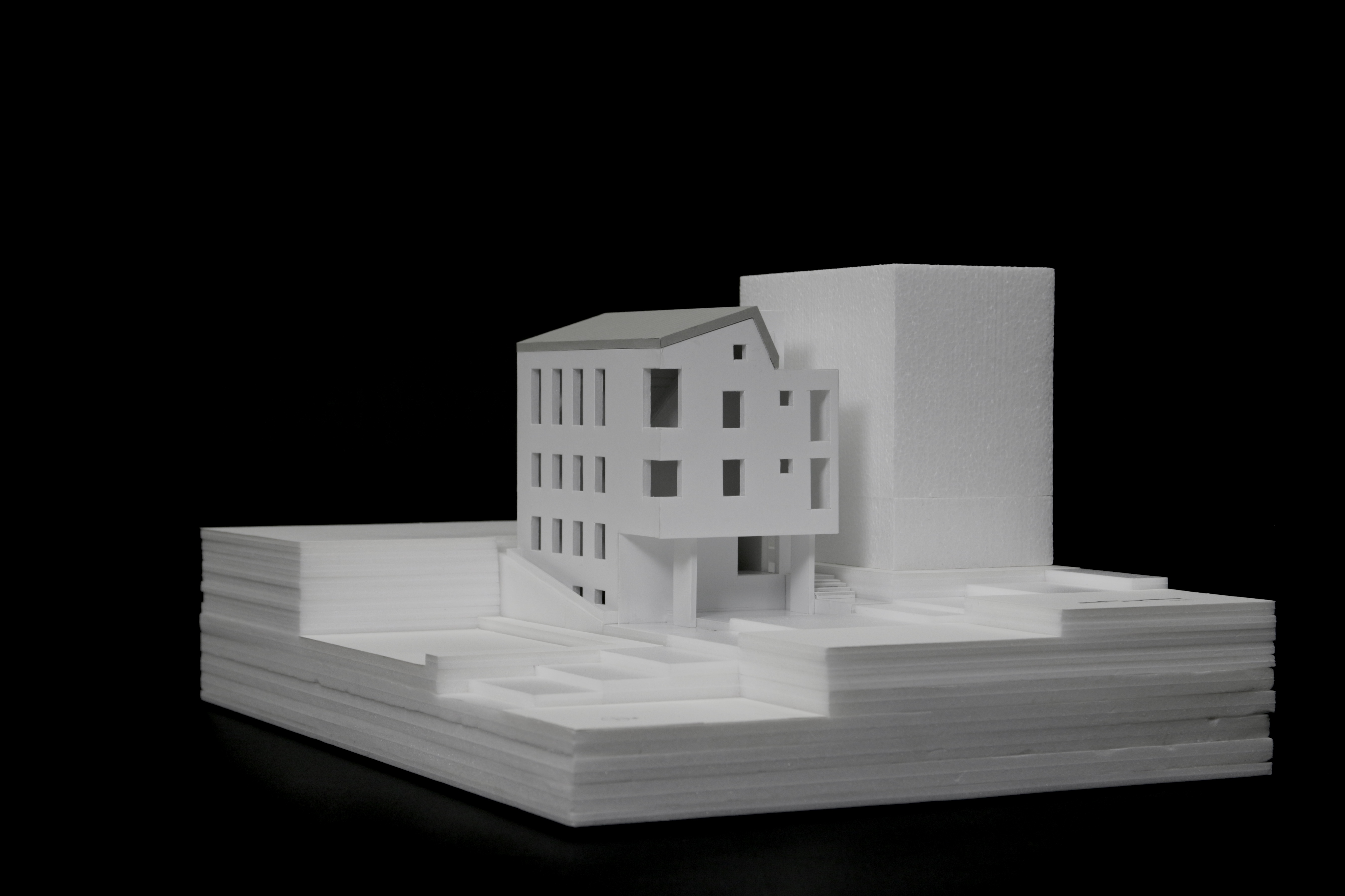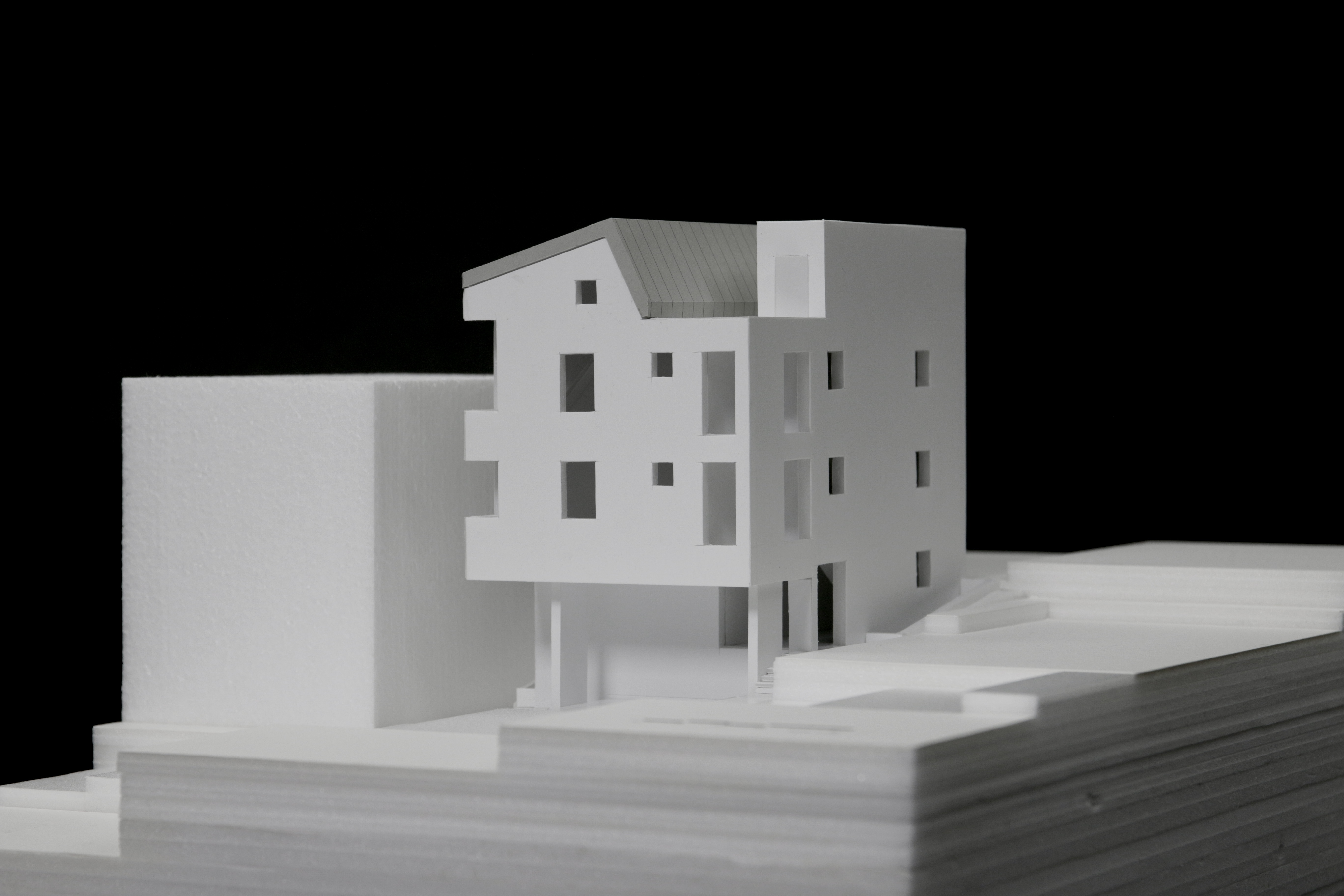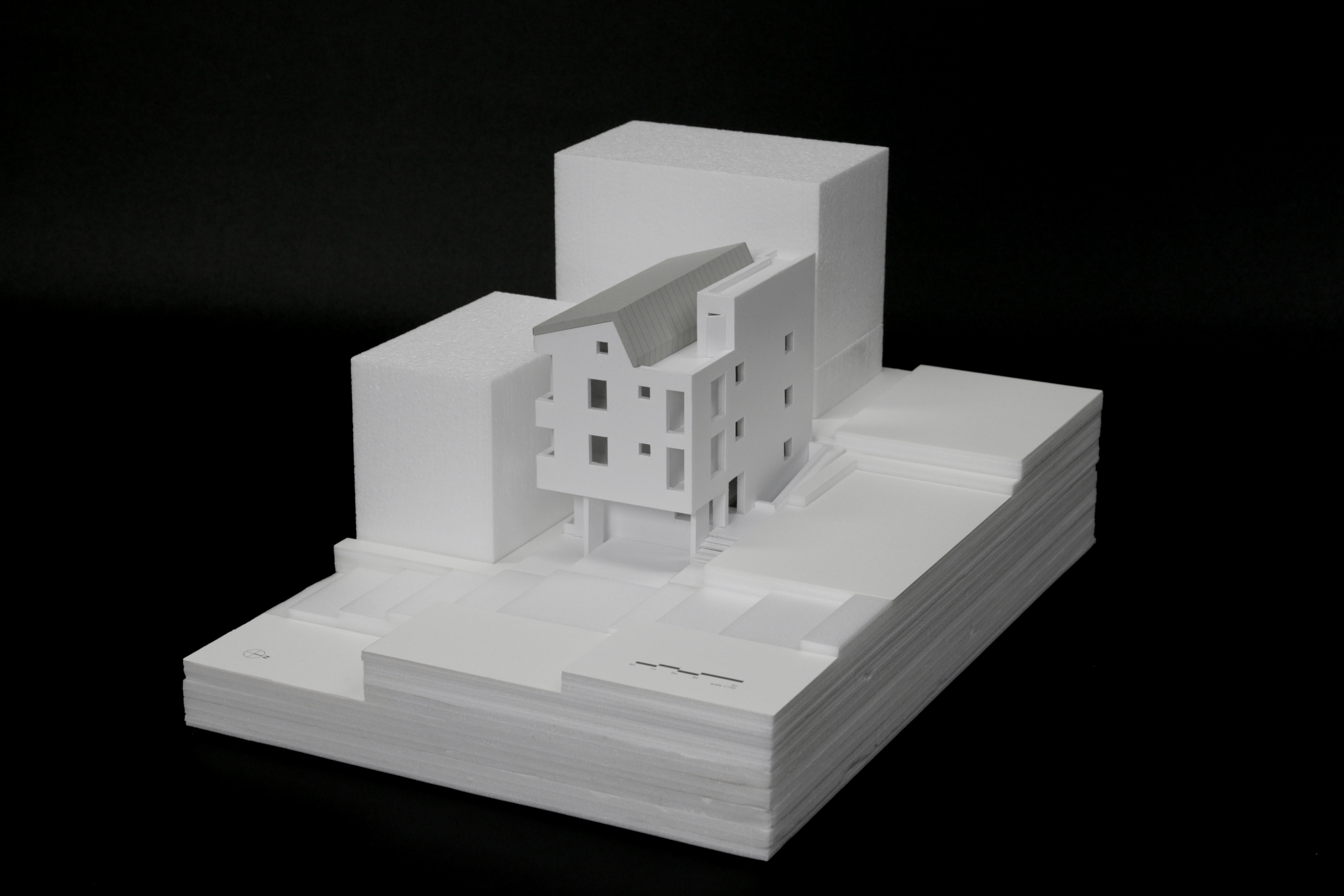 도로변으로 3대의 주차를 확보하며 주출입구를 만들다 보니 2,3층의 건물 볼륨이 붕 떠있는 것처럼 느껴진다.