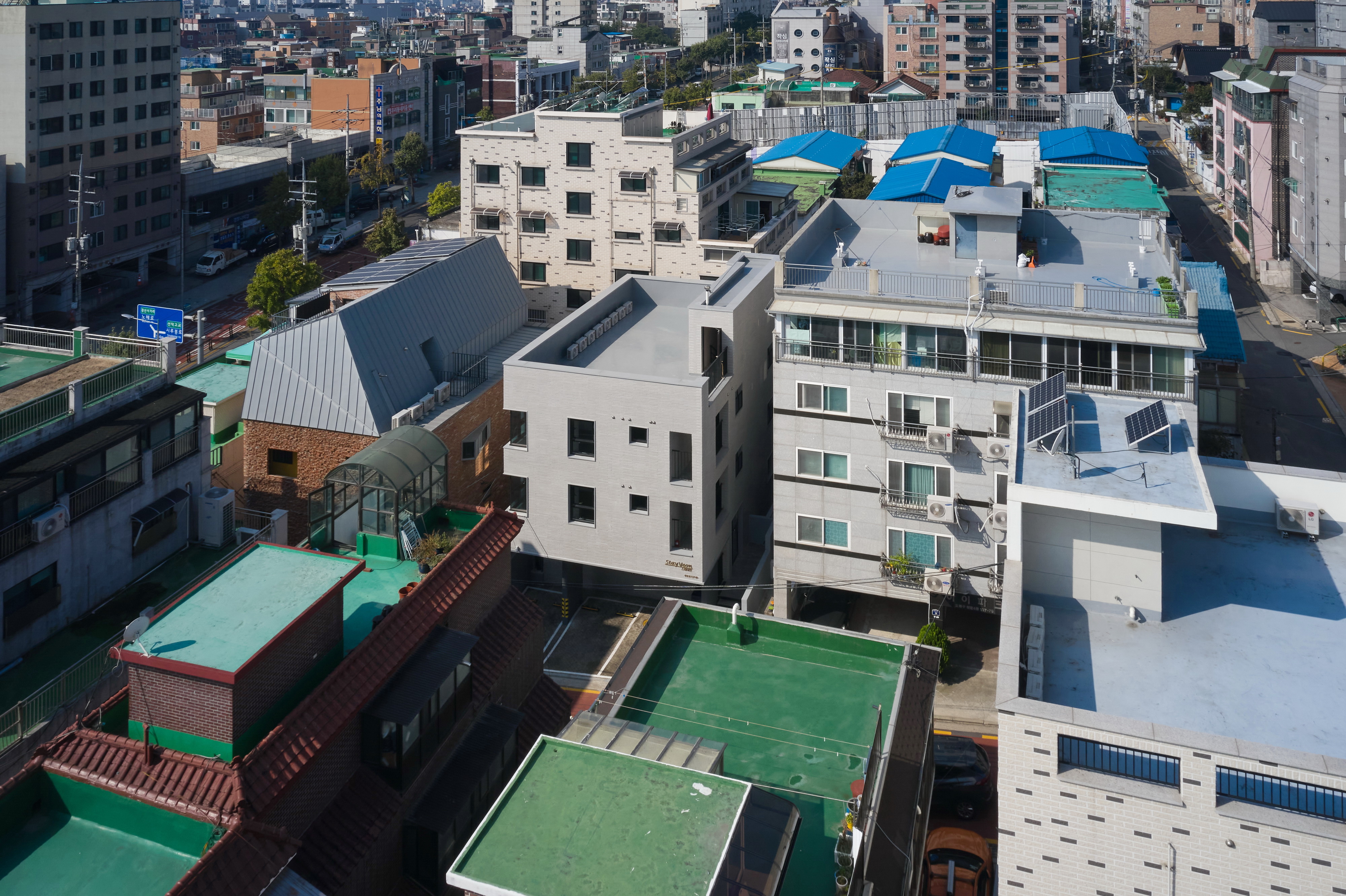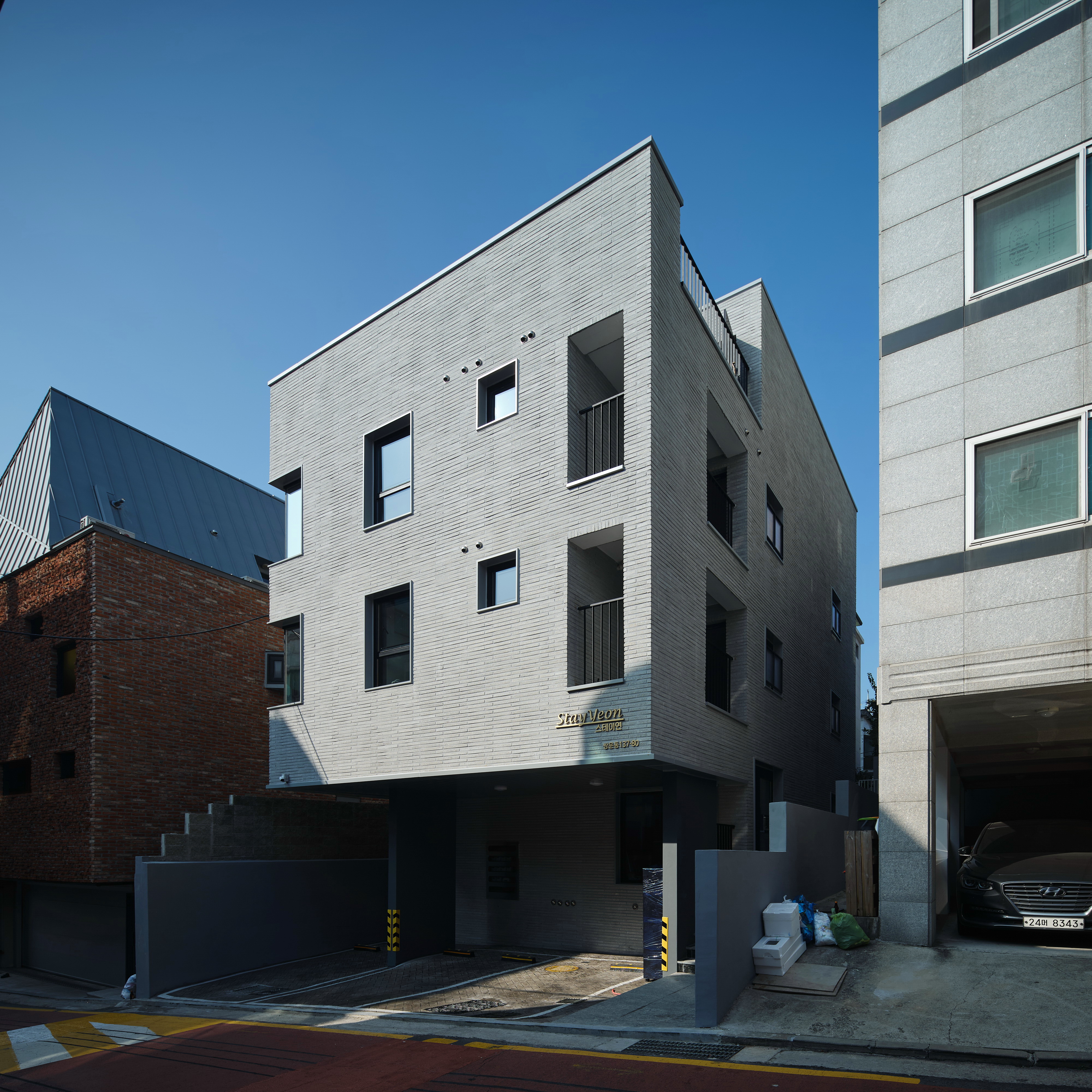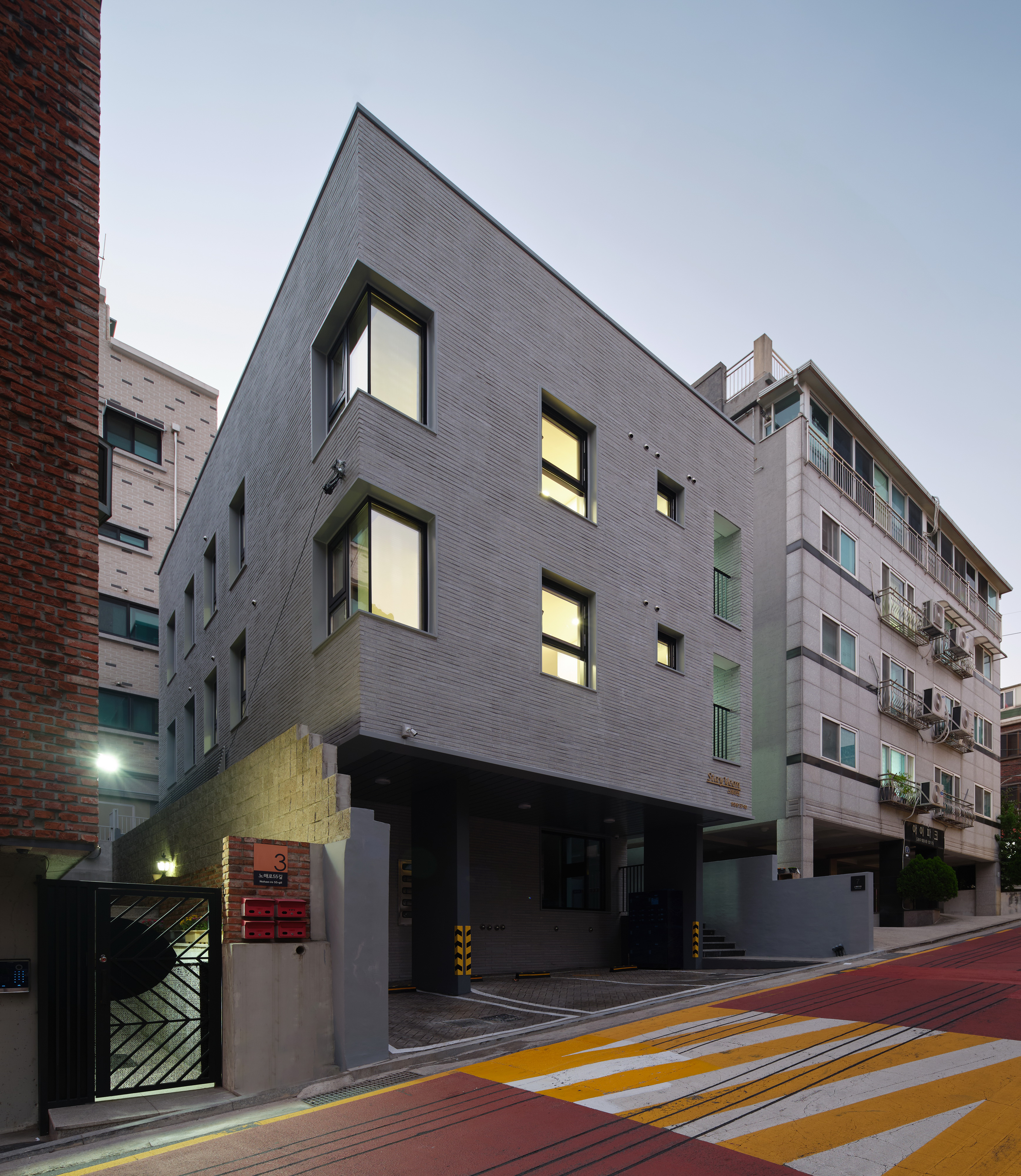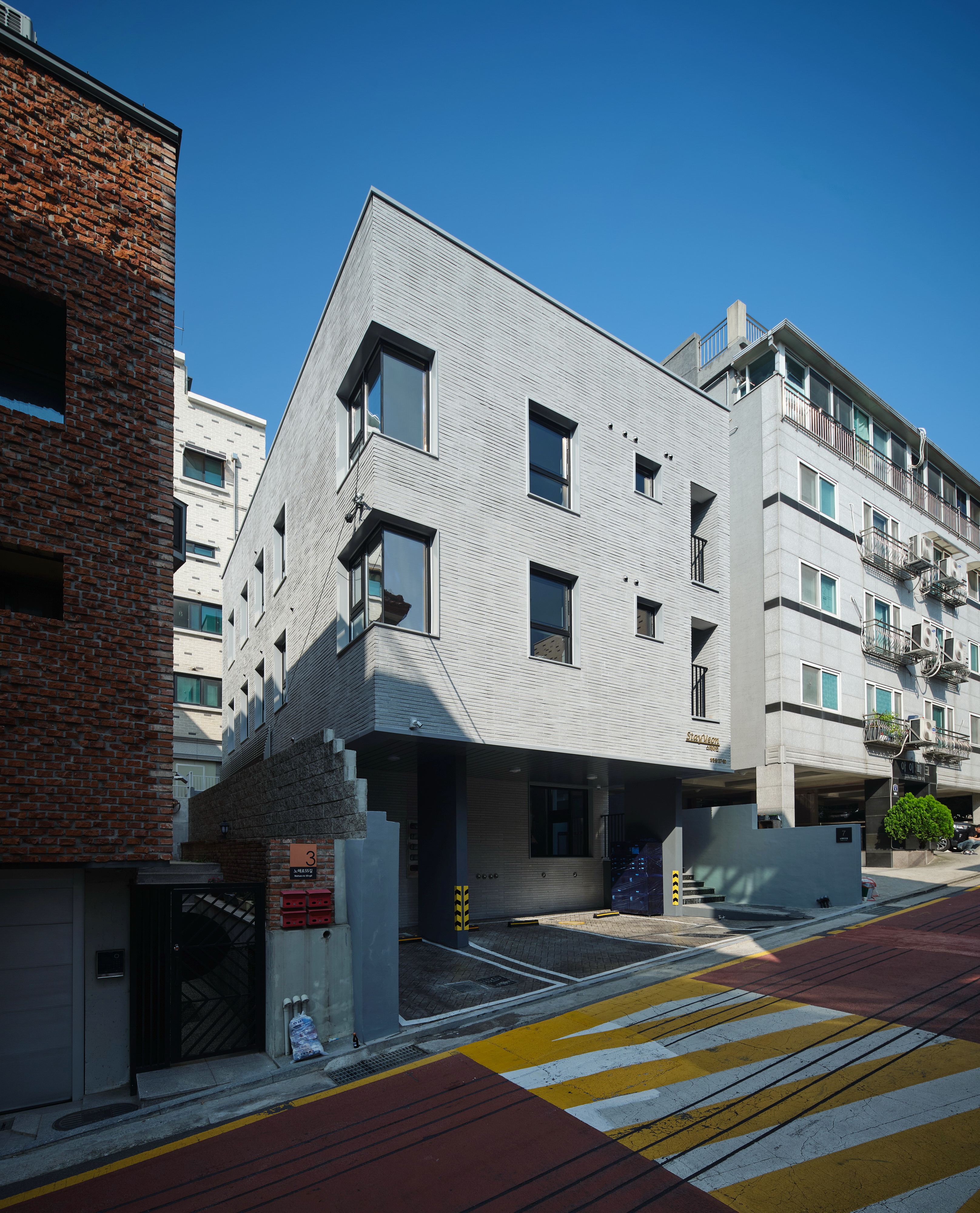 도로변을 제외한 모든 면이 인접 대지 건축물로 둘러싸여 있는 상황이라, 그중 채광과 조망이 양호한 남향으로 실들을 배치하고, 북쪽으로 계단실과 엘리베이터를 길쭉하게 구성했다.