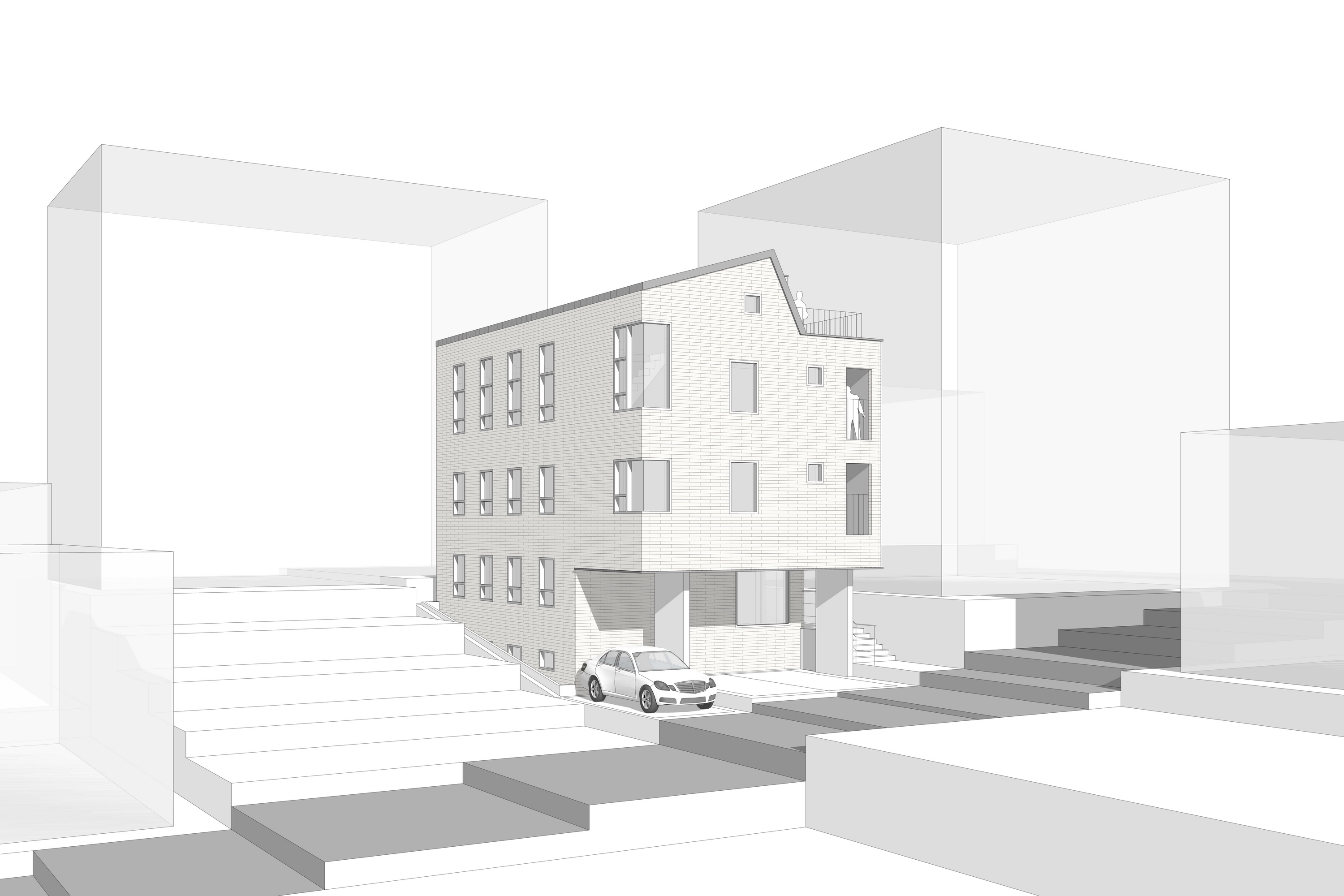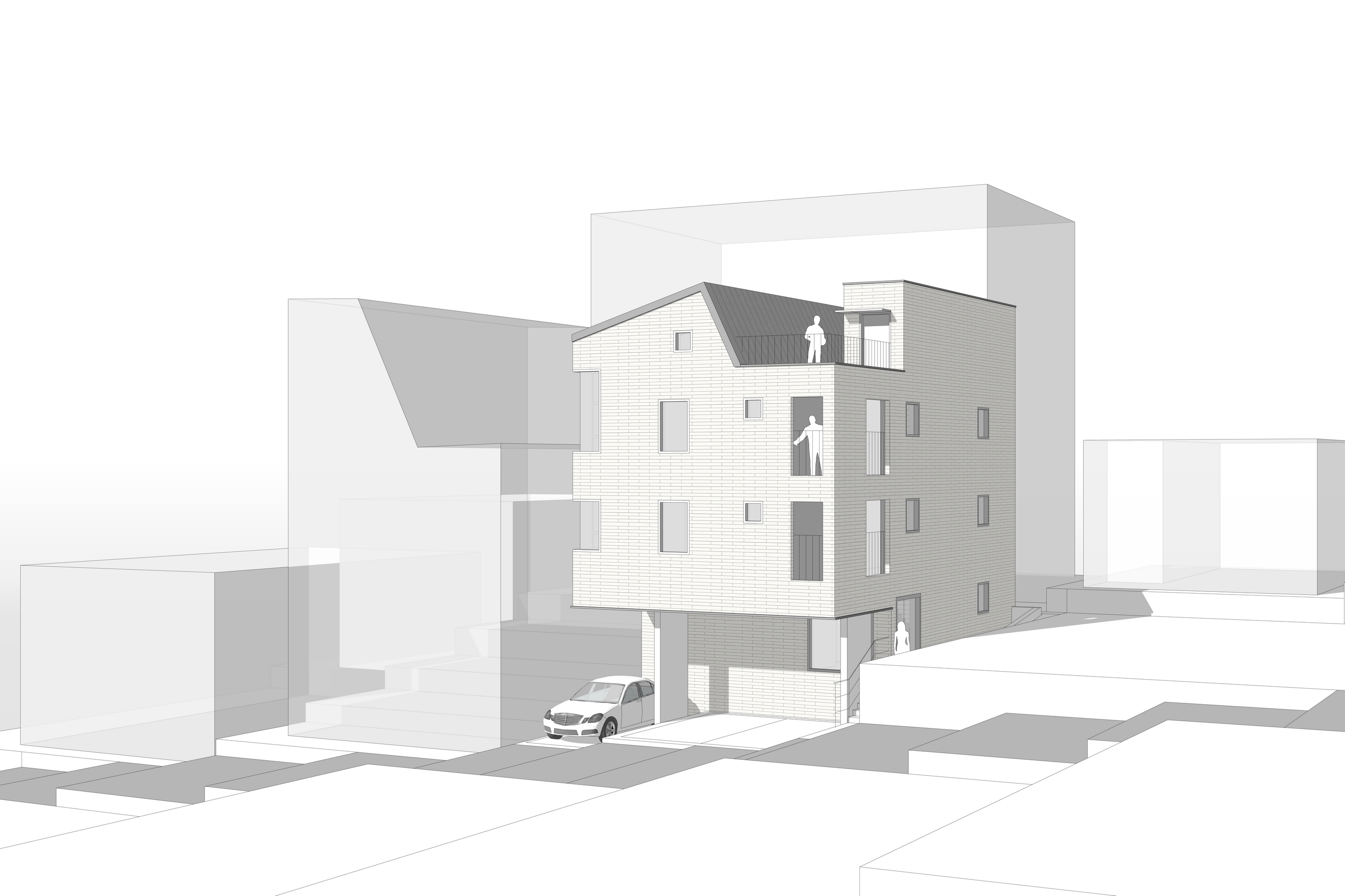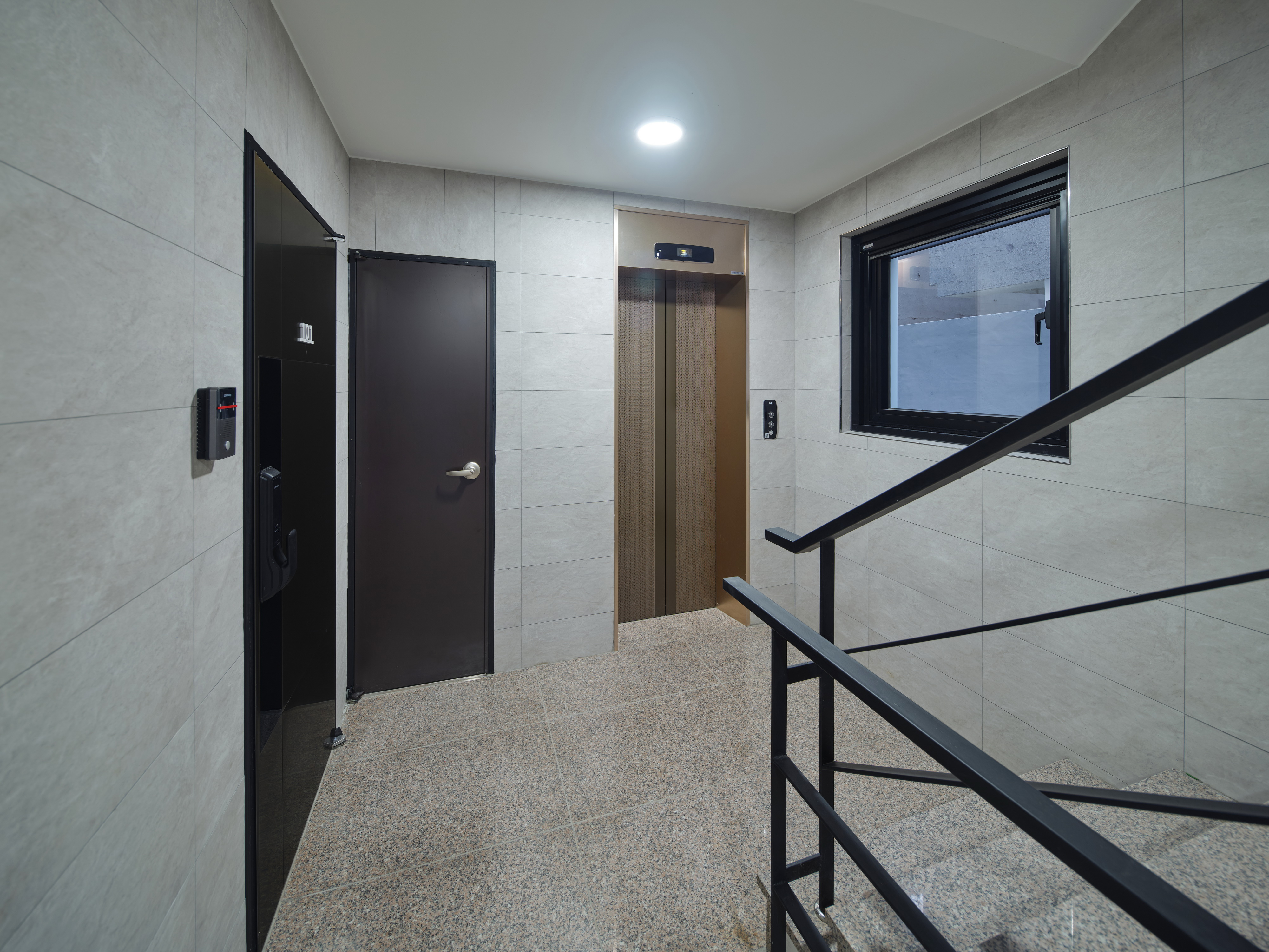 도로변을 제외한 모든 면이 인접 대지 건축물로 둘러싸여 있는 상황이라, 그중 채광과 조망이 양호한 남향으로 실들을 배치하고, 북쪽으로 계단실과 엘리베이터를 길쭉하게 구성했다.