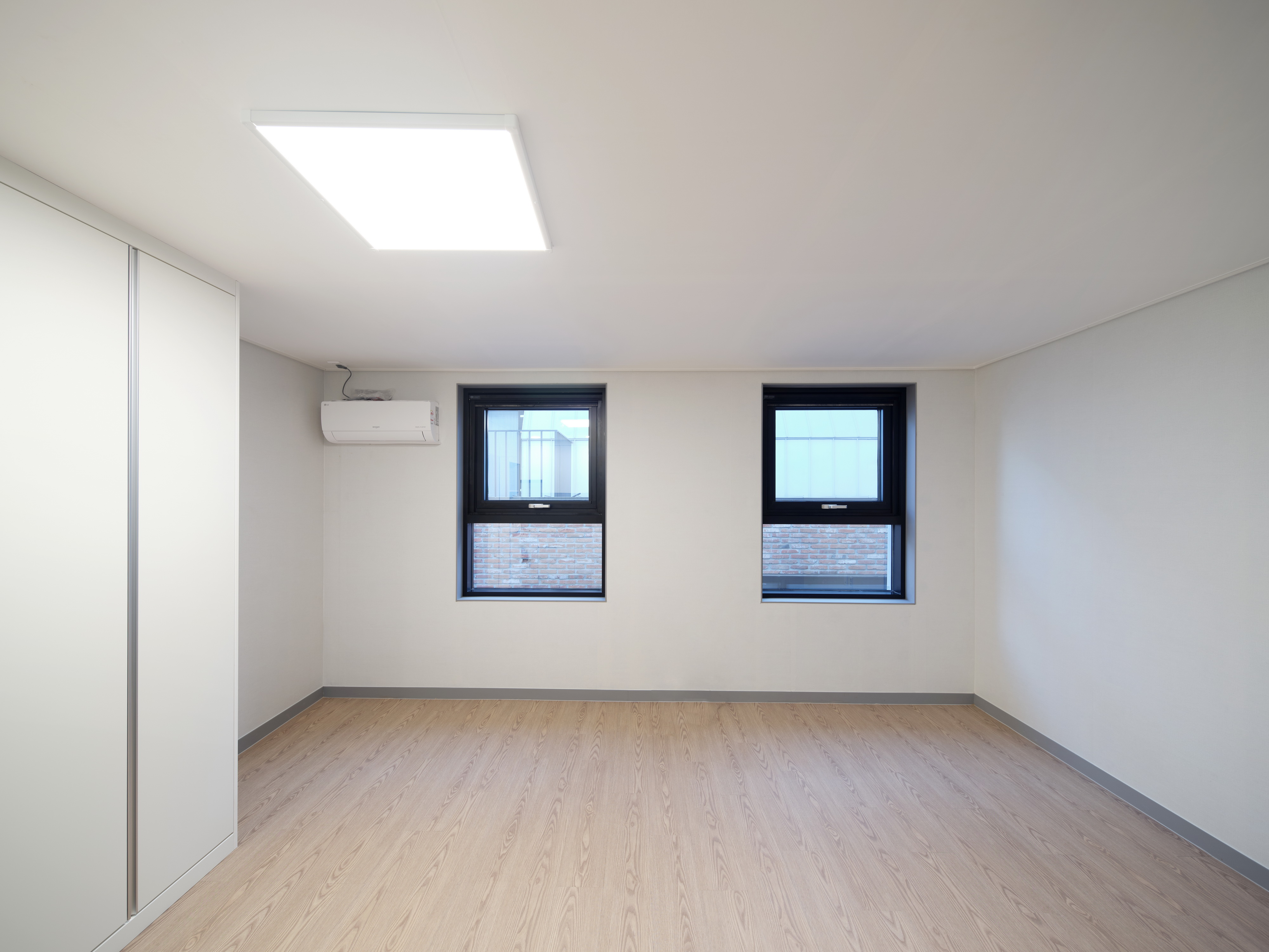 그동안 진행했던 다른 원룸들에 비해, 침대 공간을 별도로 구획이 가능하도록 한 실을 7.5평 정도의 크기로 계획했는데, 이 2평 정도의 차이가 체감상으로 꽤 크게 느껴진다.