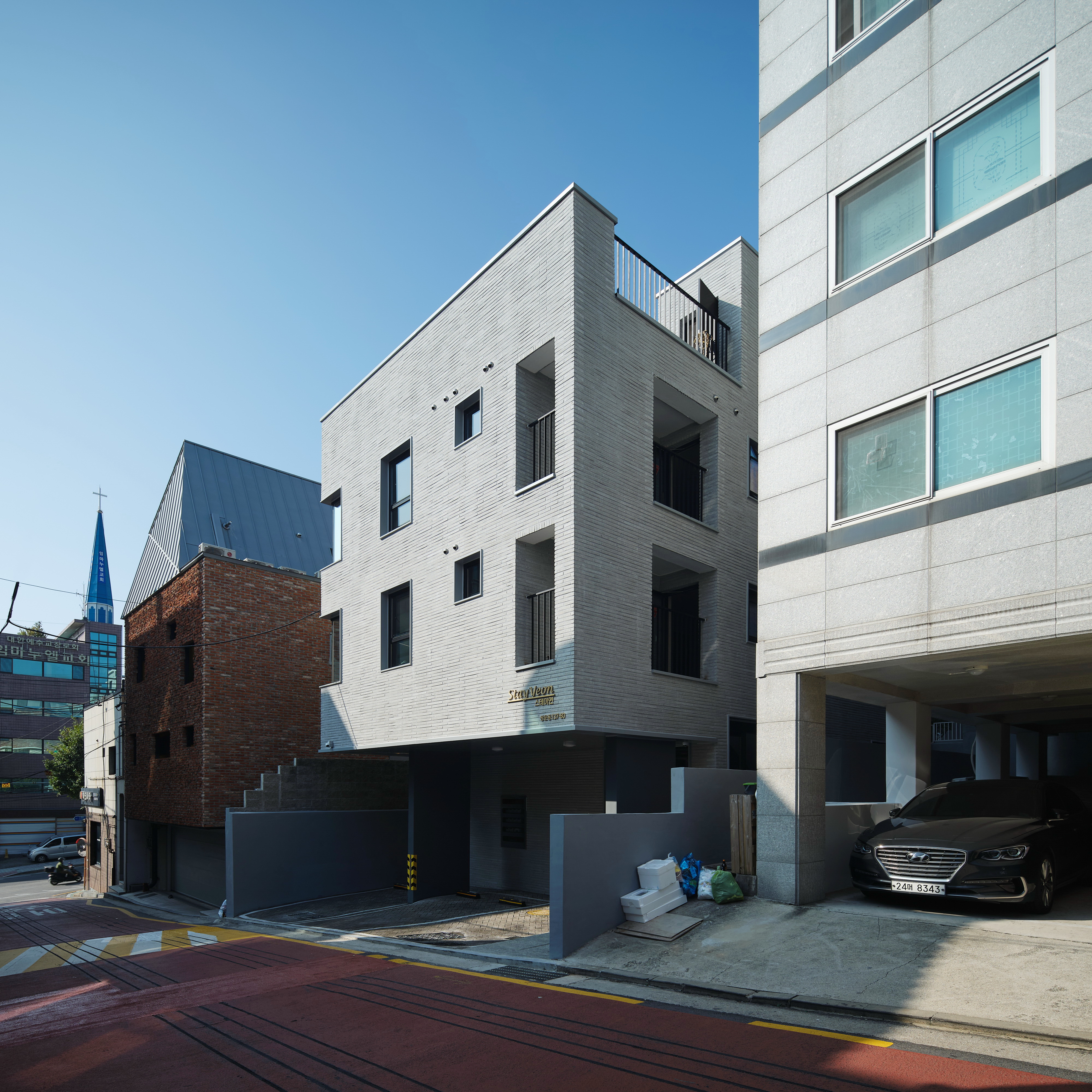 도로변으로 3대의 주차를 확보하며 주출입구를 만들다 보니 2,3층의 건물 볼륨이 붕 떠있는 것처럼 느껴진다.
