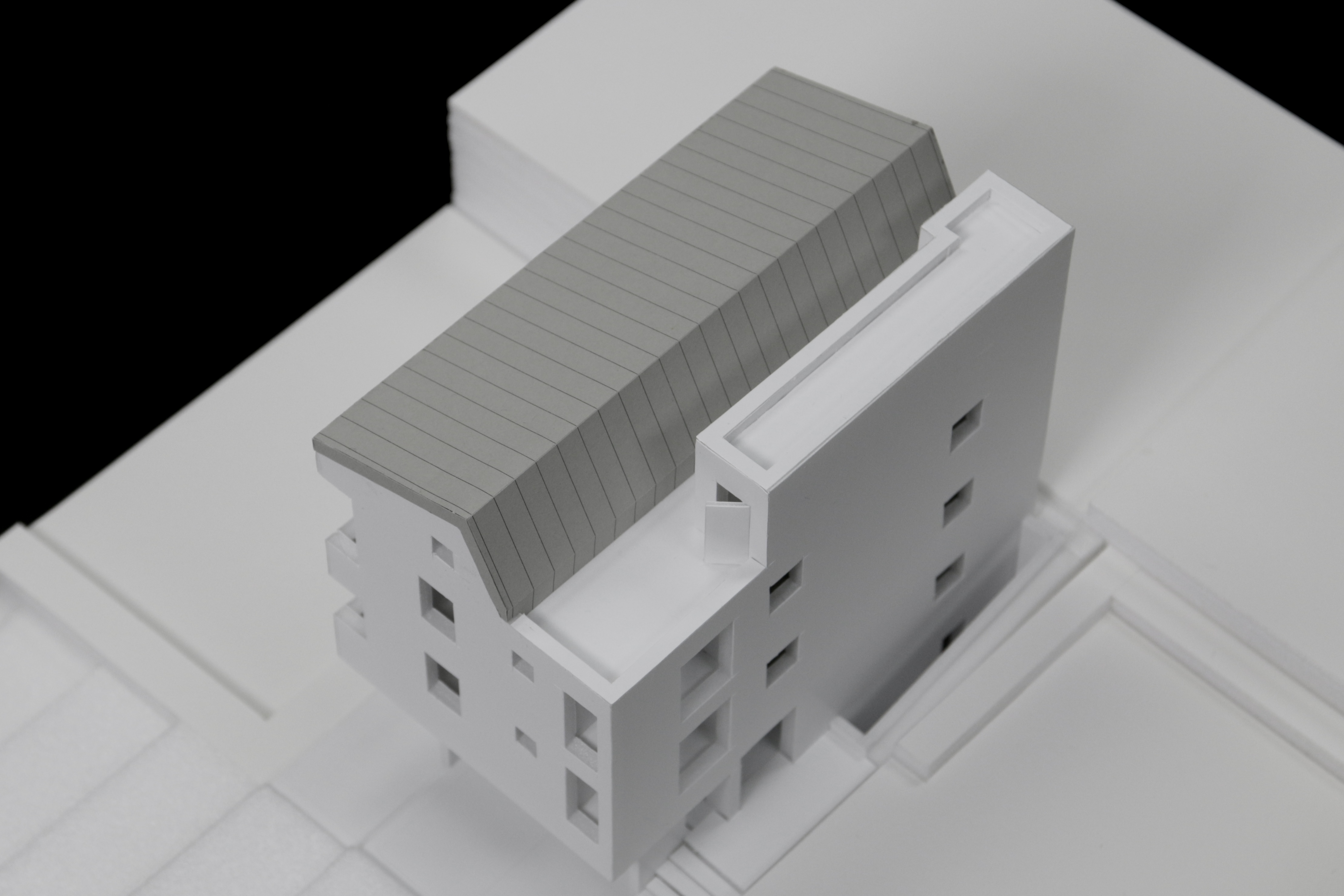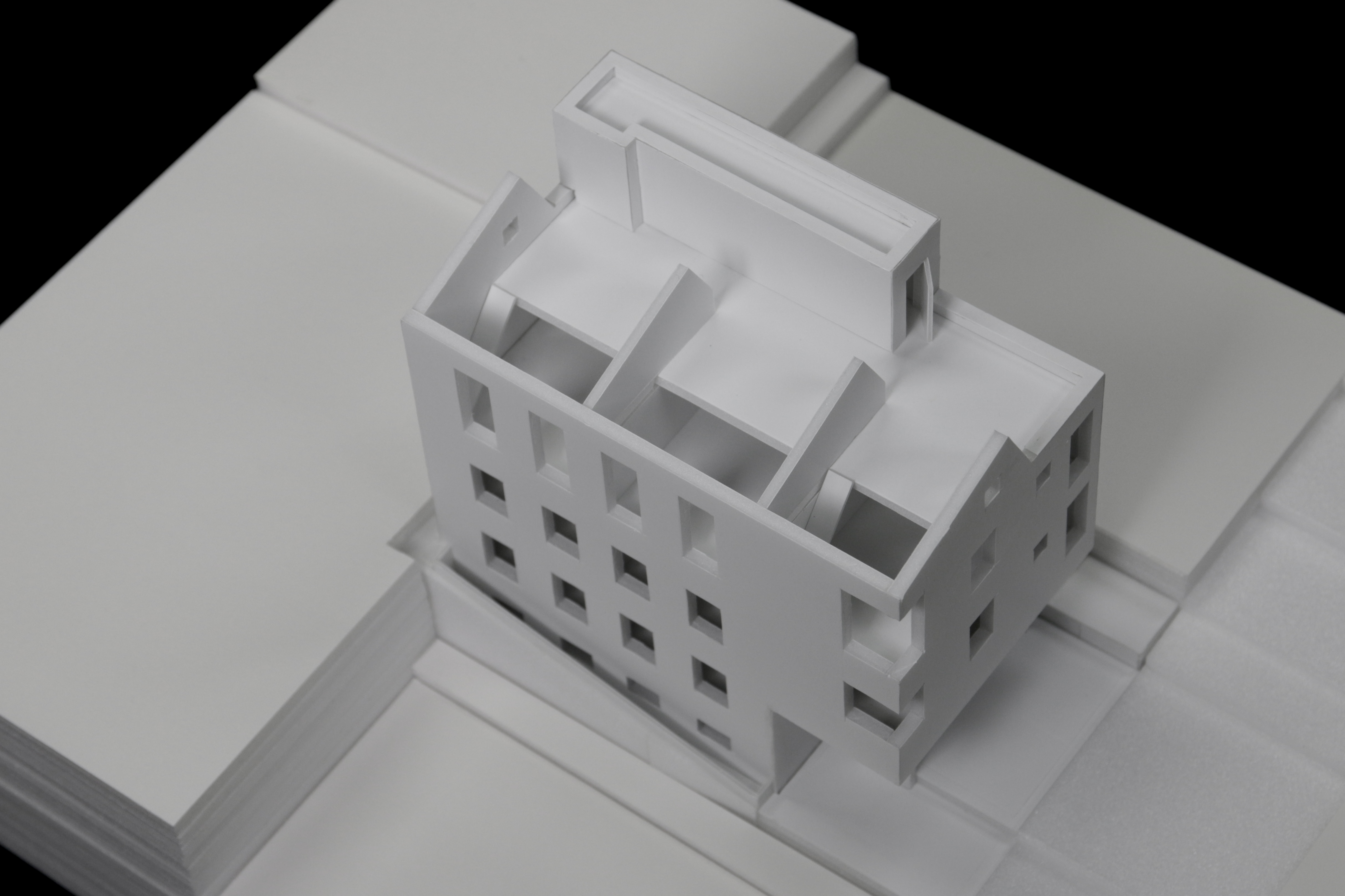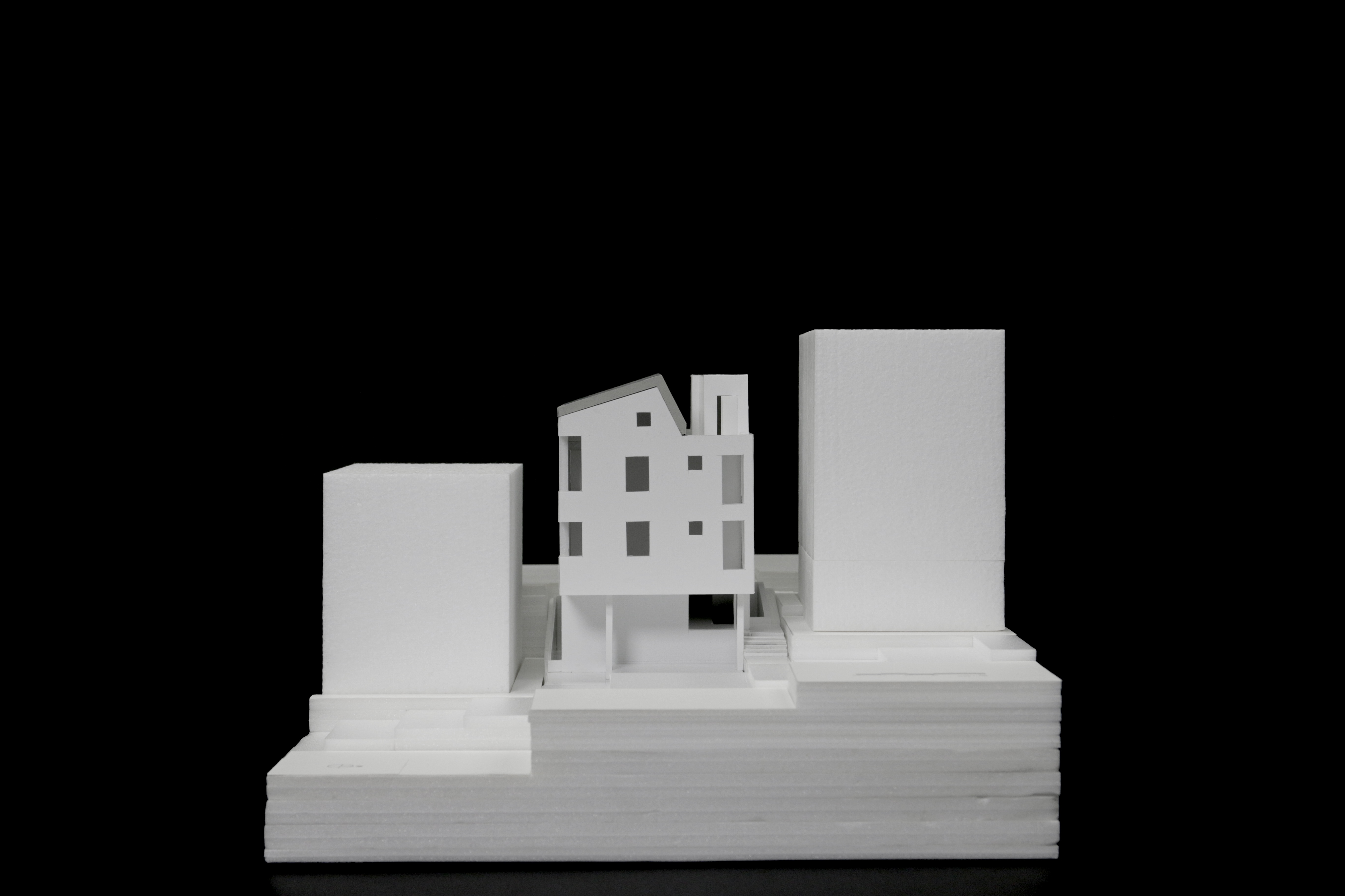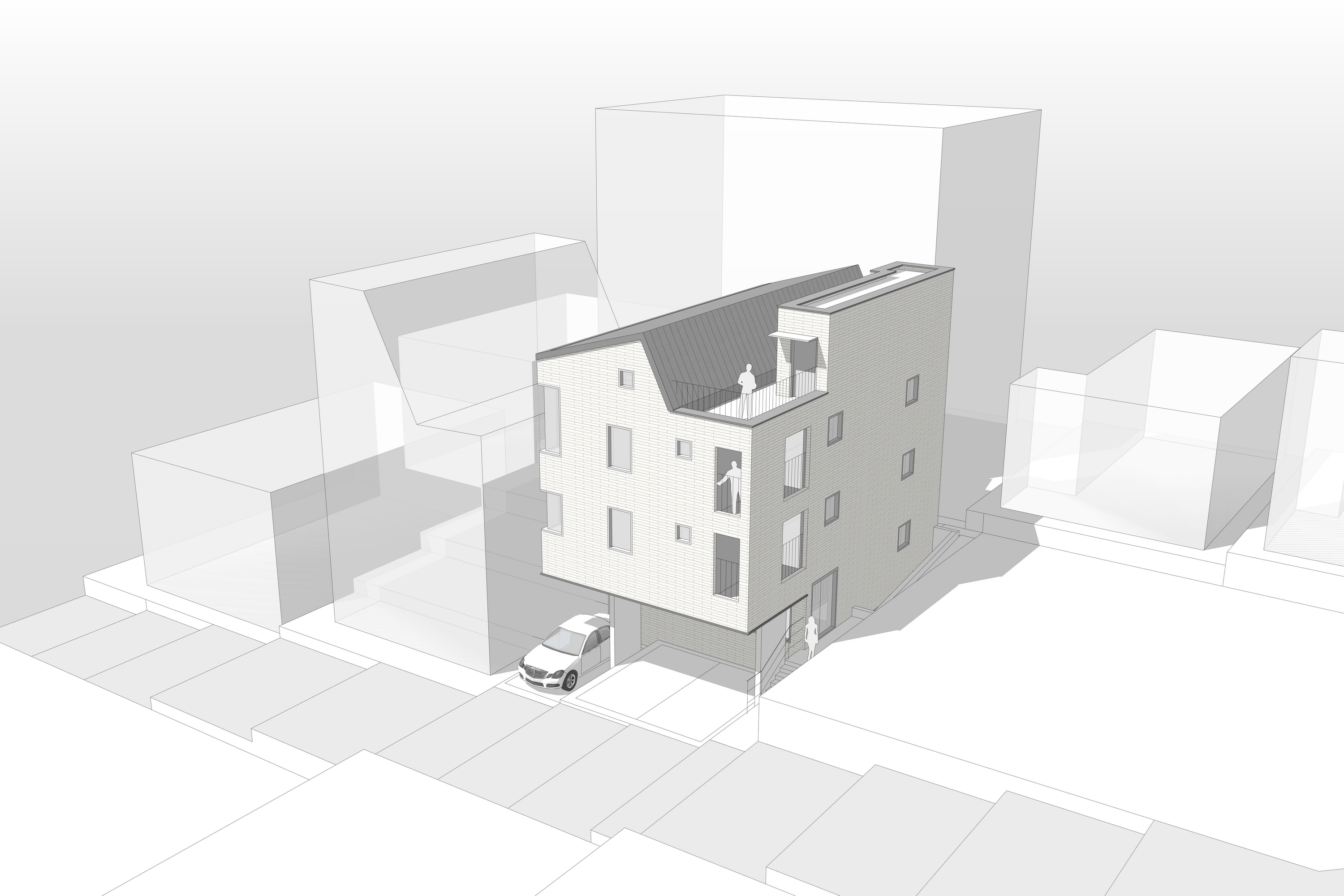 도로변을 제외한 모든 면이 인접 대지 건축물로 둘러싸여 있는 상황이라, 그중 채광과 조망이 양호한 남향으로 실들을 배치하고, 북쪽으로 계단실과 엘리베이터를 길쭉하게 구성했다.