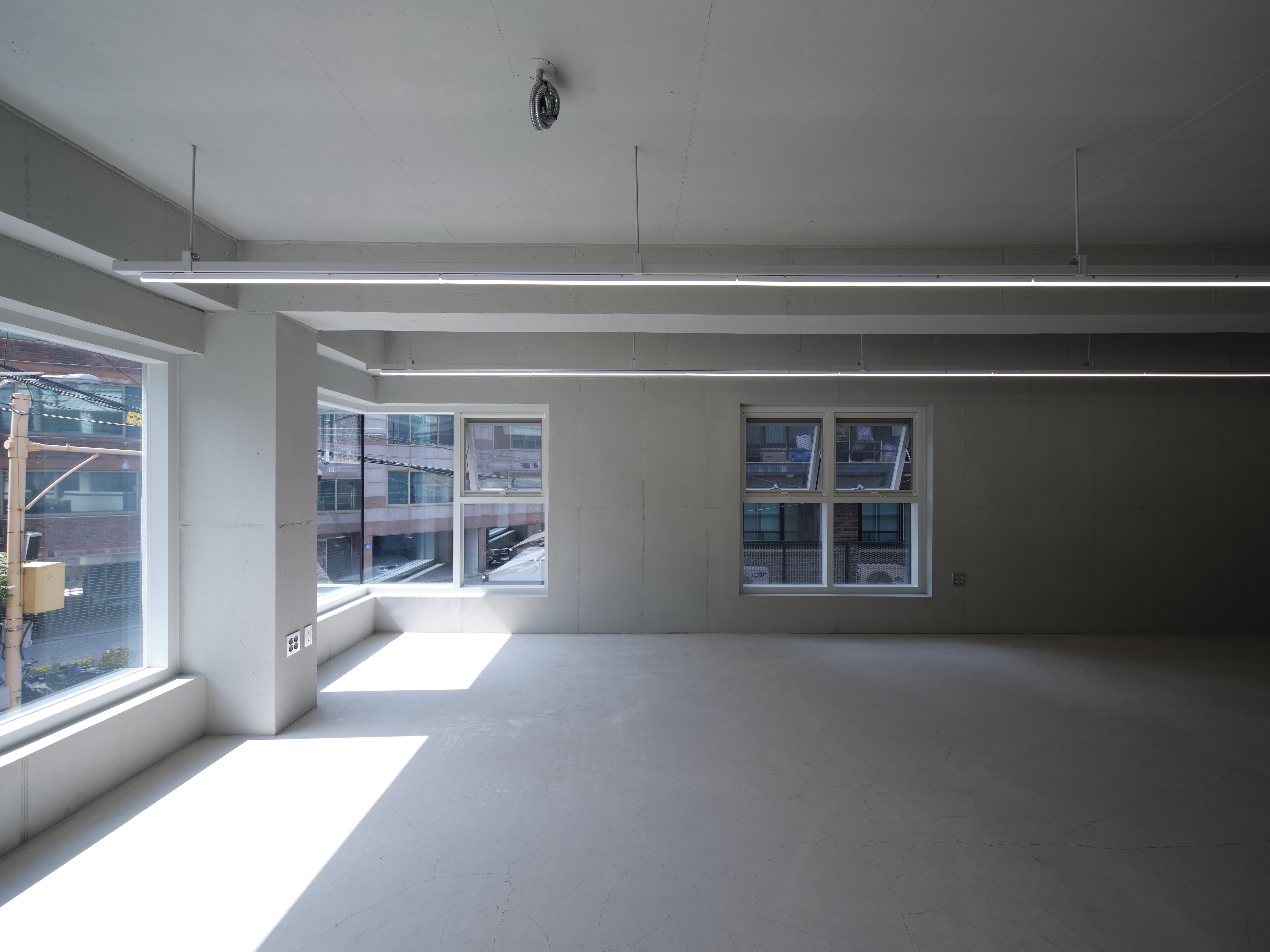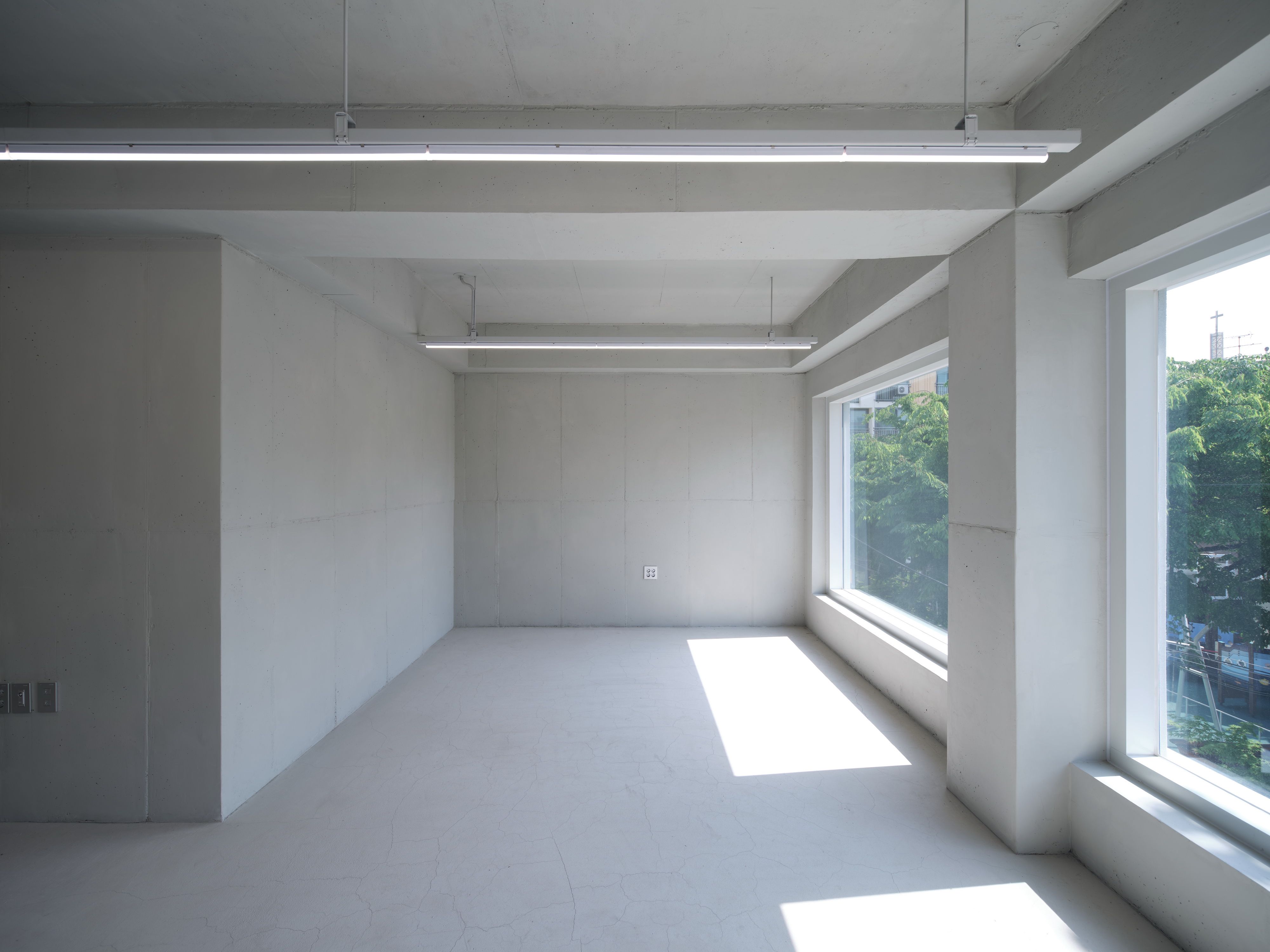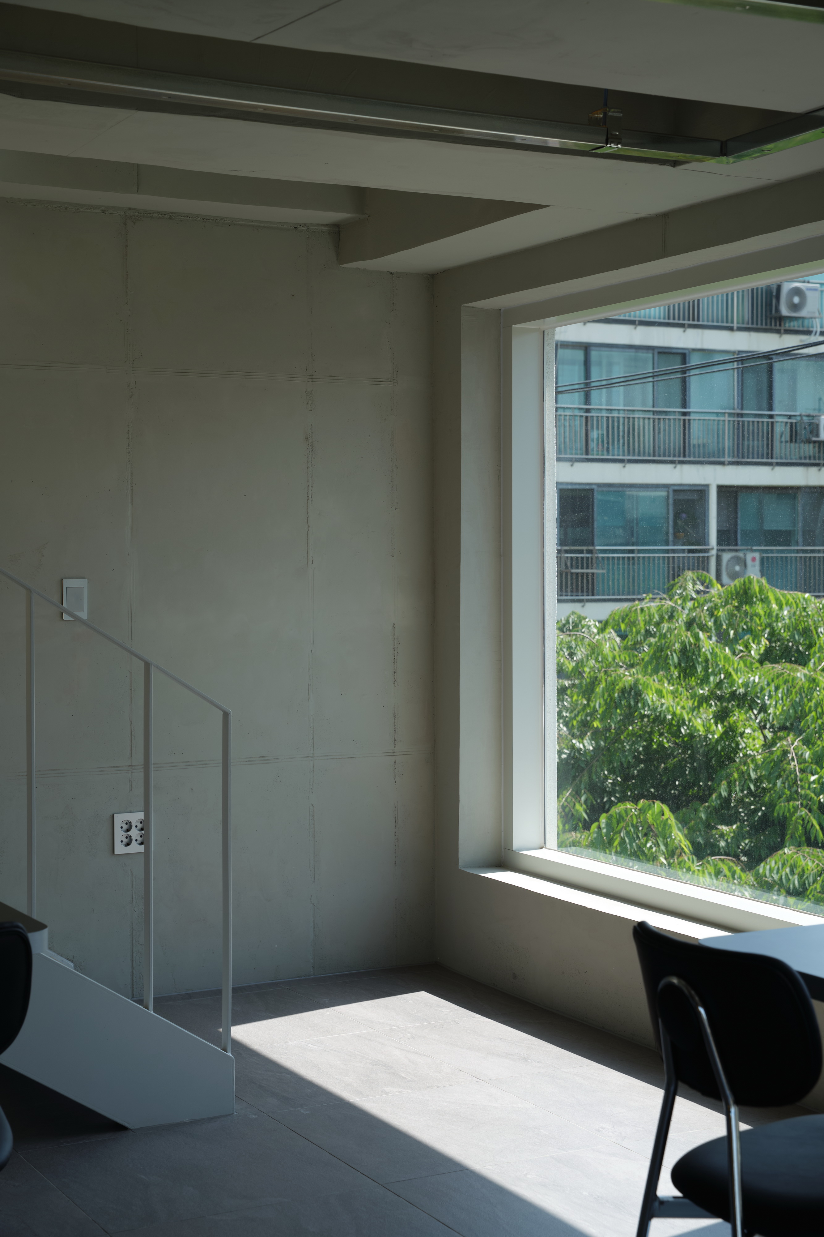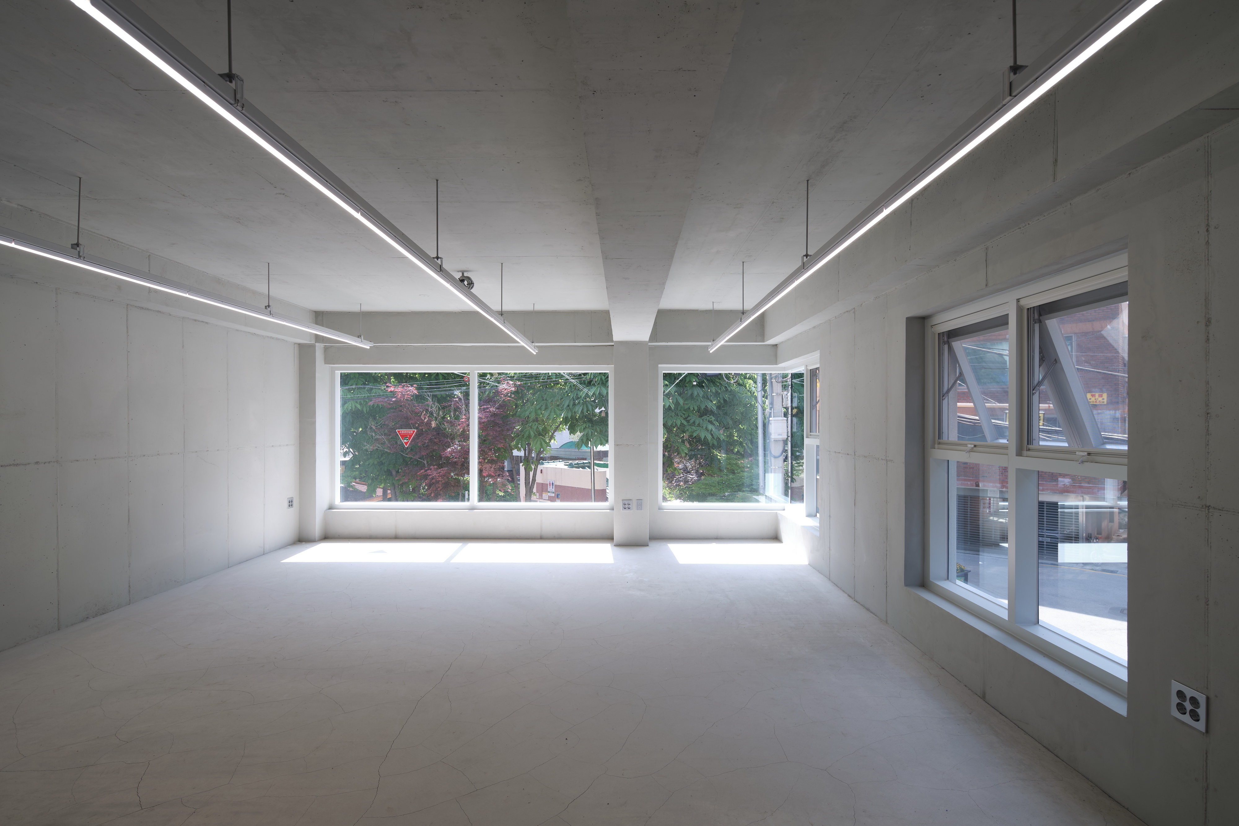 작은 근생 건물이지만, 주출입구 로비 부분을 2개층 오픈시켜 개방감이 느껴지고, 내부에서 전면부 쪽으로 구성한 넓은 개구부로 계절에 따라 변하는 공원의 풍경이 담긴다.