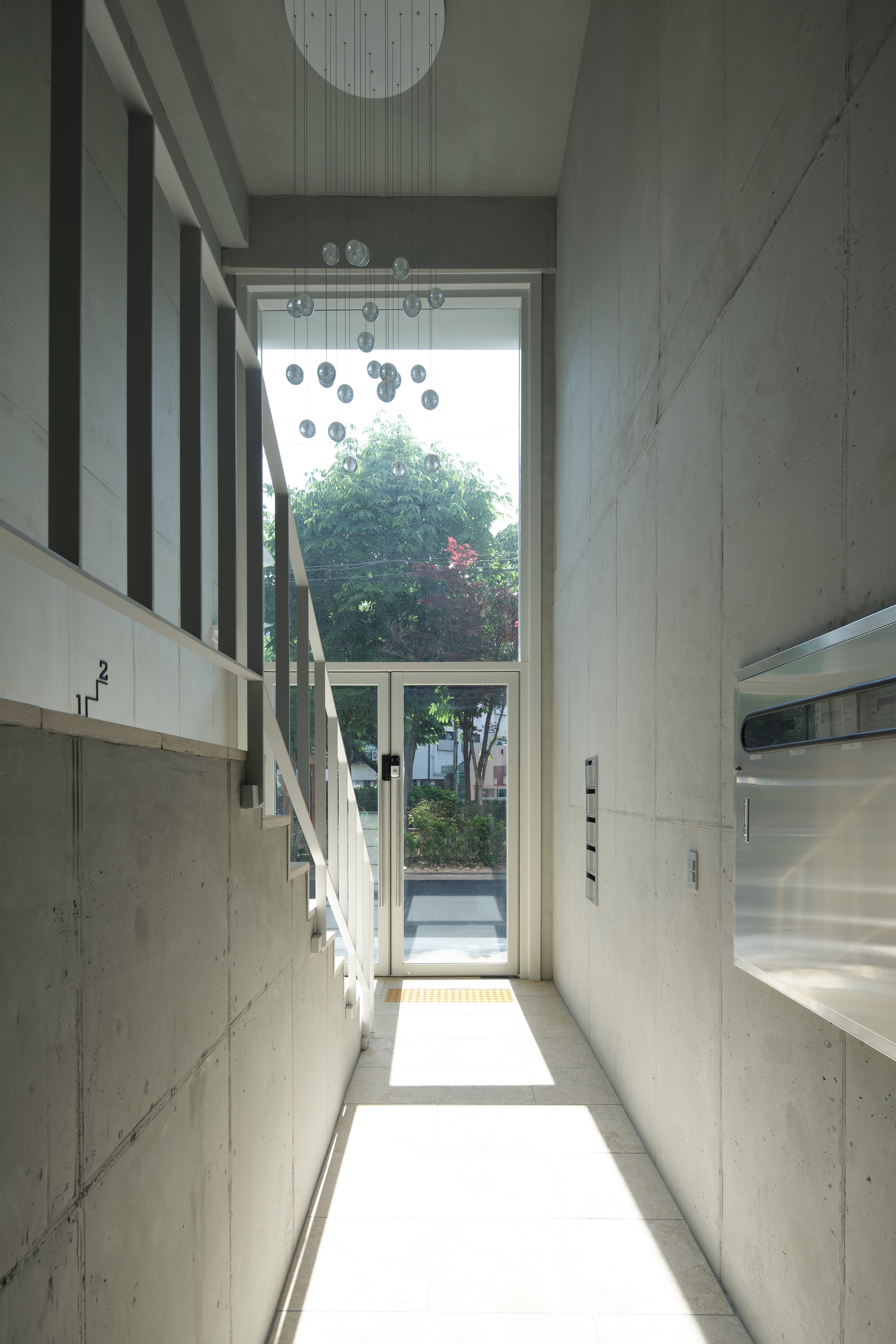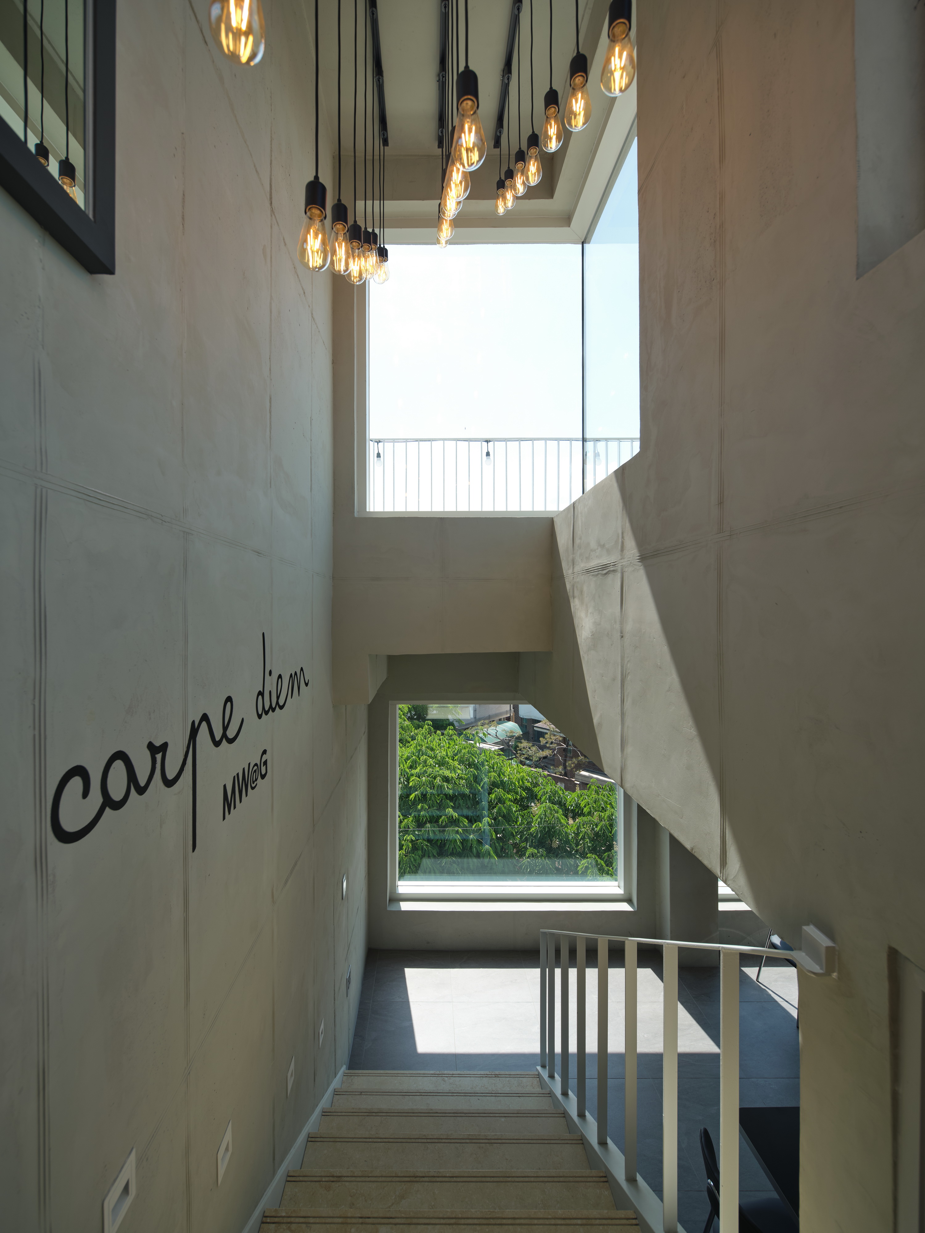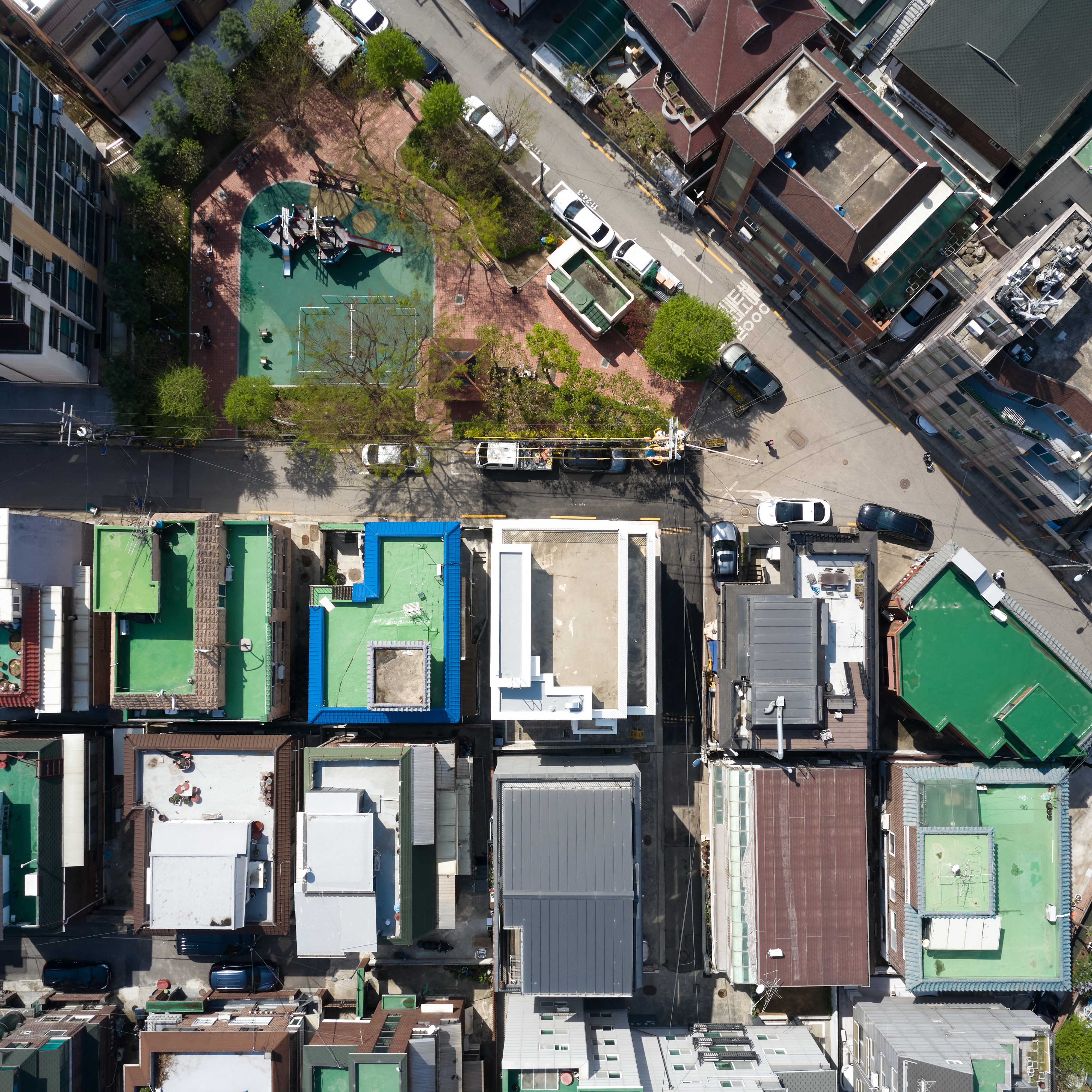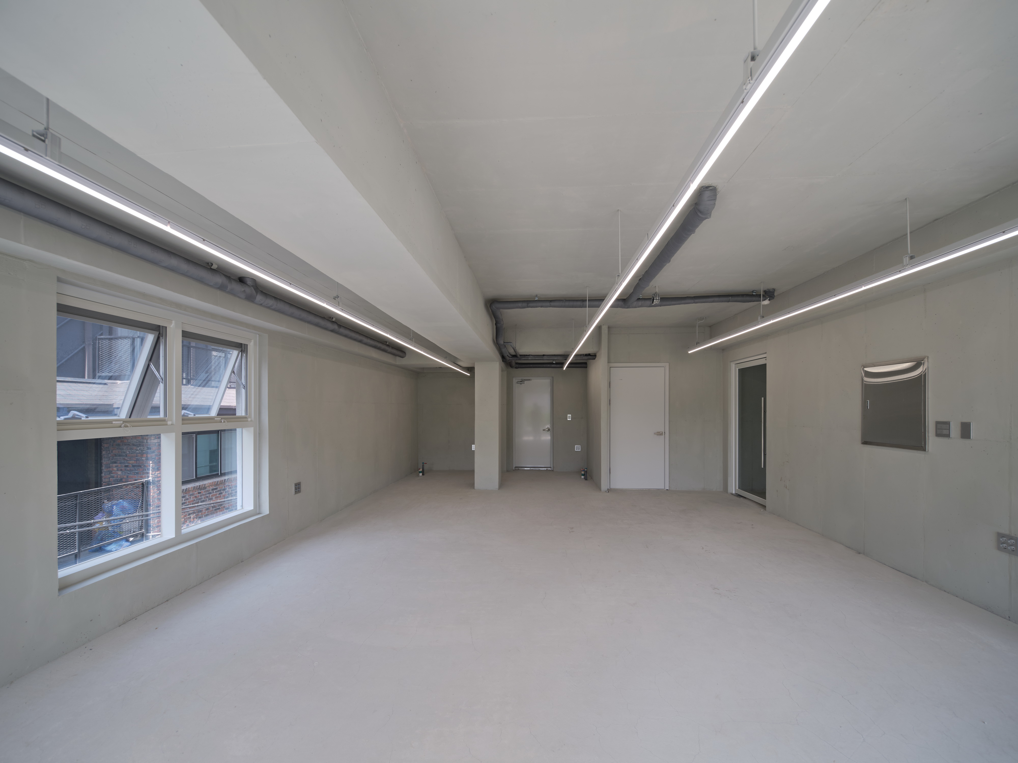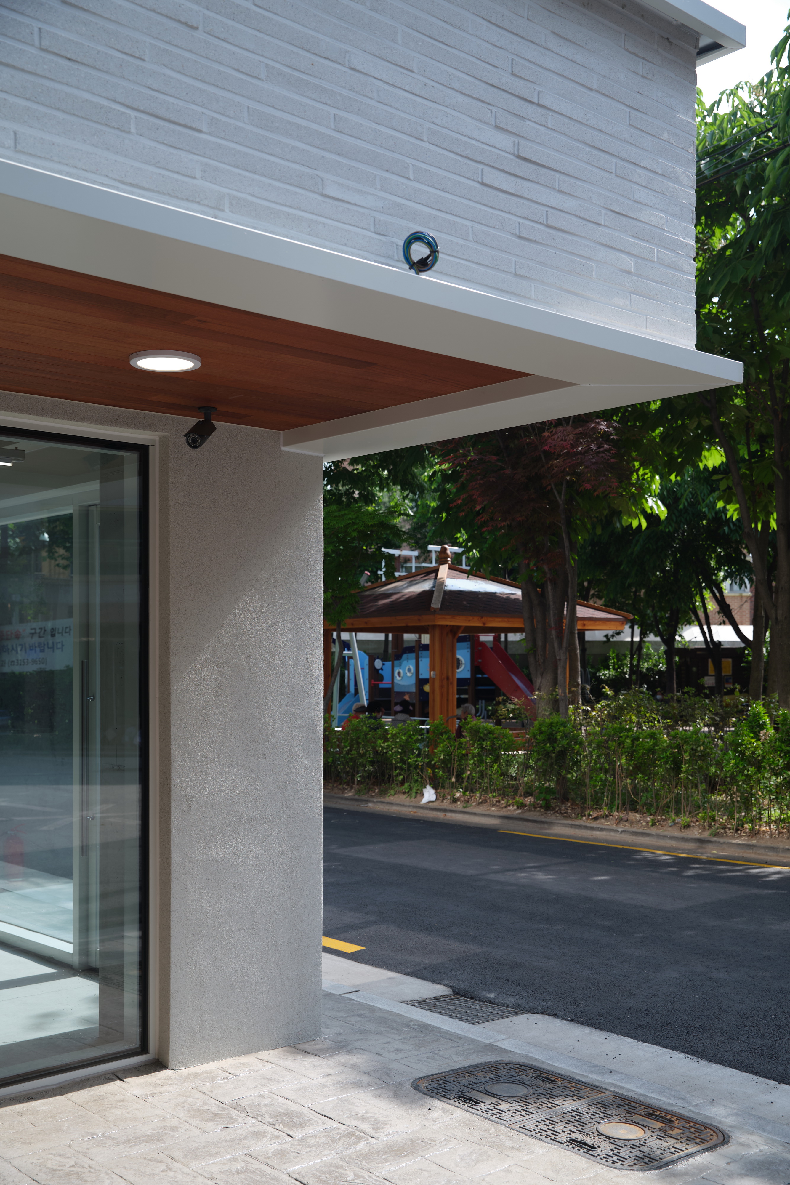 작은 근생 건물이지만, 주출입구 로비 부분을 2개층 오픈시켜 개방감이 느껴지고, 내부에서 전면부 쪽으로 구성한 넓은 개구부로 계절에 따라 변하는 공원의 풍경이 담긴다.