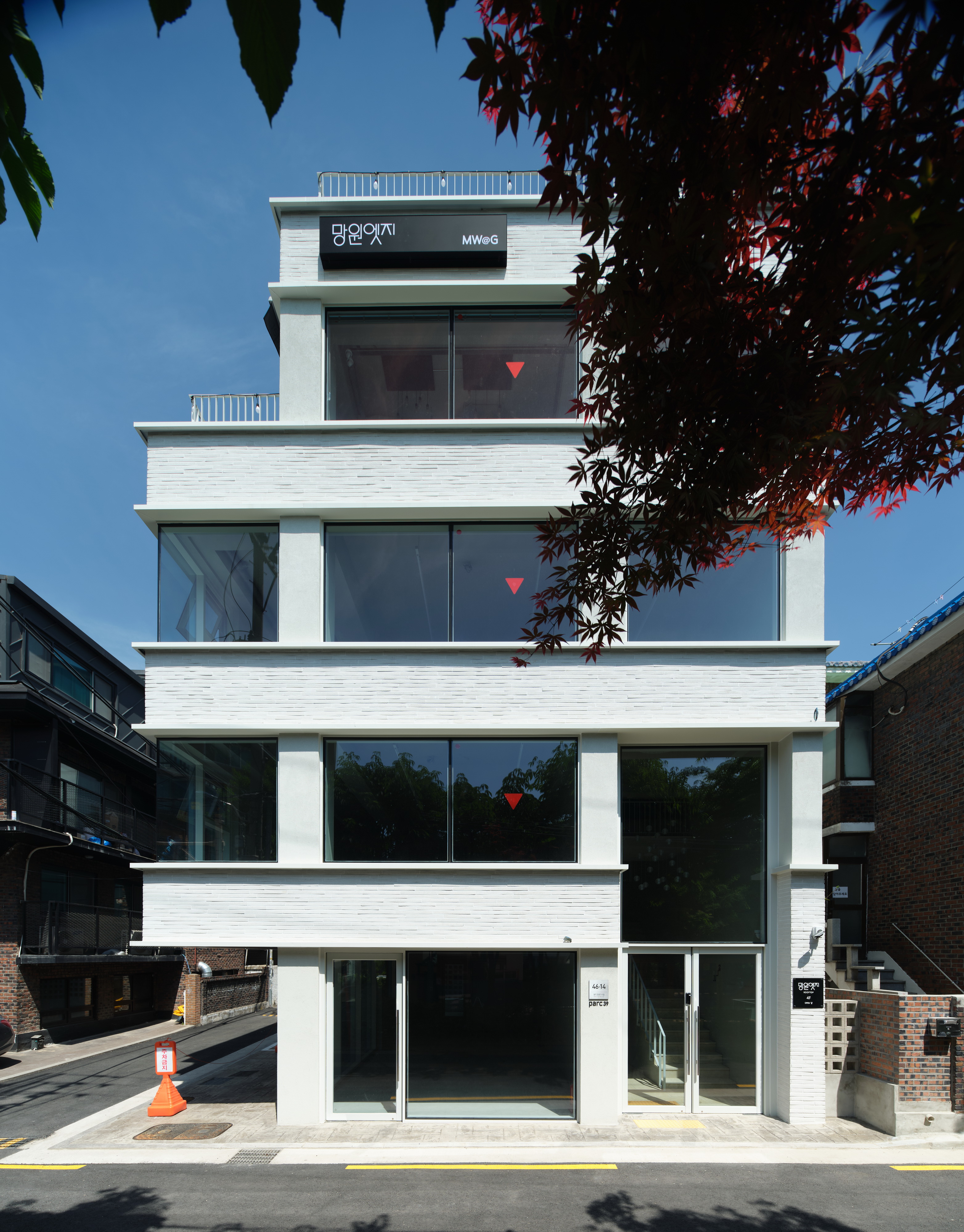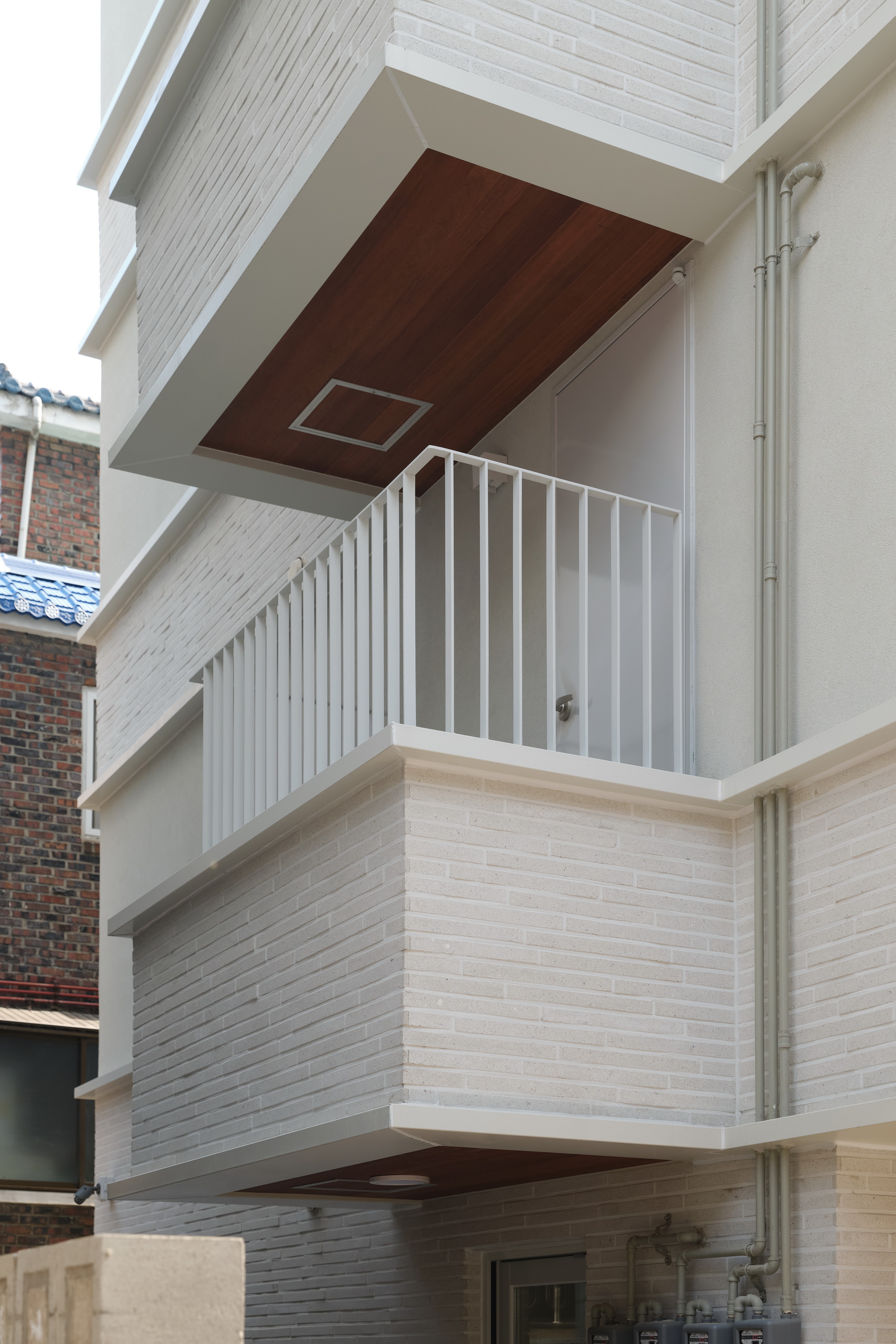 외부 입면은 알루미늄시트를 절곡하여 각 층마다 수평 프레임을 만들고, 그 사이 공간은 테라죠 벽돌타일로 채워 넣었다.