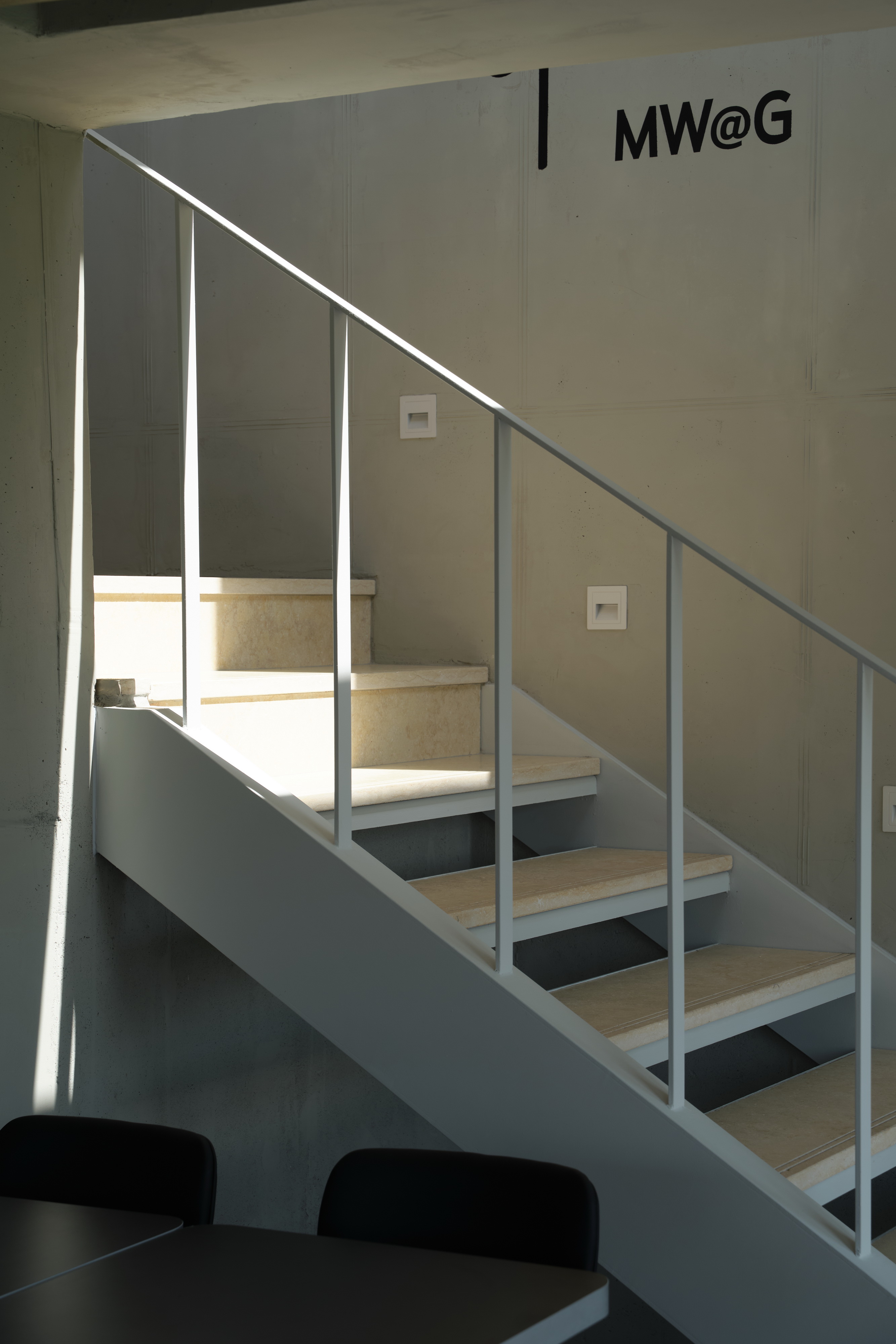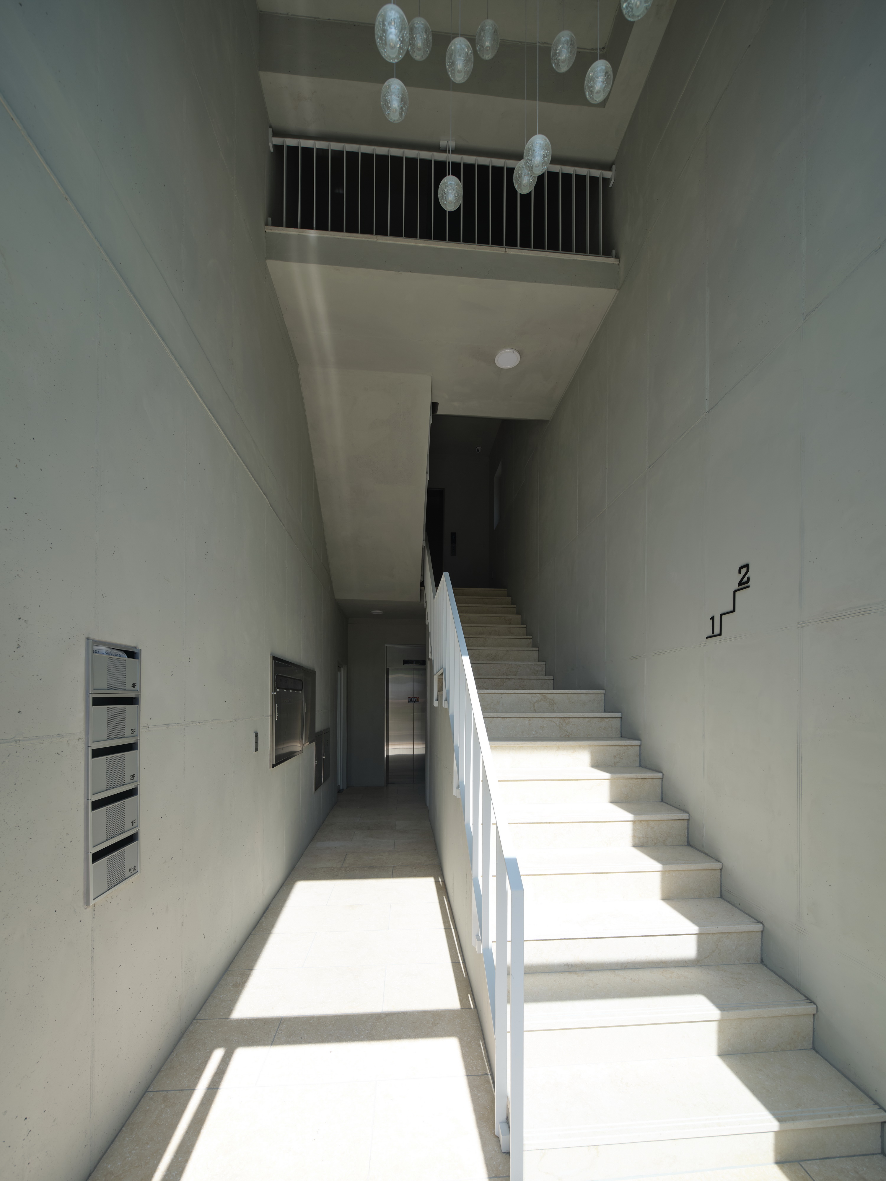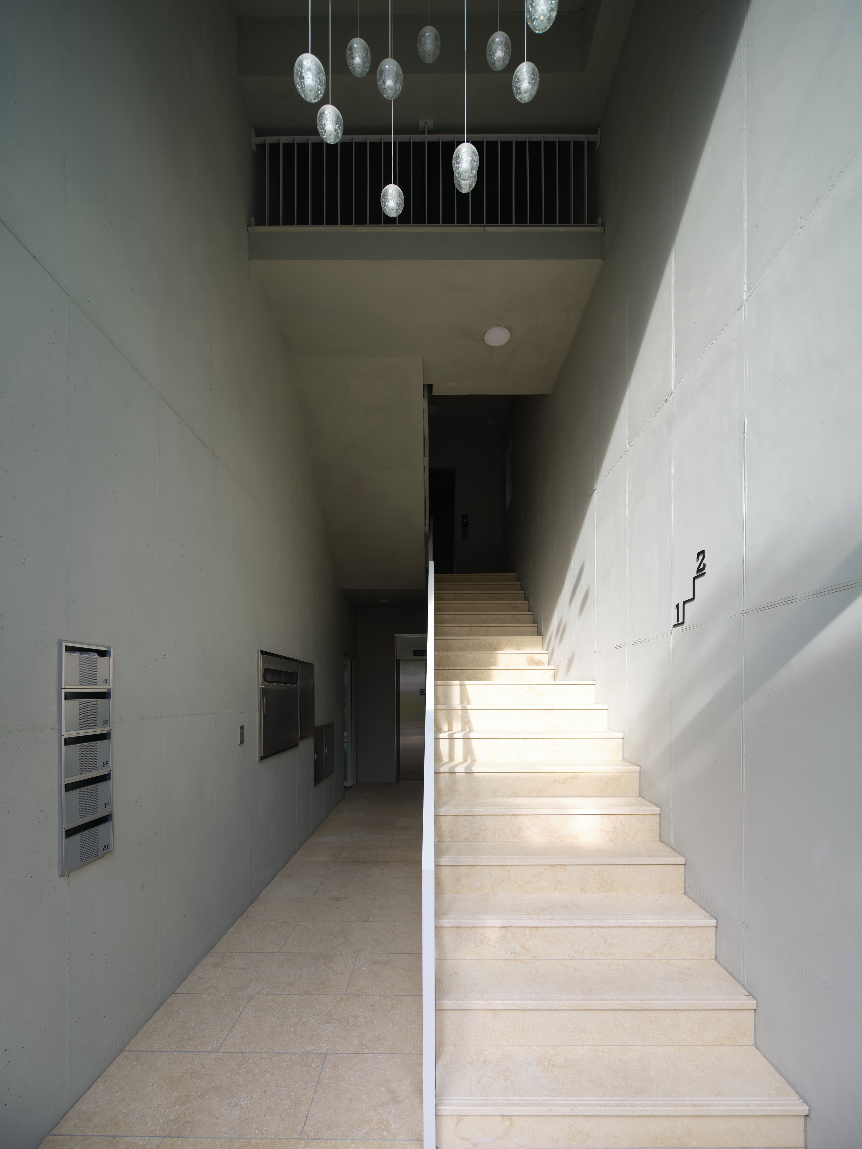 나머지 수직 기둥 및 벽체 부분들은 연한 베이지 톤의 스타코플렉스로 마감하여, 빛에 따라 각 재료의 질감이 은은하게 드러난다.