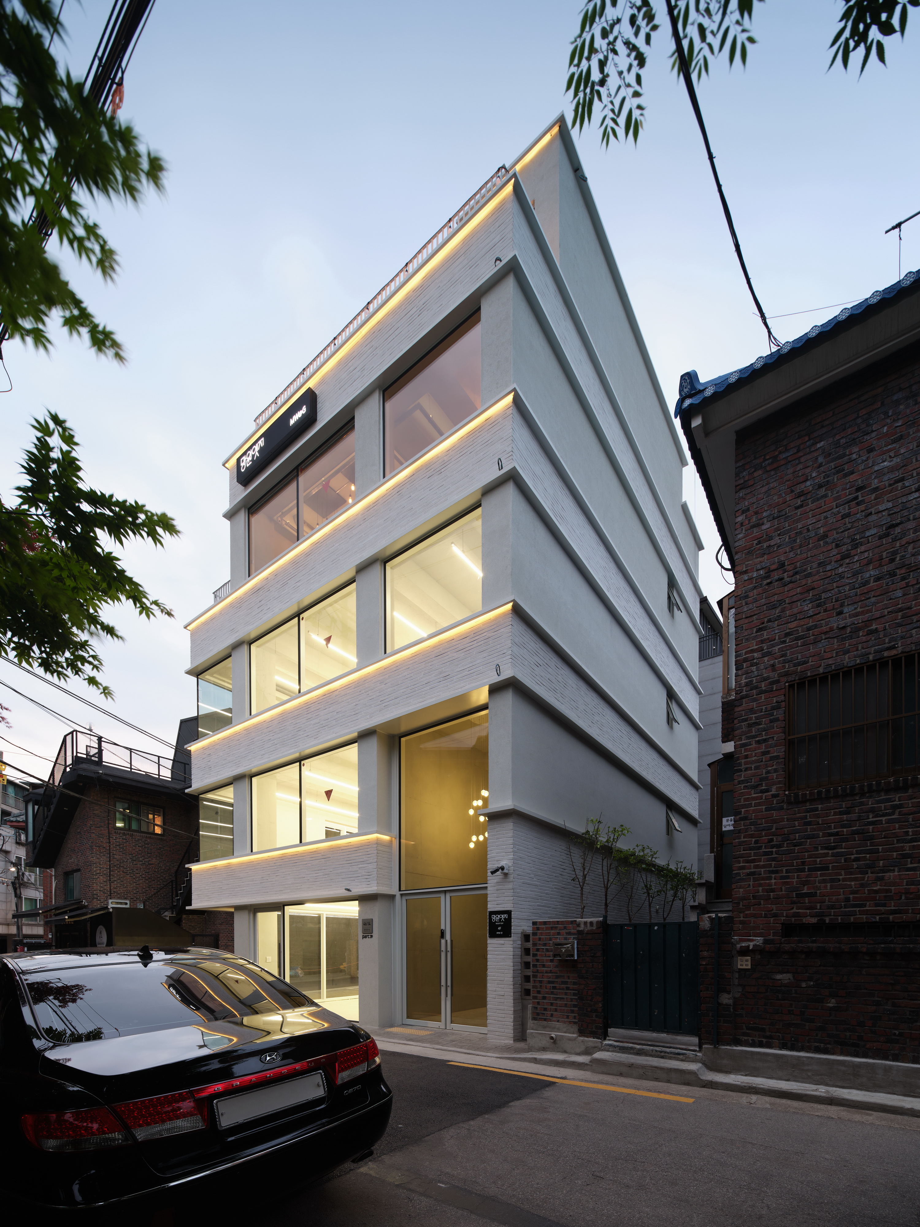 전면도로변으로 창들을 최대한 열어주고, 각 층 스팬드럴 부분의 수평 프레임 안에 간접조명을 설치하여, 어두운 골목에 은은한 불빛을 밝힌다.