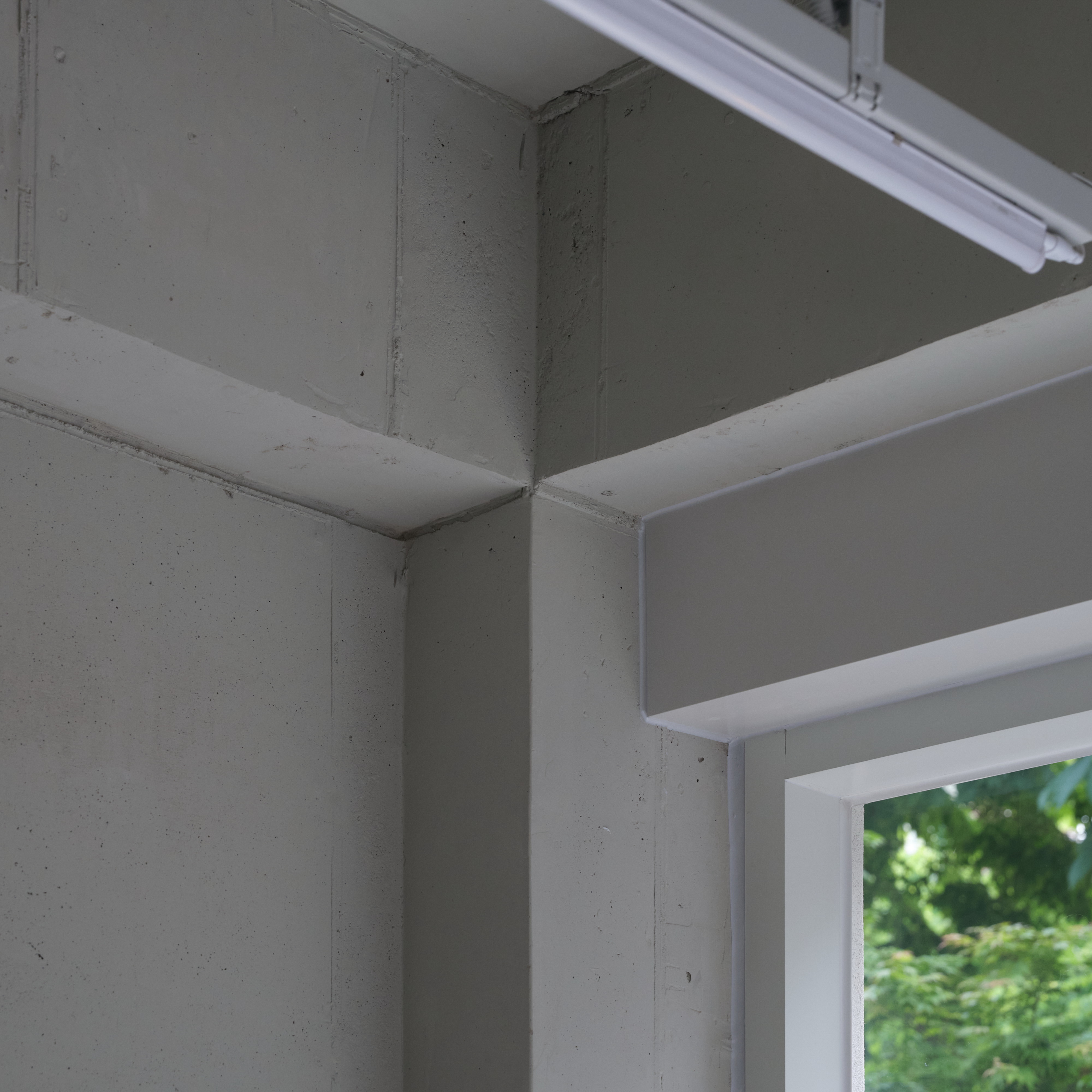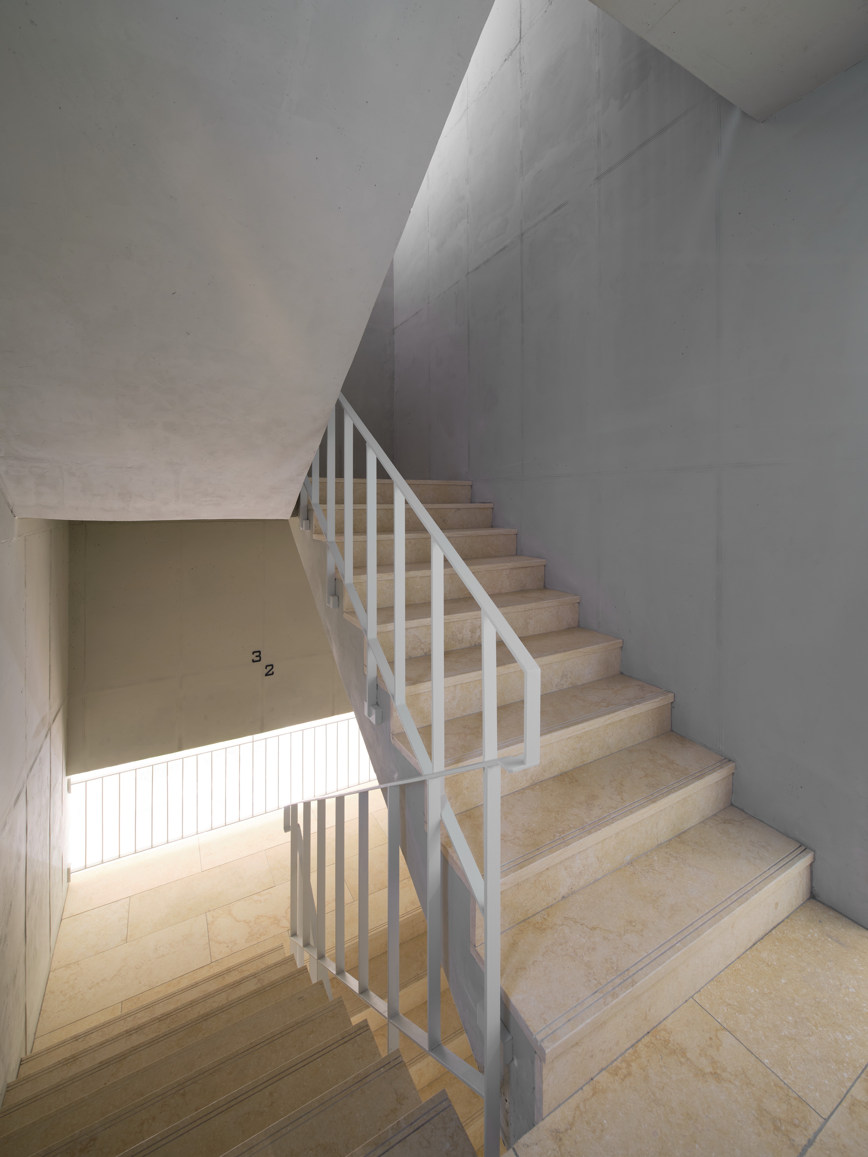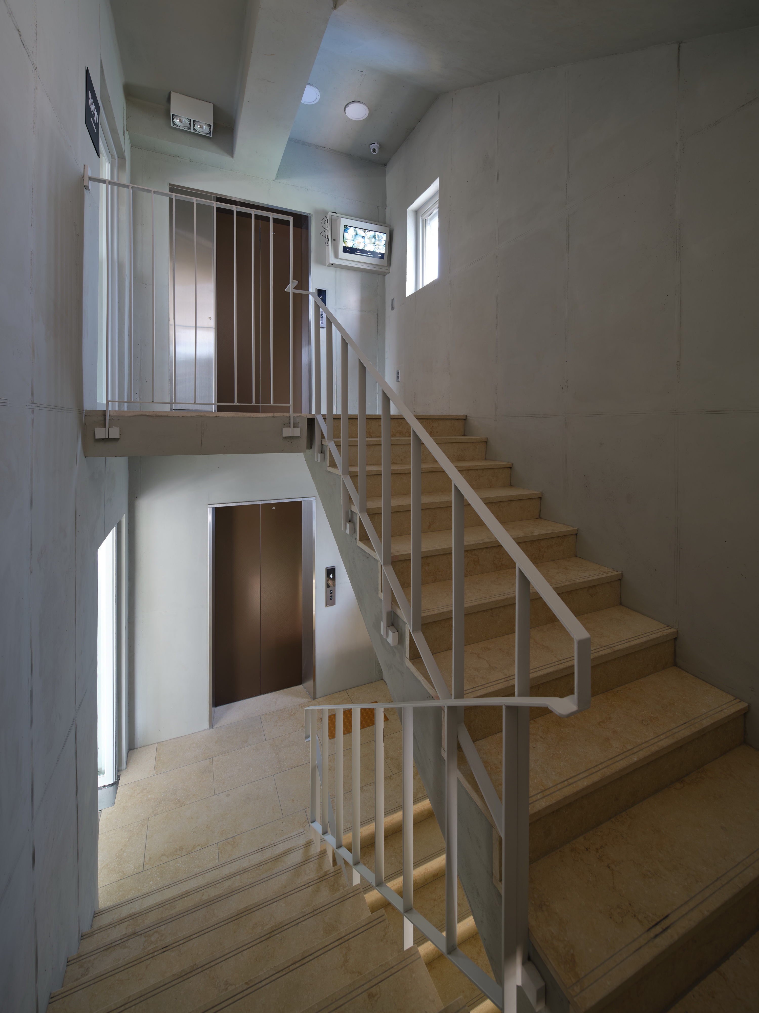 나머지 수직 기둥 및 벽체 부분들은 연한 베이지 톤의 스타코플렉스로 마감하여, 빛에 따라 각 재료의 질감이 은은하게 드러난다.