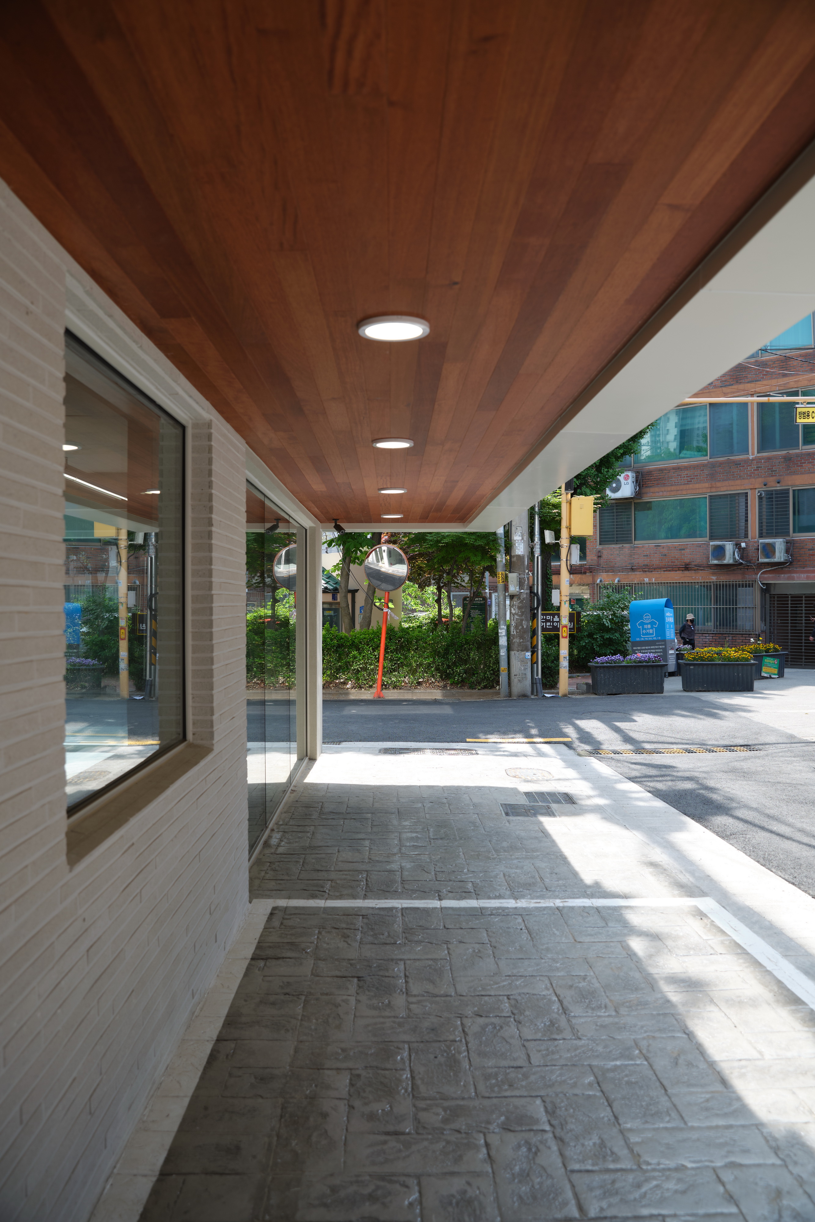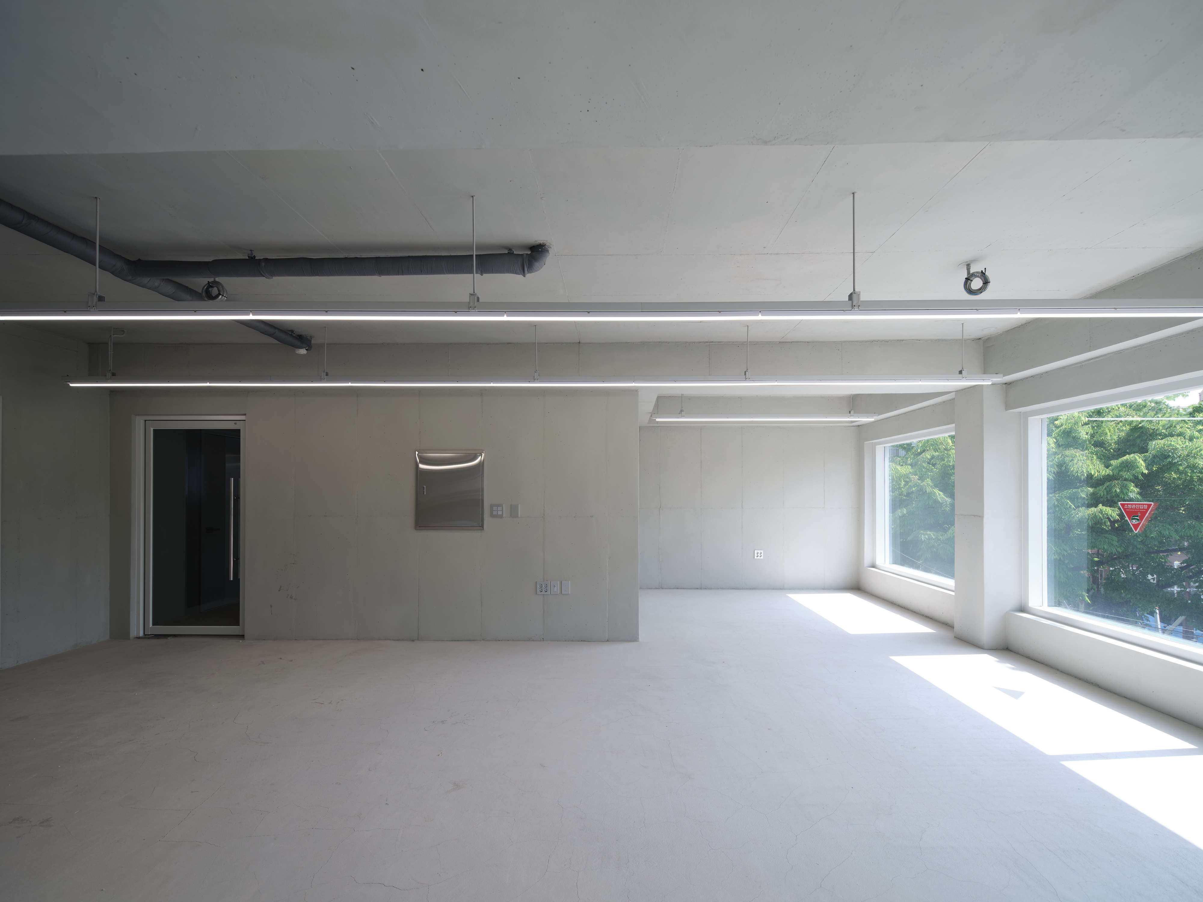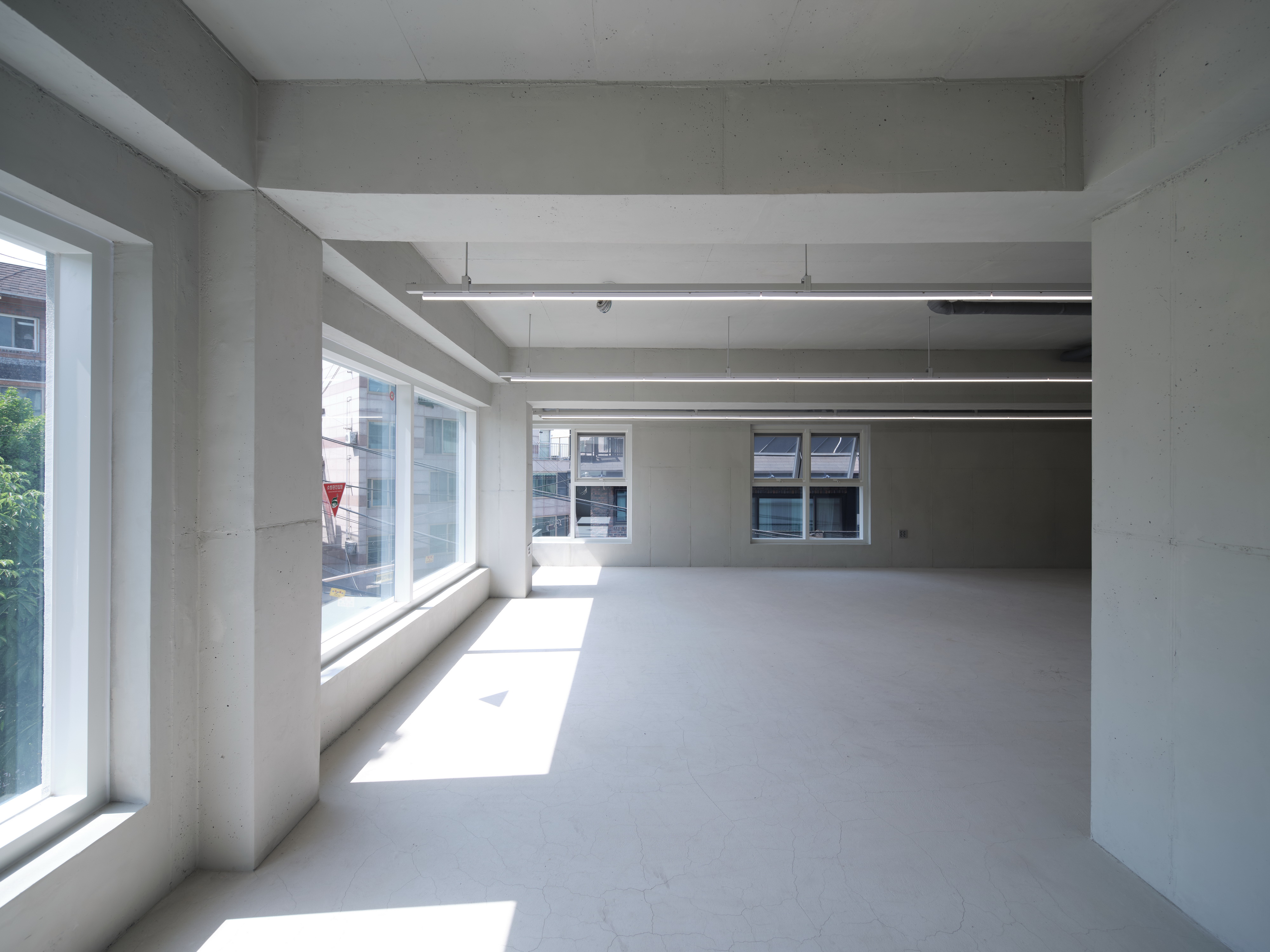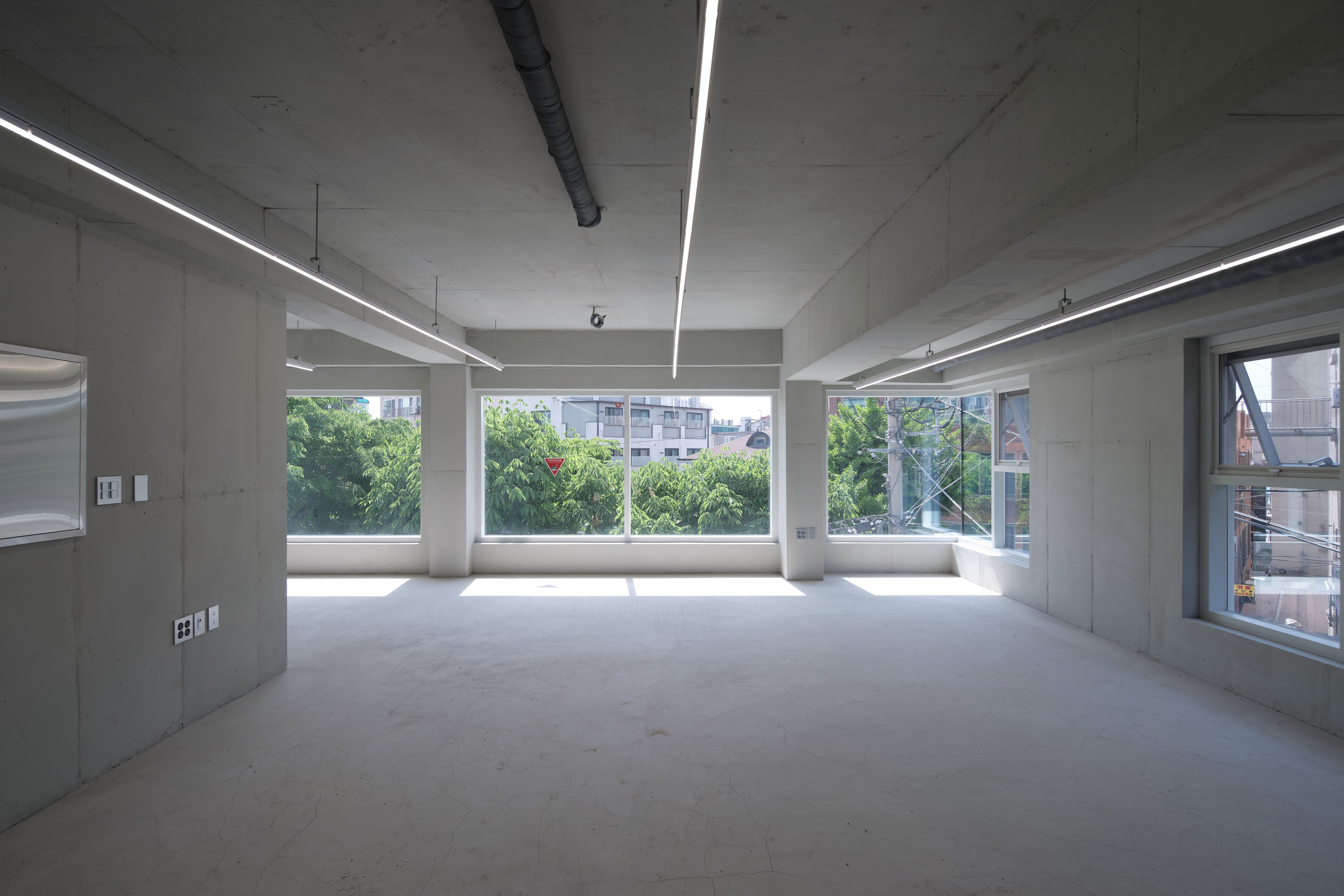 작은 근생 건물이지만, 주출입구 로비 부분을 2개층 오픈시켜 개방감이 느껴지고, 내부에서 전면부 쪽으로 구성한 넓은 개구부로 계절에 따라 변하는 공원의 풍경이 담긴다.