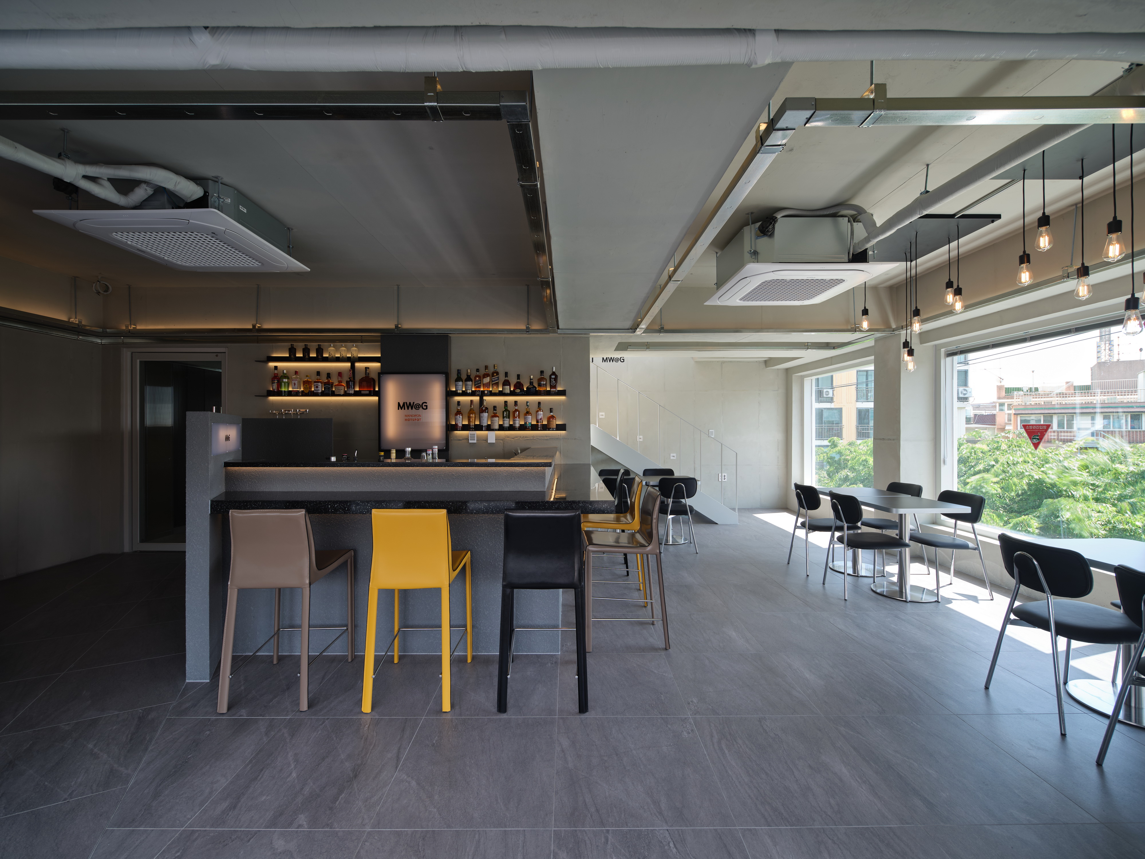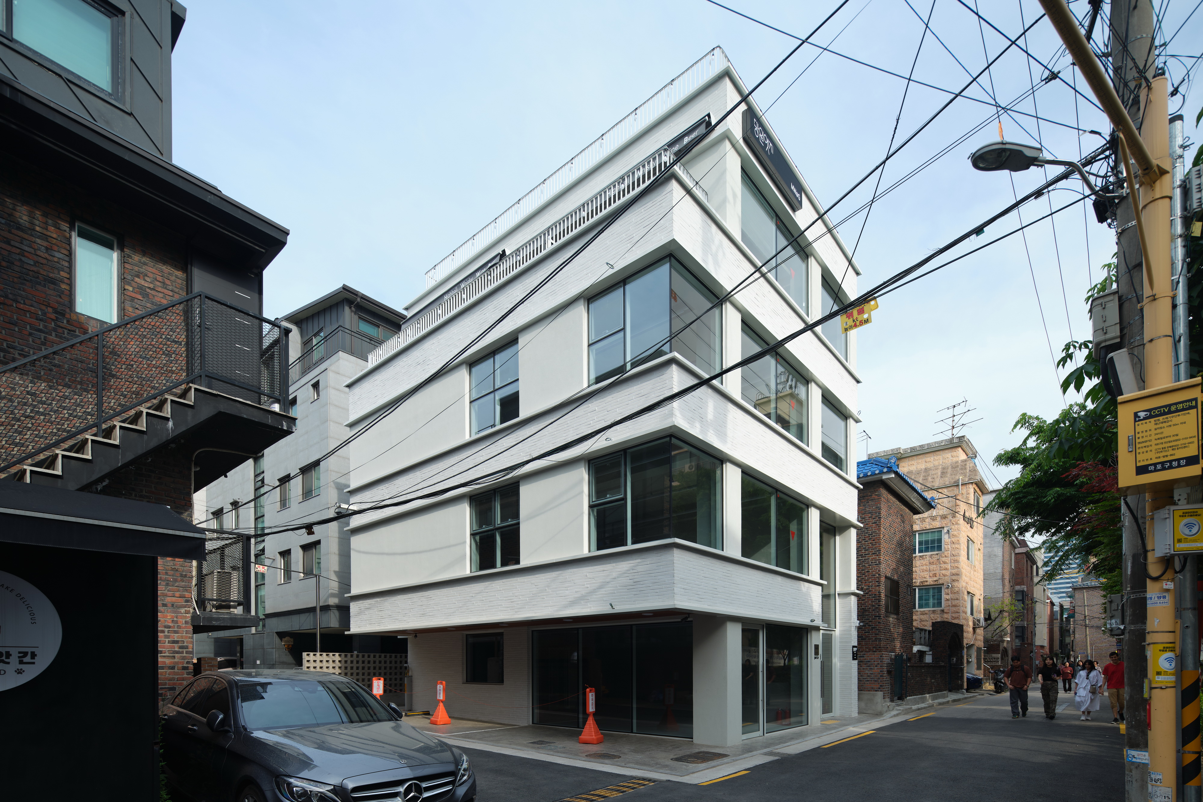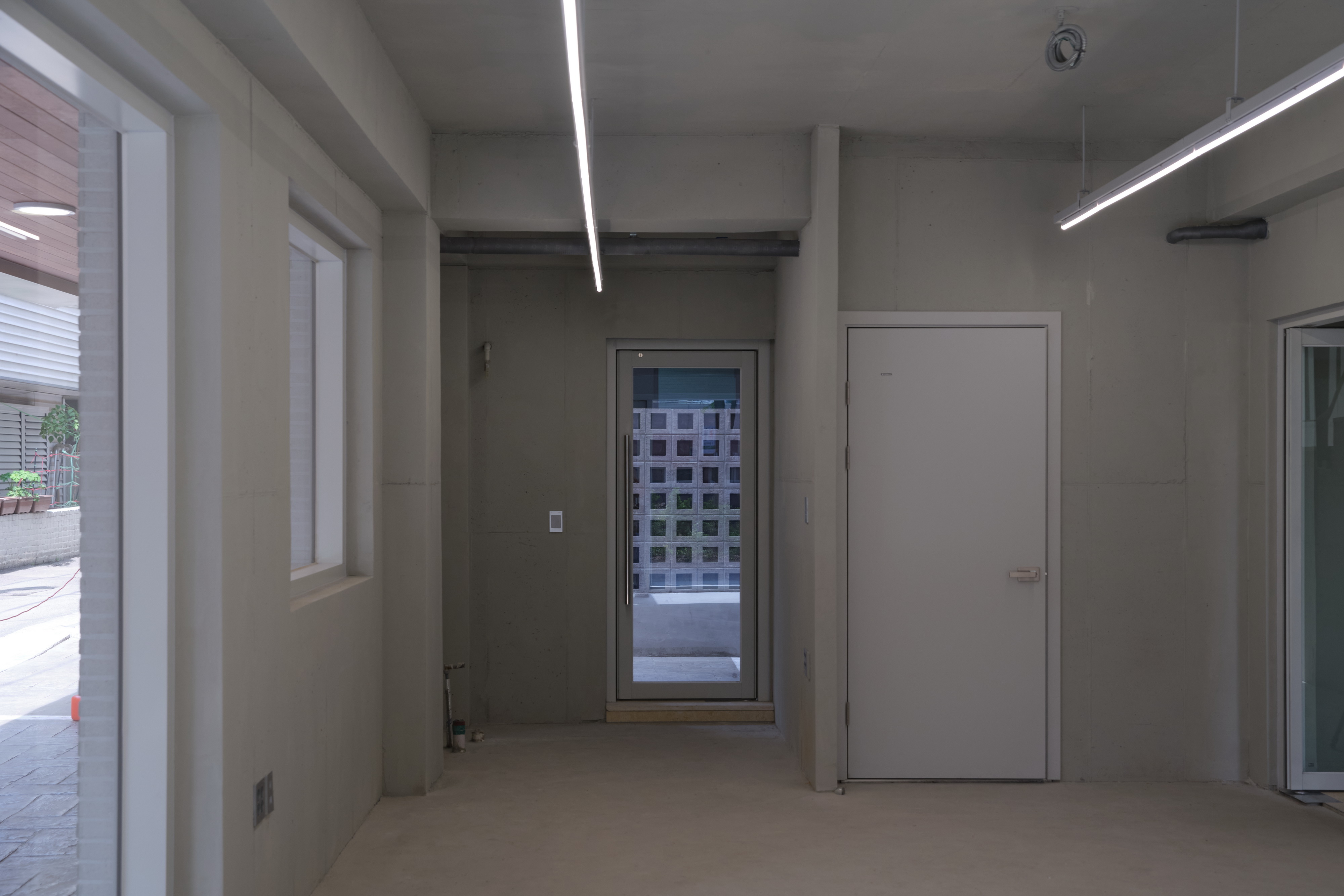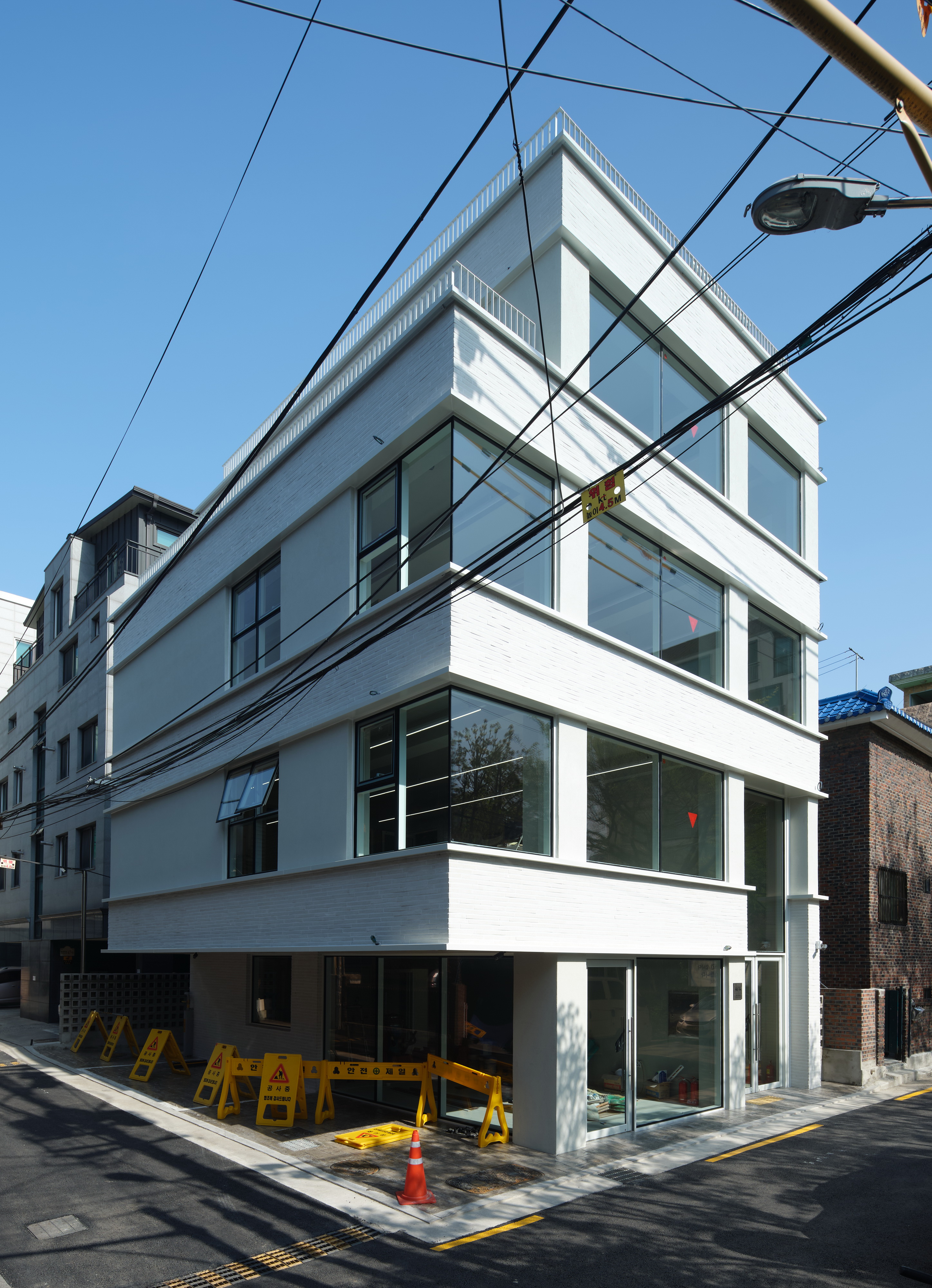 작은 근생 건물이지만, 주출입구 로비 부분을 2개층 오픈시켜 개방감이 느껴지고, 내부에서 전면부 쪽으로 구성한 넓은 개구부로 계절에 따라 변하는 공원의 풍경이 담긴다.