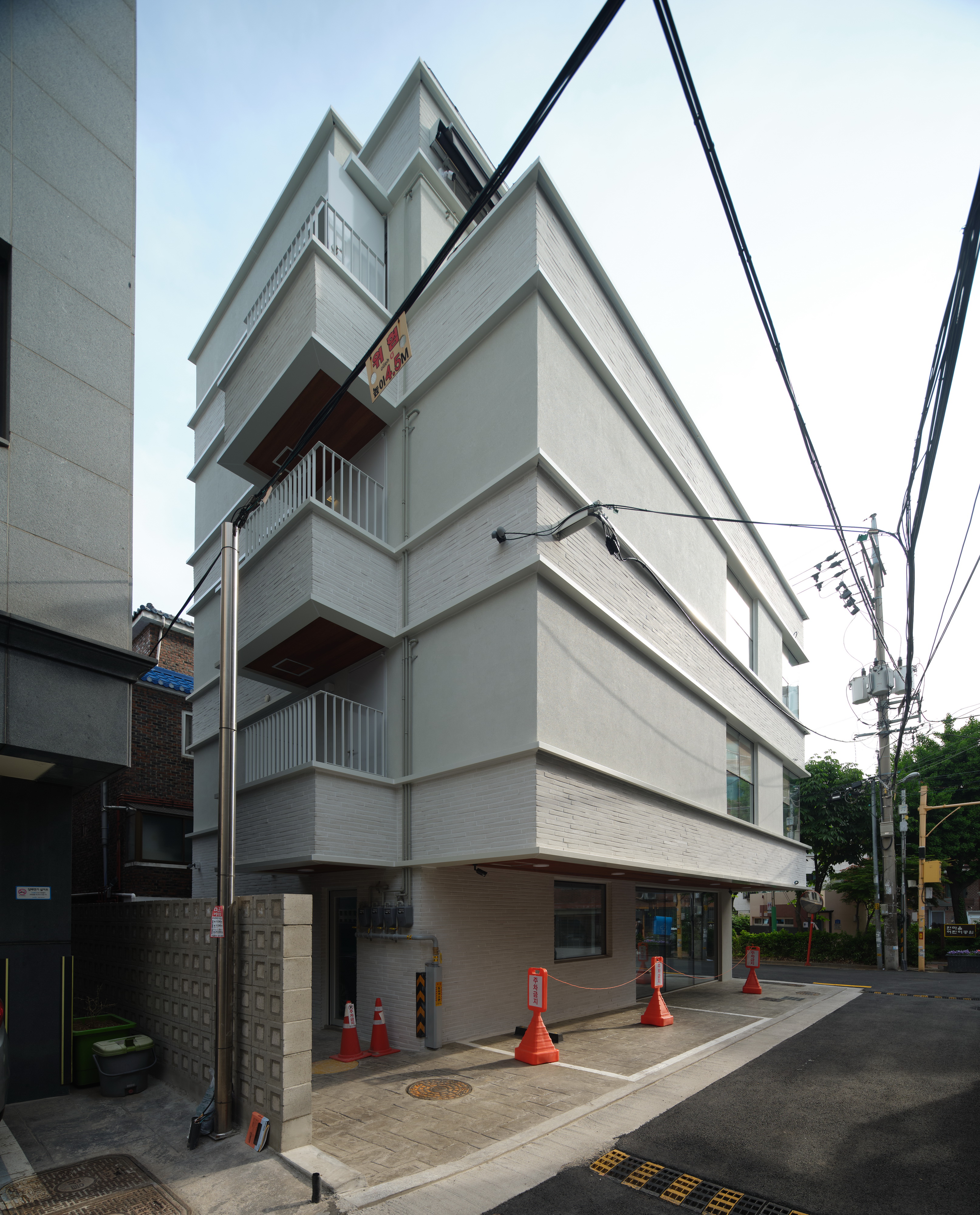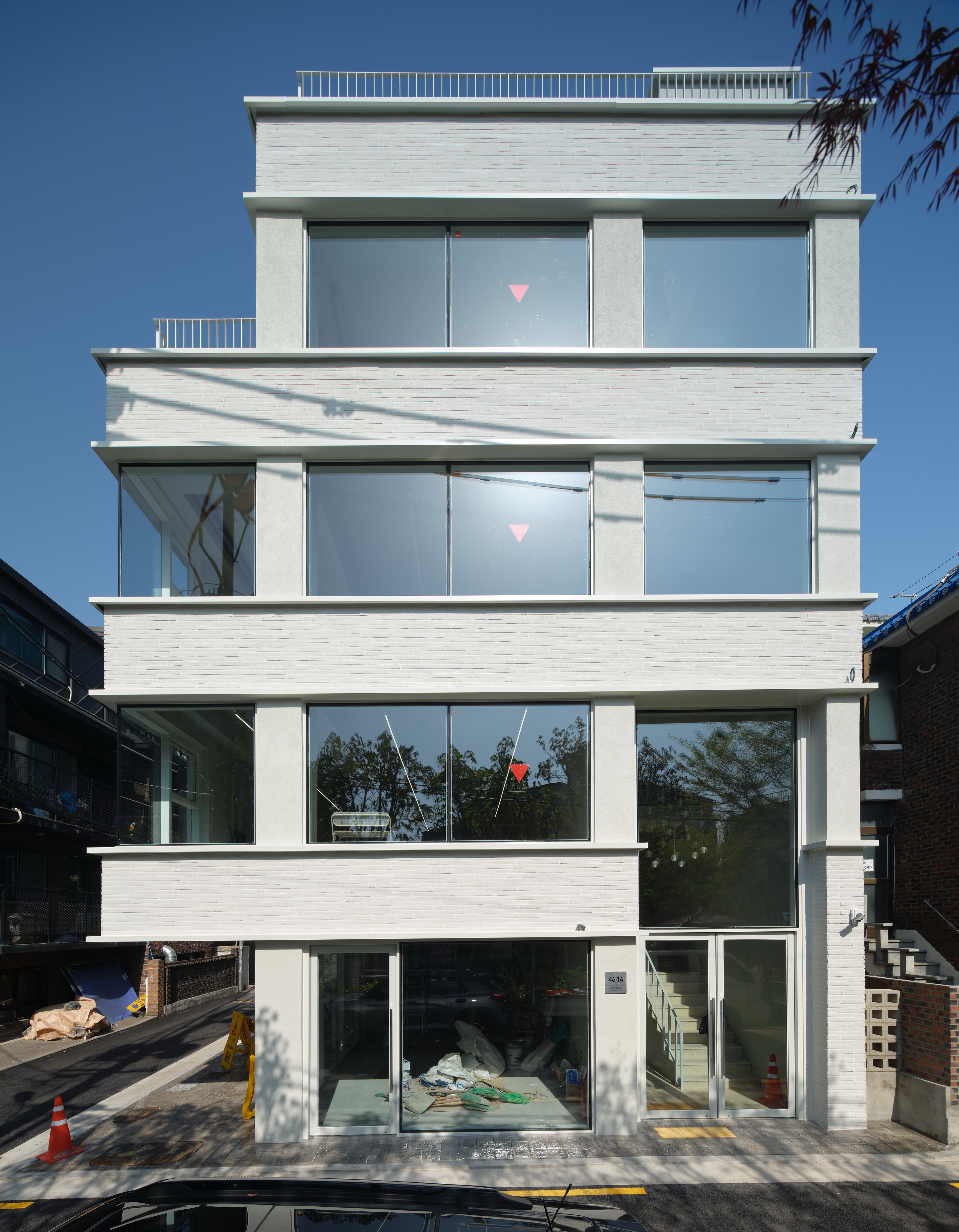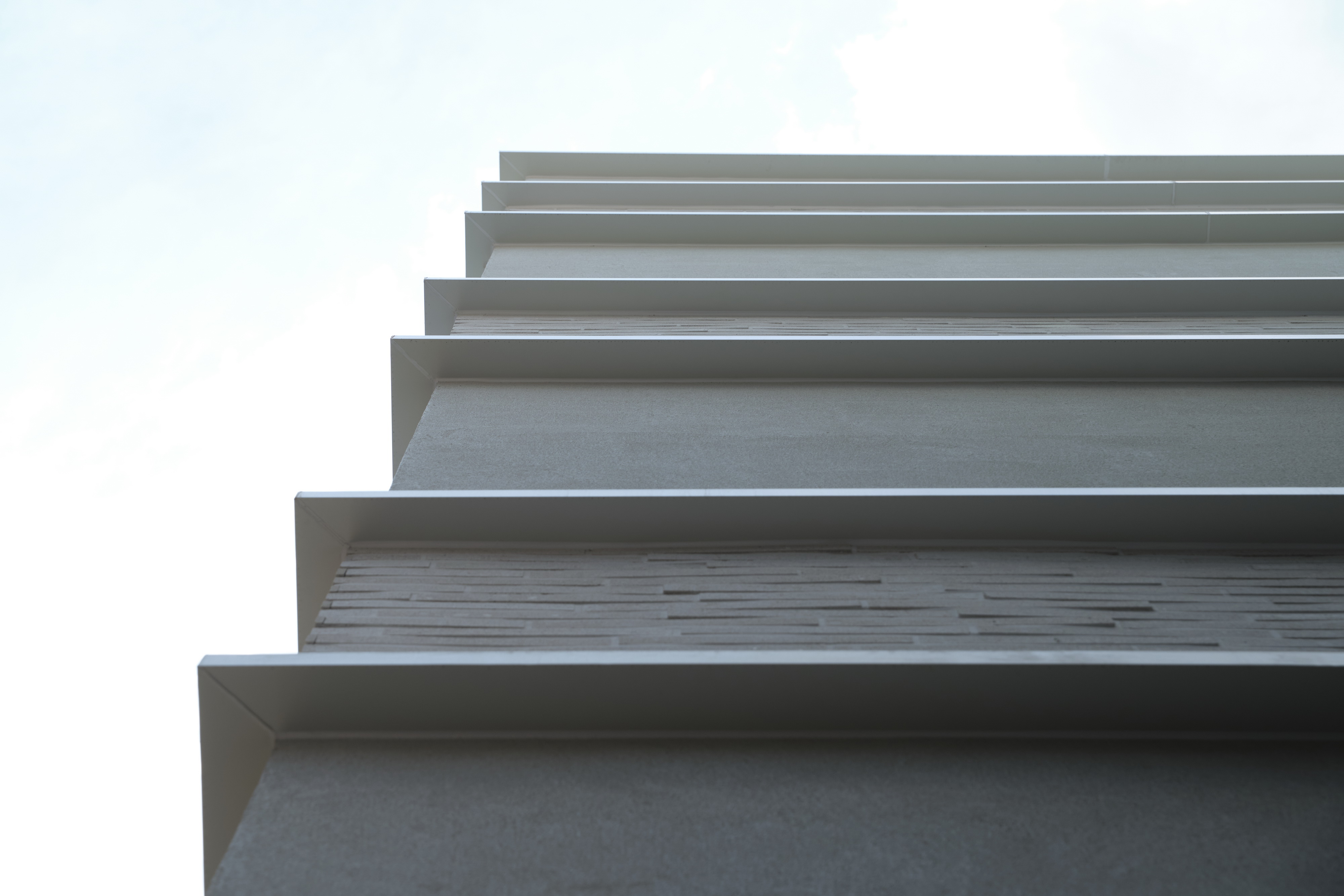 외부 입면은 알루미늄시트를 절곡하여 각 층마다 수평 프레임을 만들고, 그 사이 공간은 테라죠 벽돌타일로 채워 넣었다.
