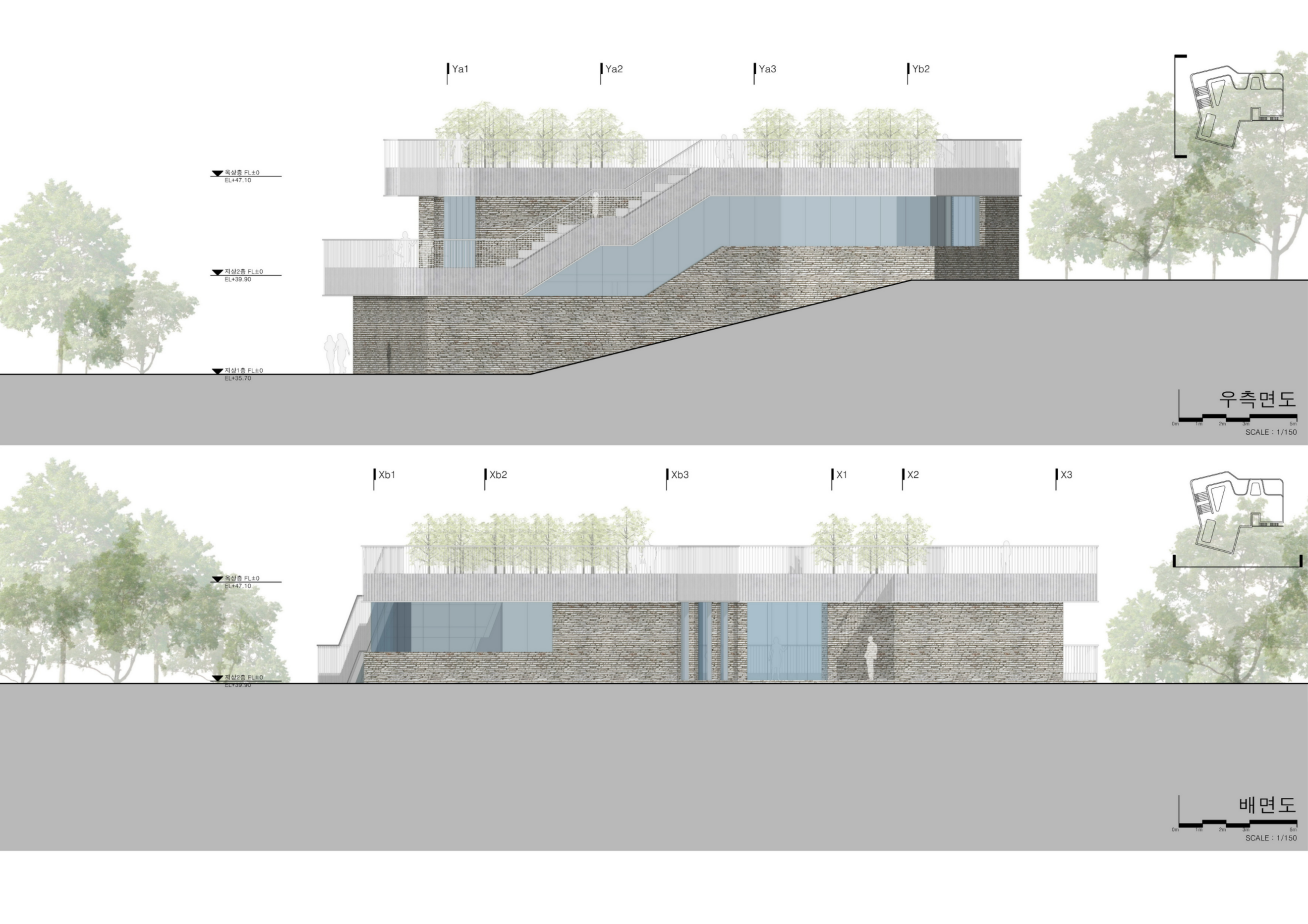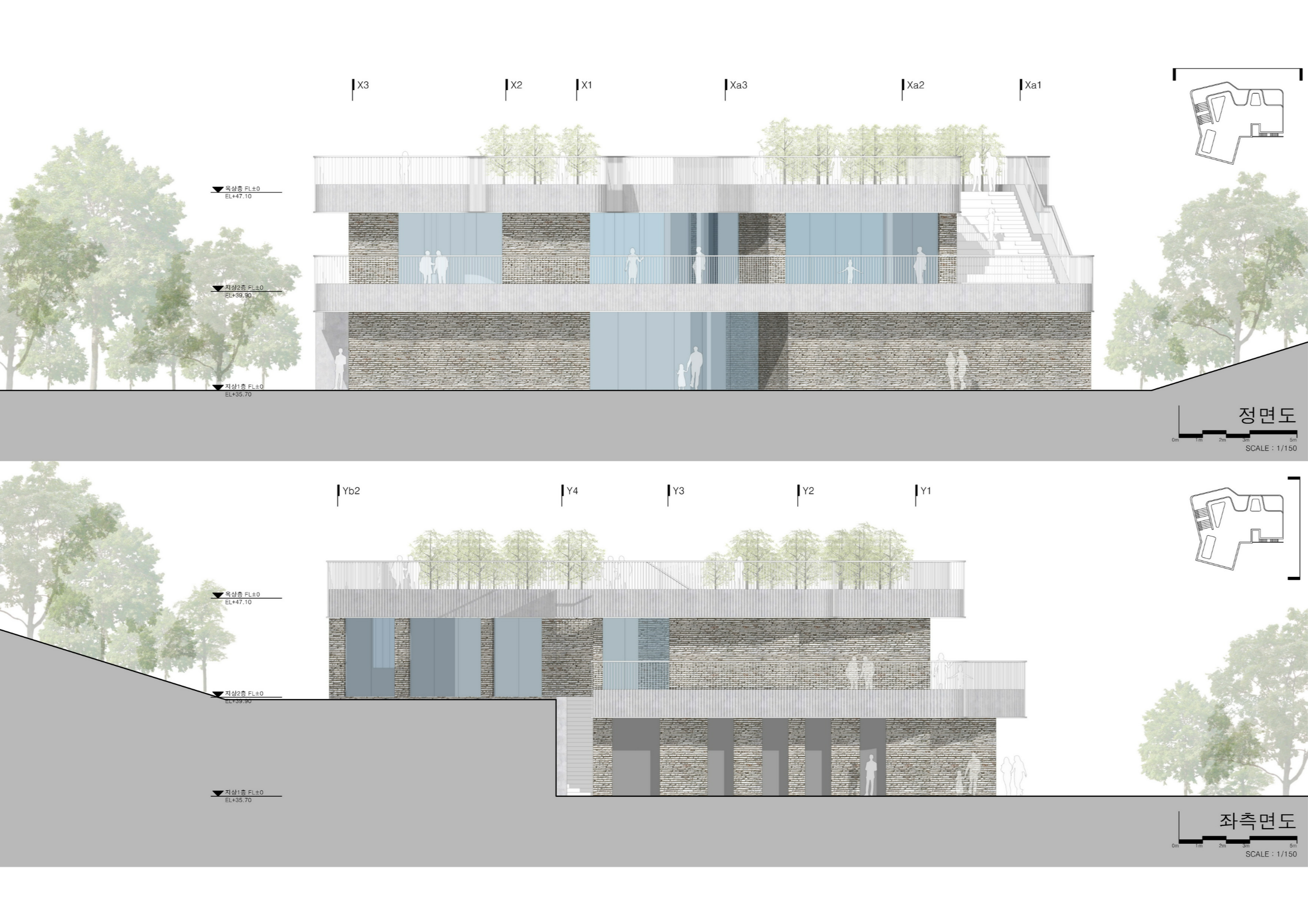 외부마감: 자연석켜쌓기, 노출콘크리트, 스틸루버