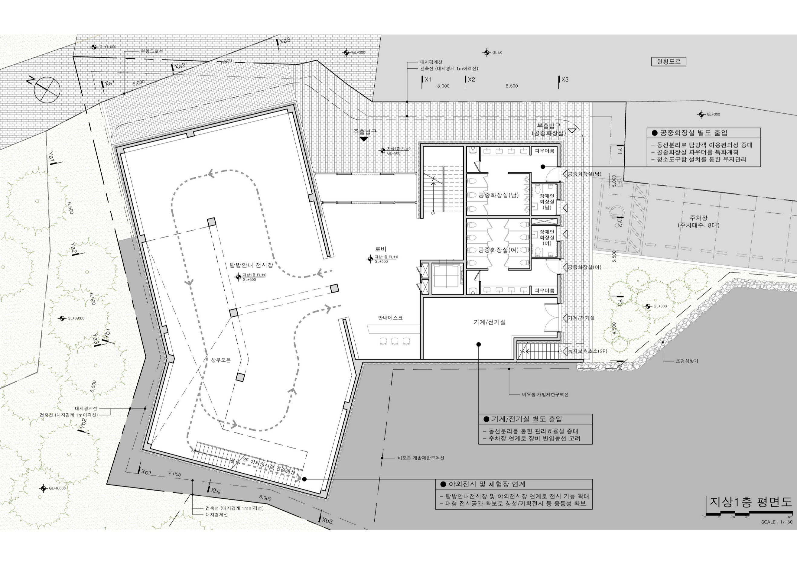 내부 공간이용 효율성을 고려하여 탐방안내영역과 관리영역을 분리하고, 탐방객 편의를 위한 공중화장실을 별도 출입하도록 구성했다.