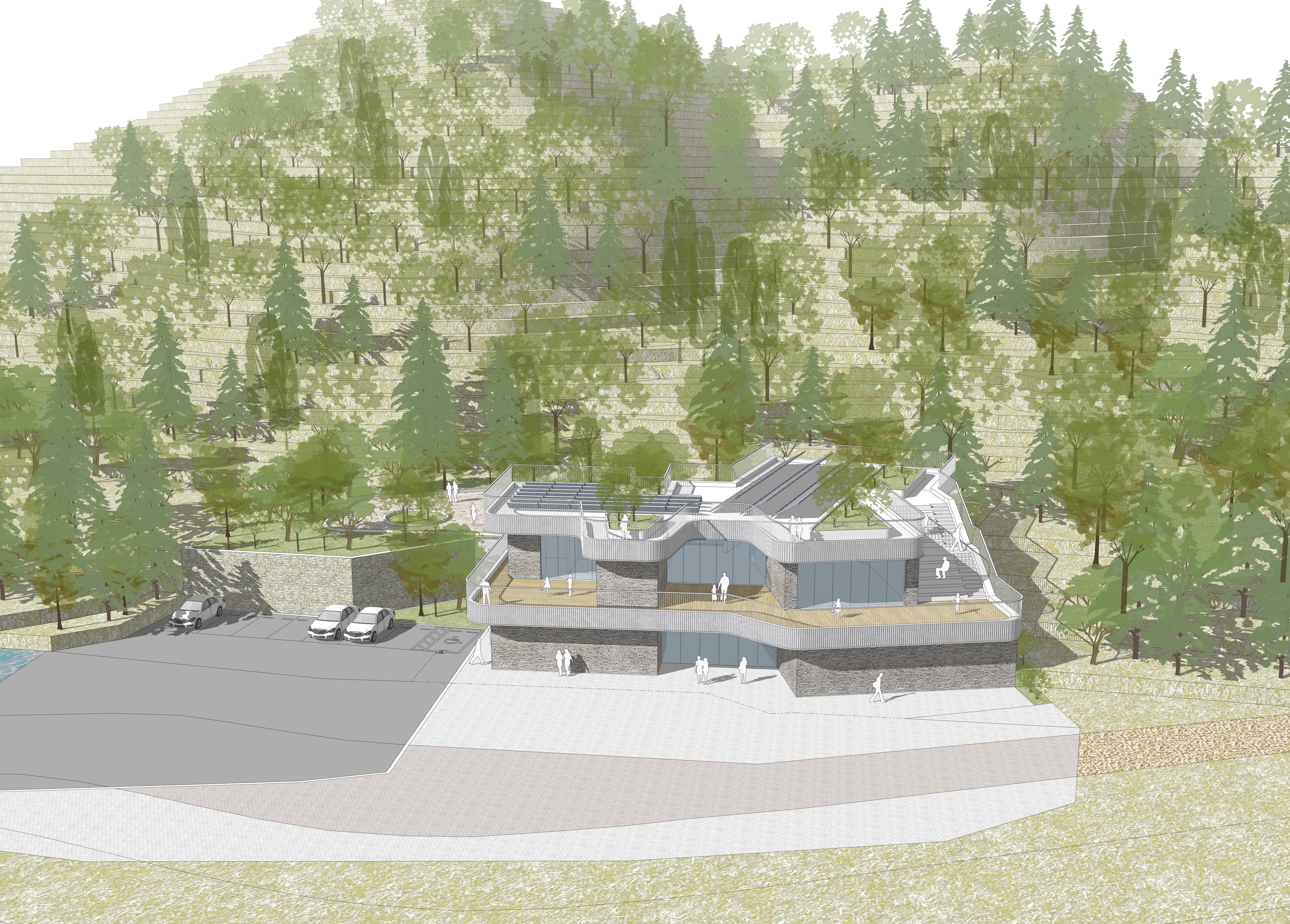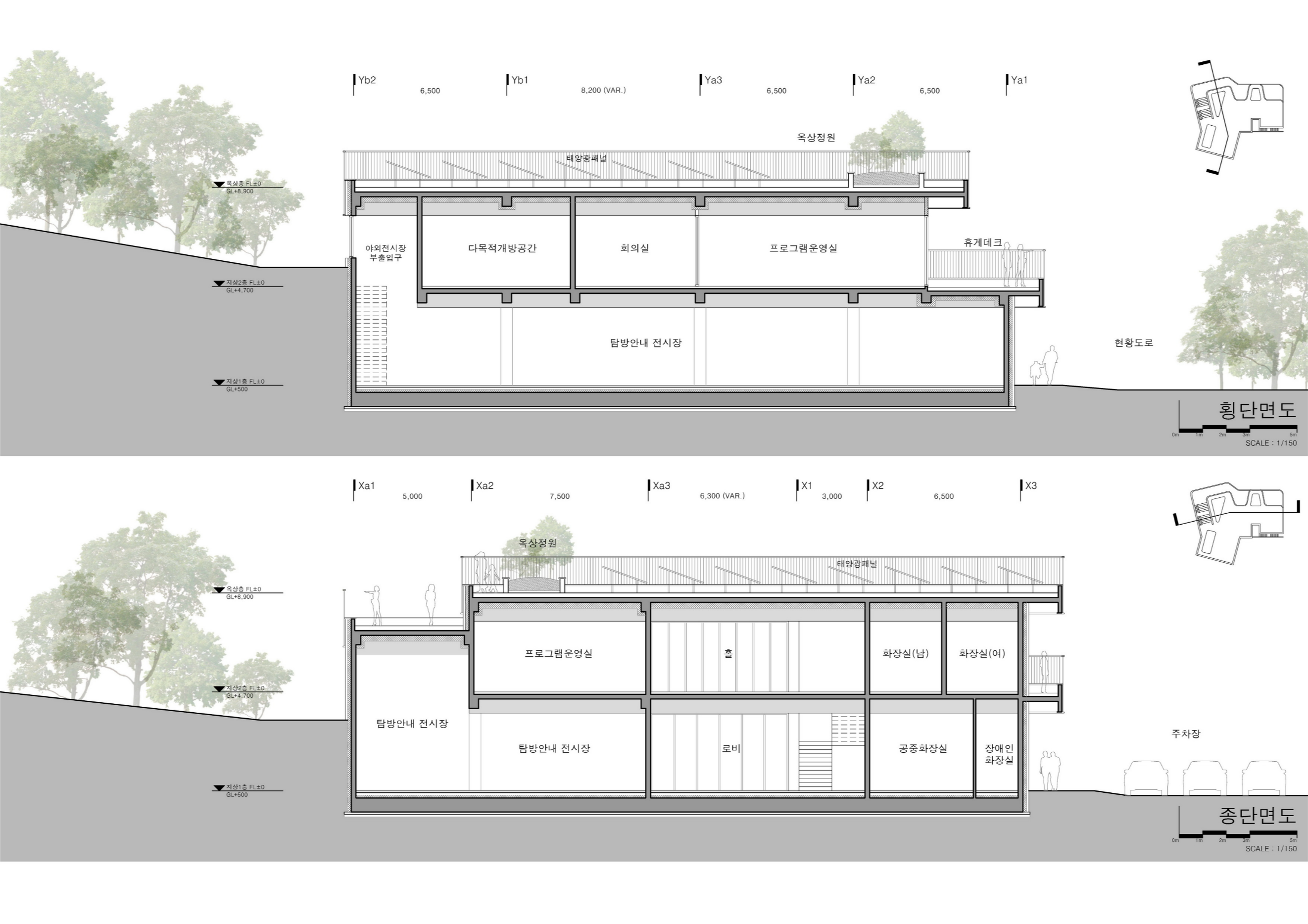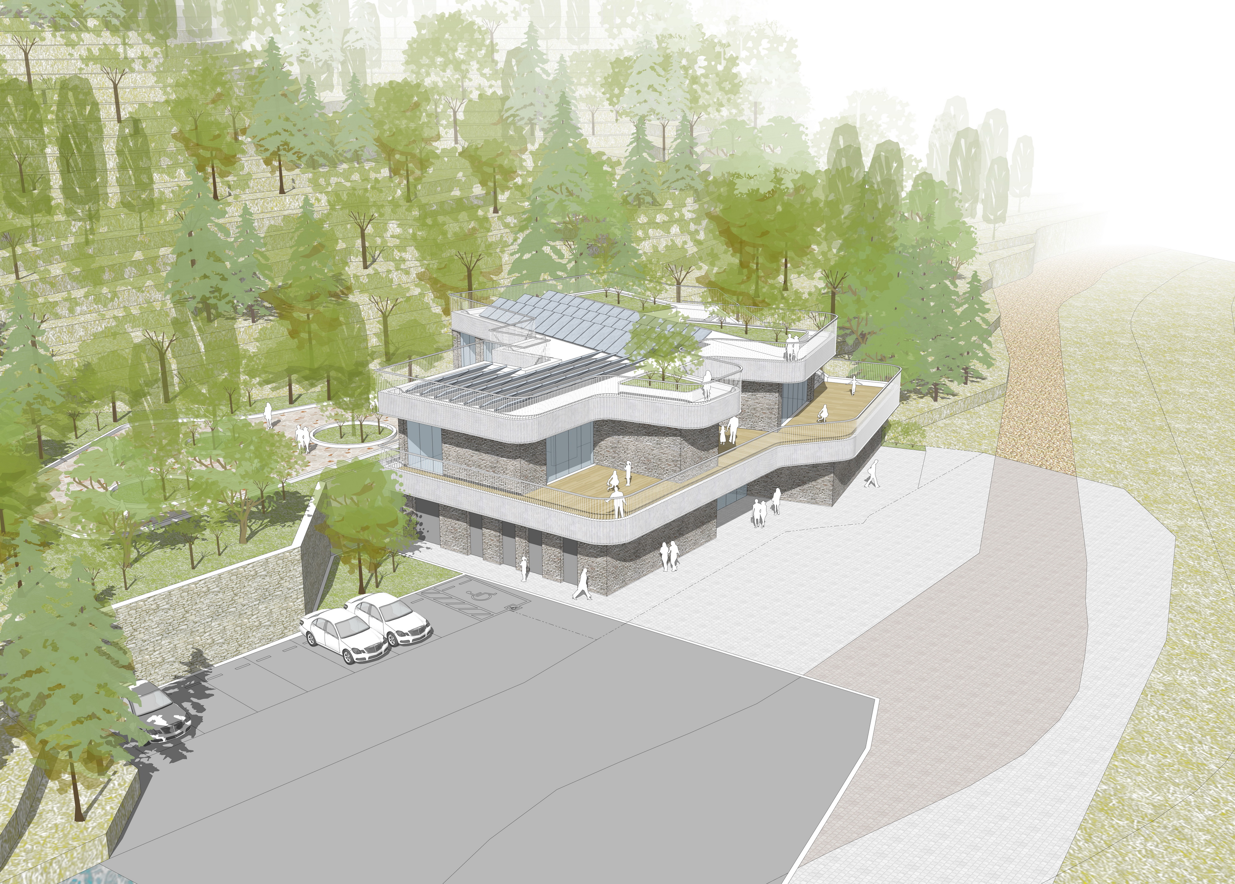 북한산이란 자연을 알리고 잘 보존하기 위한 건축물이기에, 건축물 자체의 형태가 선명하게 드러나기 보다는 원래 경사지형에 순응하며 차분하고 희미하게 드러나 보이길 원했다.