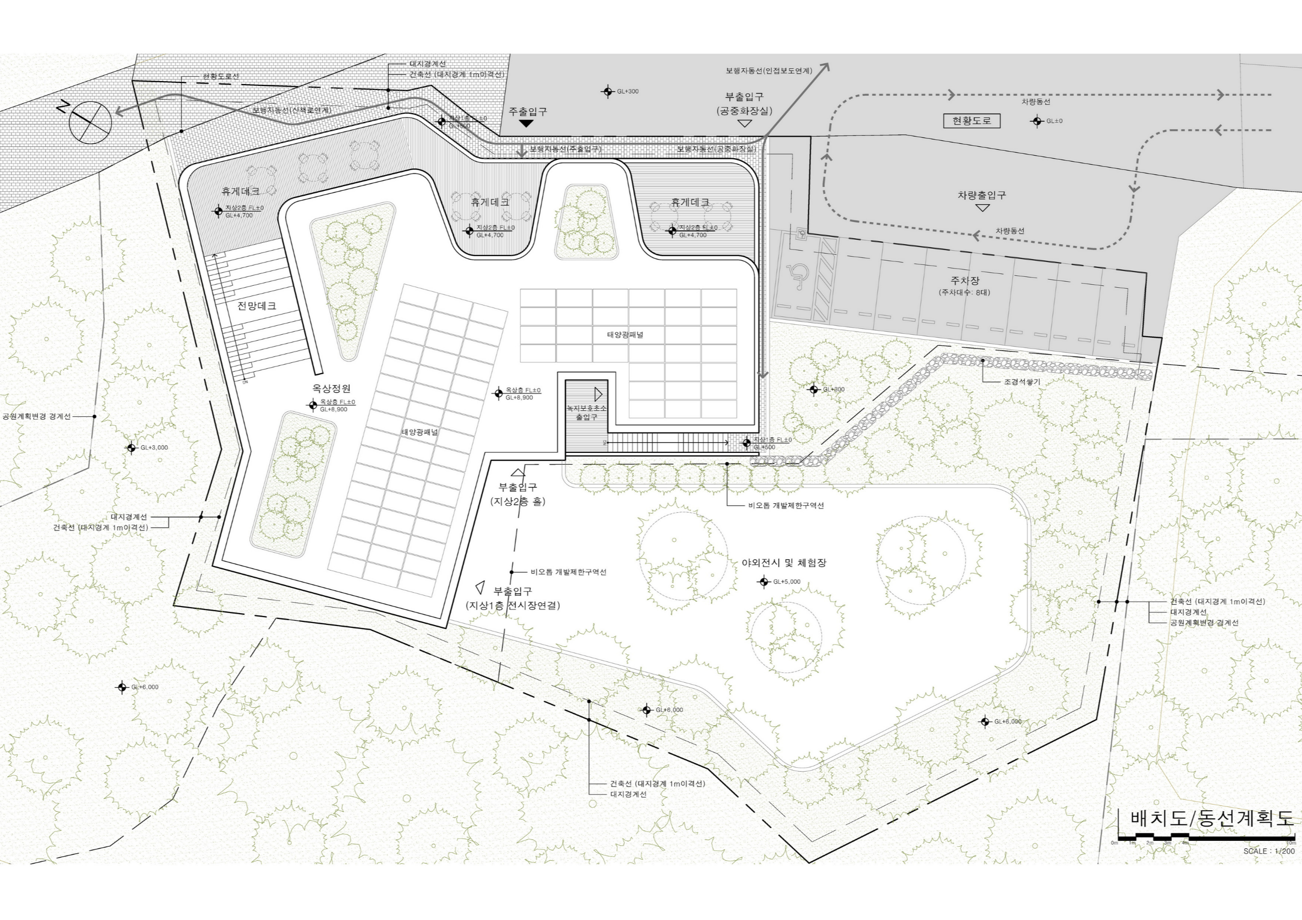 대지에 접해있는 비오톱 구역과 생태축을 고려하여 건축물을 배치하고, 지형훼손을 최소화한 단면을 계획하여 북한산 산세와 어우러지는 스카이라인을 만들었다.