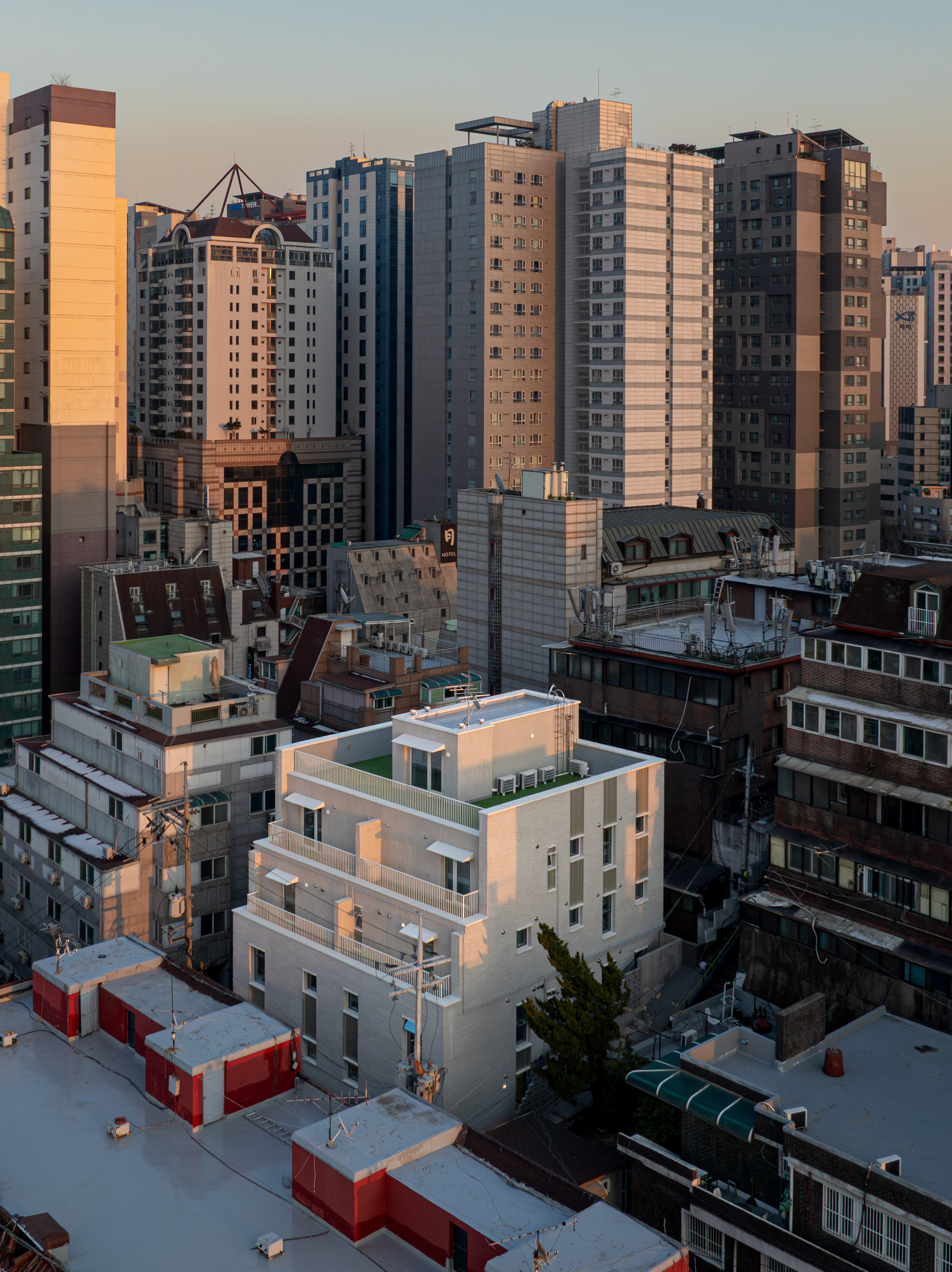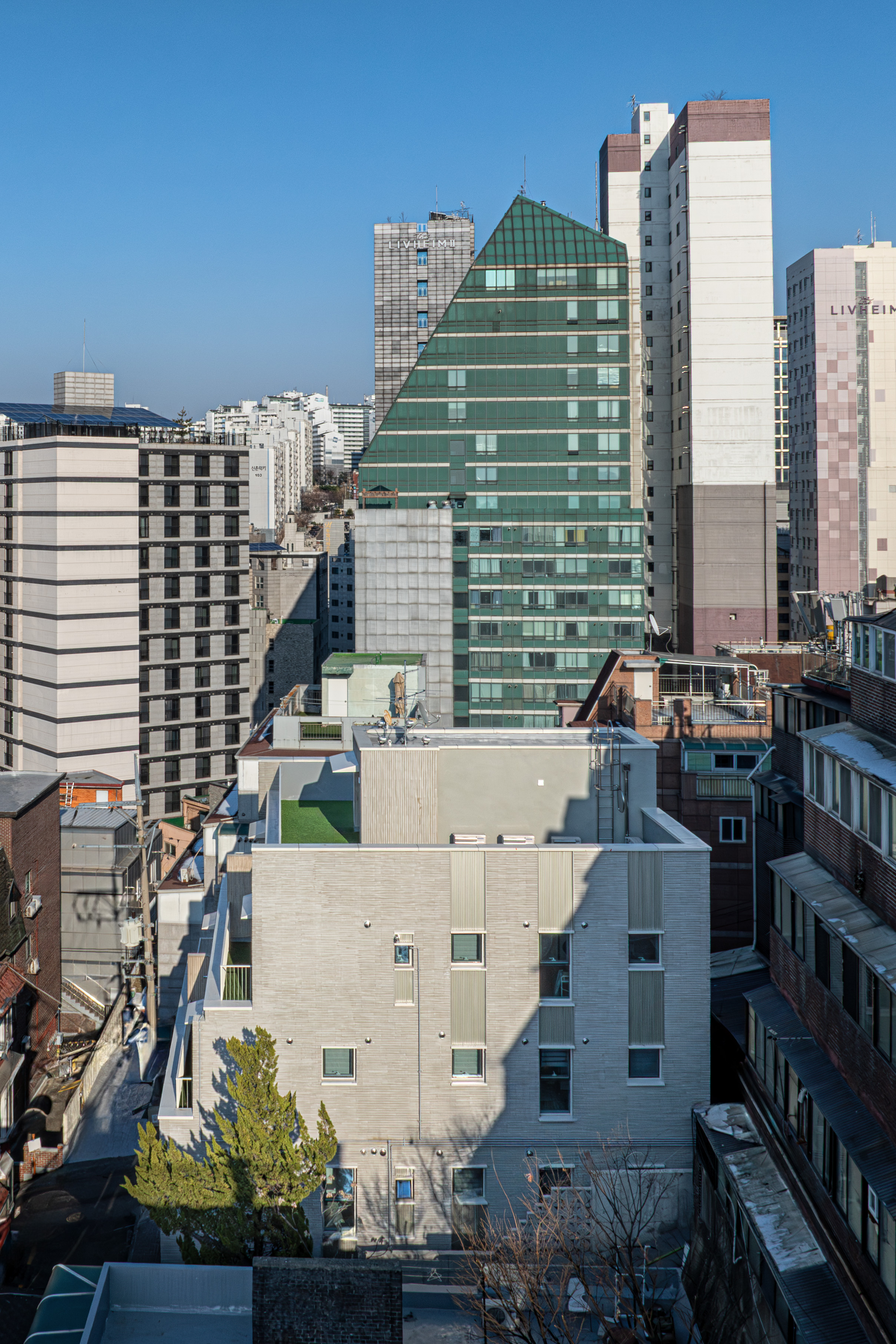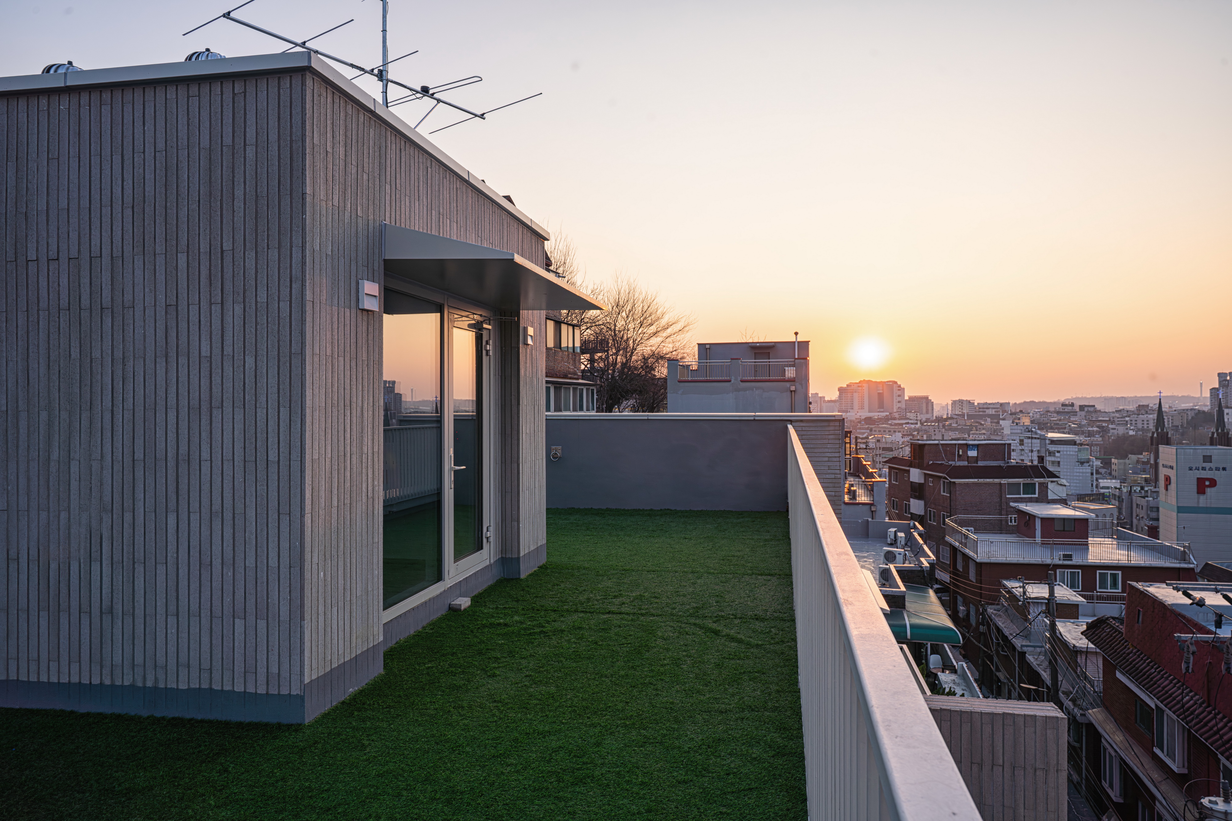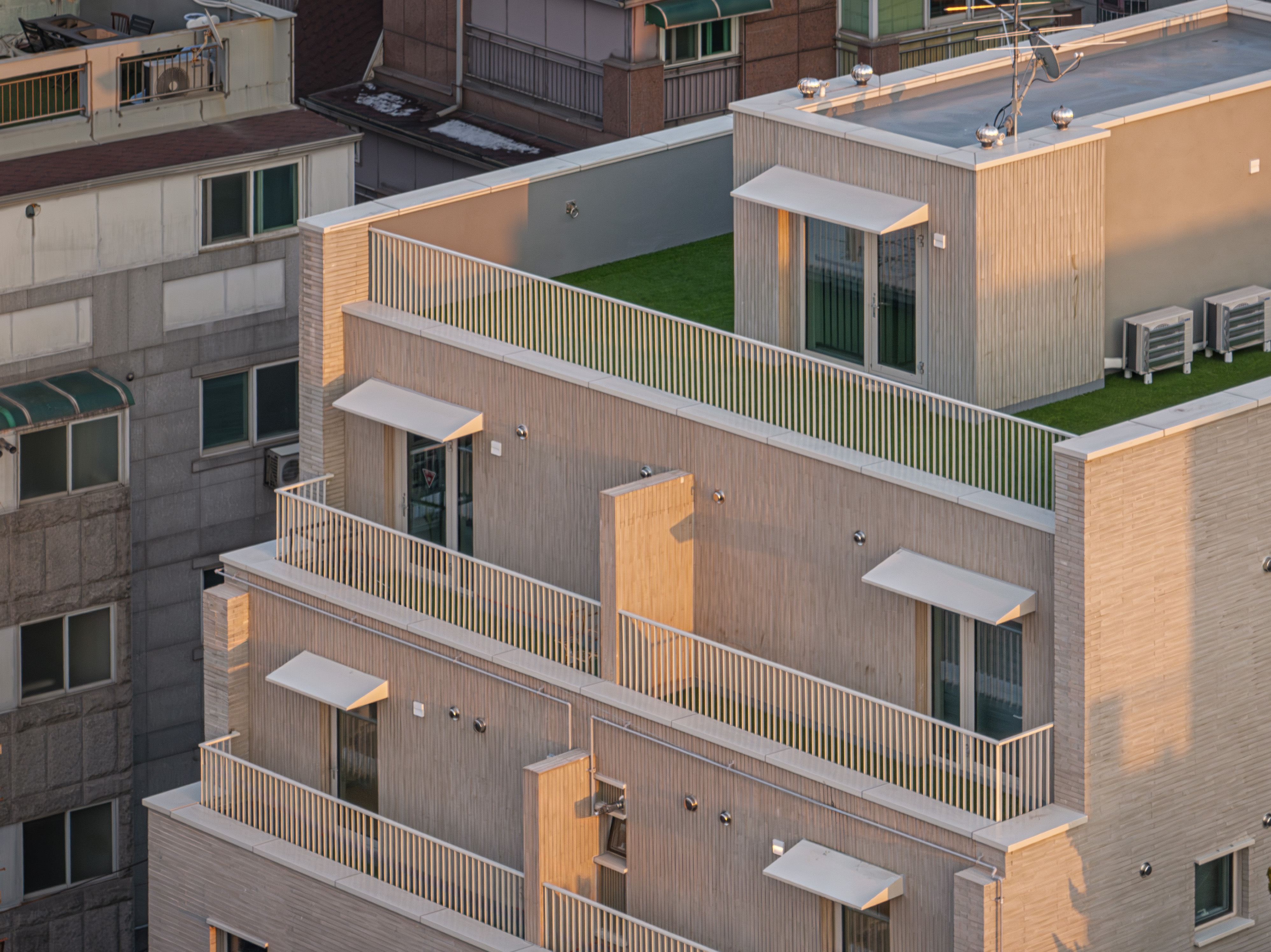 지하층 슬래브 및 일조권으로 인한 후퇴 부분을 활용하여 각층에 독립적인 외부 발코니 공간을 만들고, 옥상에도 작은 외부 테라스를 만들어 이용자를 고려했다.
