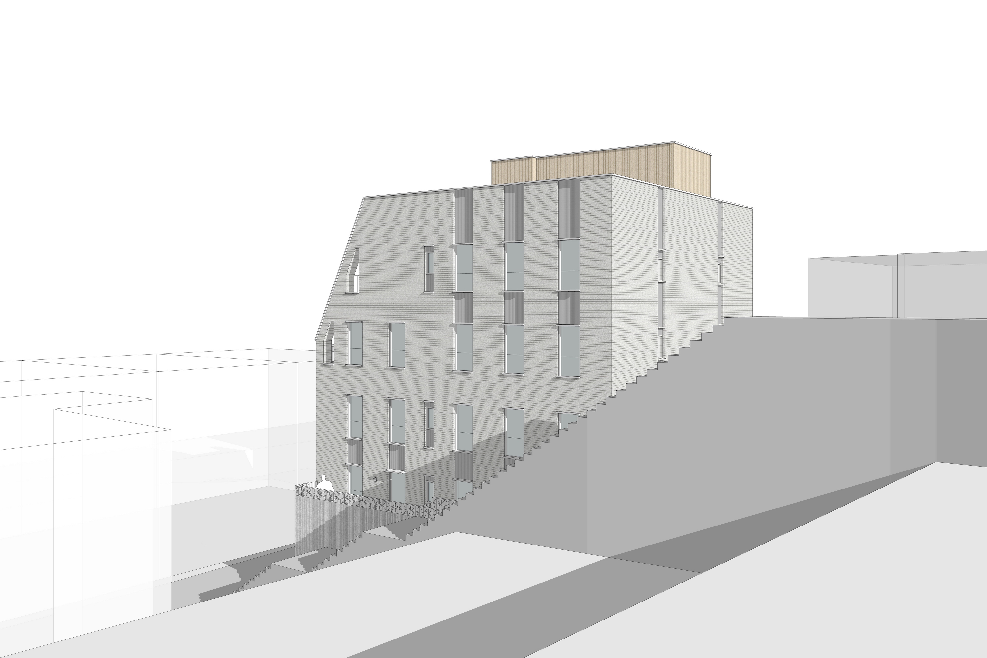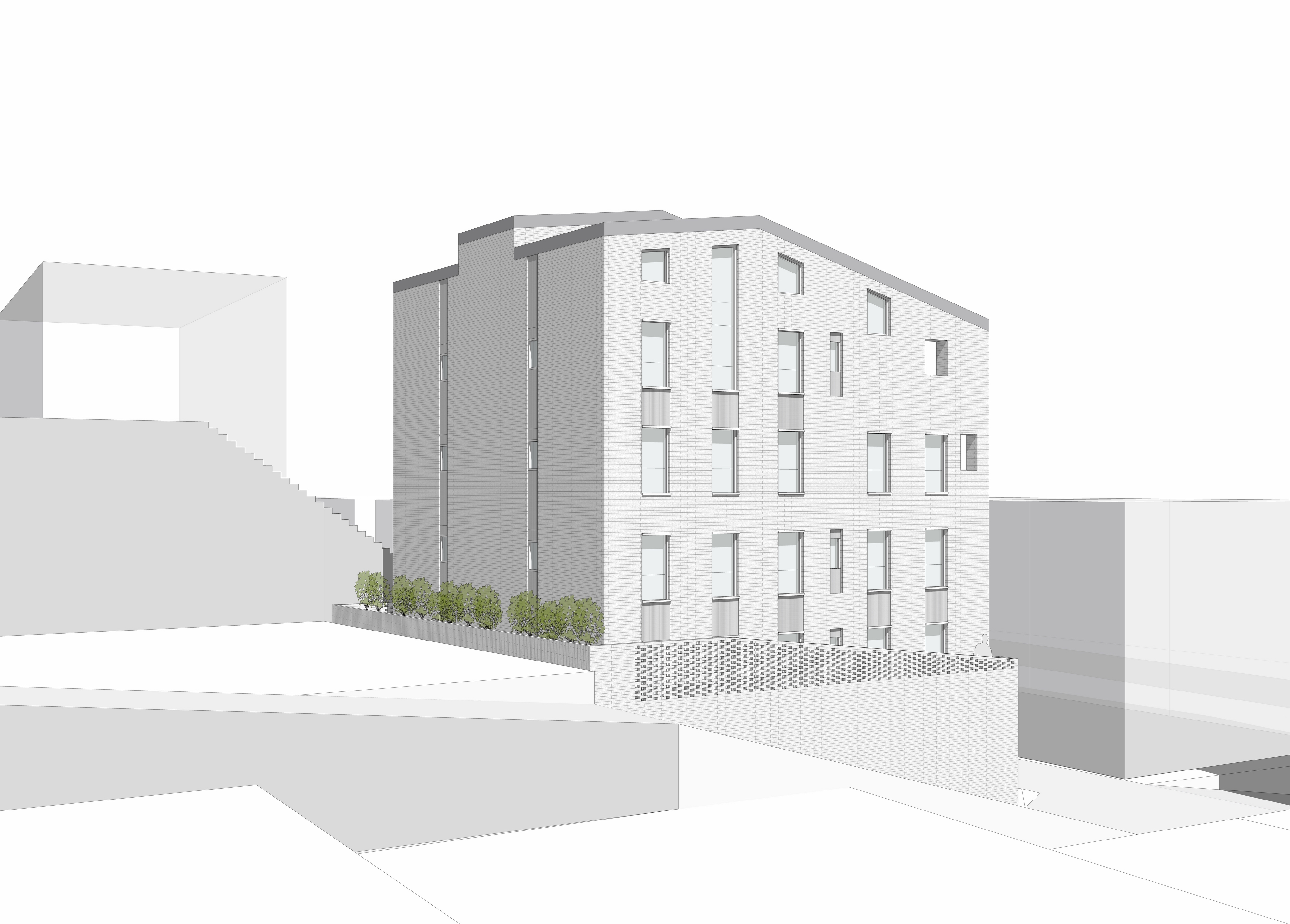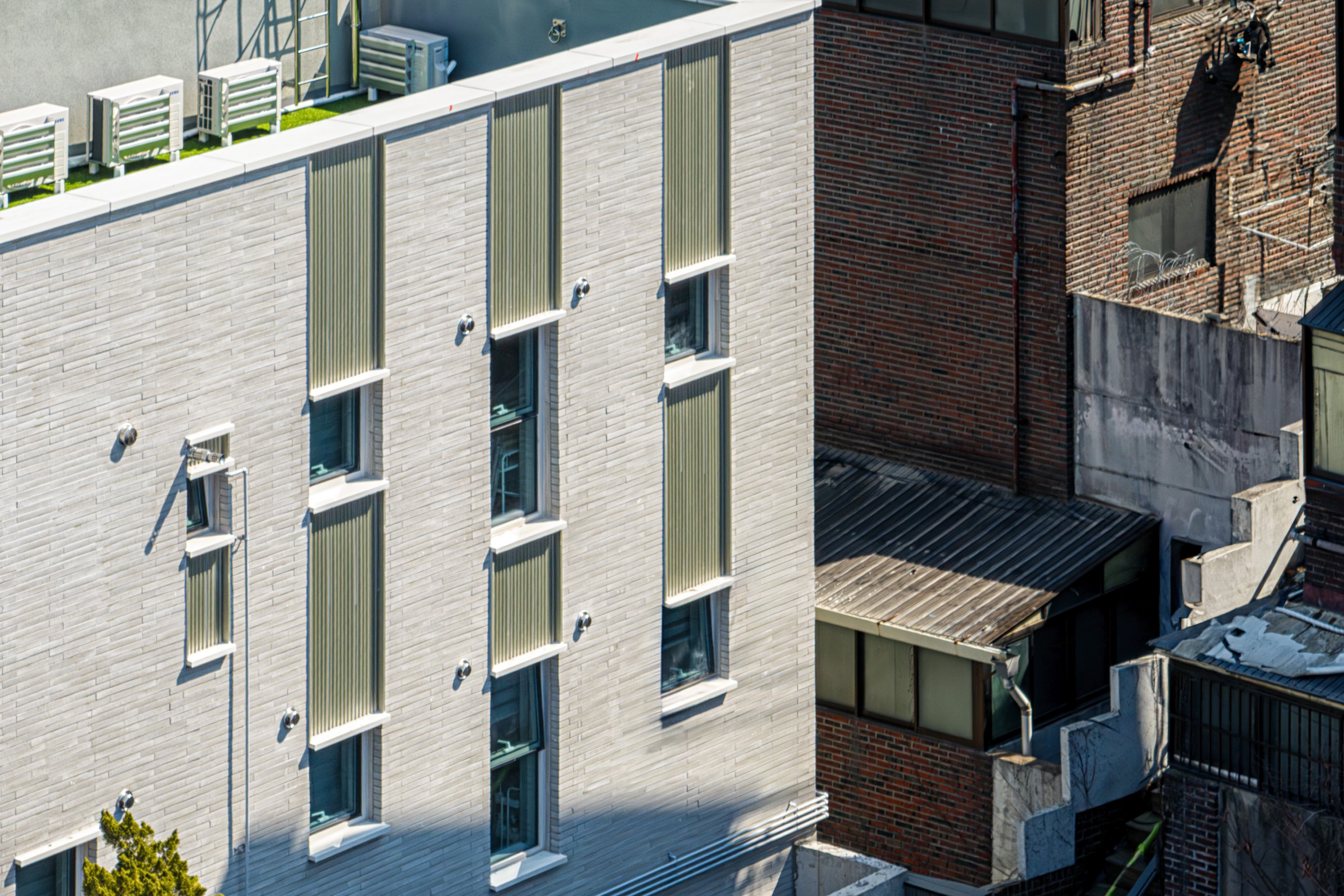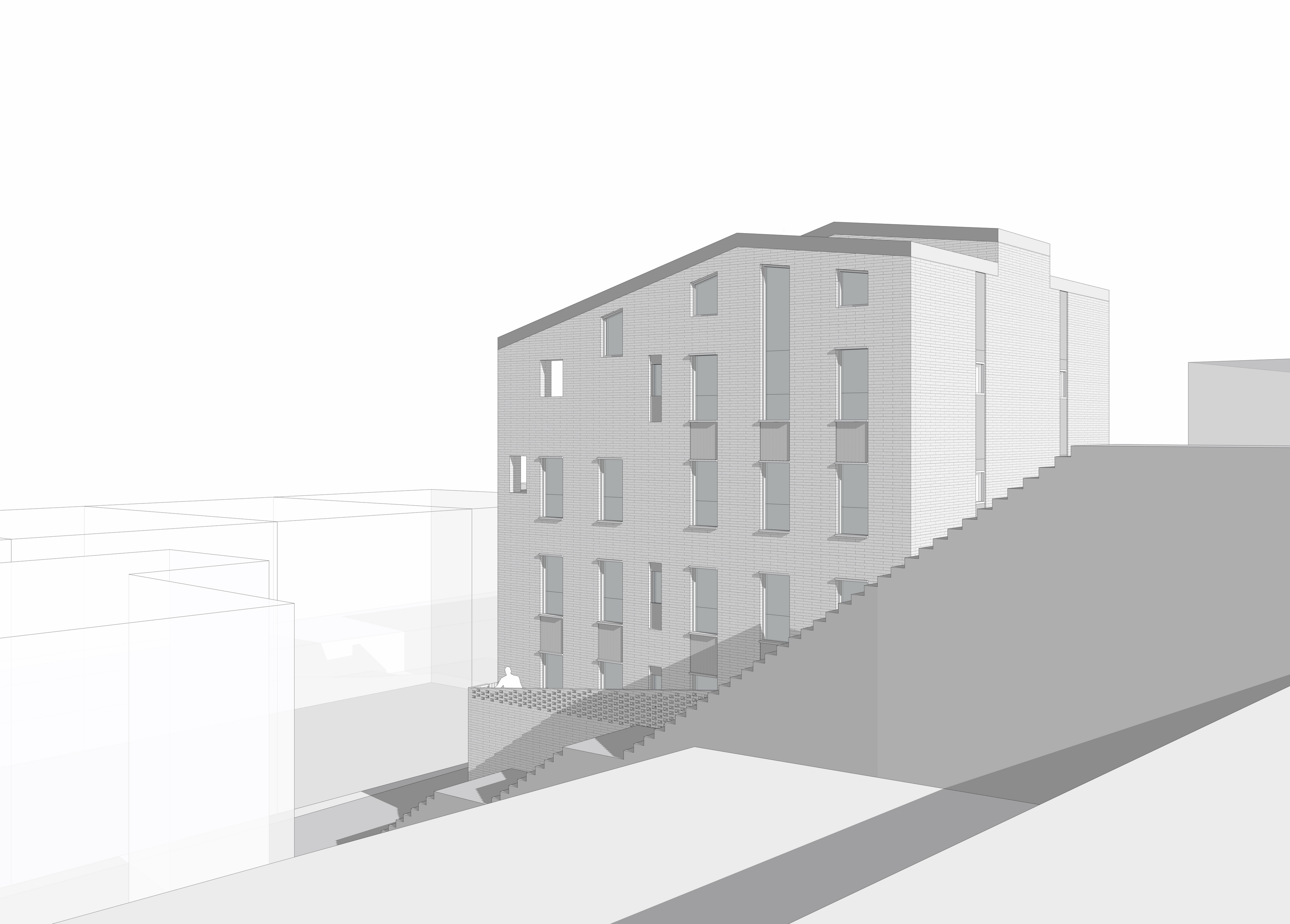 지하층 슬래브 및 일조권으로 인한 후퇴 부분을 활용하여 각층에 독립적인 외부 발코니 공간을 만들고, 옥상에도 작은 외부 테라스를 만들어 이용자를 고려했다.