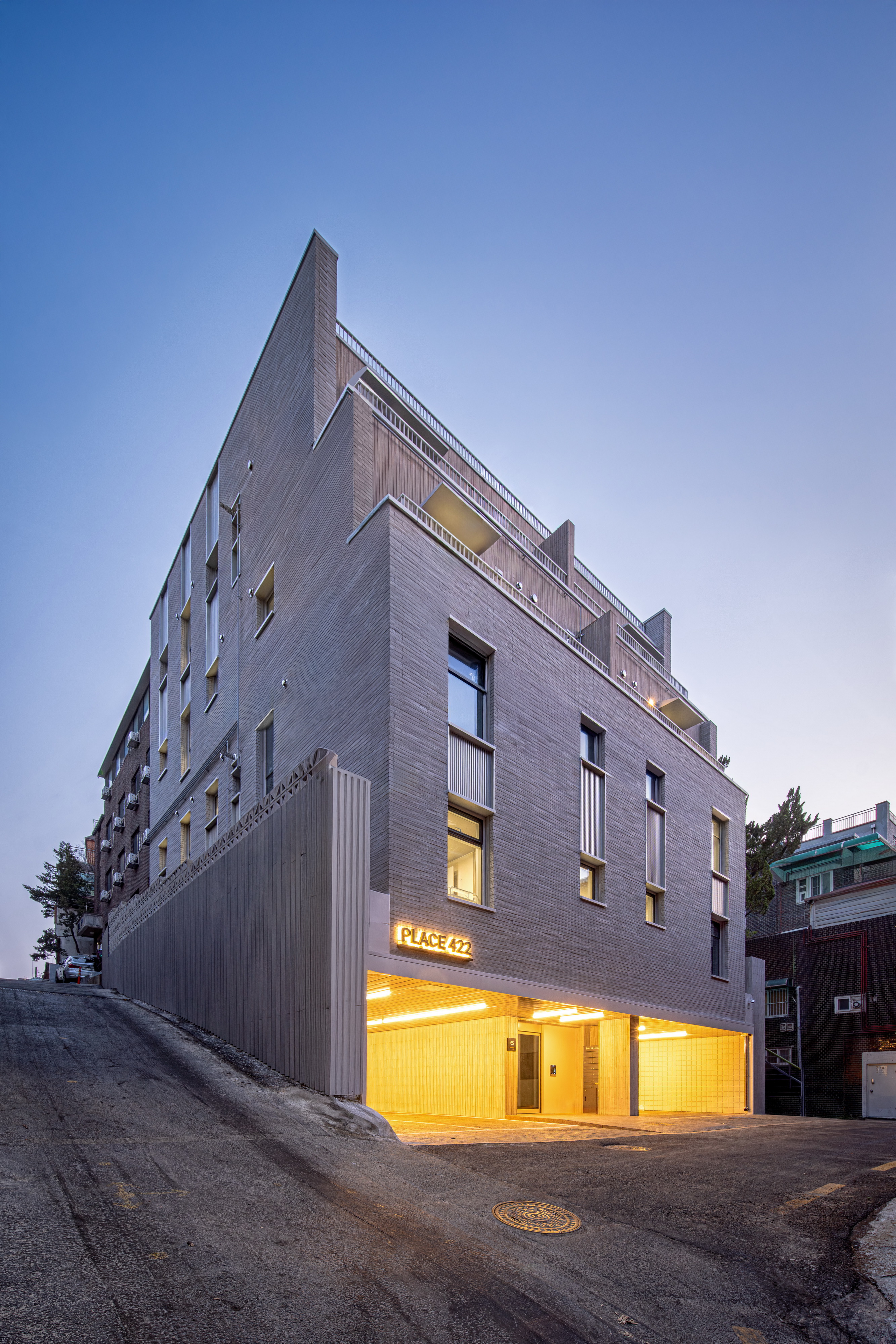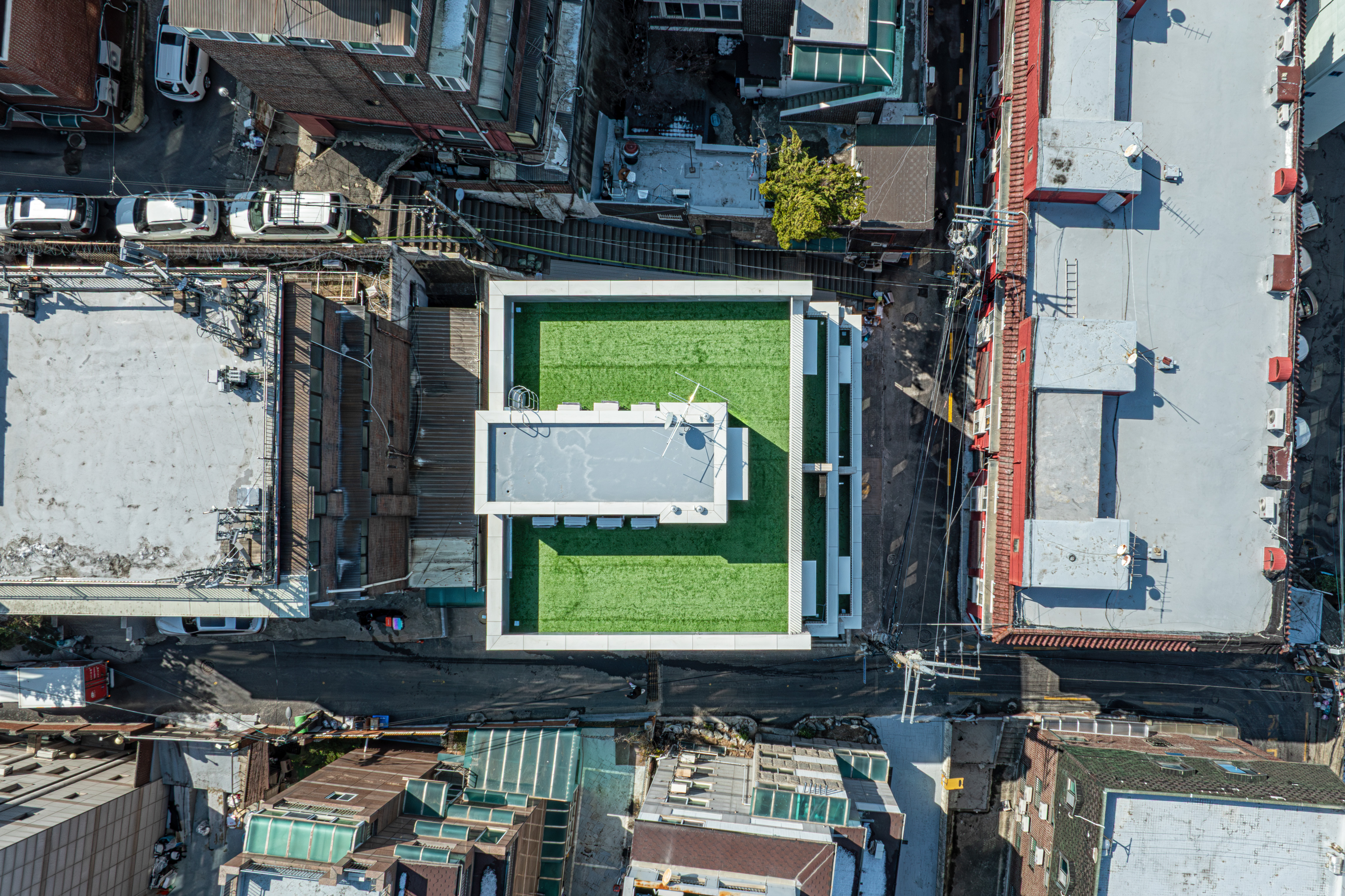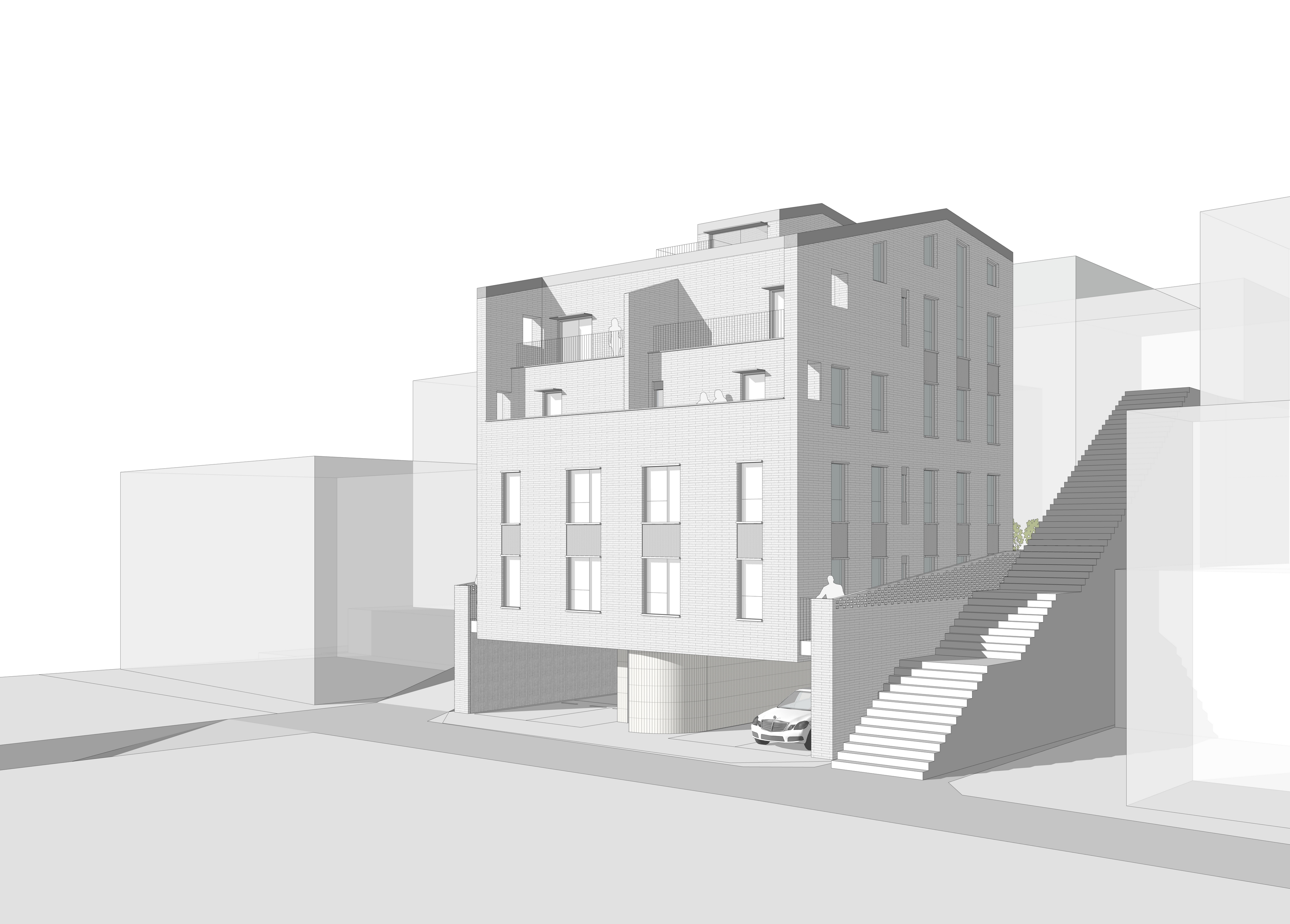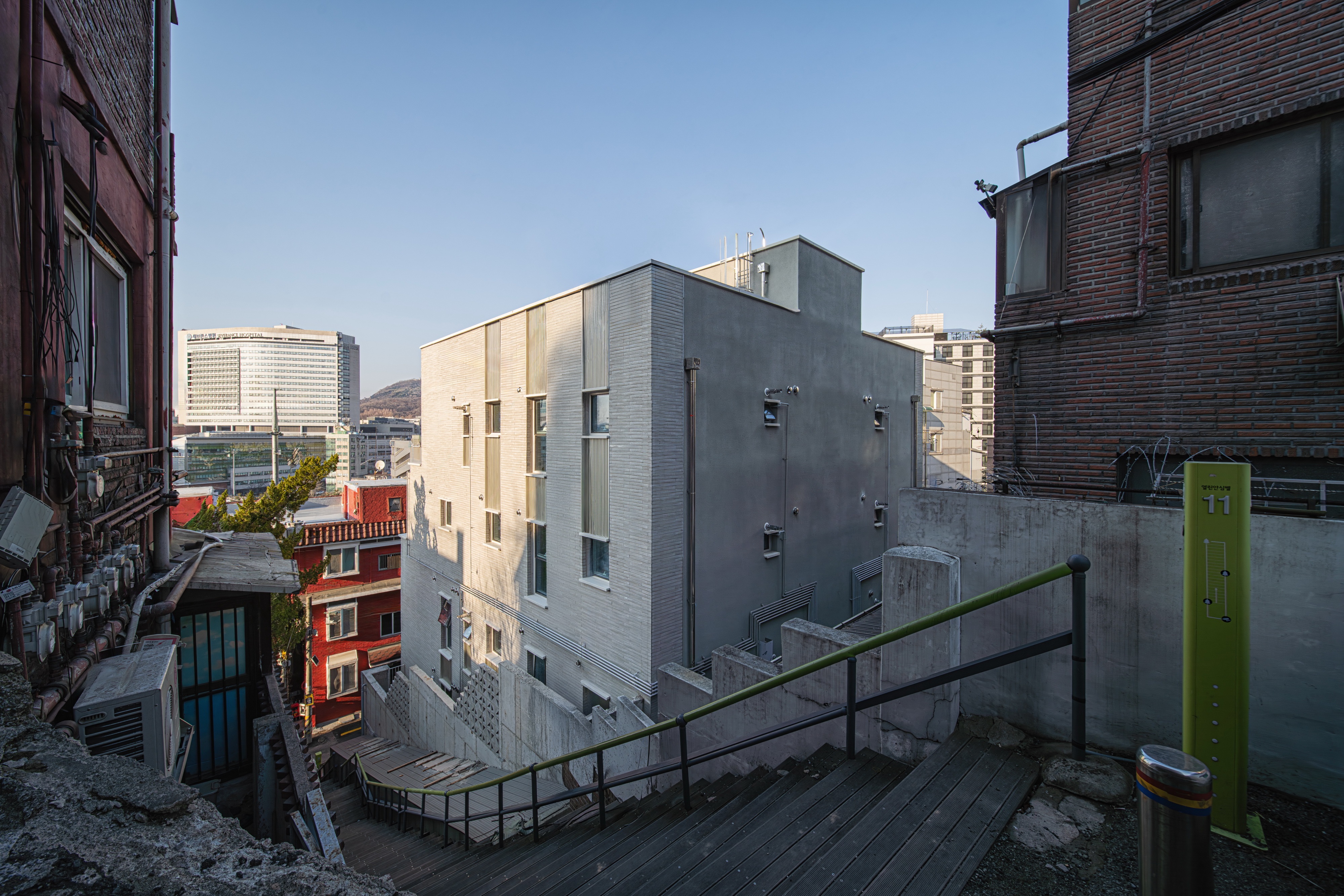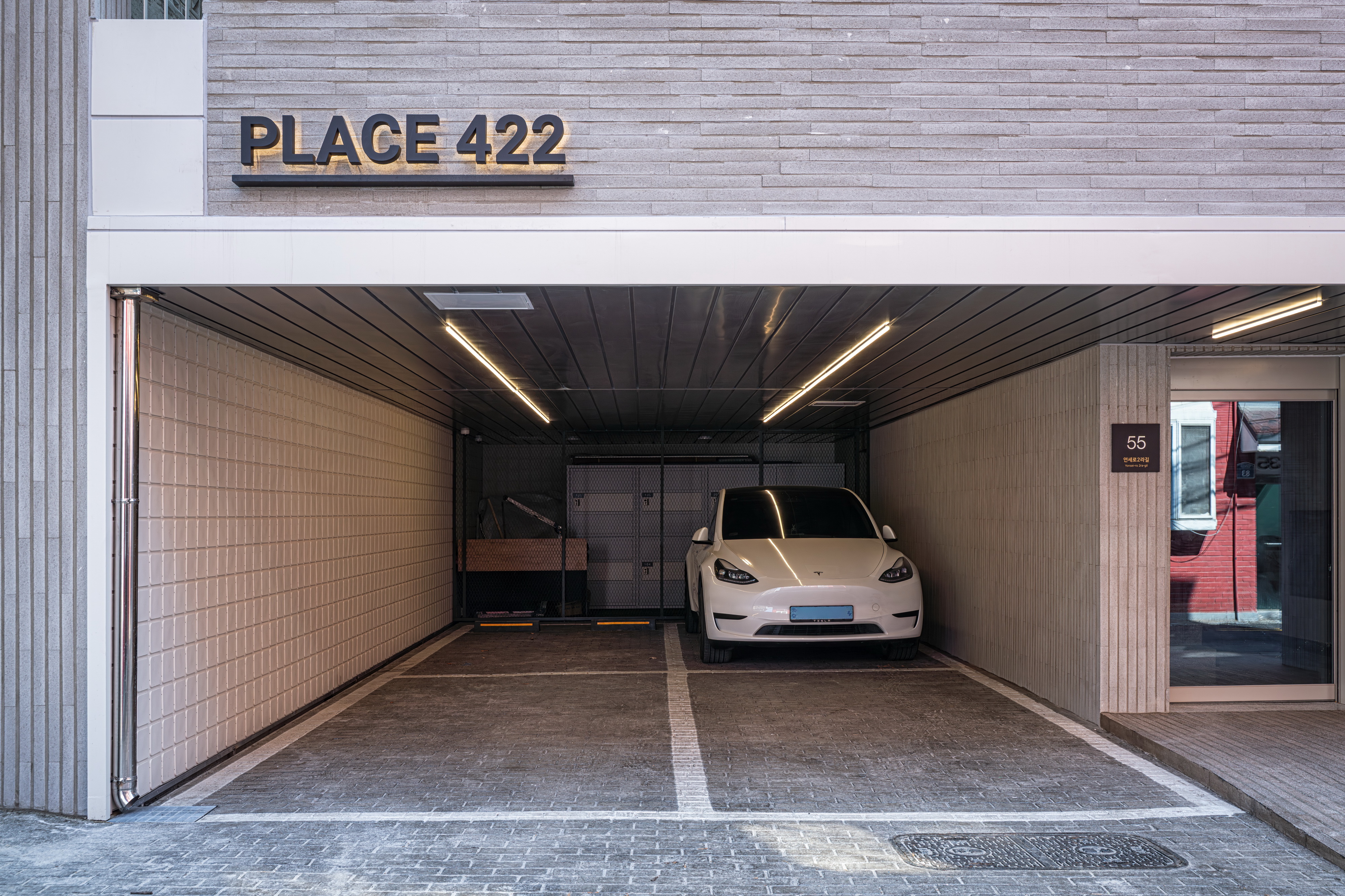 대지는 전면도로와 후면의 레벨차가 굉장히 심한데, 전면도로에 자연스럽게 형성되는 지상층 같은 지하1층을 주차장으로 활용하고 나머지 지상1~4층을 주거용으로 계획할 수 있었다.