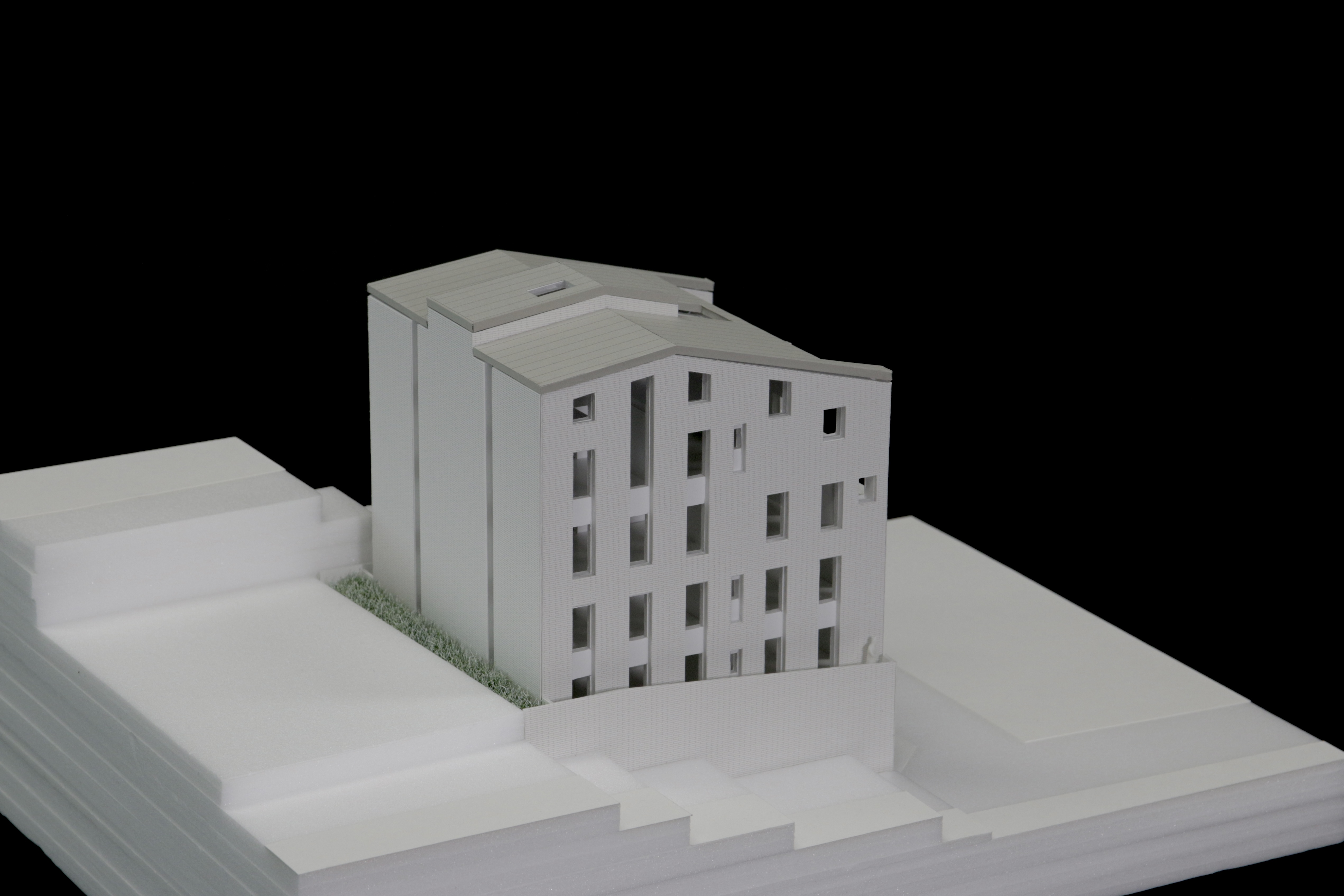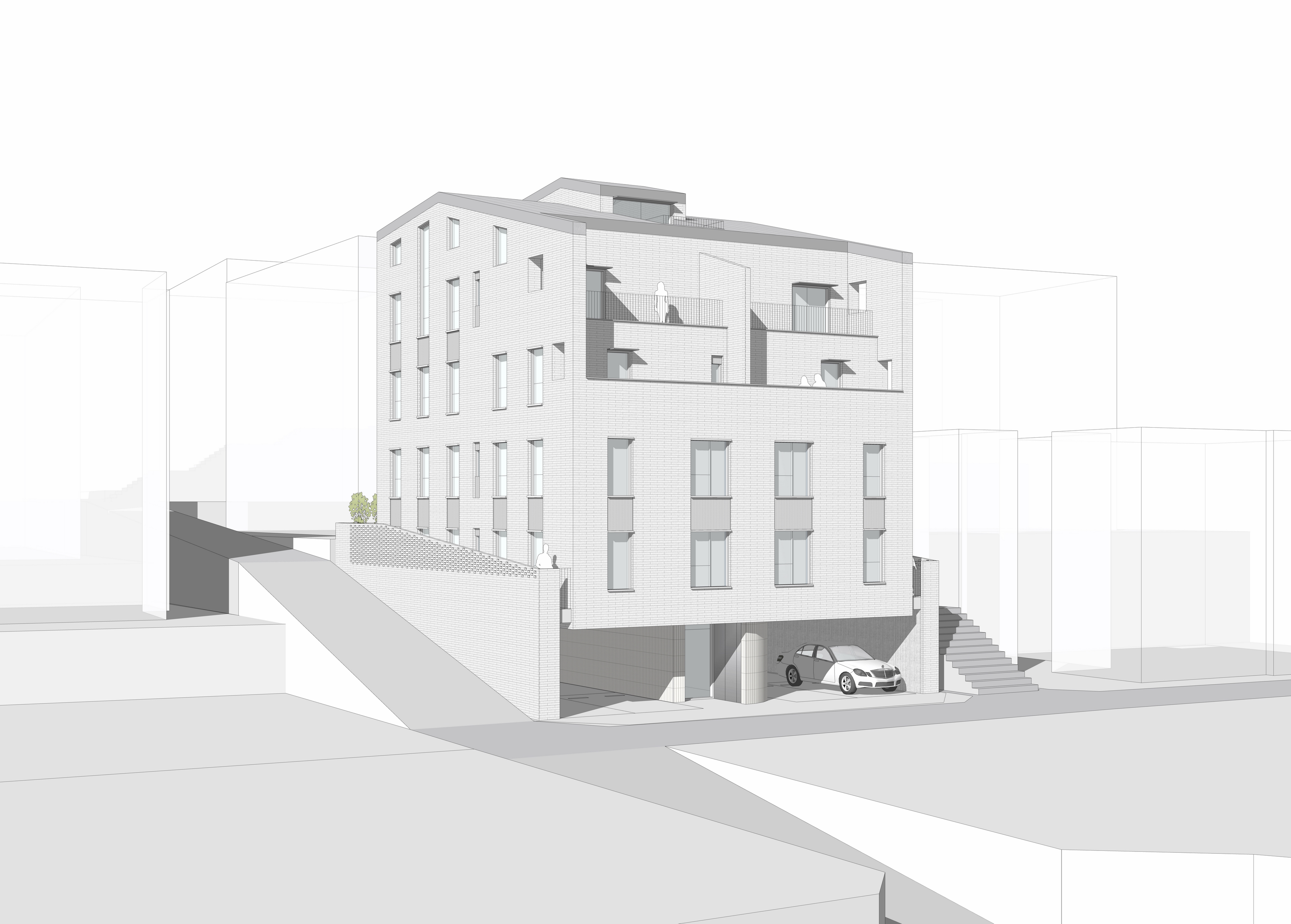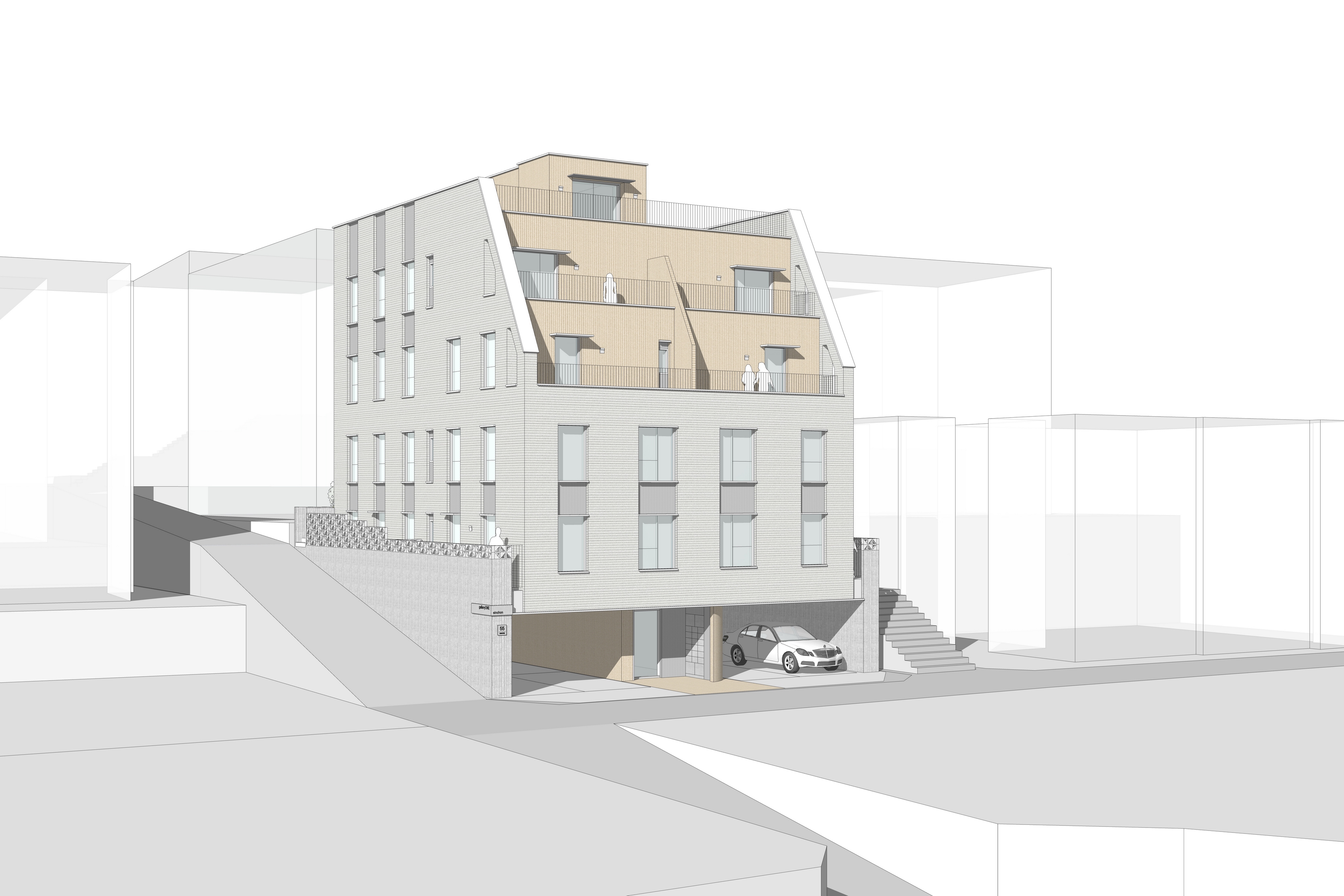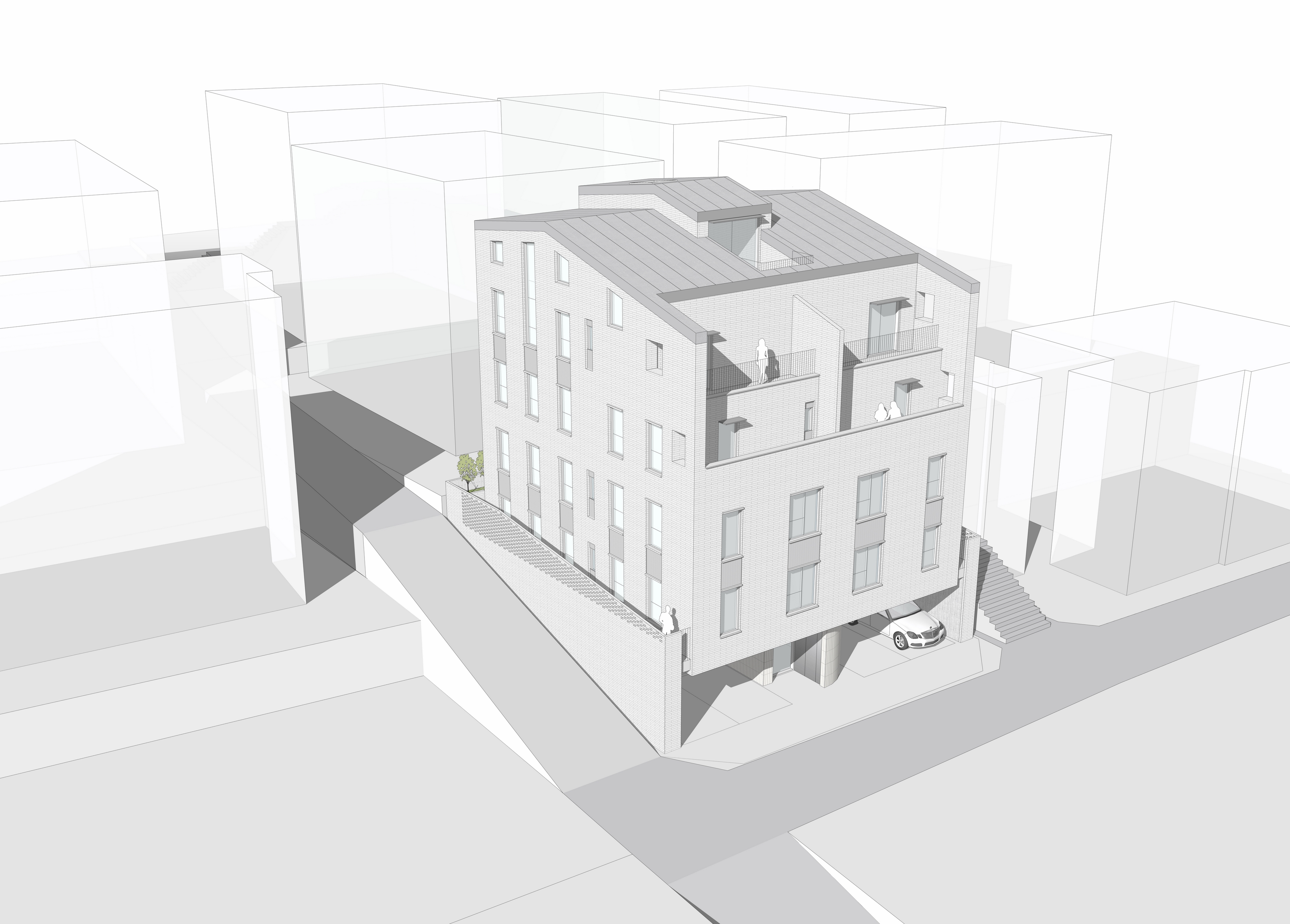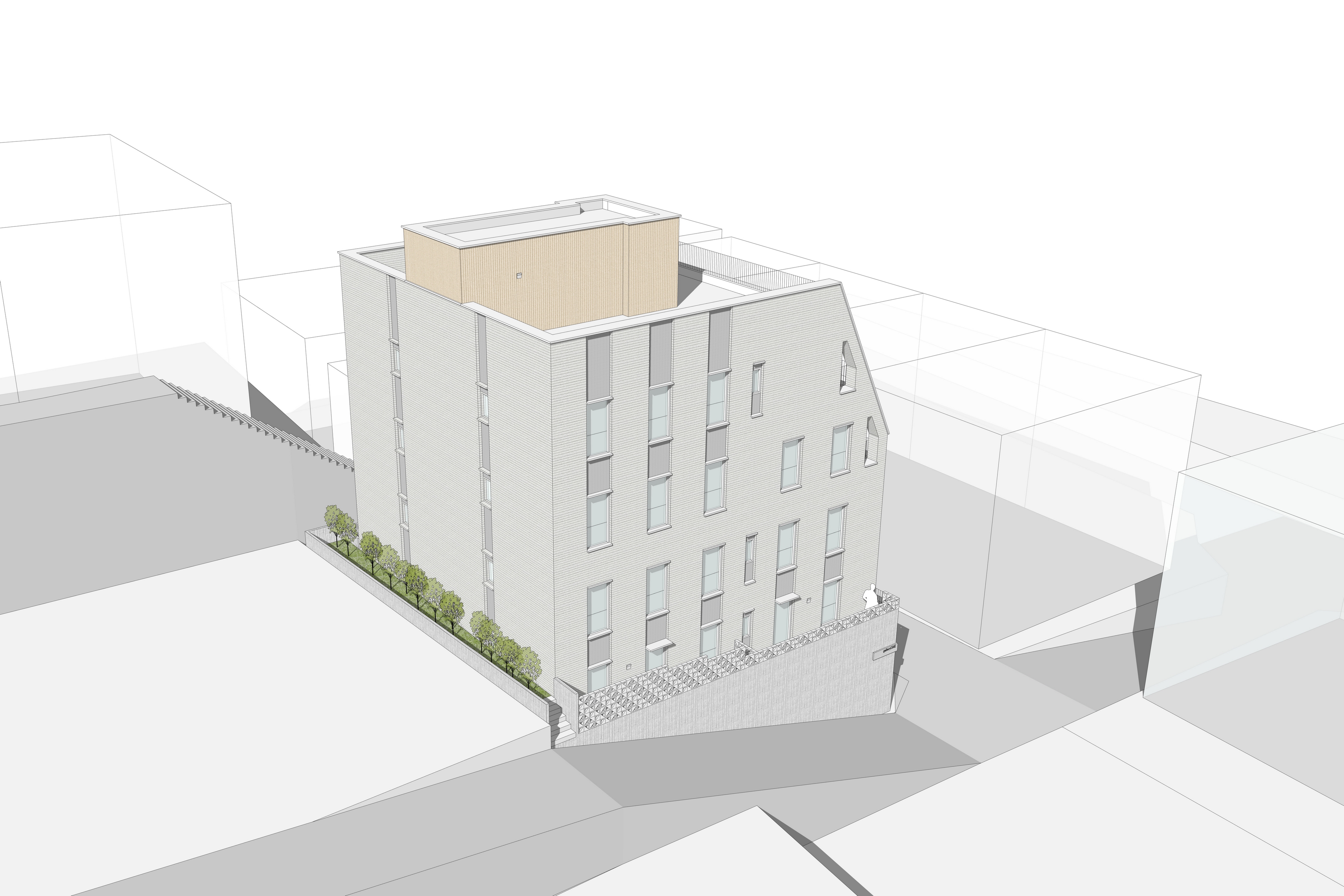대지는 전면도로와 후면의 레벨차가 굉장히 심한데, 전면도로에 자연스럽게 형성되는 지상층 같은 지하1층을 주차장으로 활용하고 나머지 지상1~4층을 주거용으로 계획할 수 있었다.