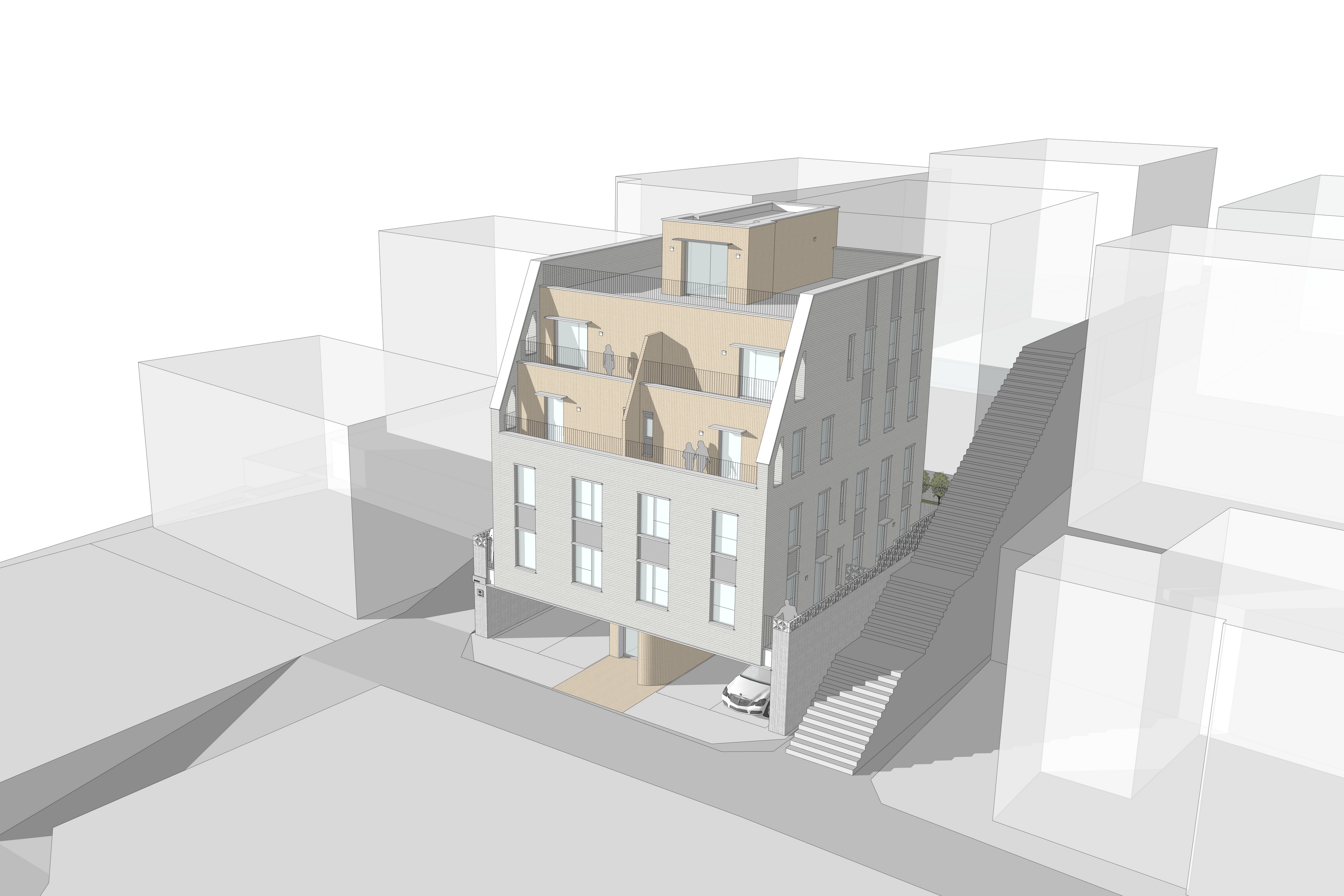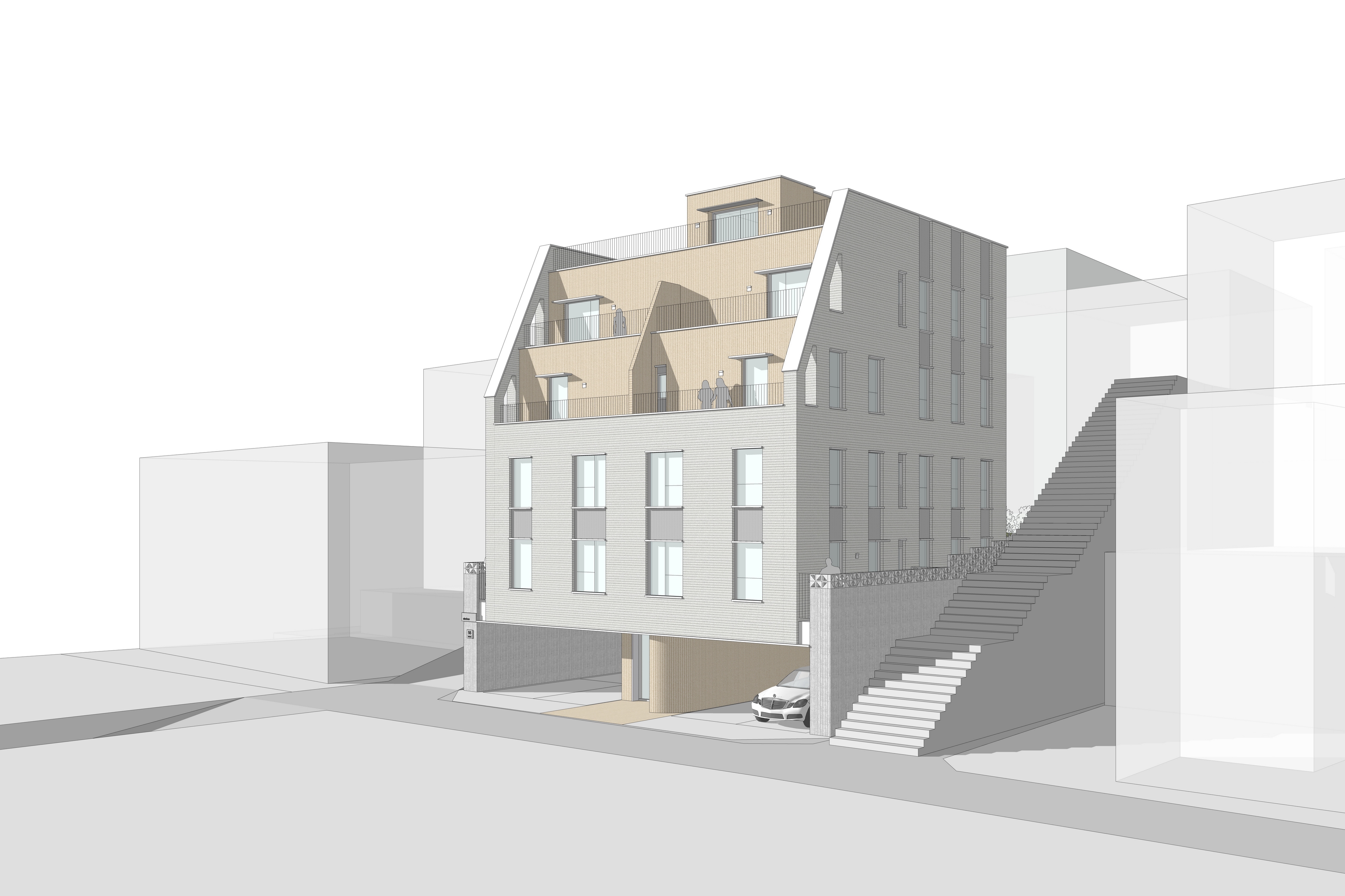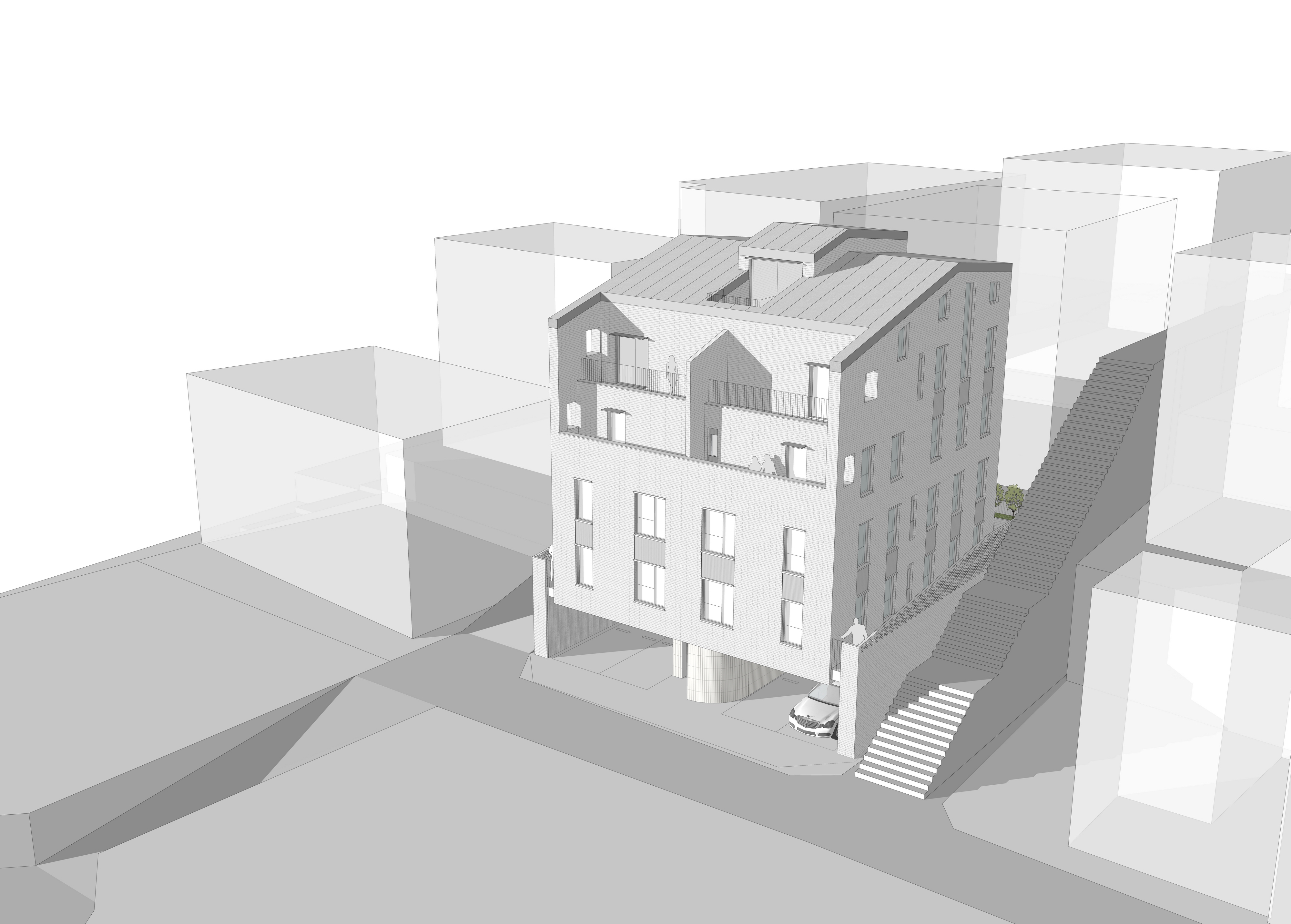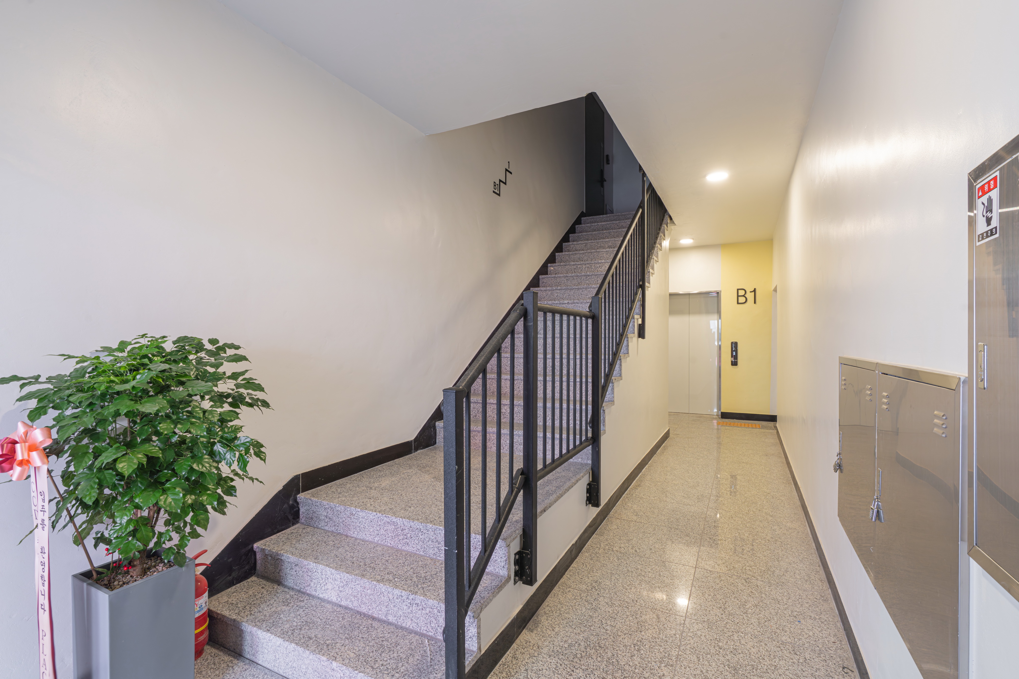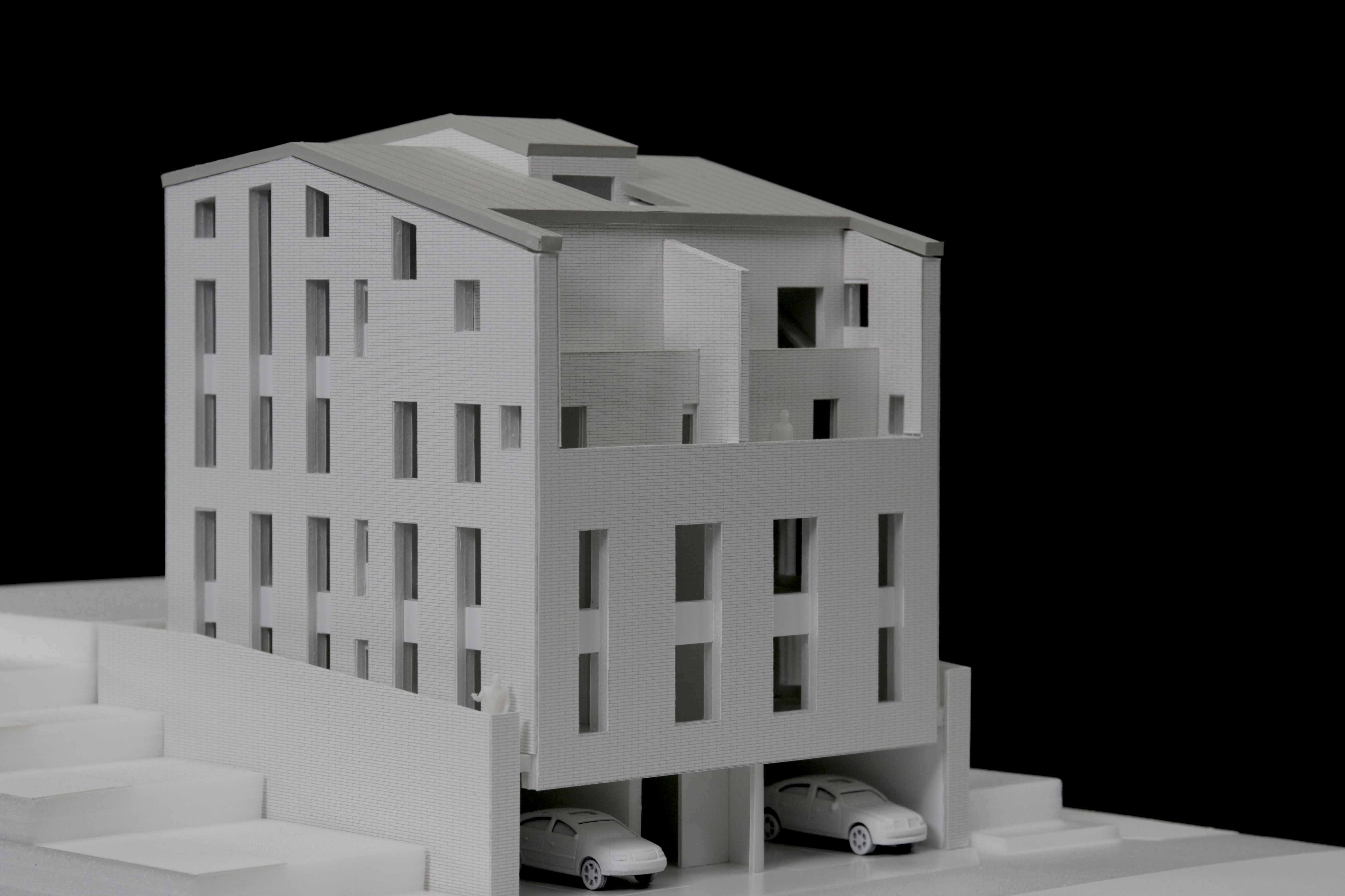 대지는 전면도로와 후면의 레벨차가 굉장히 심한데, 전면도로에 자연스럽게 형성되는 지상층 같은 지하1층을 주차장으로 활용하고 나머지 지상1~4층을 주거용으로 계획할 수 있었다.
