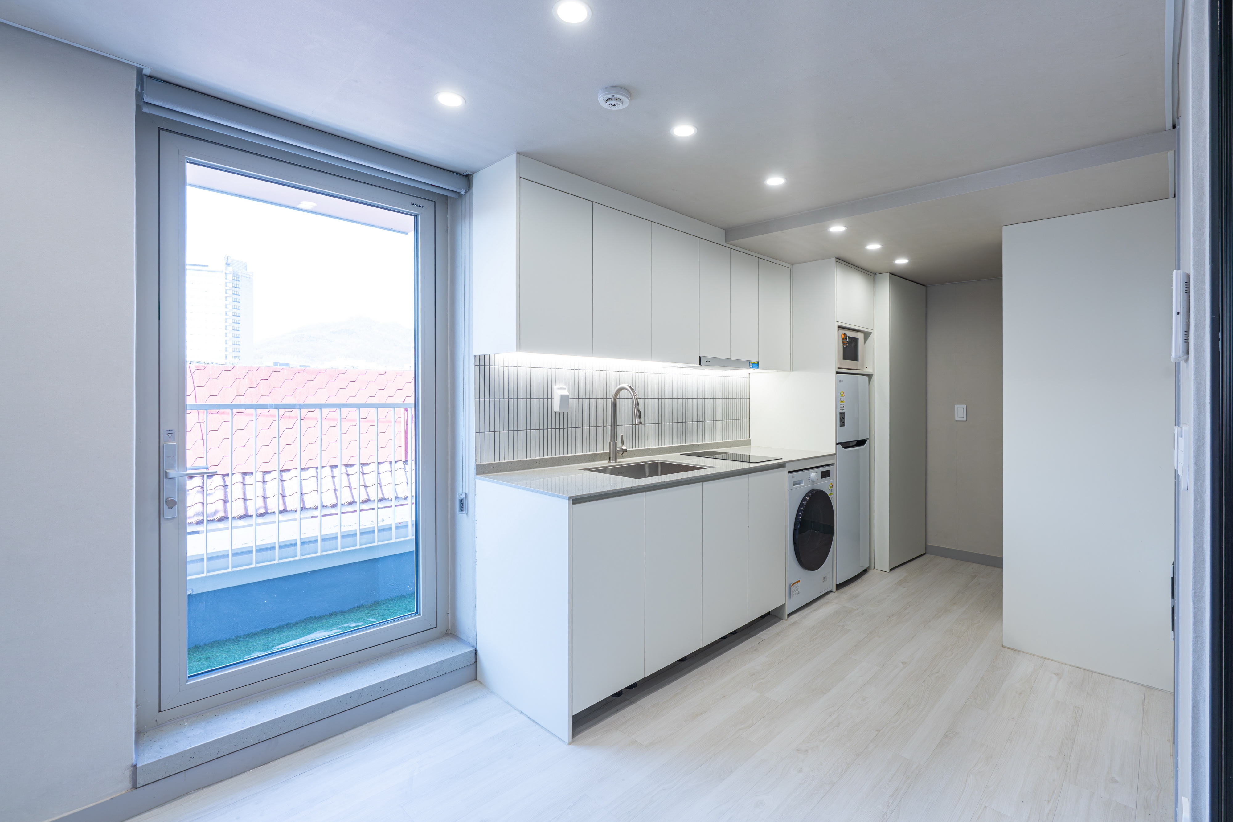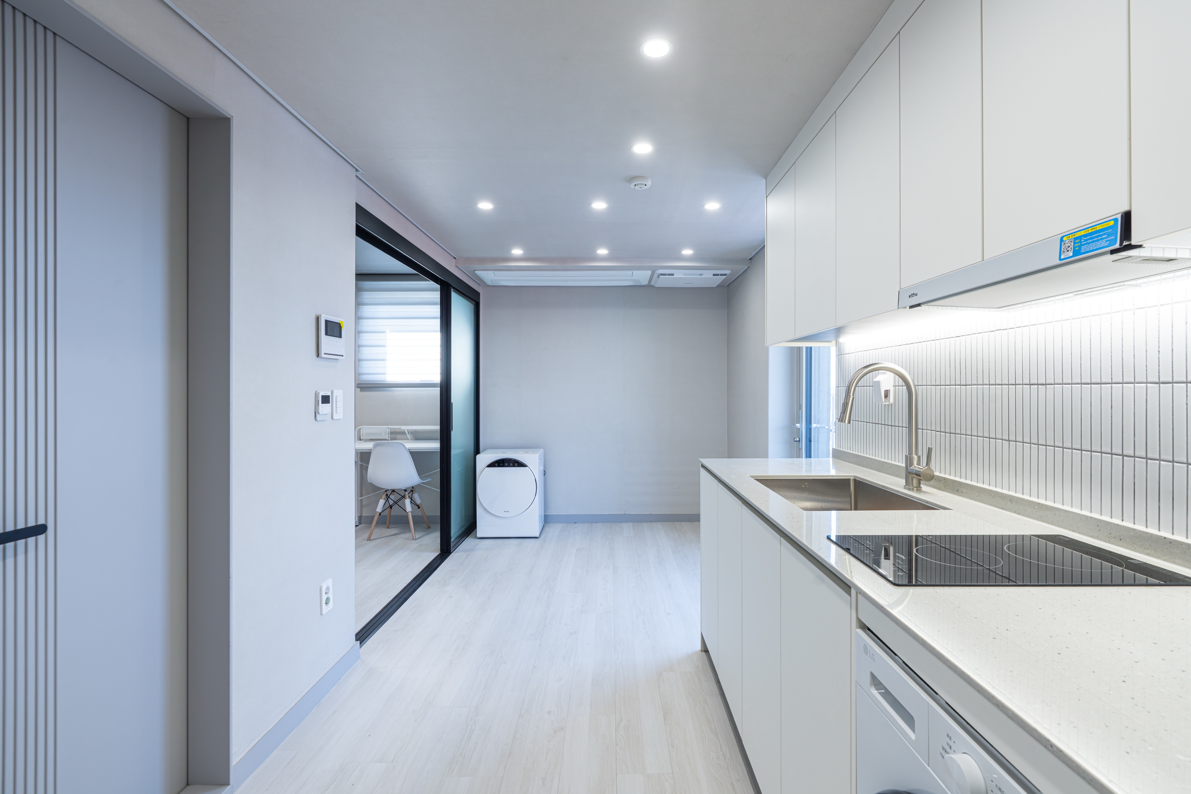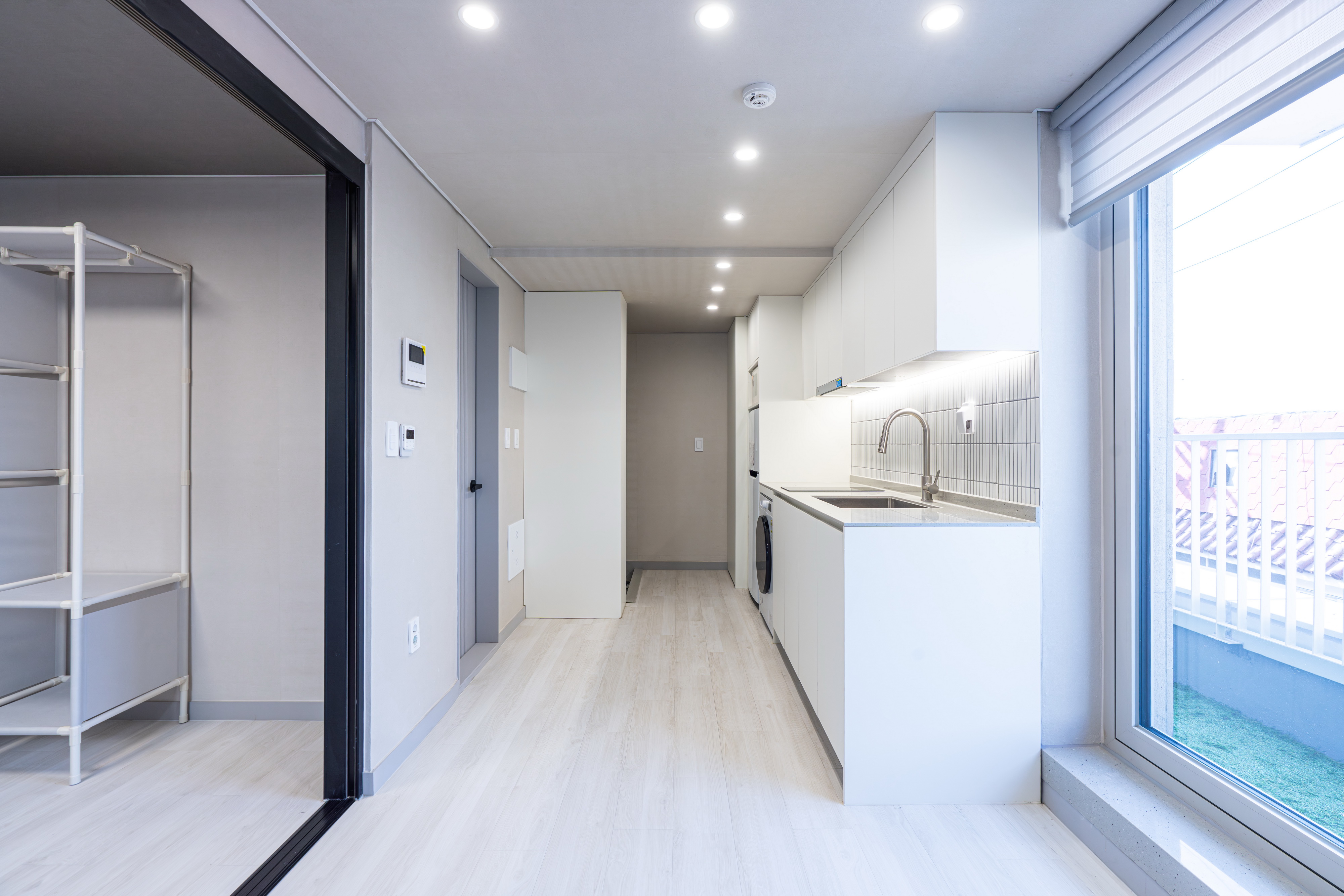 3면으로 둘러쌓인 도로변으로 모든 실들을 배치하여 채광, 조망, 환기 등 주거공간의 필수요소들을 빠짐없이 담았다.