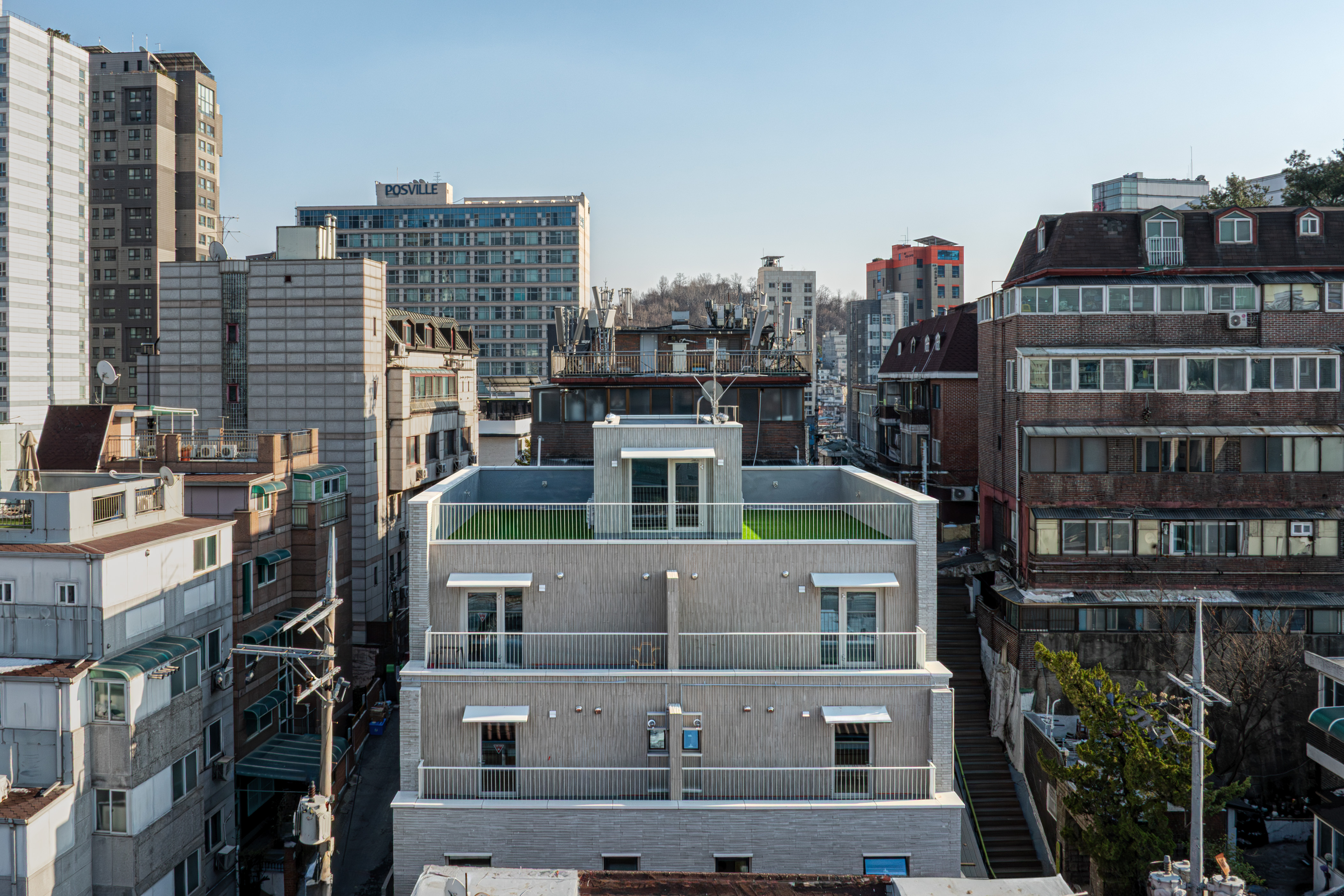 지하층 슬래브 및 일조권으로 인한 후퇴 부분을 활용하여 각층에 독립적인 외부 발코니 공간을 만들고, 옥상에도 작은 외부 테라스를 만들어 이용자를 고려했다.