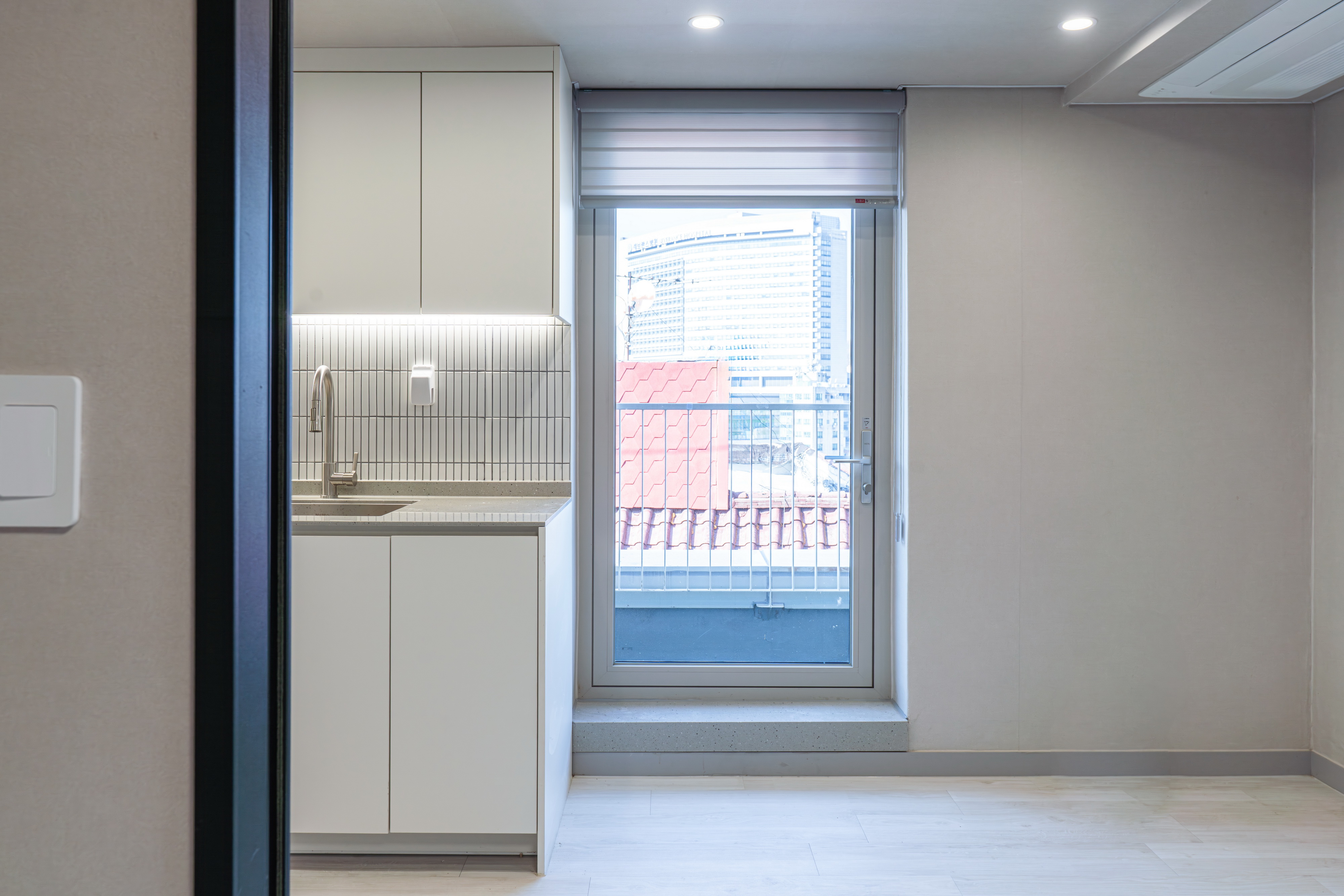 3면으로 둘러쌓인 도로변으로 모든 실들을 배치하여 채광, 조망, 환기 등 주거공간의 필수요소들을 빠짐없이 담았다.